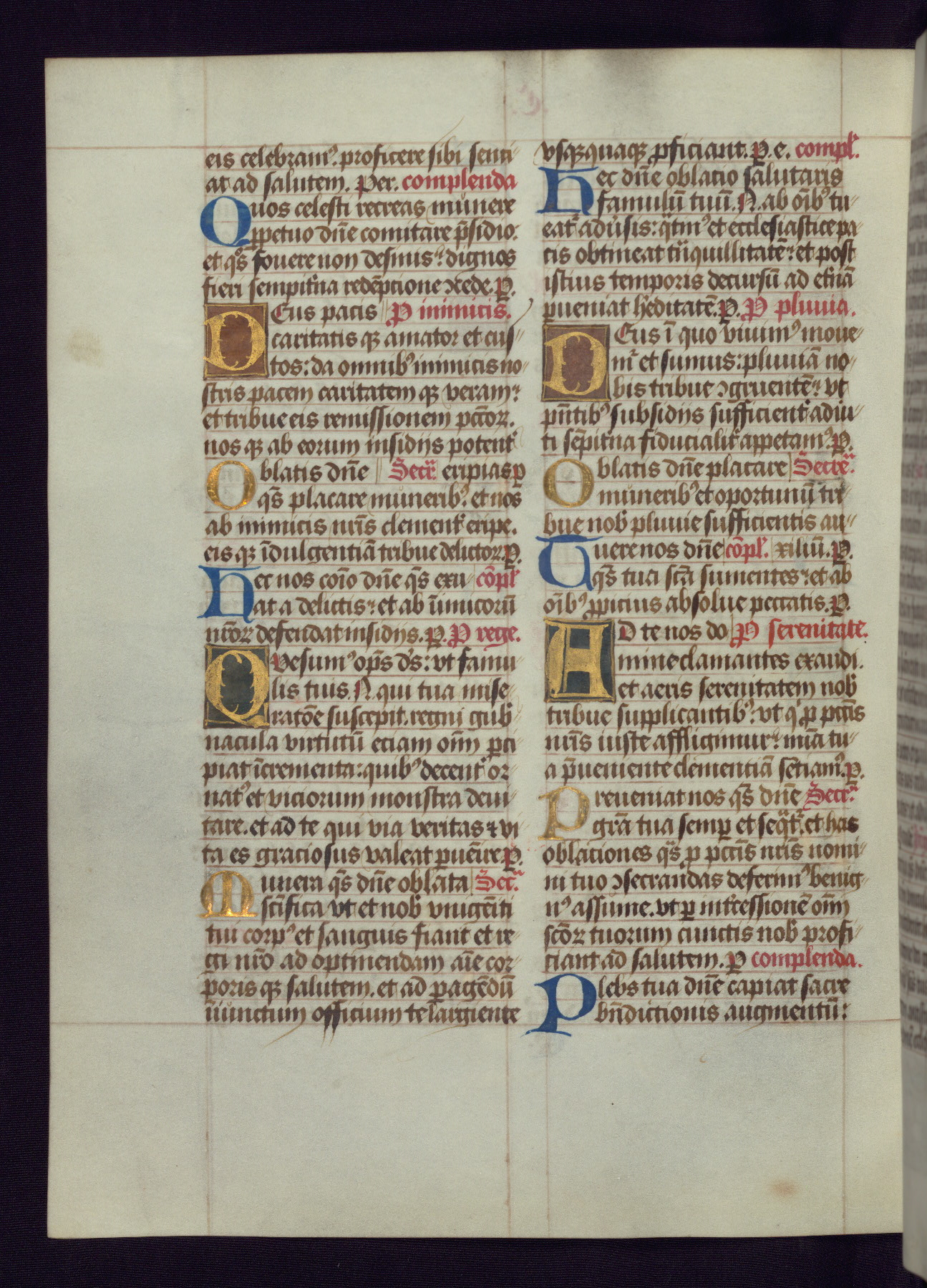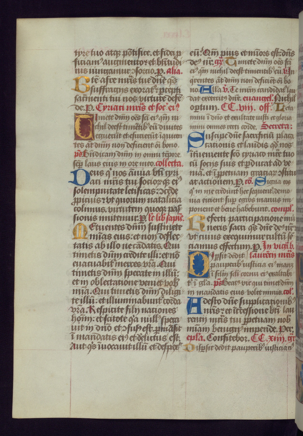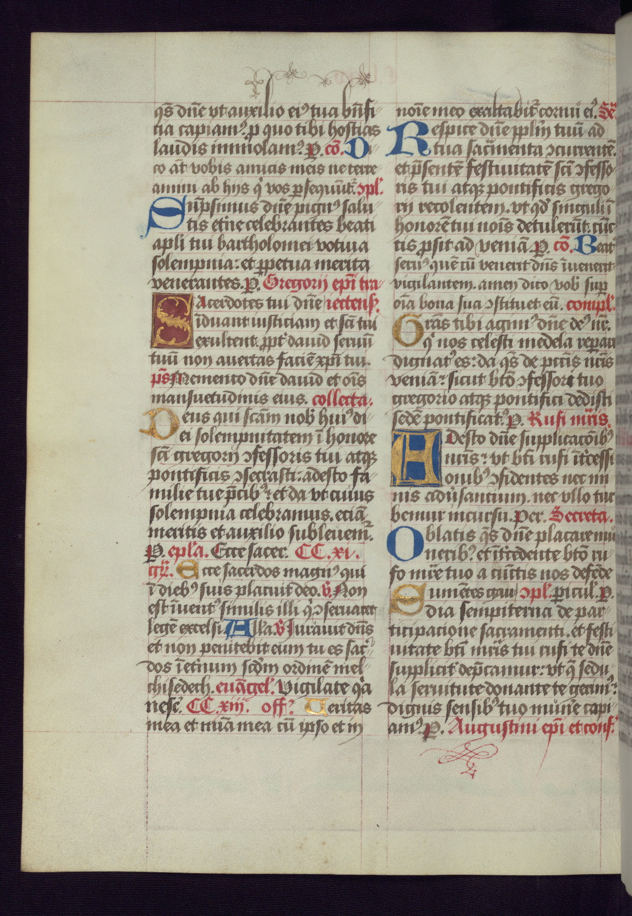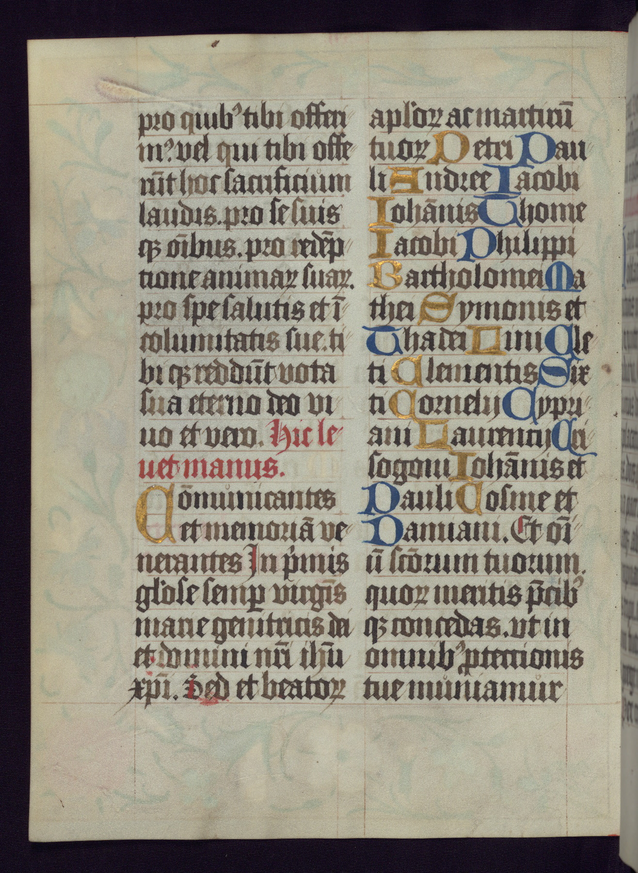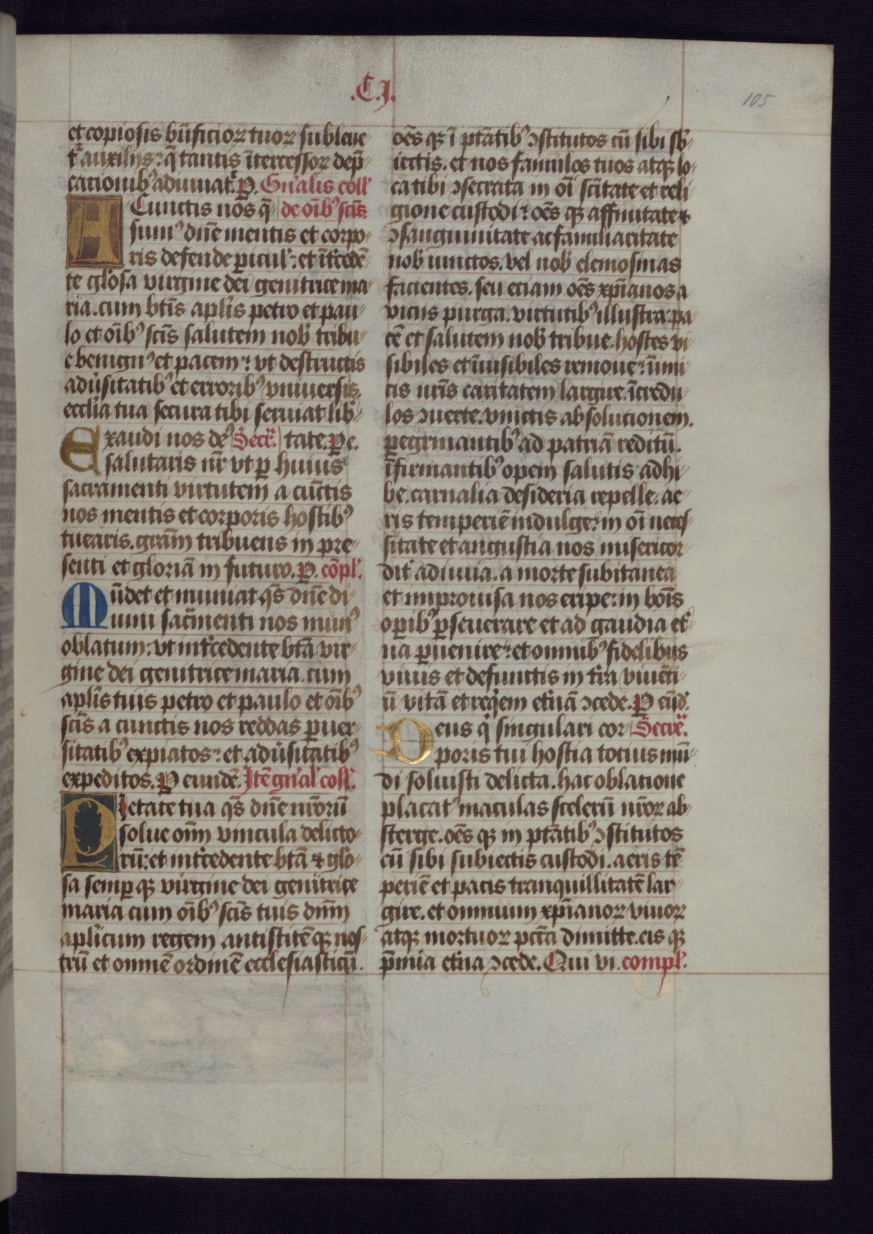 This Latin Missal was written in Utrecht, Netherlands, ca. 1500. Portraits of the original owners, whose names are not recorded, are accompanied by heraldry indicating that the husband was of the family of St. Férréol of Dauphiné; the wife was of the Cambronne of Ponthieu family. The manuscript is heavily illuminated with more than fifty historiated initials and miniatures by a group of artists known in scholarship as the "Masters of the Dark Eyes." The marginal decoration is also notable, for along with naturalistic flowers, insects, and jewels, there are several instances where the margin itself is historiated. This Missal provides an excellent example of the "Masters of the Dark Eyes" style, and there are a number of related manuscripts that have been identified by these same artists, including two at The Hague: KB, 76 G 9, and KB, 135 E 19.