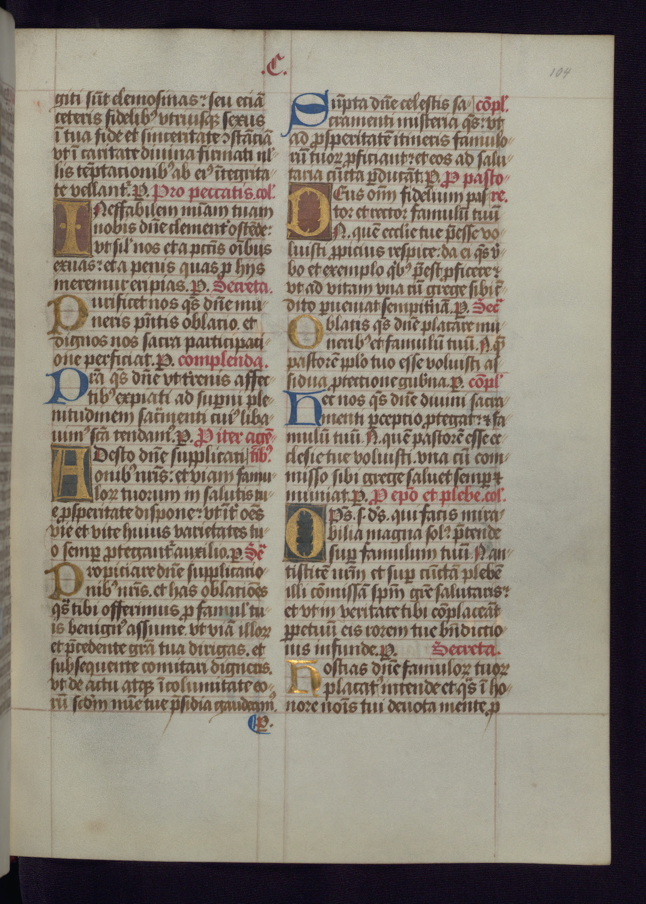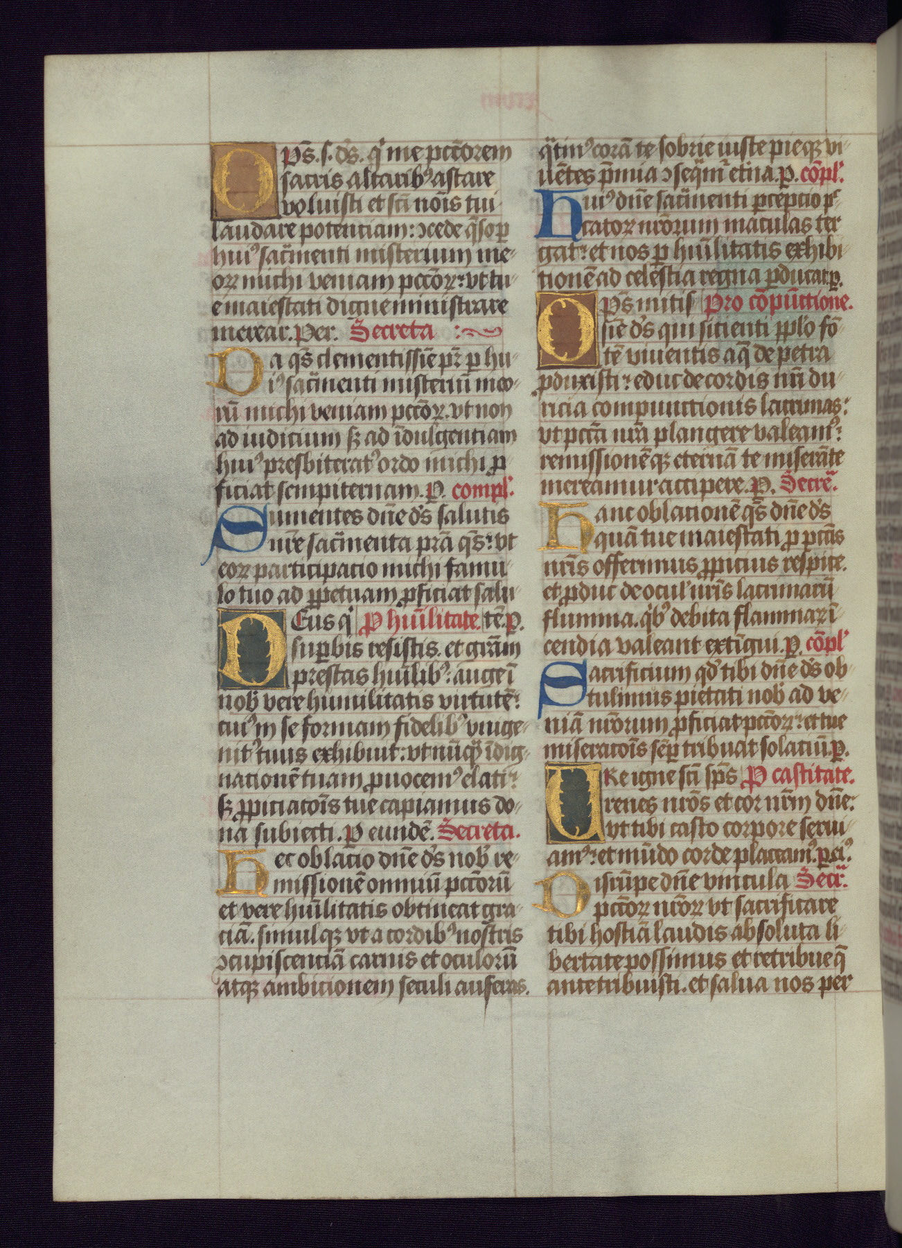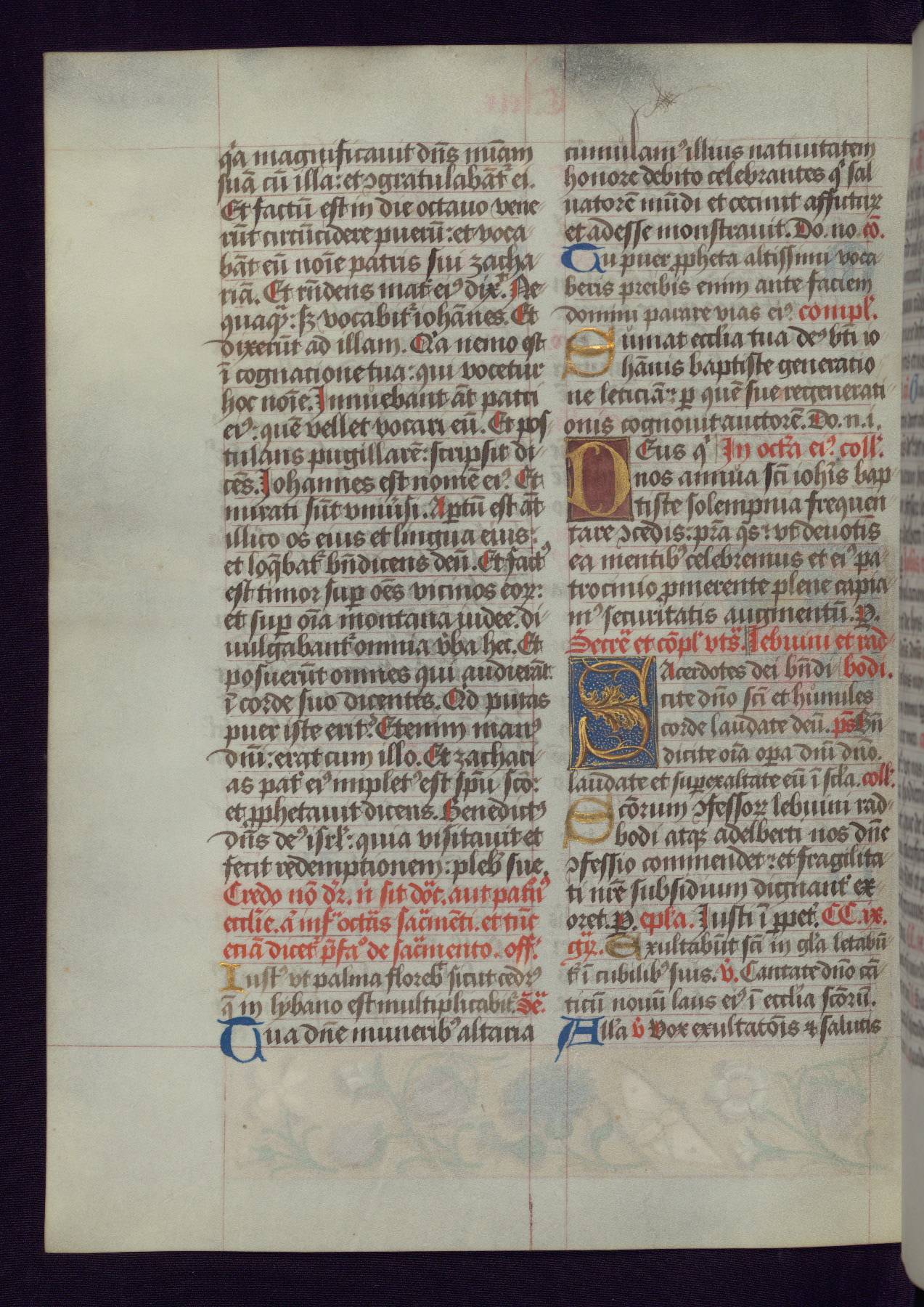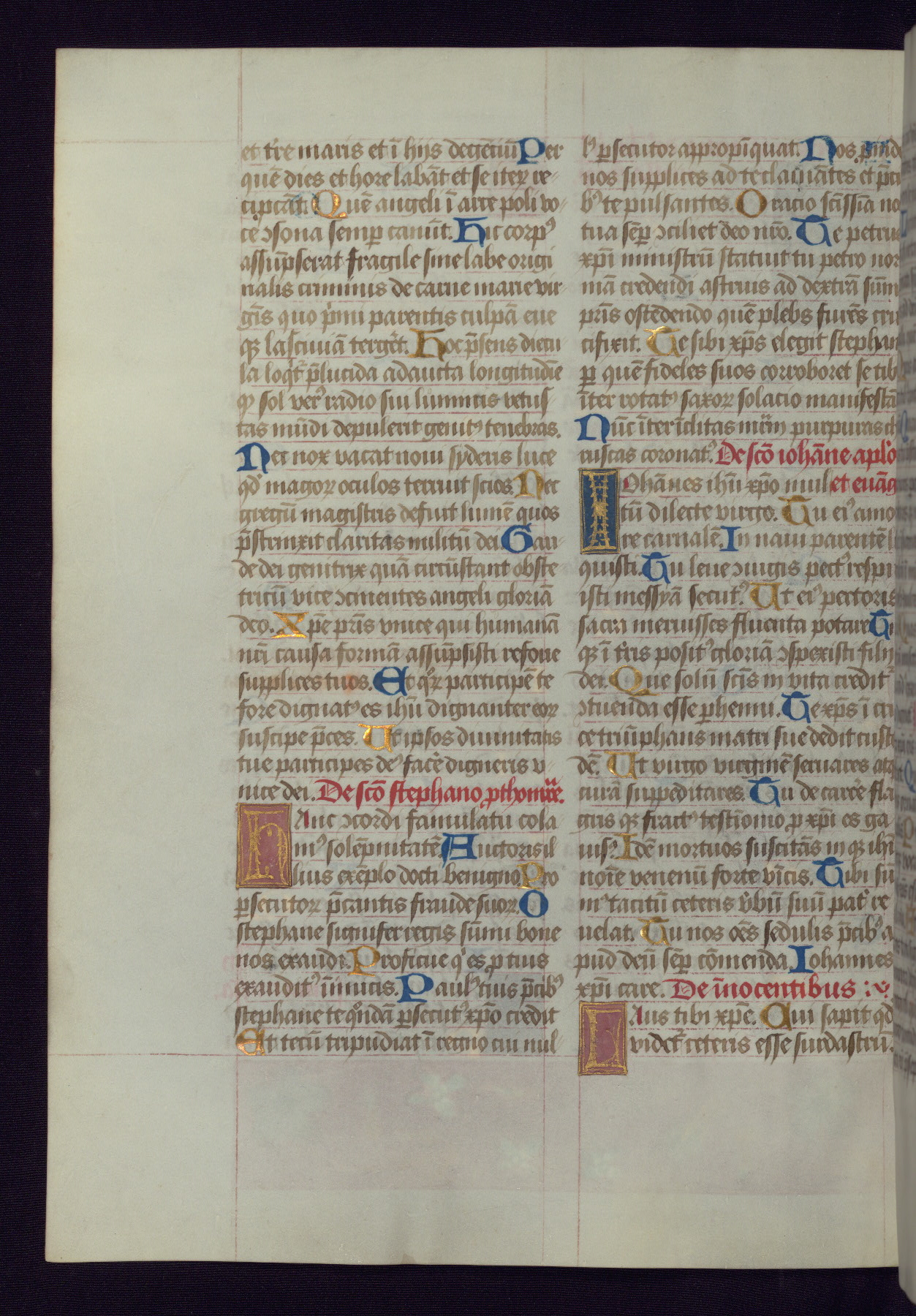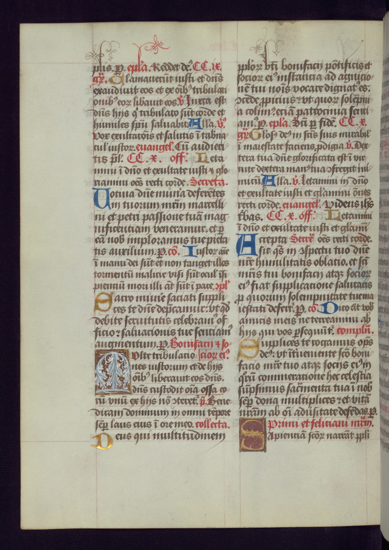 This Latin Missal was written in Utrecht, Netherlands, ca. 1500. Portraits of the original owners, whose names are not recorded, are accompanied by heraldry indicating that the husband was of the family of St. Férréol of Dauphiné; the wife was of the Cambronne of Ponthieu family. The manuscript is heavily illuminated with more than fifty historiated initials and miniatures by a group of artists known in scholarship as the "Masters of the Dark Eyes." The marginal decoration is also notable, for along with naturalistic flowers, insects, and jewels, there are several instances where the margin itself is historiated. This Missal provides an excellent example of the "Masters of the Dark Eyes" style, and there are a number of related manuscripts that have been identified by these same artists, including two at The Hague: KB, 76 G 9, and KB, 135 E 19.