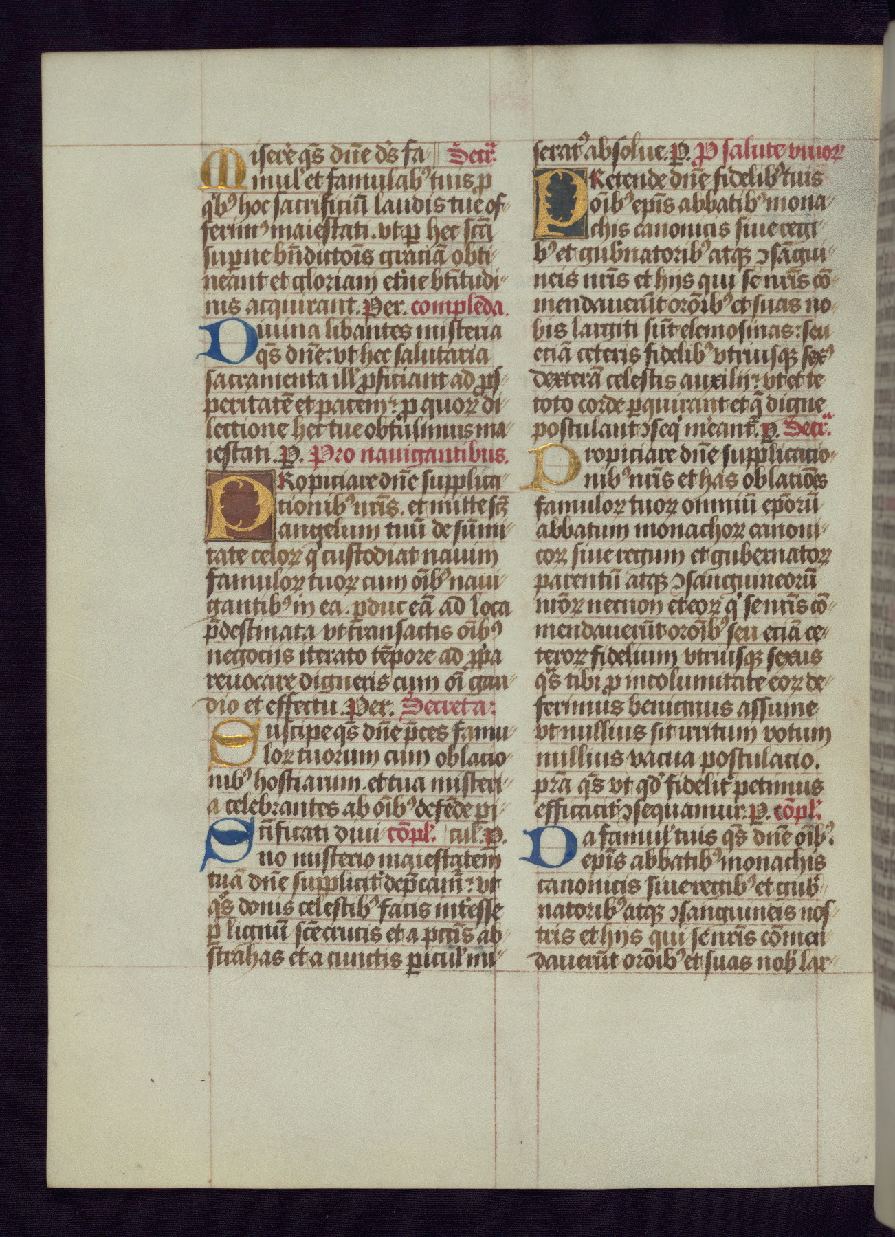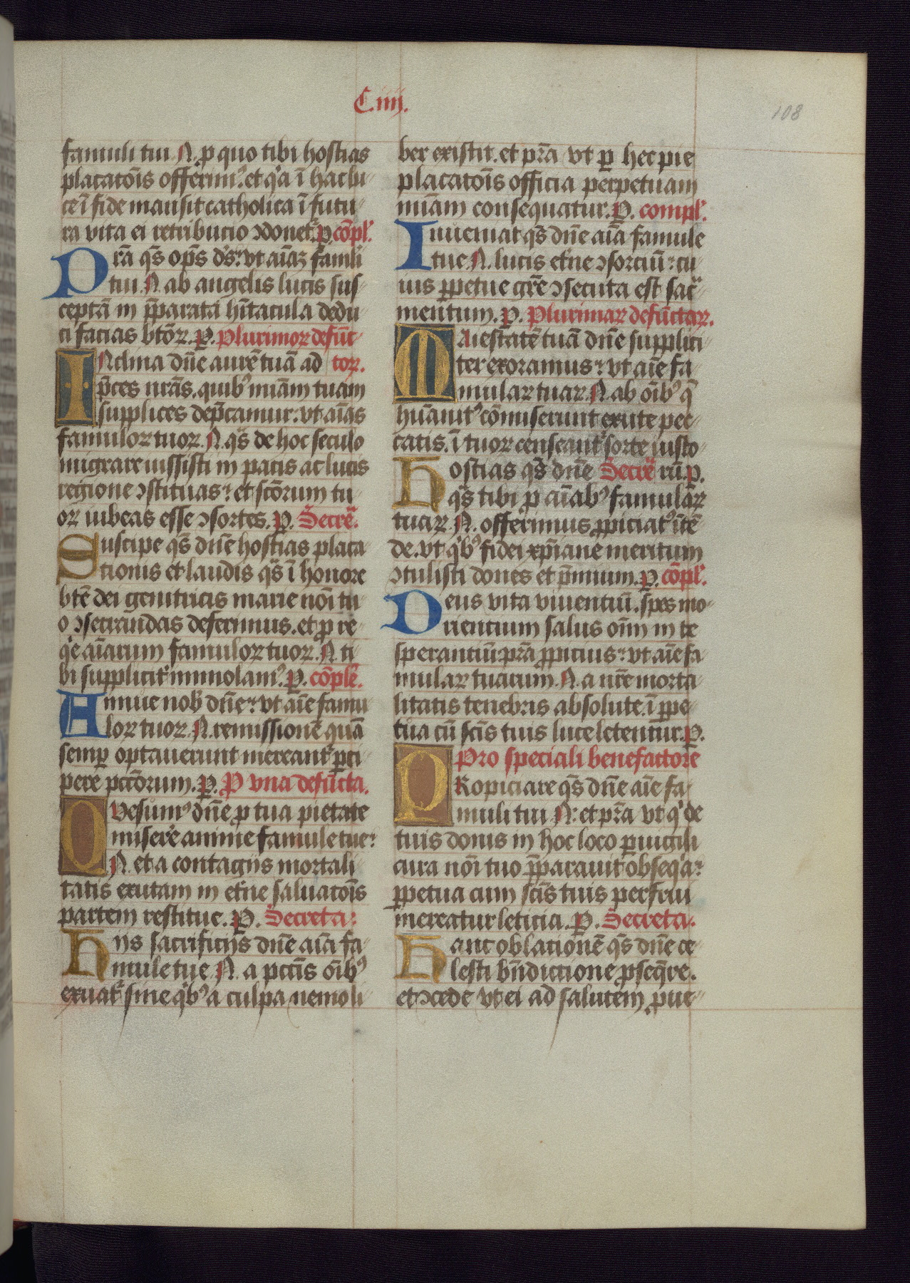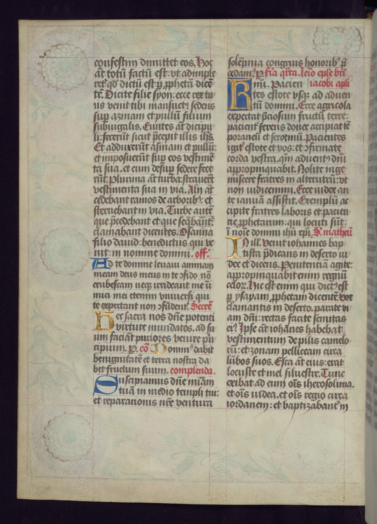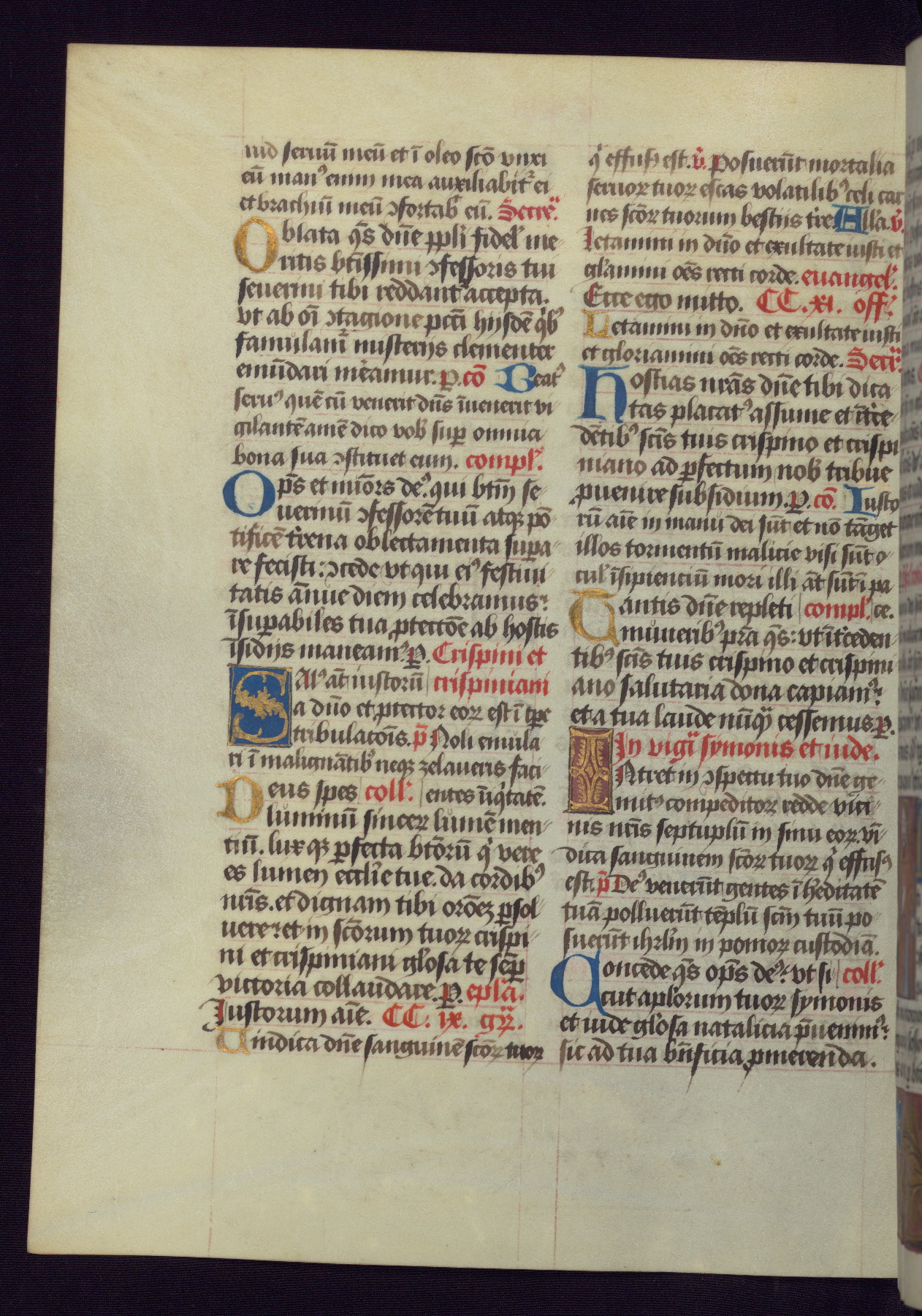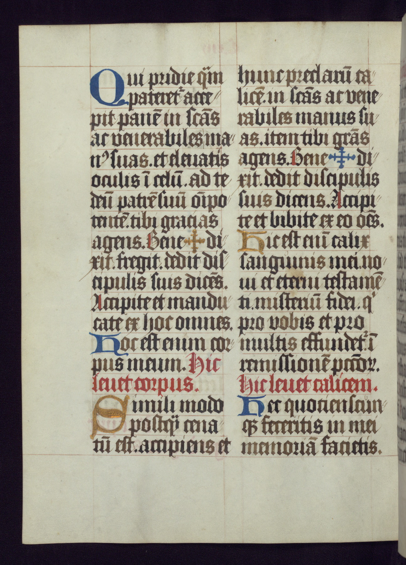 This Latin Missal was written in Utrecht, Netherlands, ca. 1500. Portraits of the original owners, whose names are not recorded, are accompanied by heraldry indicating that the husband was of the family of St. Férréol of Dauphiné; the wife was of the Cambronne of Ponthieu family. The manuscript is heavily illuminated with more than fifty historiated initials and miniatures by a group of artists known in scholarship as the "Masters of the Dark Eyes." The marginal decoration is also notable, for along with naturalistic flowers, insects, and jewels, there are several instances where the margin itself is historiated. This Missal provides an excellent example of the "Masters of the Dark Eyes" style, and there are a number of related manuscripts that have been identified by these same artists, including two at The Hague: KB, 76 G 9, and KB, 135 E 19.