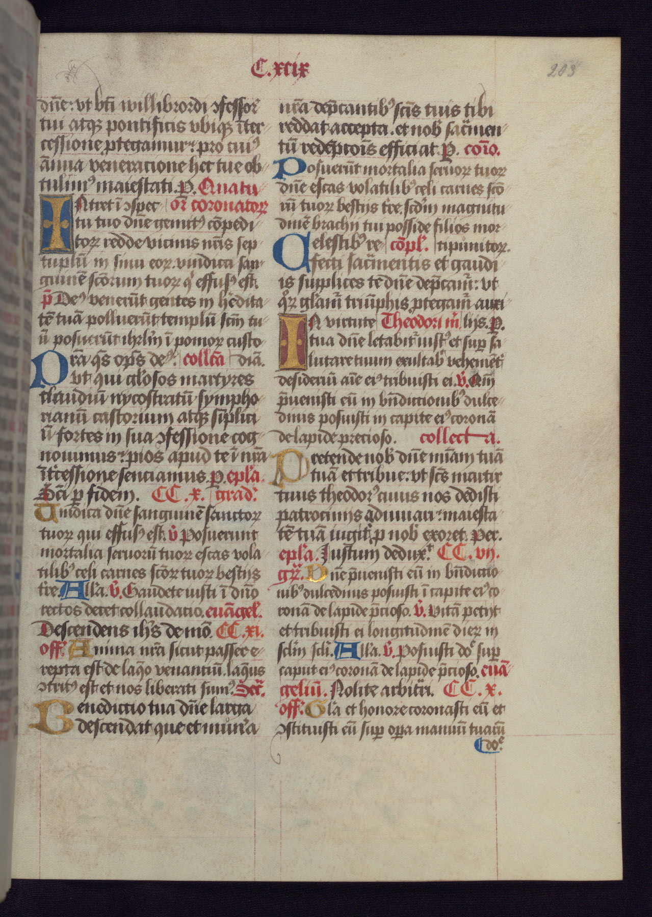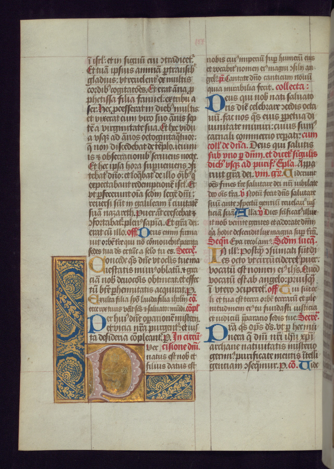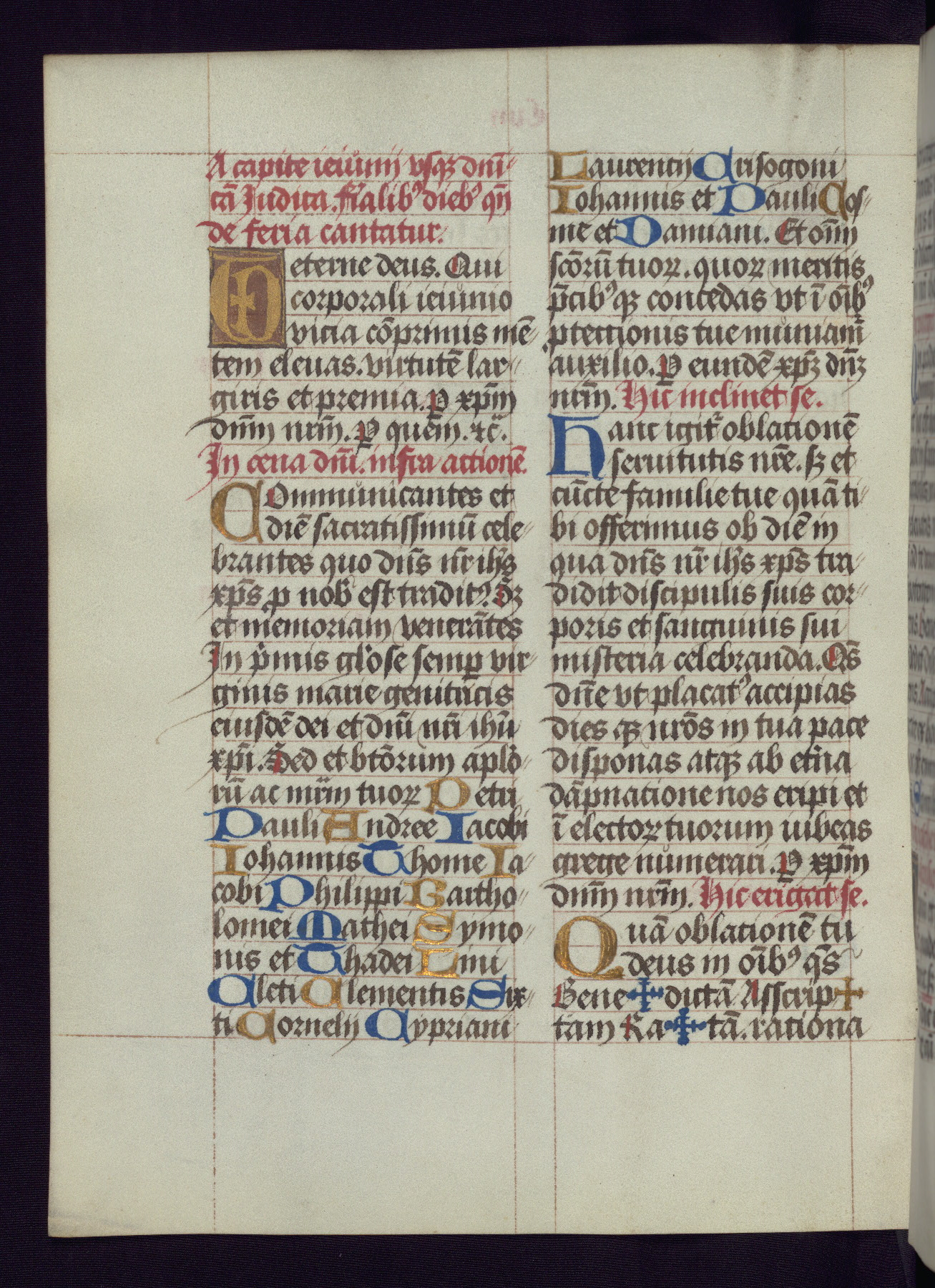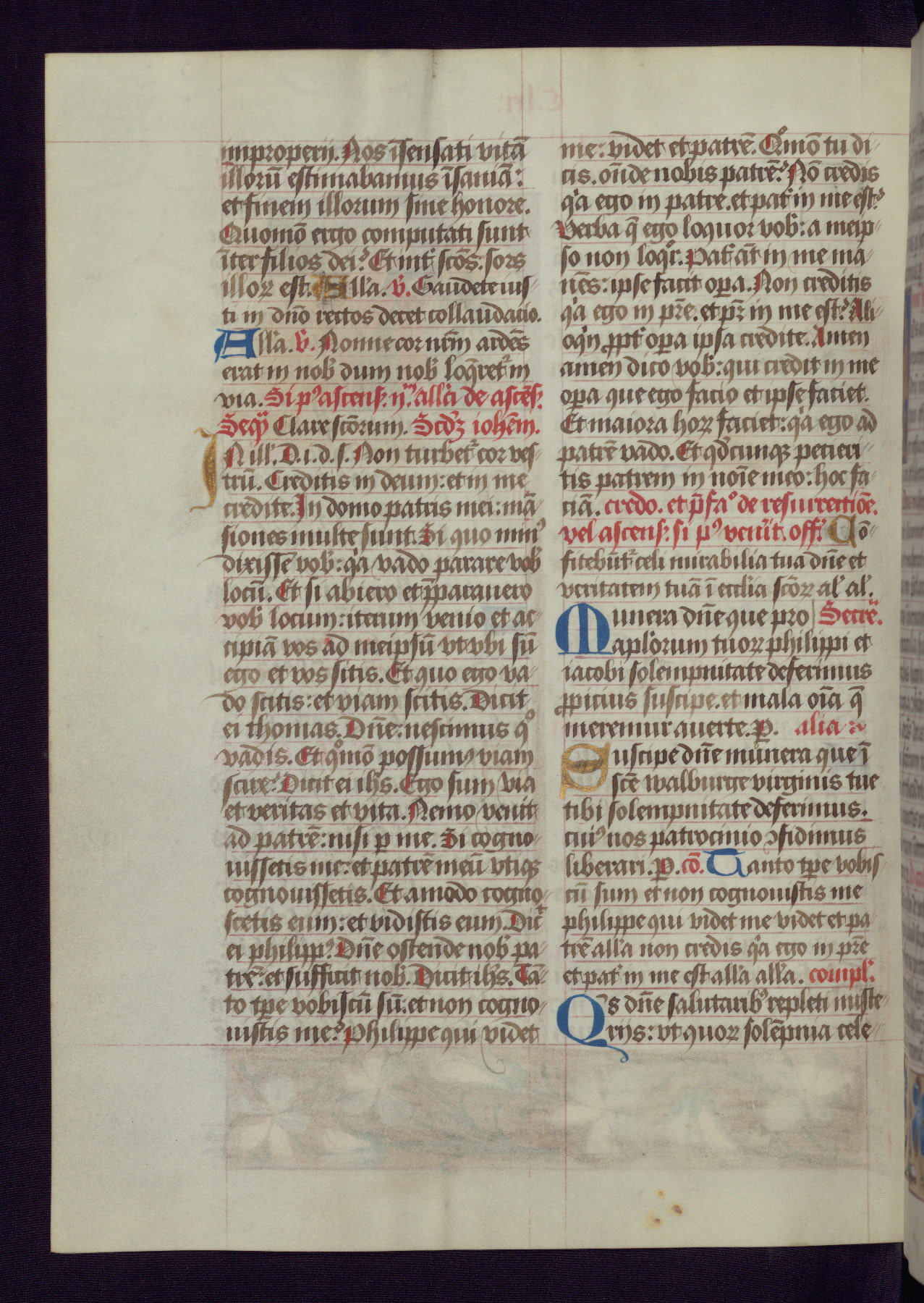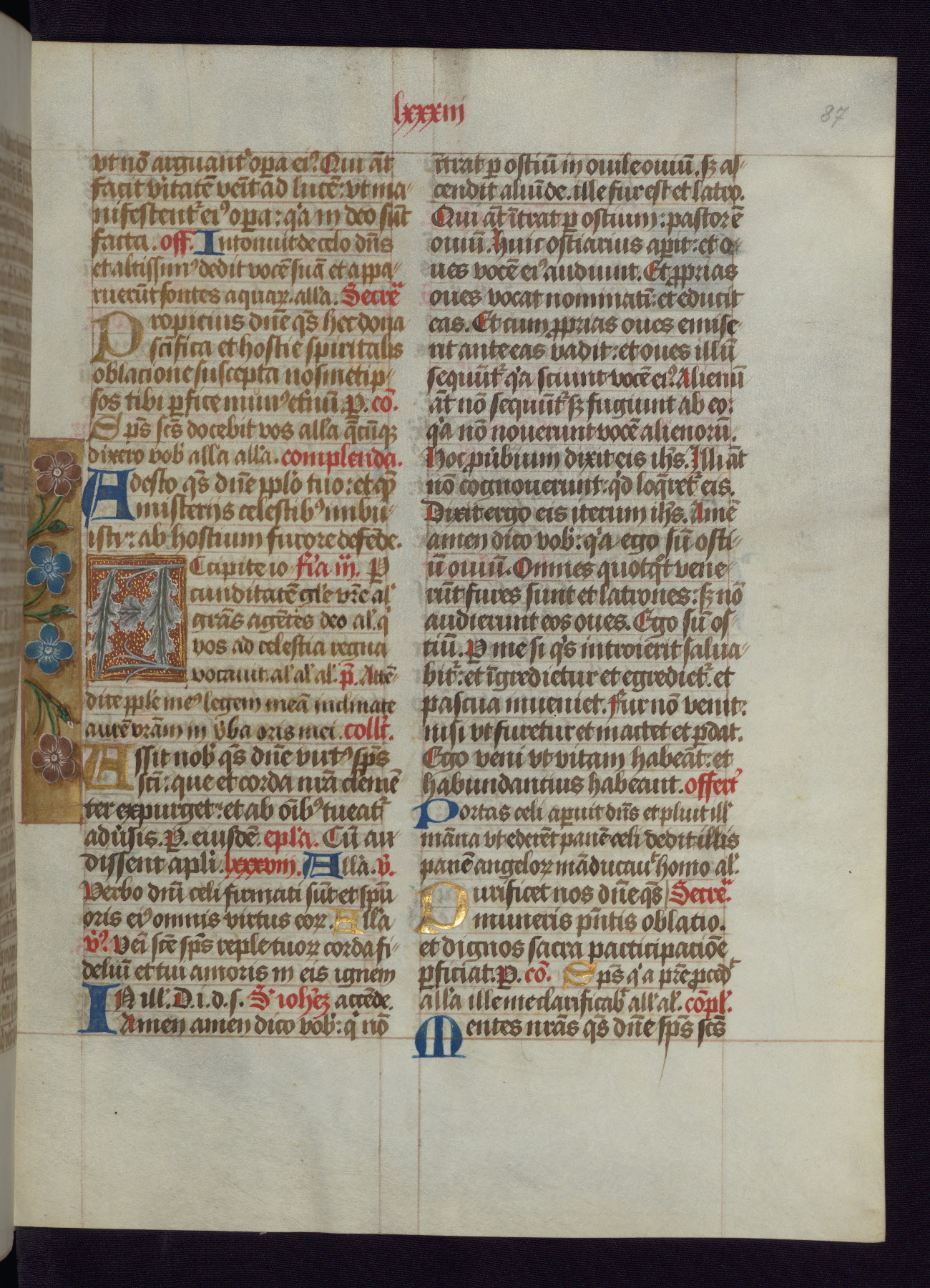 This Latin Missal was written in Utrecht, Netherlands, ca. 1500. Portraits of the original owners, whose names are not recorded, are accompanied by heraldry indicating that the husband was of the family of St. Férréol of Dauphiné; the wife was of the Cambronne of Ponthieu family. The manuscript is heavily illuminated with more than fifty historiated initials and miniatures by a group of artists known in scholarship as the "Masters of the Dark Eyes." The marginal decoration is also notable, for along with naturalistic flowers, insects, and jewels, there are several instances where the margin itself is historiated. This Missal provides an excellent example of the "Masters of the Dark Eyes" style, and there are a number of related manuscripts that have been identified by these same artists, including two at The Hague: KB, 76 G 9, and KB, 135 E 19.
