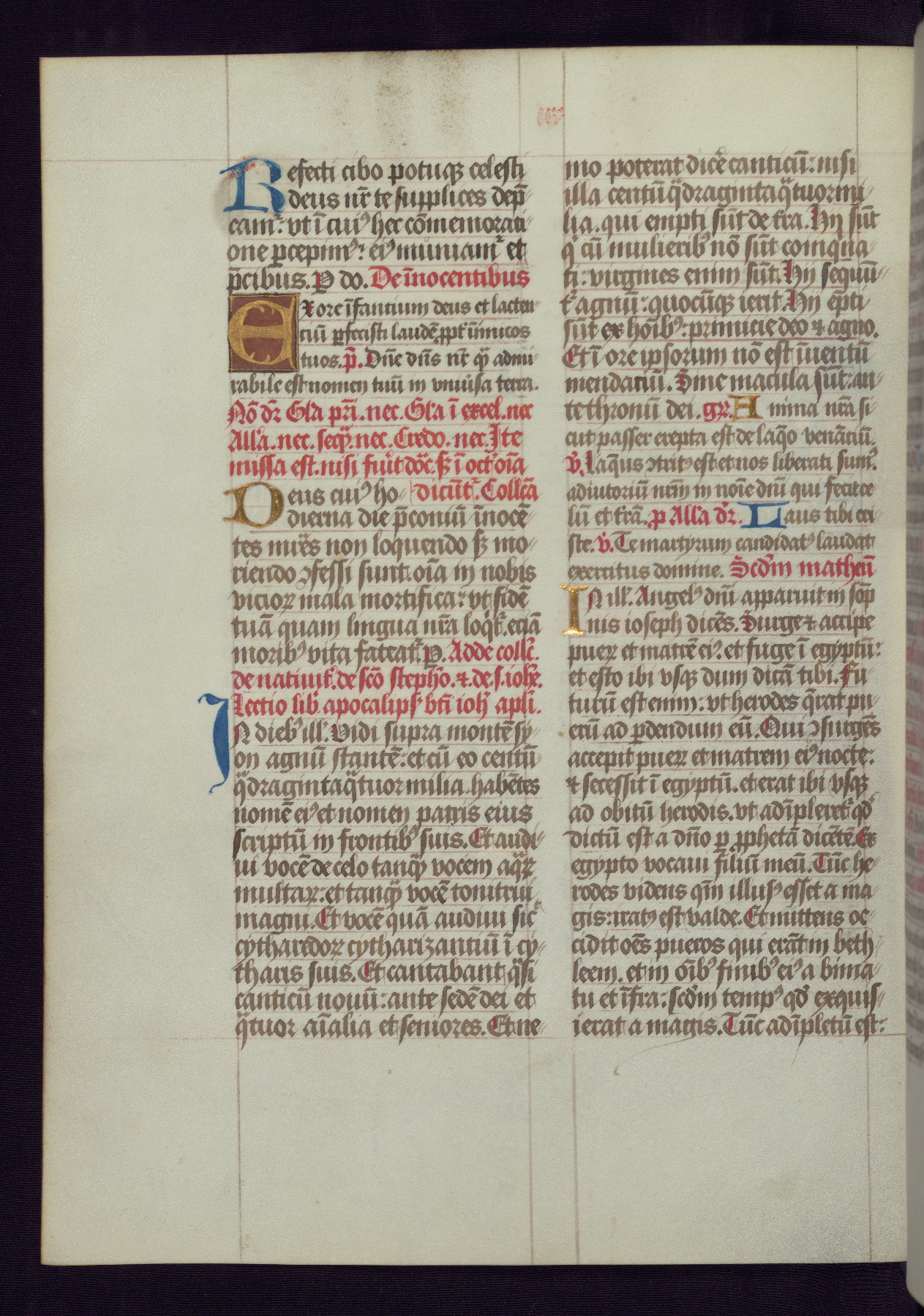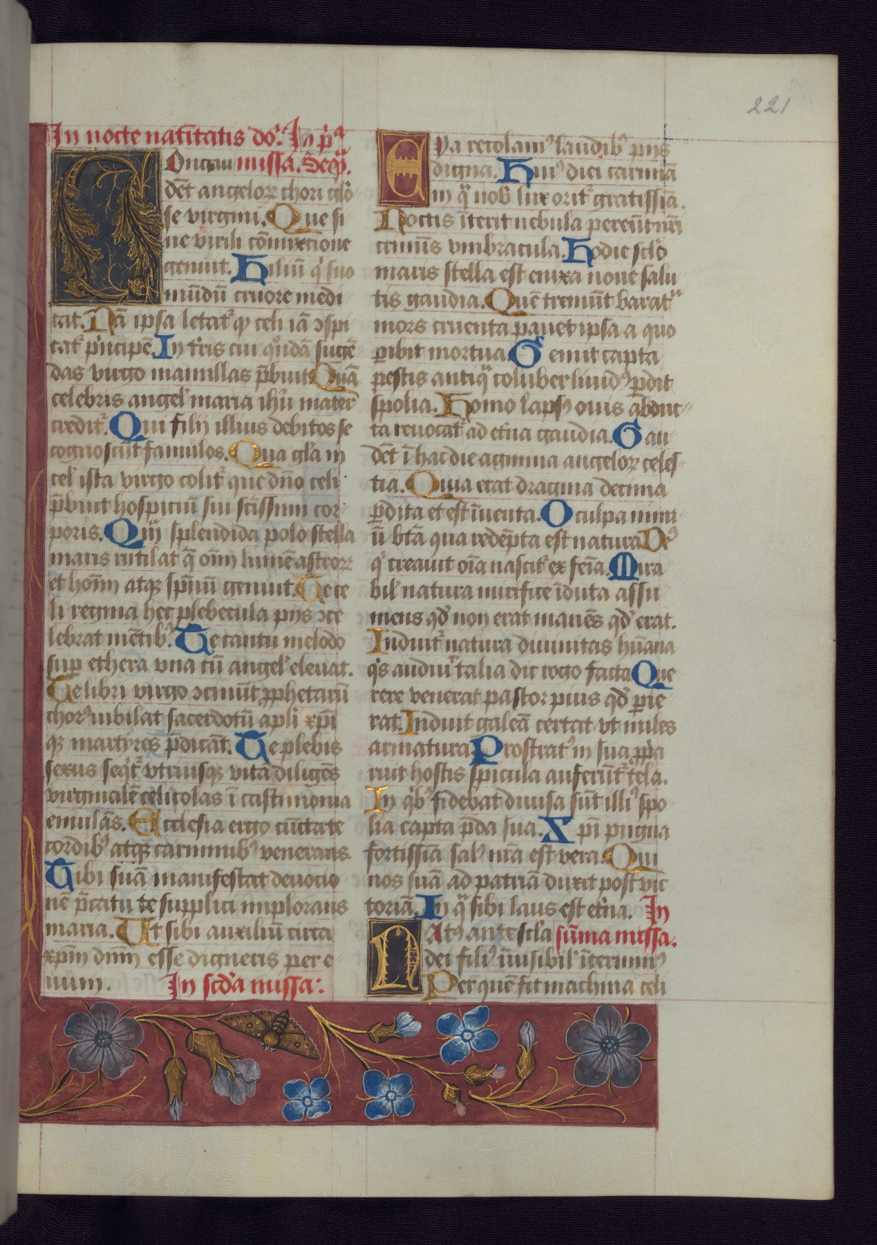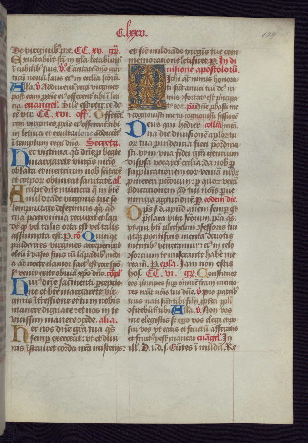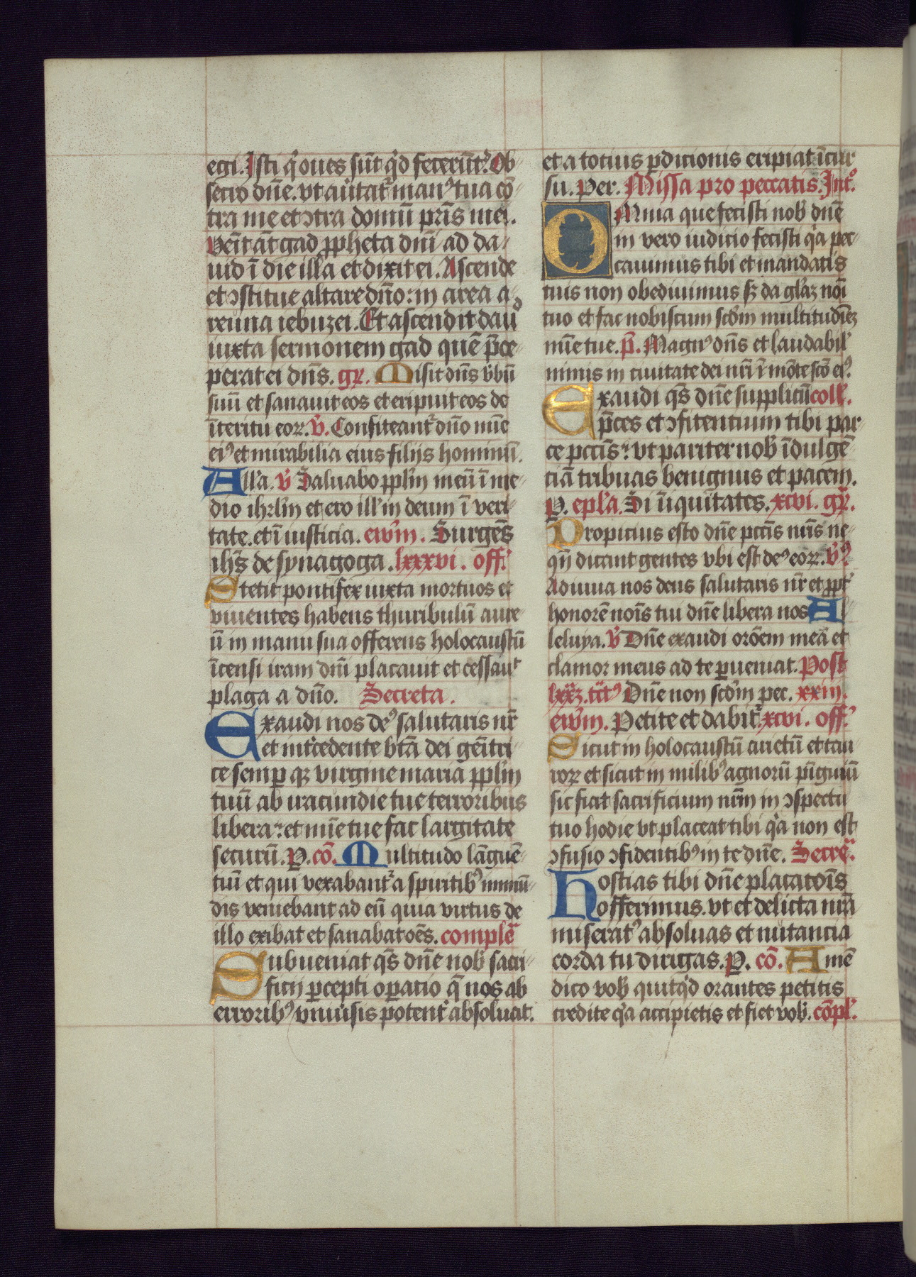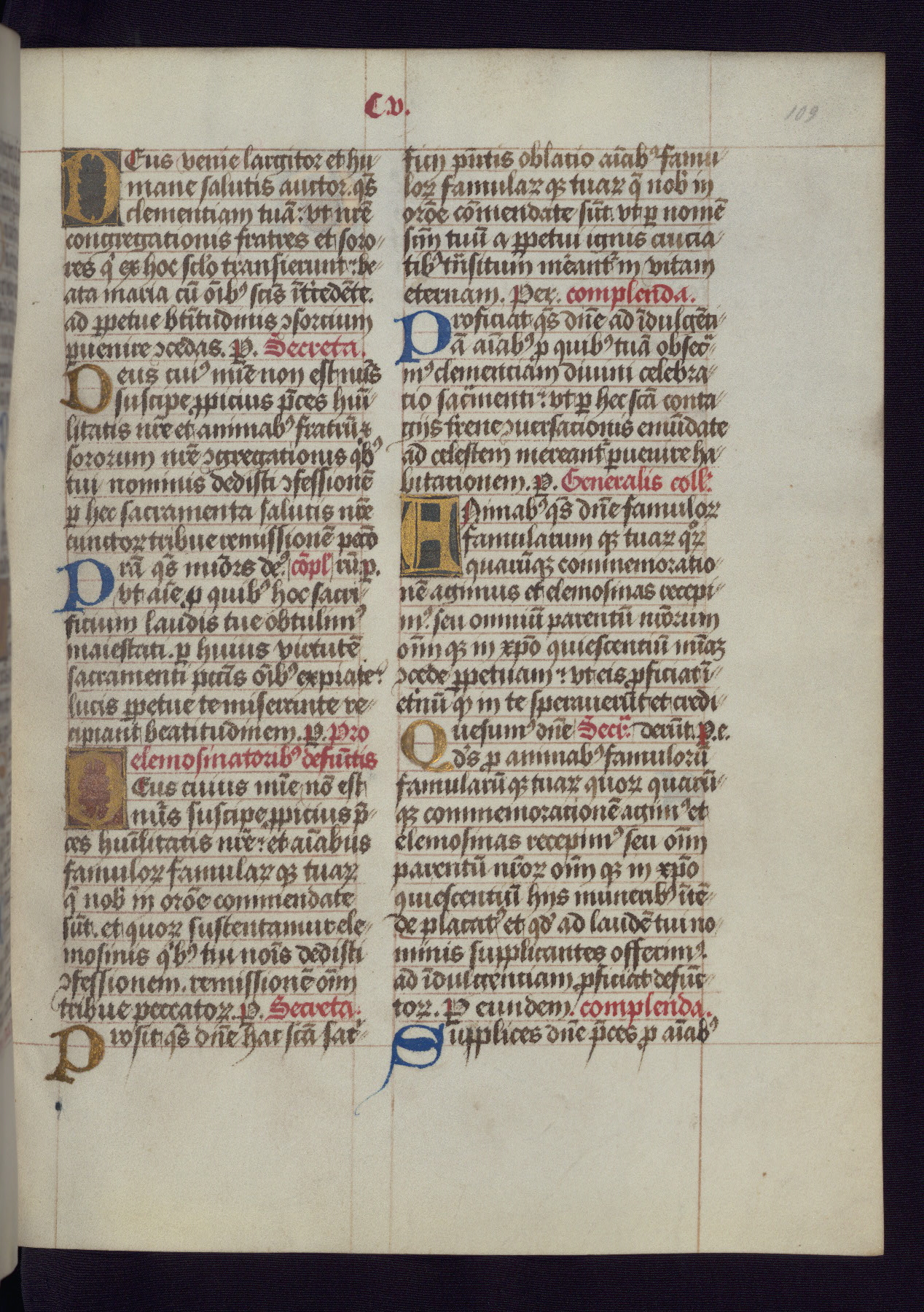 This Latin Missal was written in Utrecht, Netherlands, ca. 1500. Portraits of the original owners, whose names are not recorded, are accompanied by heraldry indicating that the husband was of the family of St. Férréol of Dauphiné; the wife was of the Cambronne of Ponthieu family. The manuscript is heavily illuminated with more than fifty historiated initials and miniatures by a group of artists known in scholarship as the "Masters of the Dark Eyes." The marginal decoration is also notable, for along with naturalistic flowers, insects, and jewels, there are several instances where the margin itself is historiated. This Missal provides an excellent example of the "Masters of the Dark Eyes" style, and there are a number of related manuscripts that have been identified by these same artists, including two at The Hague: KB, 76 G 9, and KB, 135 E 19.