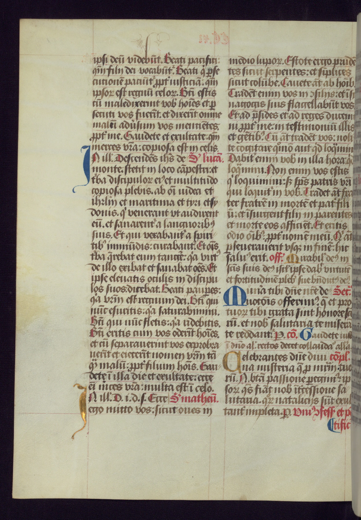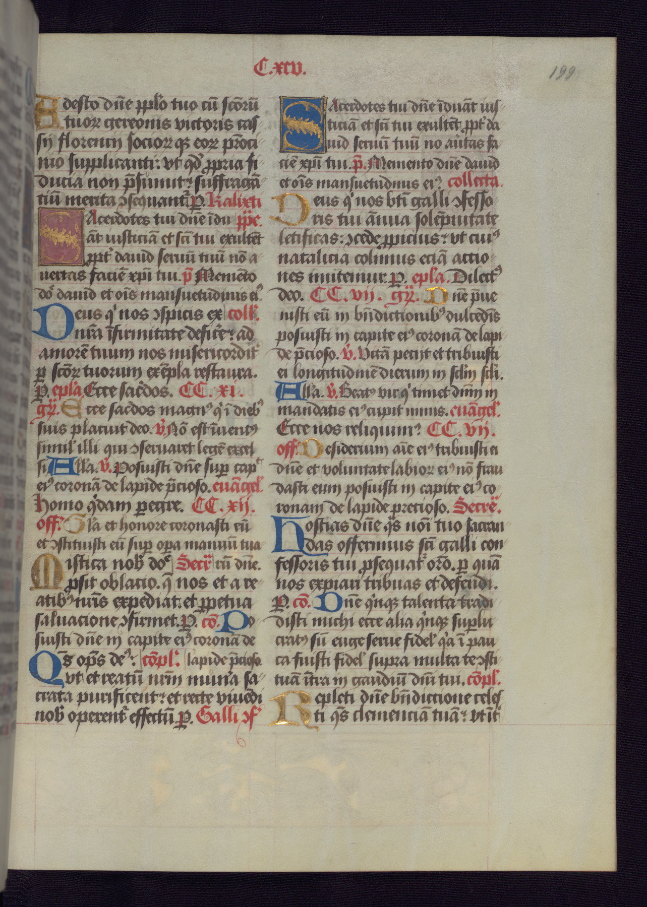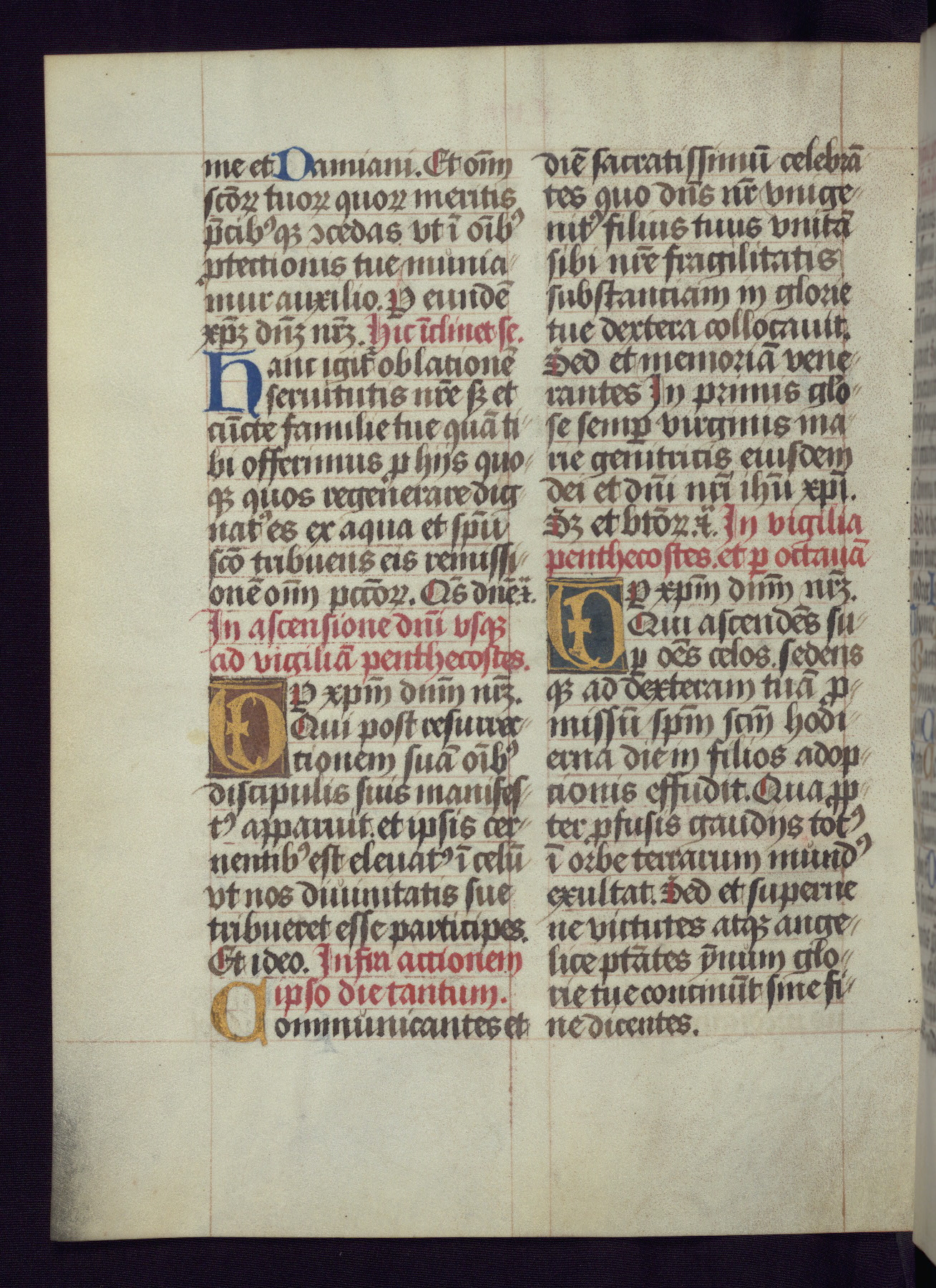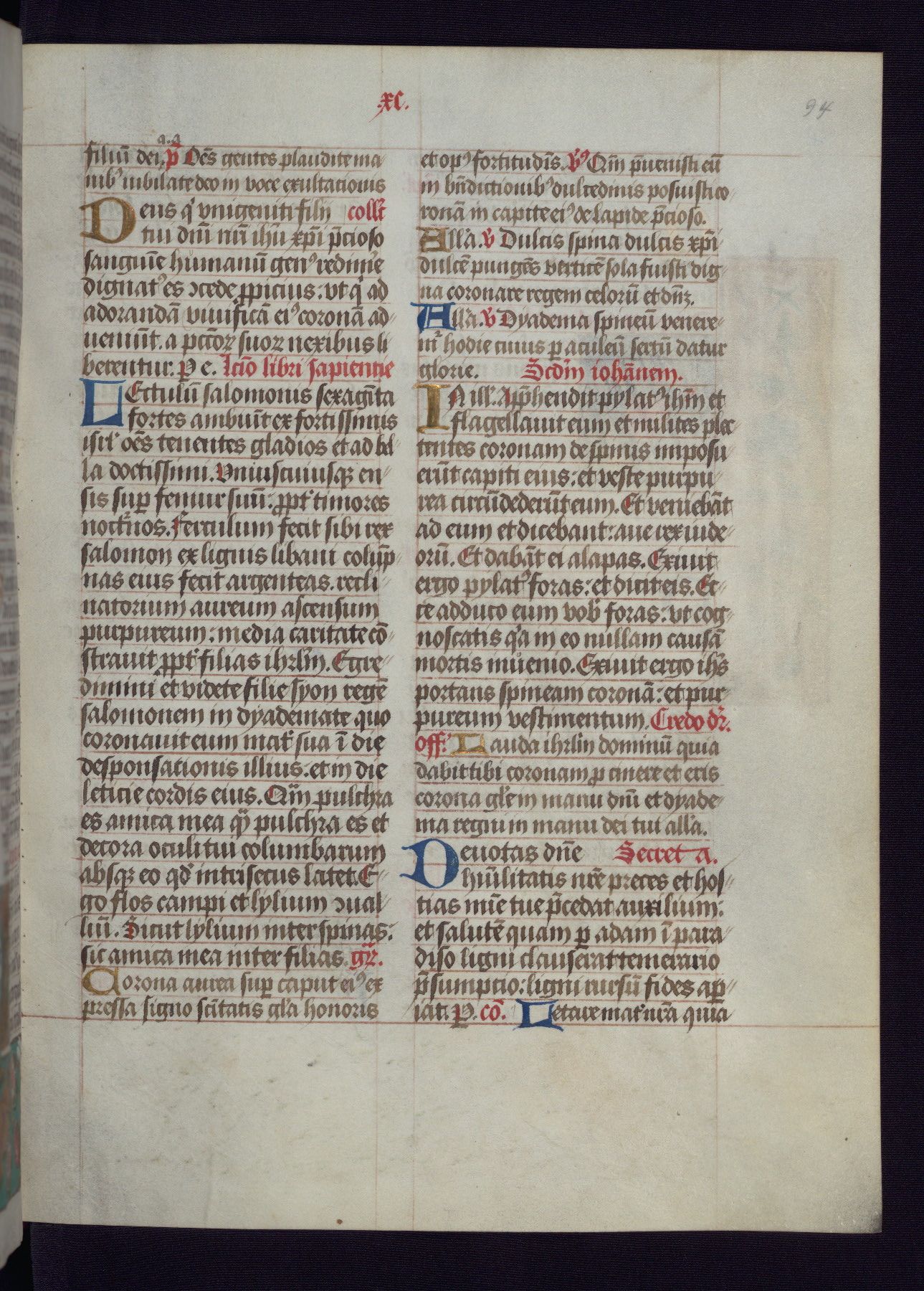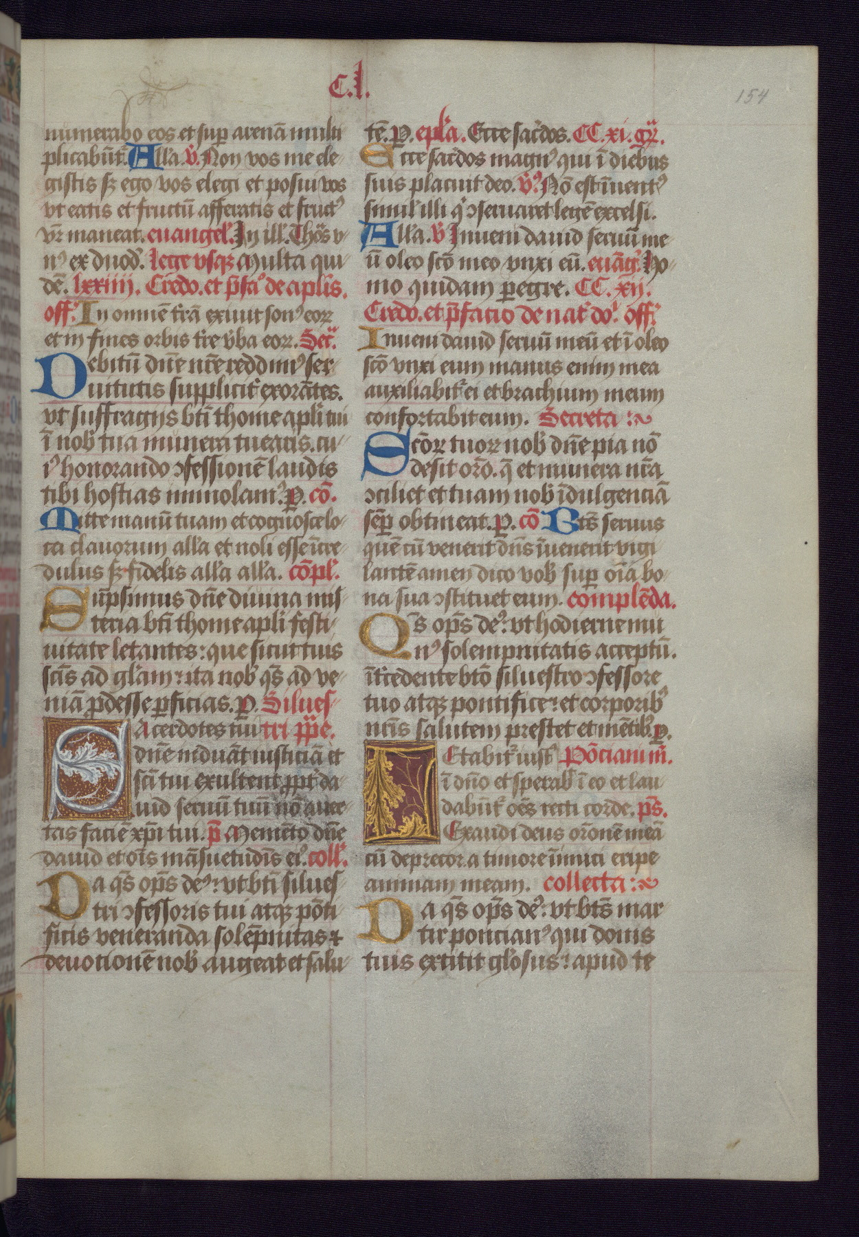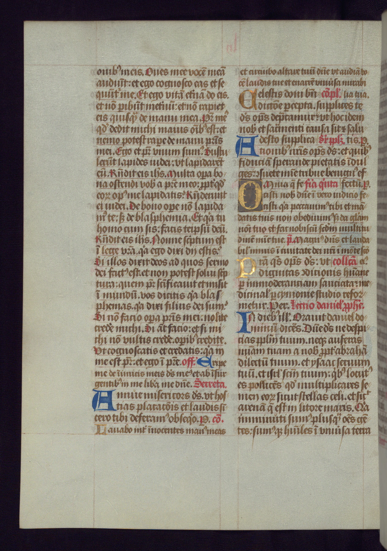 This Latin Missal was written in Utrecht, Netherlands, ca. 1500. Portraits of the original owners, whose names are not recorded, are accompanied by heraldry indicating that the husband was of the family of St. Férréol of Dauphiné; the wife was of the Cambronne of Ponthieu family. The manuscript is heavily illuminated with more than fifty historiated initials and miniatures by a group of artists known in scholarship as the "Masters of the Dark Eyes." The marginal decoration is also notable, for along with naturalistic flowers, insects, and jewels, there are several instances where the margin itself is historiated. This Missal provides an excellent example of the "Masters of the Dark Eyes" style, and there are a number of related manuscripts that have been identified by these same artists, including two at The Hague: KB, 76 G 9, and KB, 135 E 19.