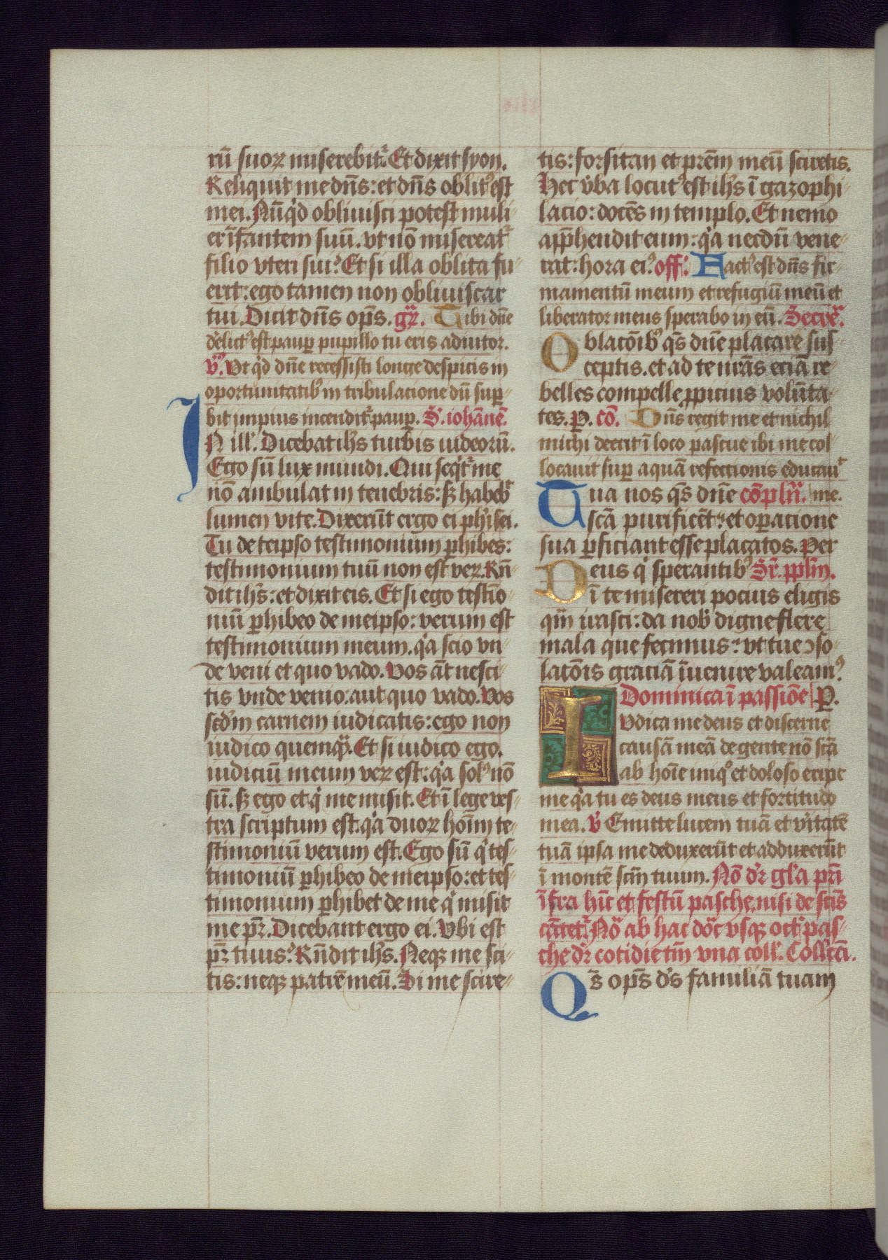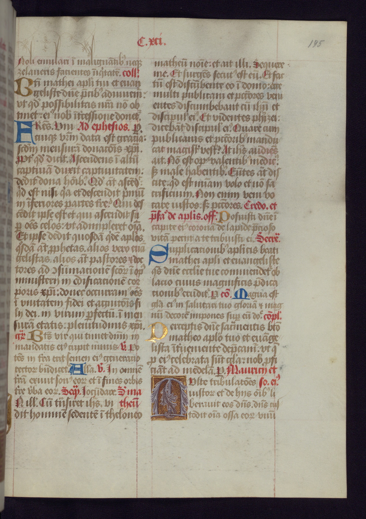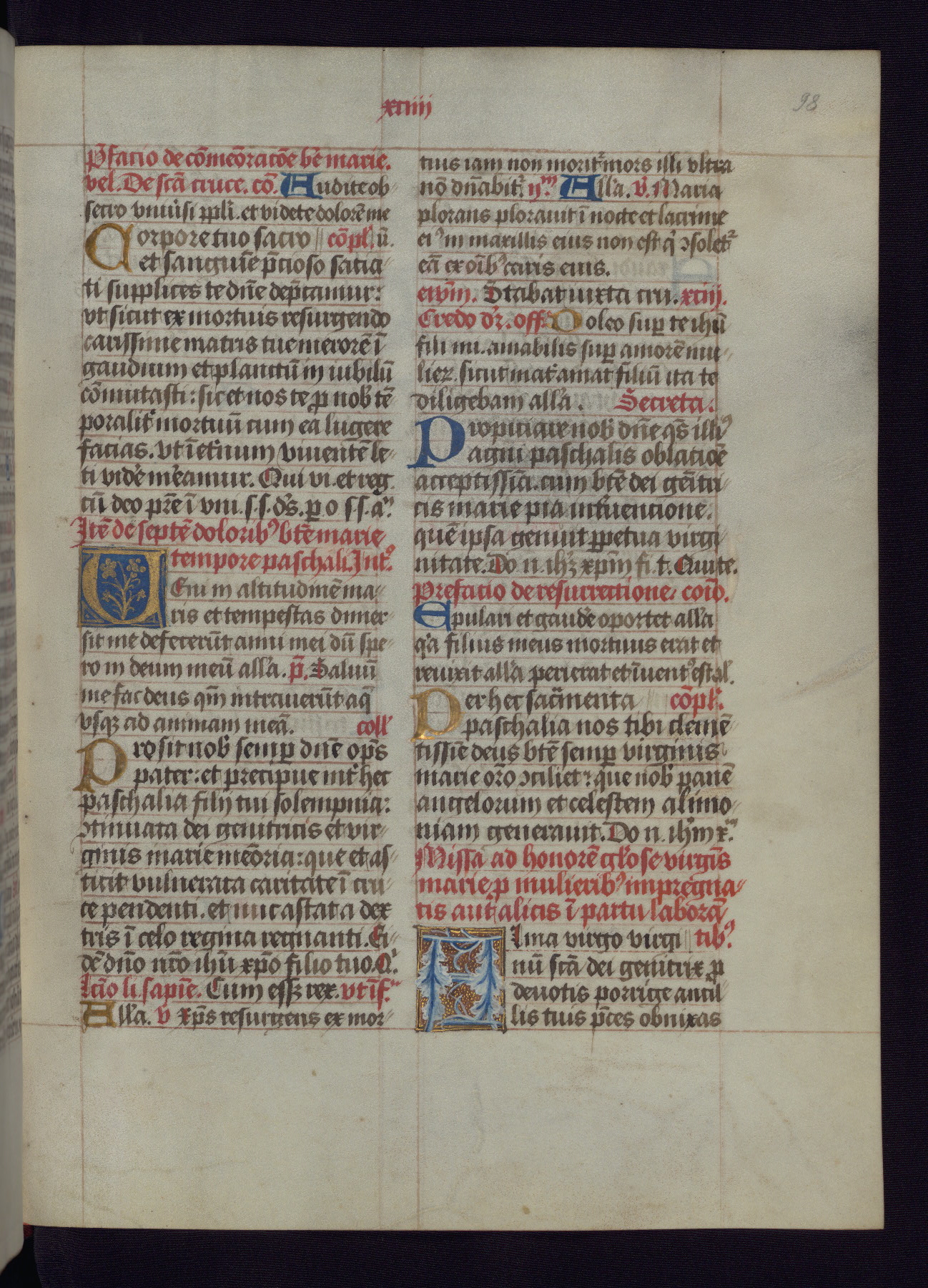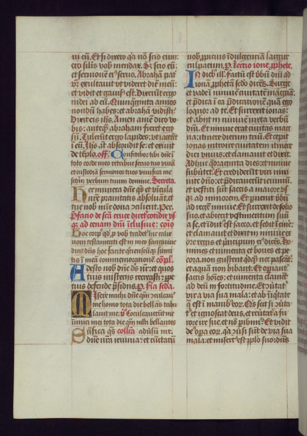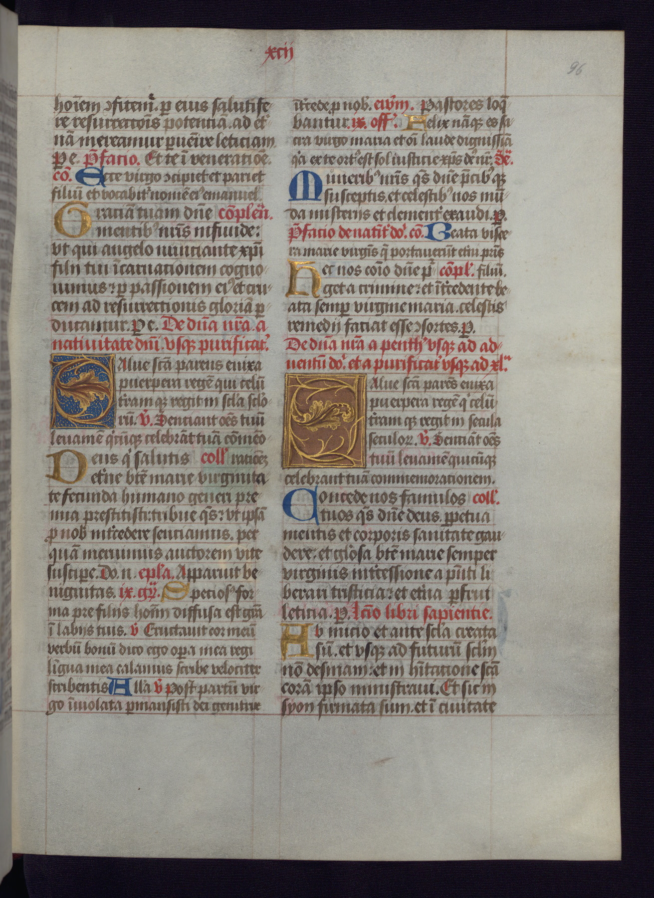 This Latin Missal was written in Utrecht, Netherlands, ca. 1500. Portraits of the original owners, whose names are not recorded, are accompanied by heraldry indicating that the husband was of the family of St. Férréol of Dauphiné; the wife was of the Cambronne of Ponthieu family. The manuscript is heavily illuminated with more than fifty historiated initials and miniatures by a group of artists known in scholarship as the "Masters of the Dark Eyes." The marginal decoration is also notable, for along with naturalistic flowers, insects, and jewels, there are several instances where the margin itself is historiated. This Missal provides an excellent example of the "Masters of the Dark Eyes" style, and there are a number of related manuscripts that have been identified by these same artists, including two at The Hague: KB, 76 G 9, and KB, 135 E 19.