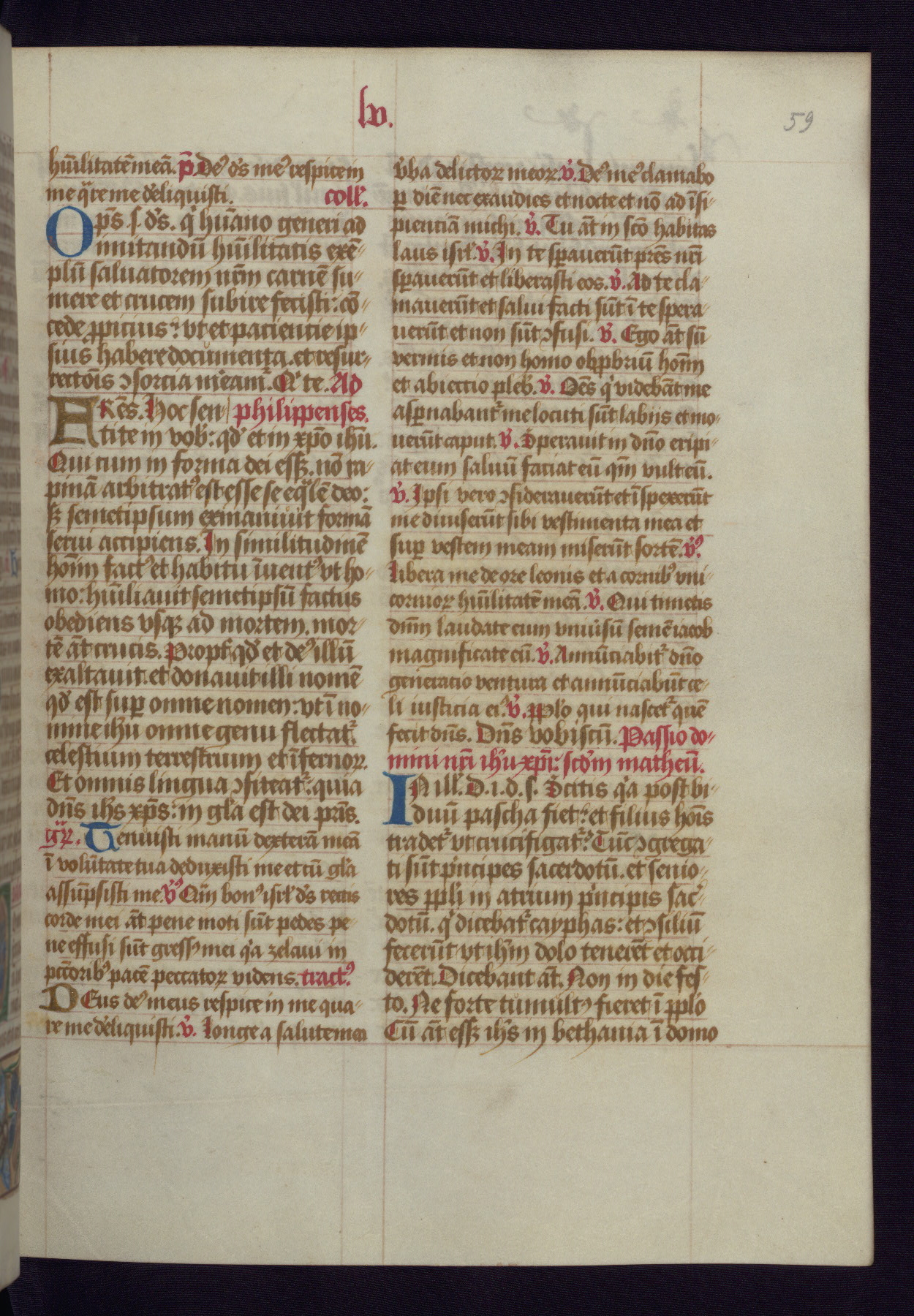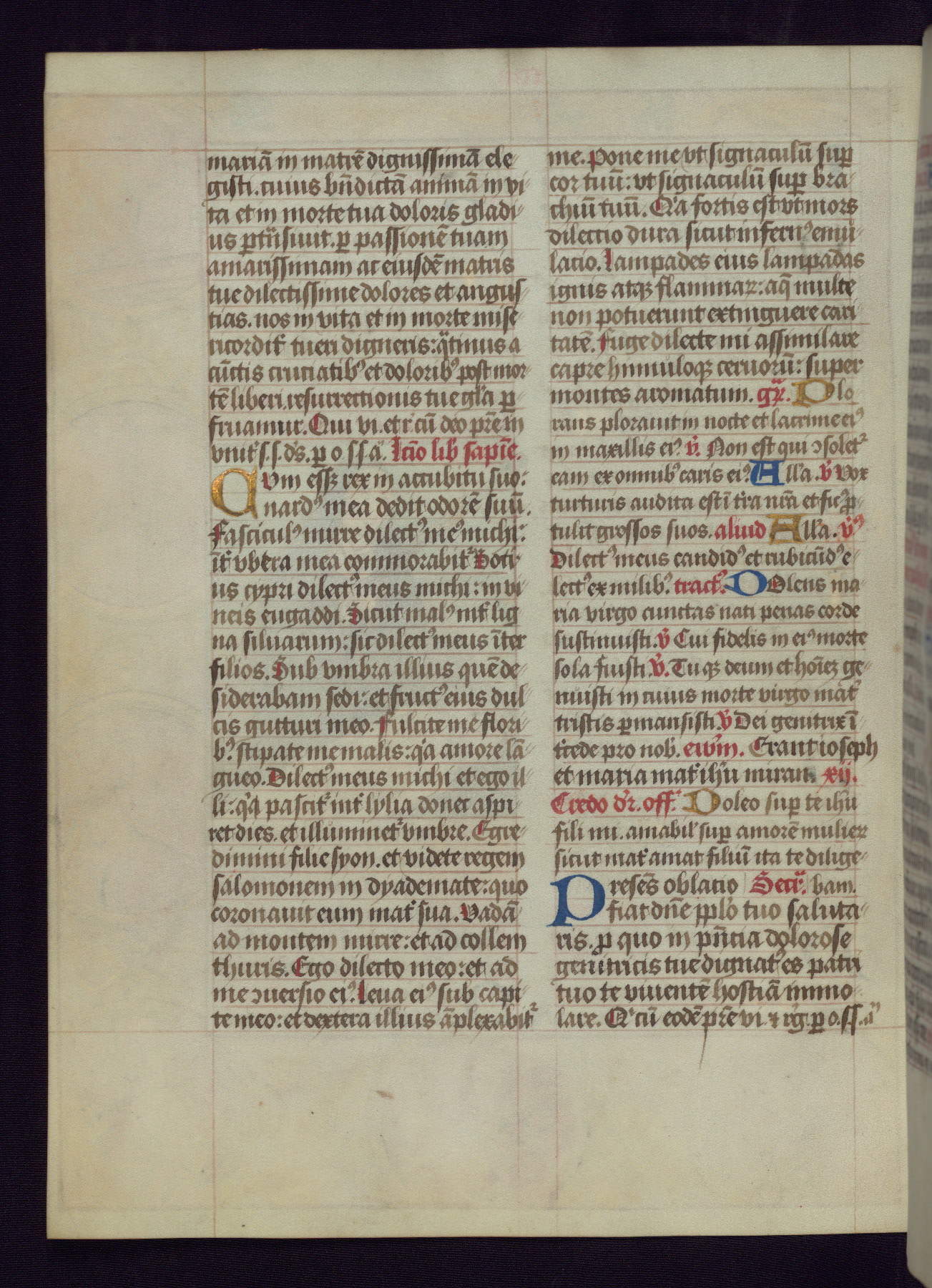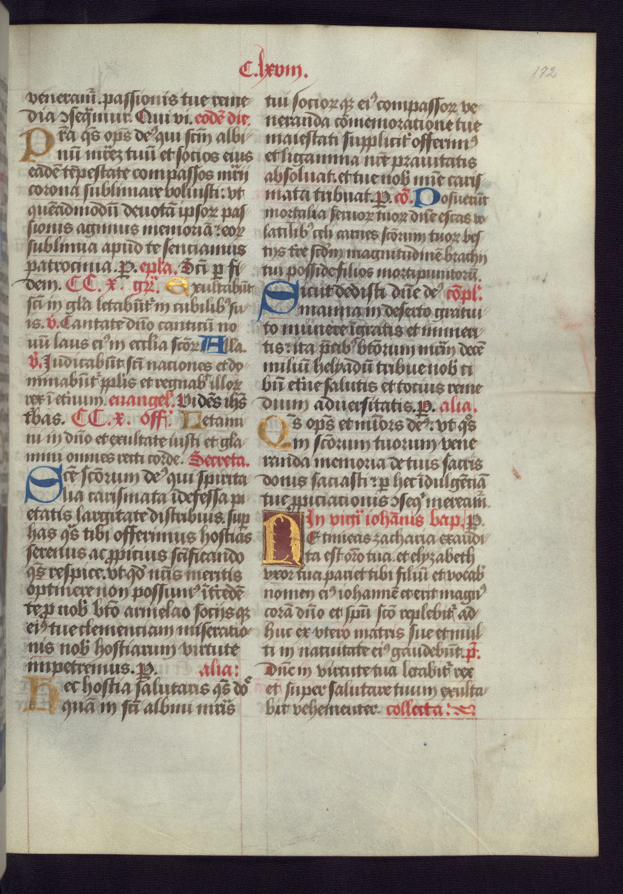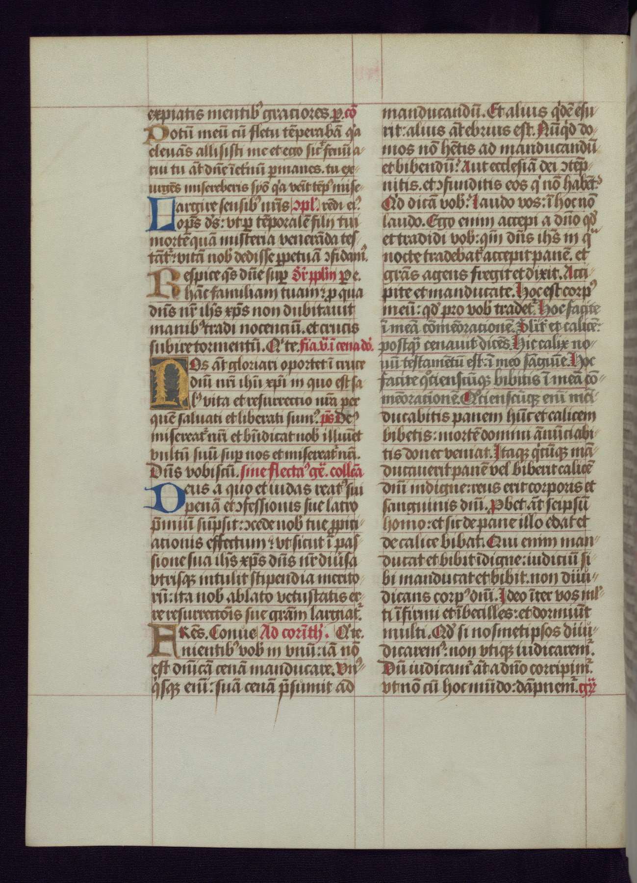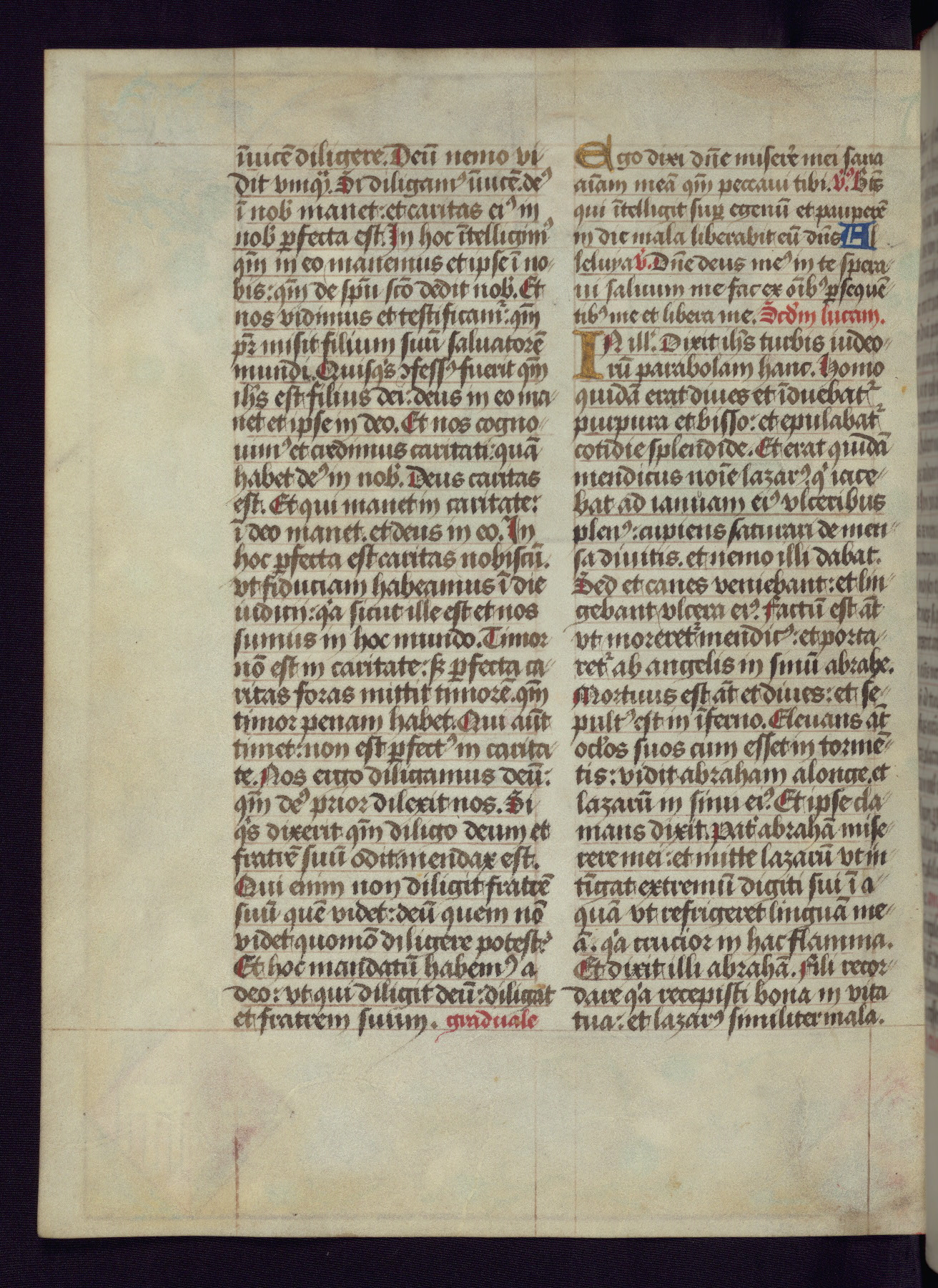 This Latin Missal was written in Utrecht, Netherlands, ca. 1500. Portraits of the original owners, whose names are not recorded, are accompanied by heraldry indicating that the husband was of the family of St. Férréol of Dauphiné; the wife was of the Cambronne of Ponthieu family. The manuscript is heavily illuminated with more than fifty historiated initials and miniatures by a group of artists known in scholarship as the "Masters of the Dark Eyes." The marginal decoration is also notable, for along with naturalistic flowers, insects, and jewels, there are several instances where the margin itself is historiated. This Missal provides an excellent example of the "Masters of the Dark Eyes" style, and there are a number of related manuscripts that have been identified by these same artists, including two at The Hague: KB, 76 G 9, and KB, 135 E 19.