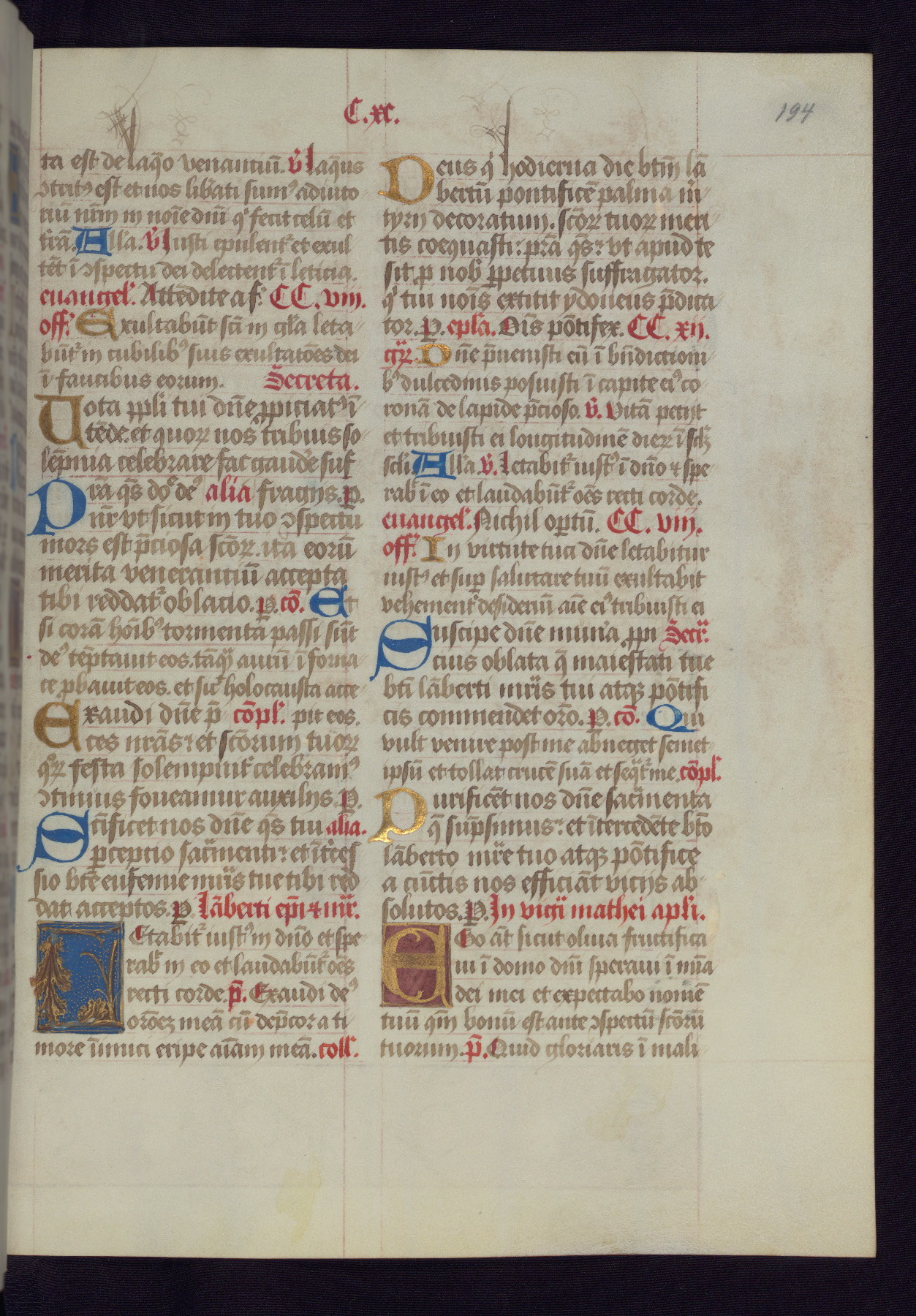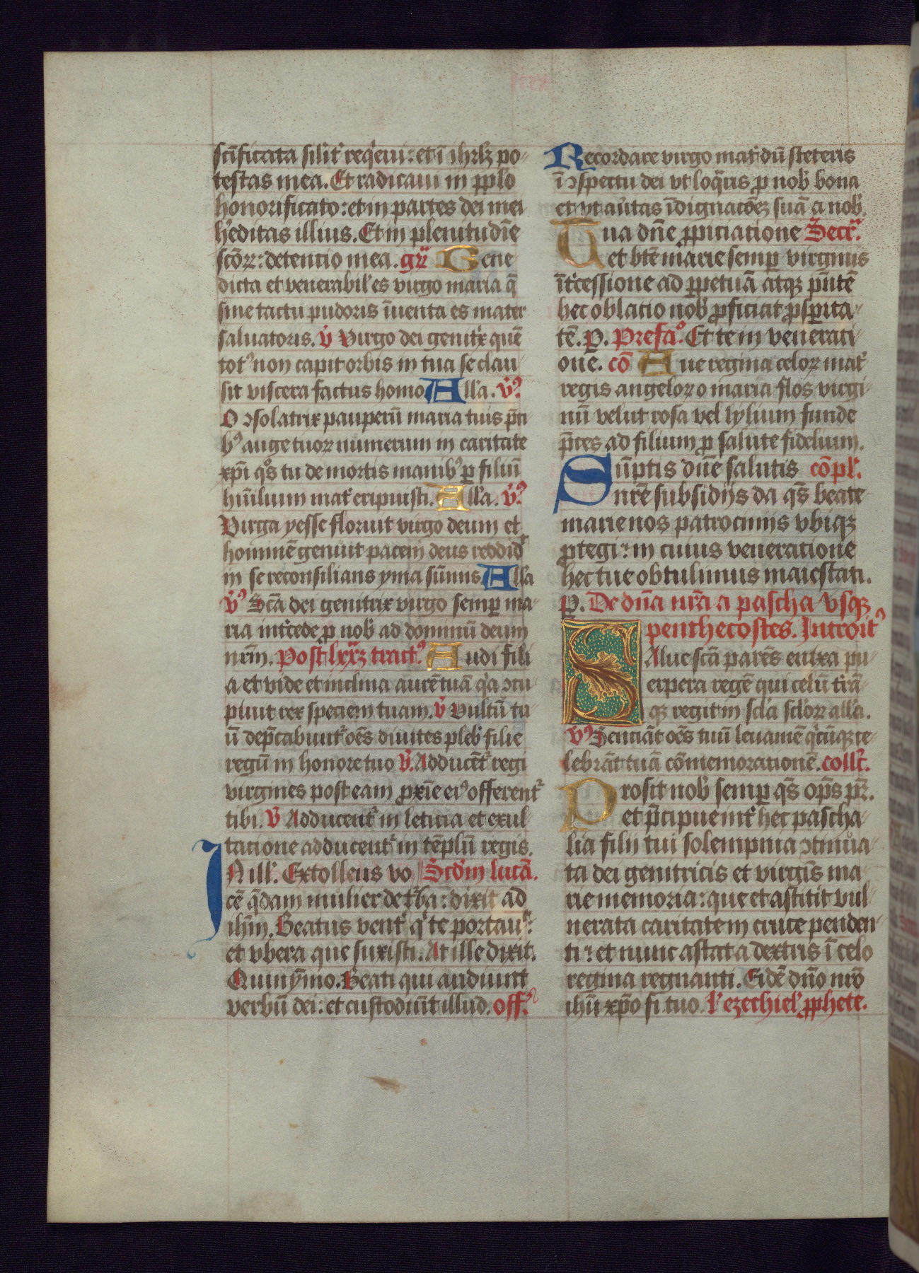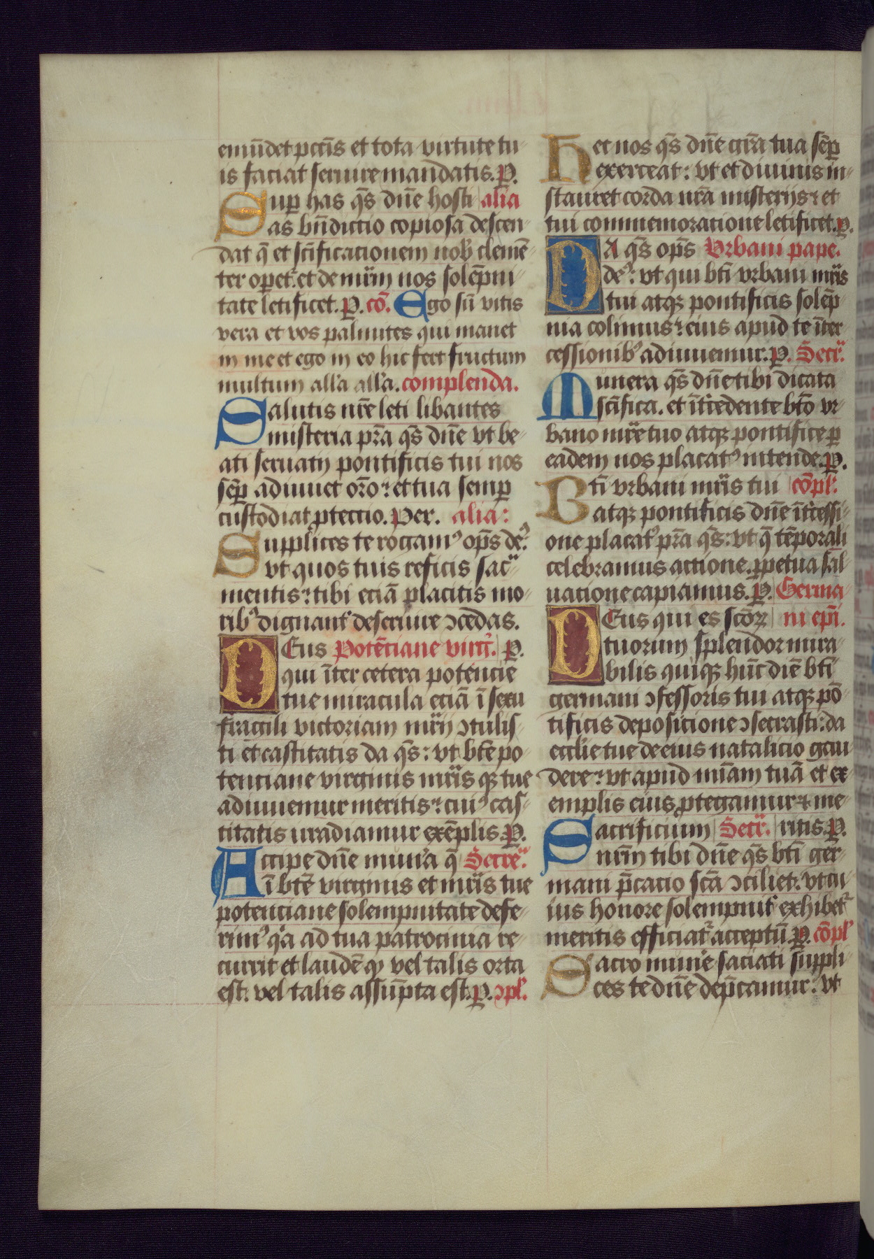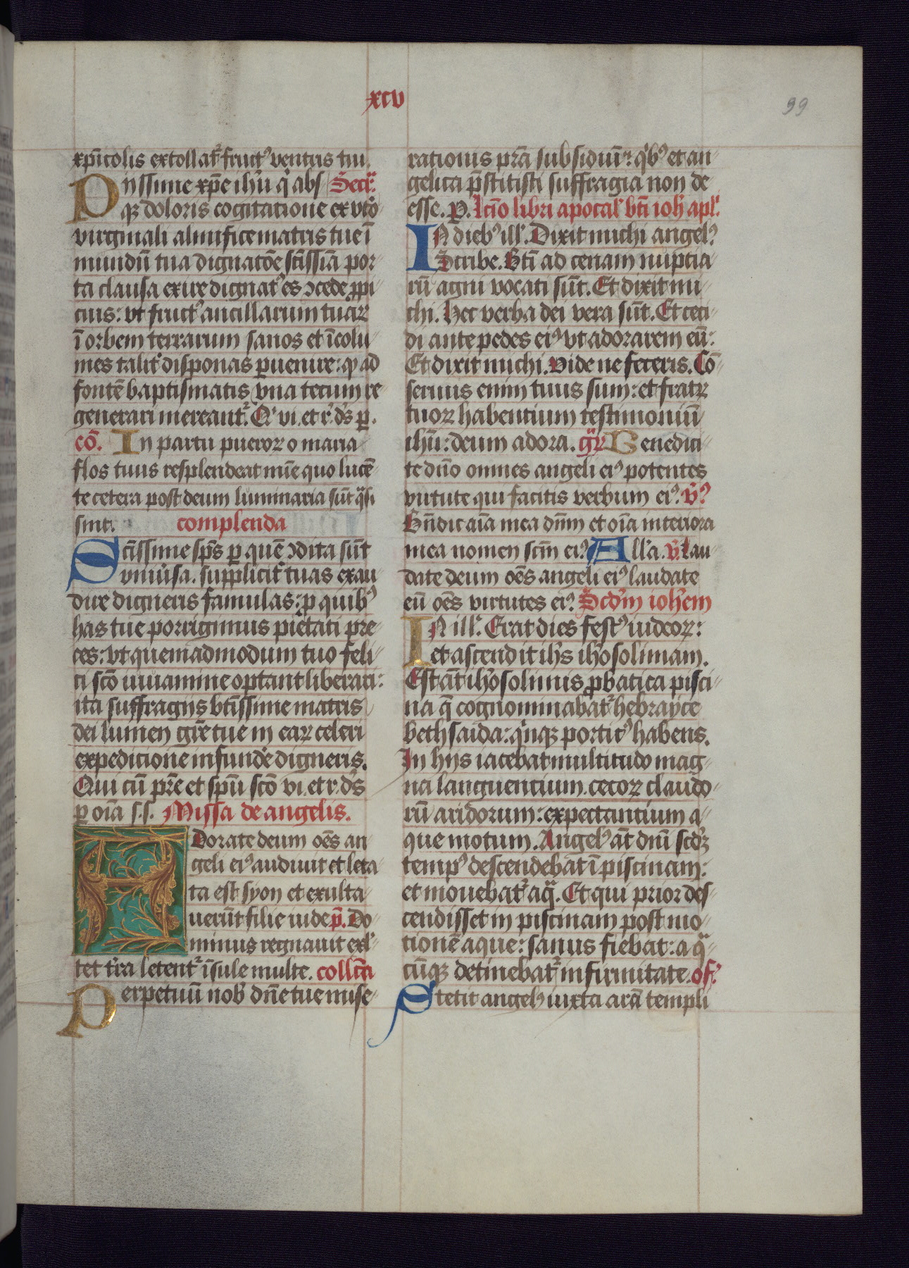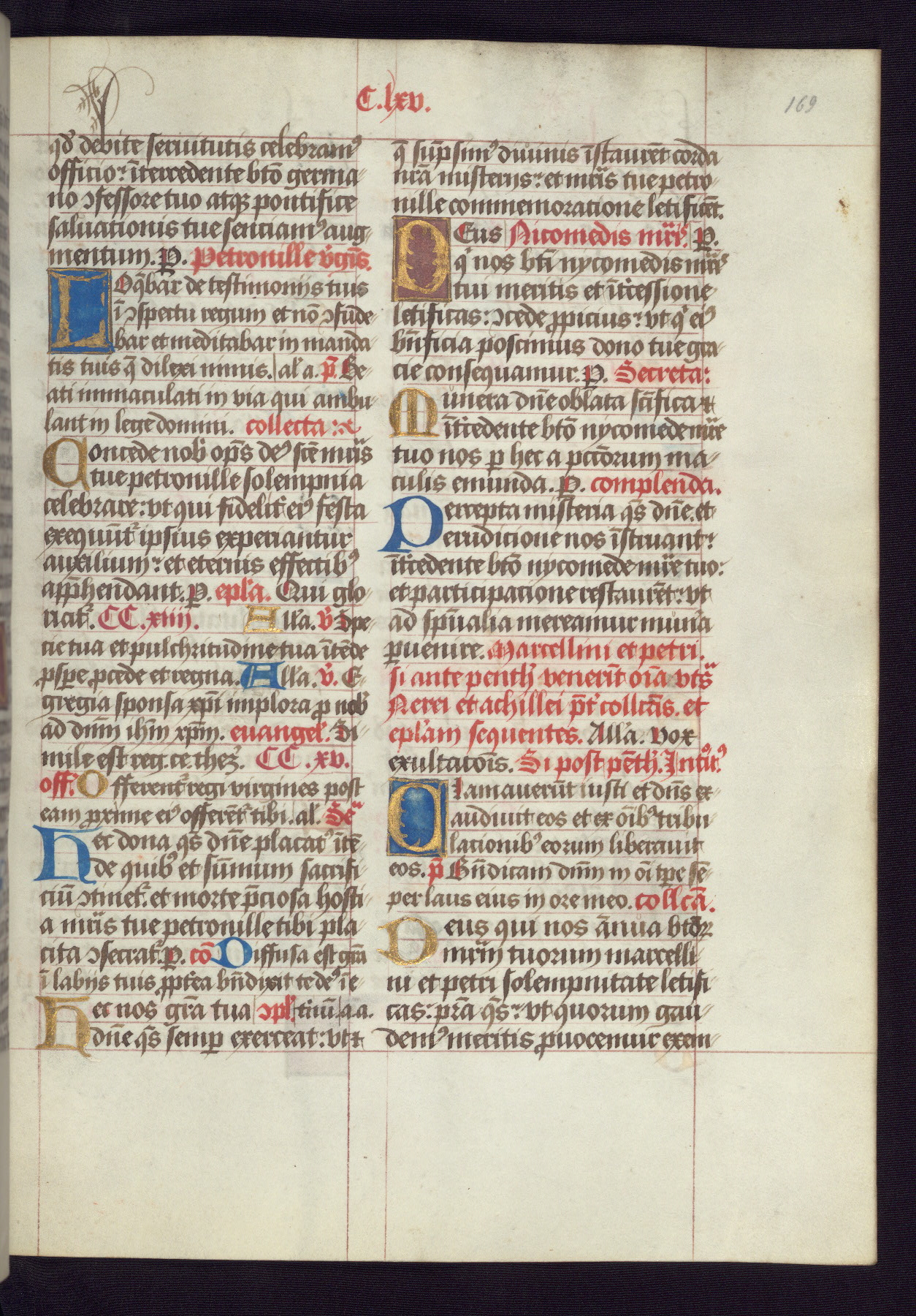 This Latin Missal was written in Utrecht, Netherlands, ca. 1500. Portraits of the original owners, whose names are not recorded, are accompanied by heraldry indicating that the husband was of the family of St. Férréol of Dauphiné; the wife was of the Cambronne of Ponthieu family. The manuscript is heavily illuminated with more than fifty historiated initials and miniatures by a group of artists known in scholarship as the "Masters of the Dark Eyes." The marginal decoration is also notable, for along with naturalistic flowers, insects, and jewels, there are several instances where the margin itself is historiated. This Missal provides an excellent example of the "Masters of the Dark Eyes" style, and there are a number of related manuscripts that have been identified by these same artists, including two at The Hague: KB, 76 G 9, and KB, 135 E 19.
