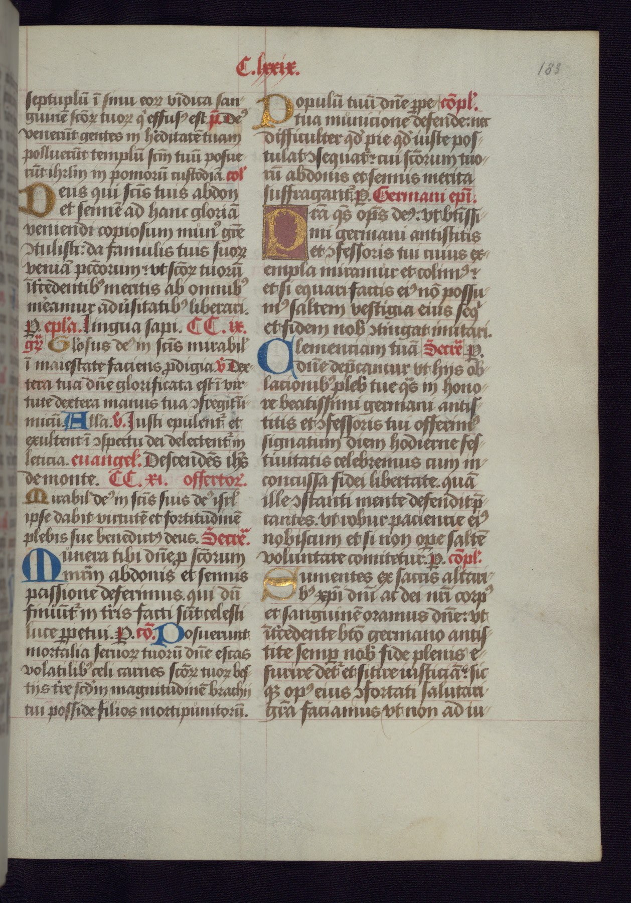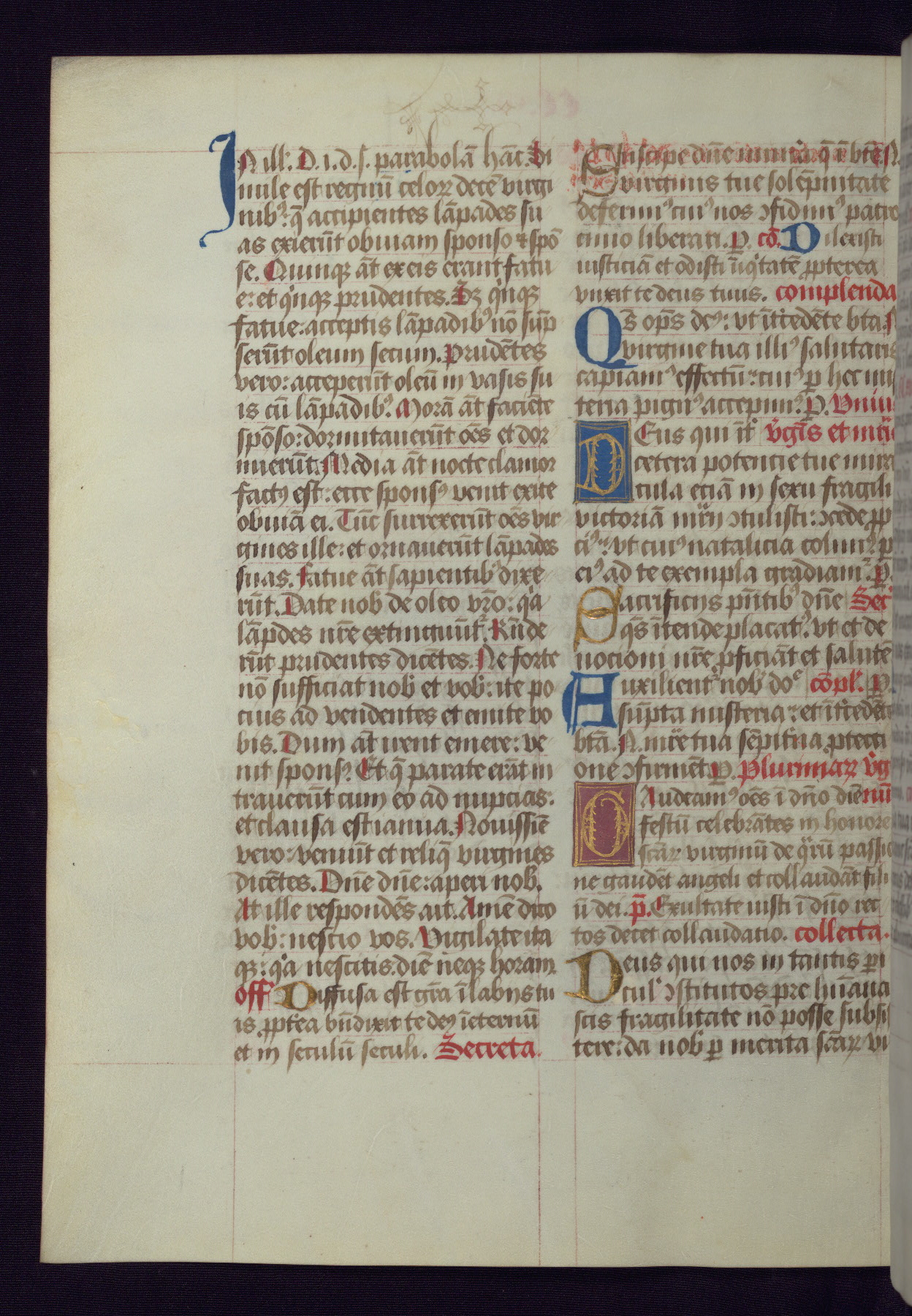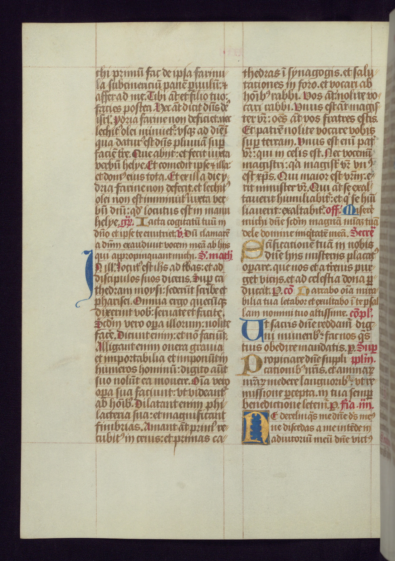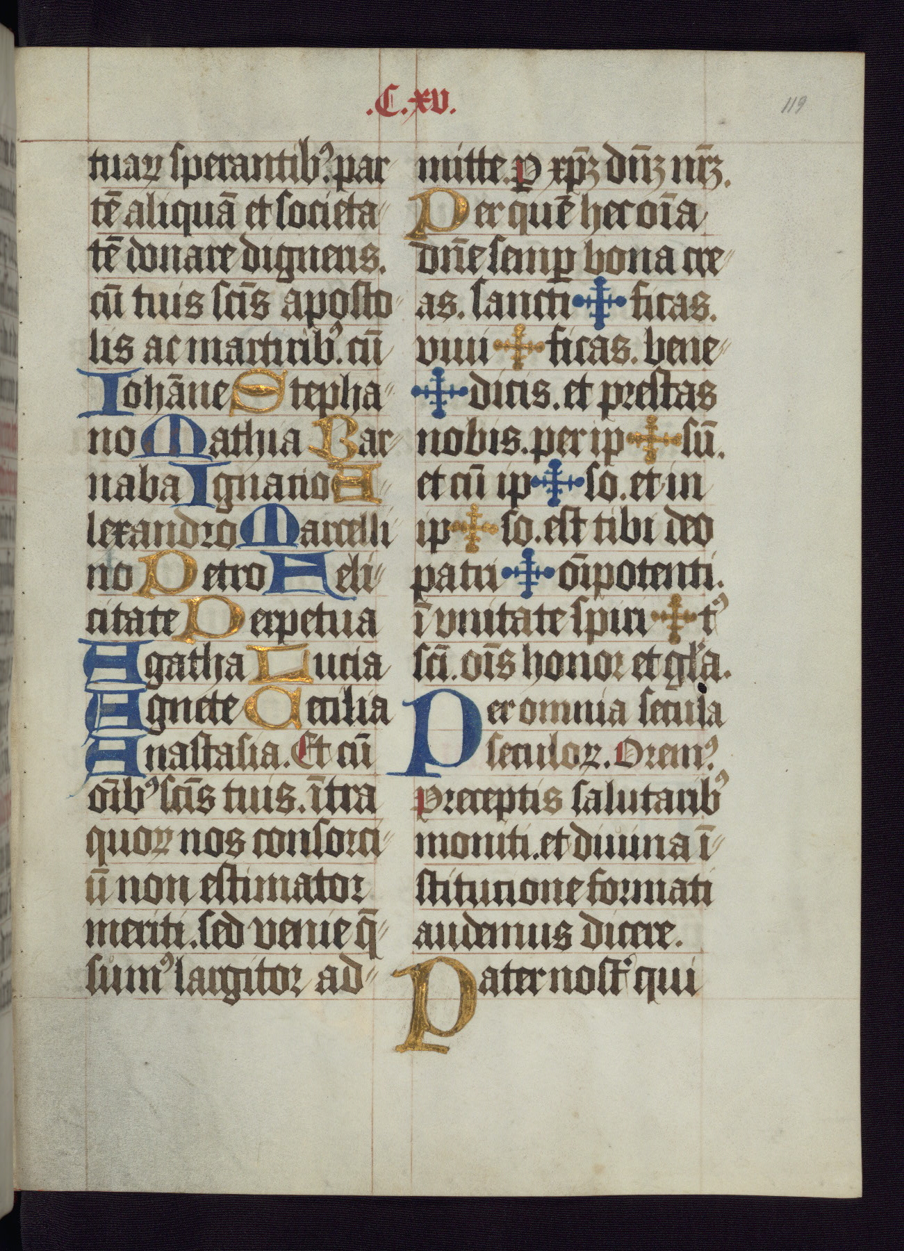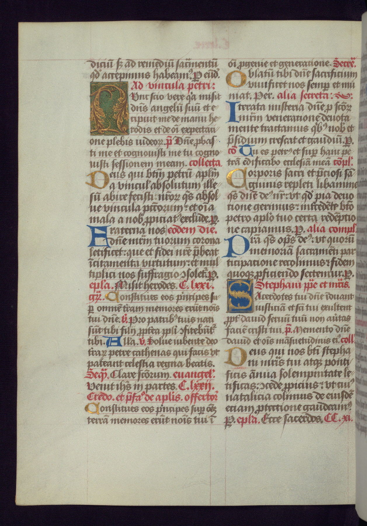 This Latin Missal was written in Utrecht, Netherlands, ca. 1500. Portraits of the original owners, whose names are not recorded, are accompanied by heraldry indicating that the husband was of the family of St. Férréol of Dauphiné; the wife was of the Cambronne of Ponthieu family. The manuscript is heavily illuminated with more than fifty historiated initials and miniatures by a group of artists known in scholarship as the "Masters of the Dark Eyes." The marginal decoration is also notable, for along with naturalistic flowers, insects, and jewels, there are several instances where the margin itself is historiated. This Missal provides an excellent example of the "Masters of the Dark Eyes" style, and there are a number of related manuscripts that have been identified by these same artists, including two at The Hague: KB, 76 G 9, and KB, 135 E 19.