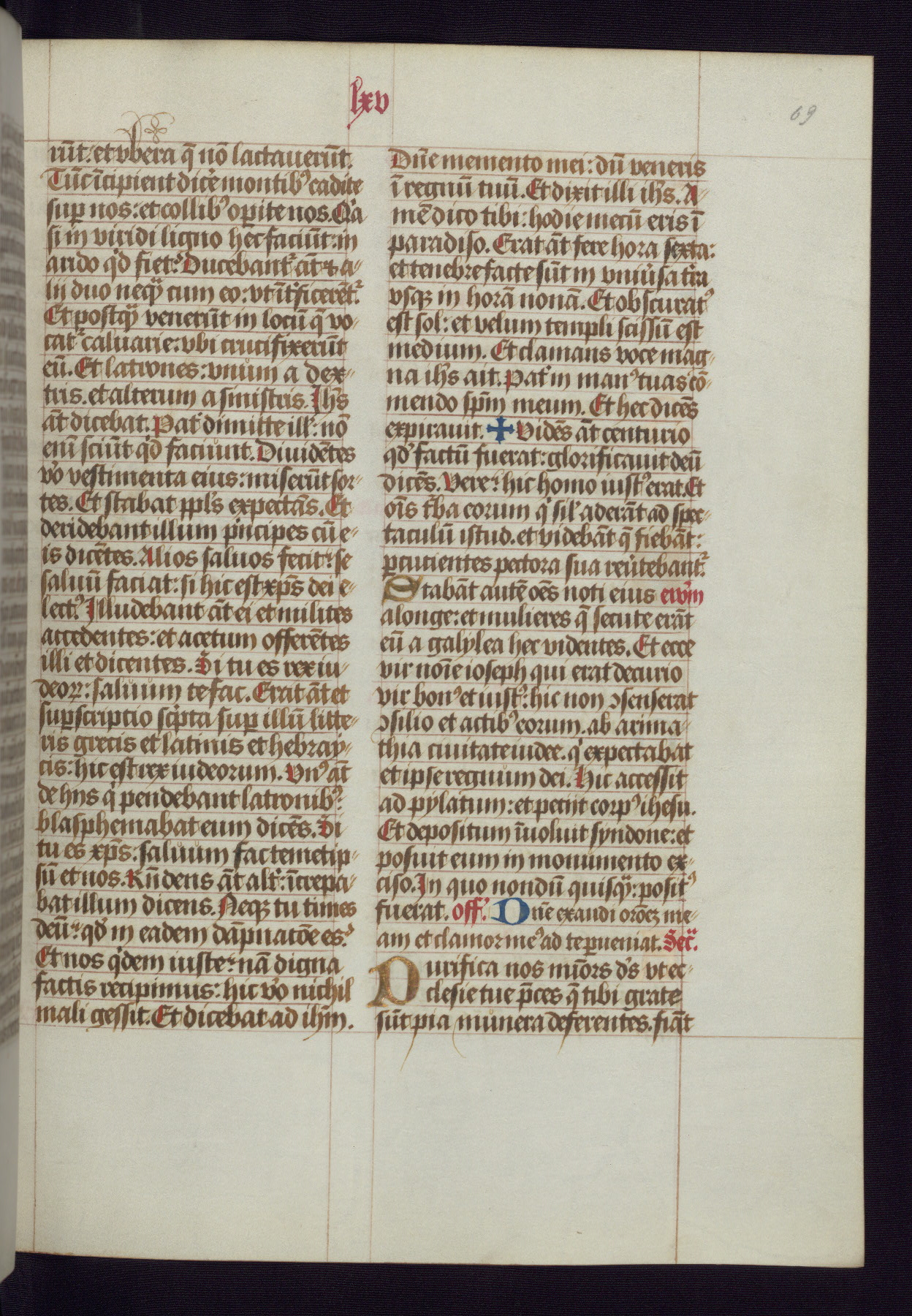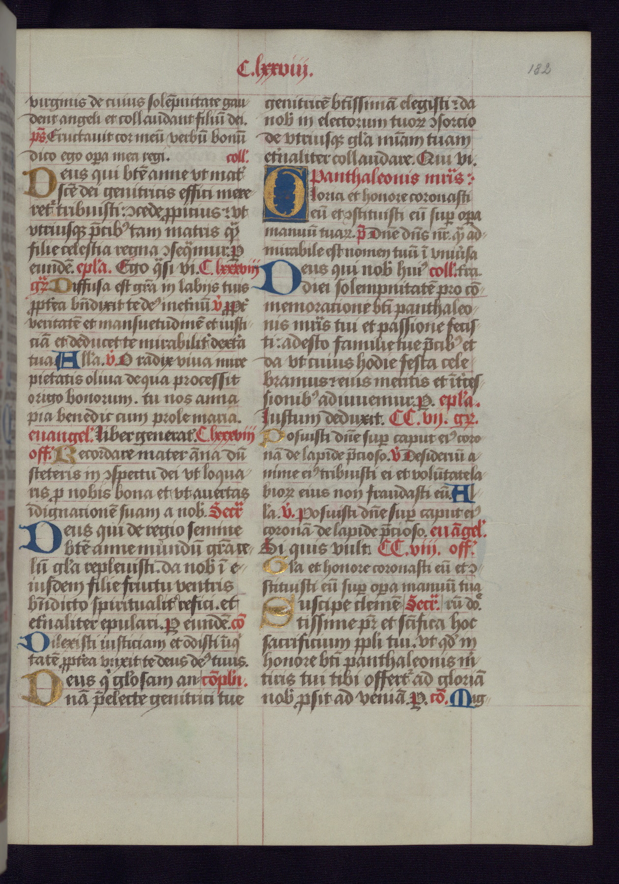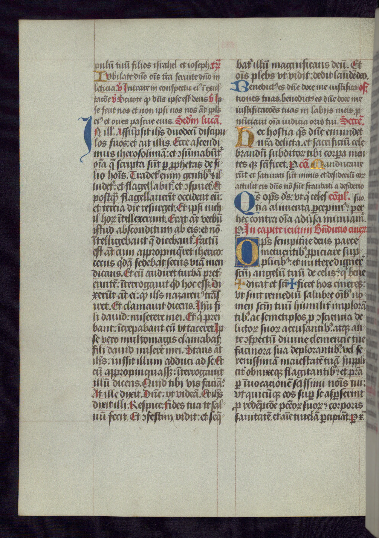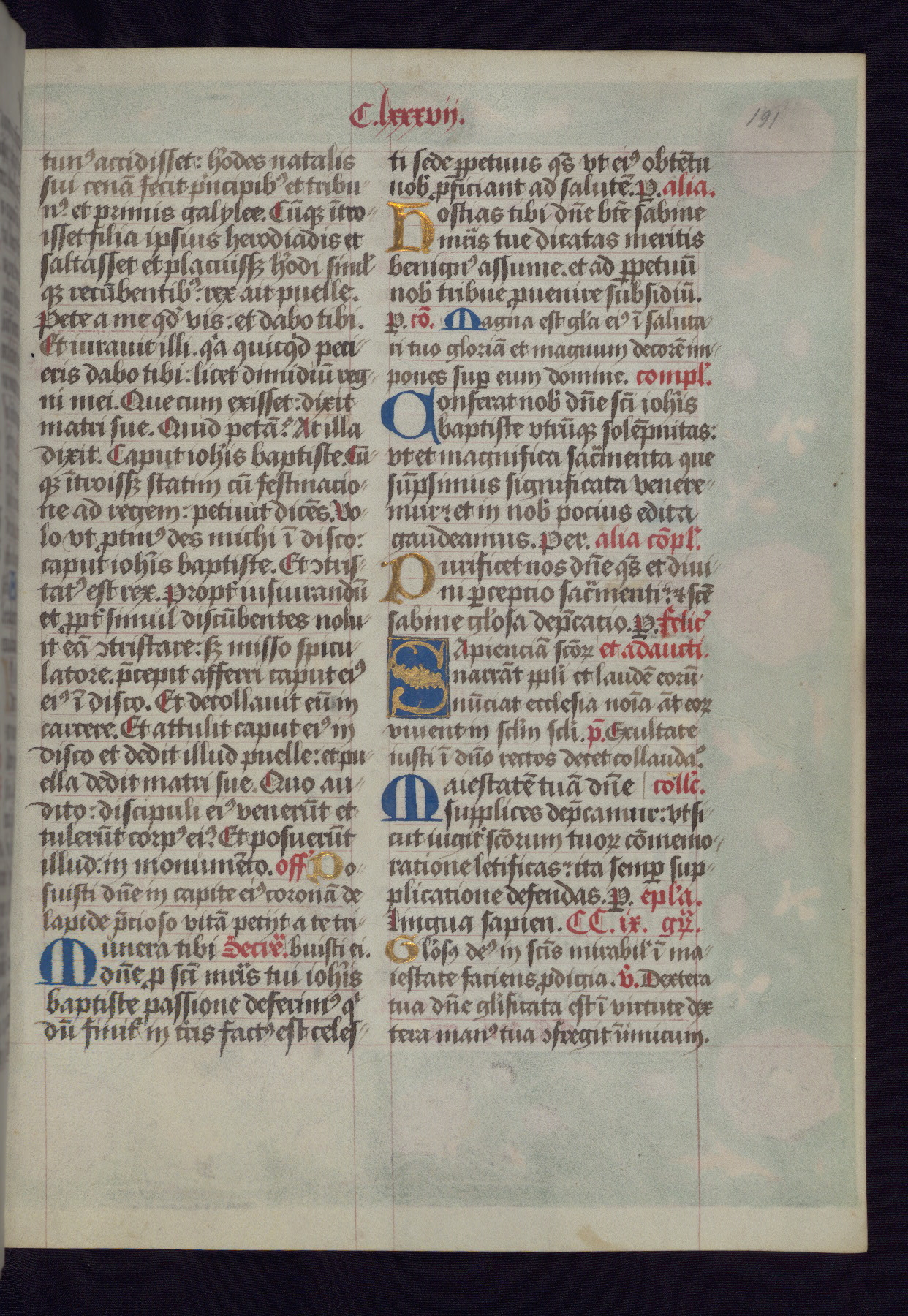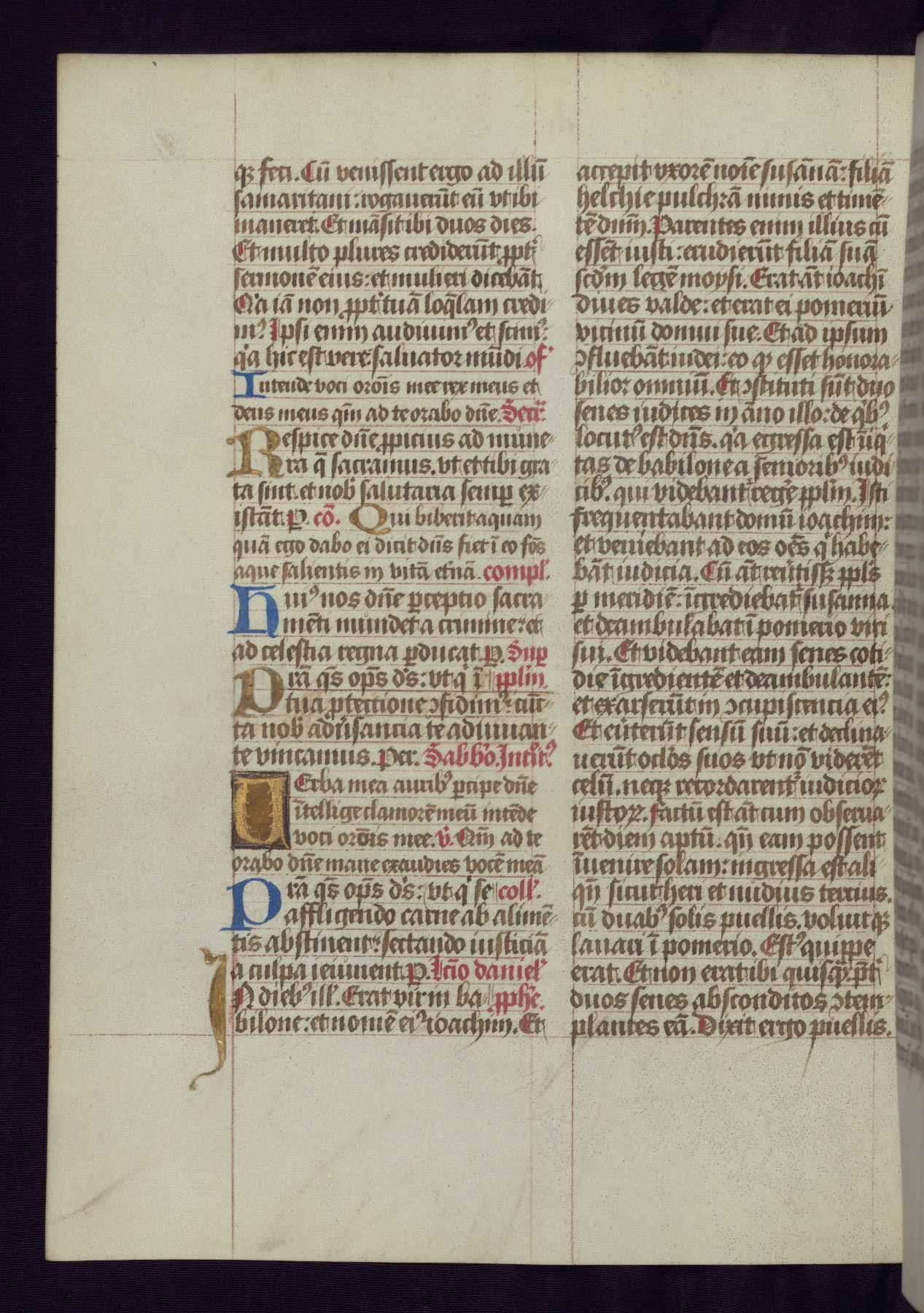 This Latin Missal was written in Utrecht, Netherlands, ca. 1500. Portraits of the original owners, whose names are not recorded, are accompanied by heraldry indicating that the husband was of the family of St. Férréol of Dauphiné; the wife was of the Cambronne of Ponthieu family. The manuscript is heavily illuminated with more than fifty historiated initials and miniatures by a group of artists known in scholarship as the "Masters of the Dark Eyes." The marginal decoration is also notable, for along with naturalistic flowers, insects, and jewels, there are several instances where the margin itself is historiated. This Missal provides an excellent example of the "Masters of the Dark Eyes" style, and there are a number of related manuscripts that have been identified by these same artists, including two at The Hague: KB, 76 G 9, and KB, 135 E 19.