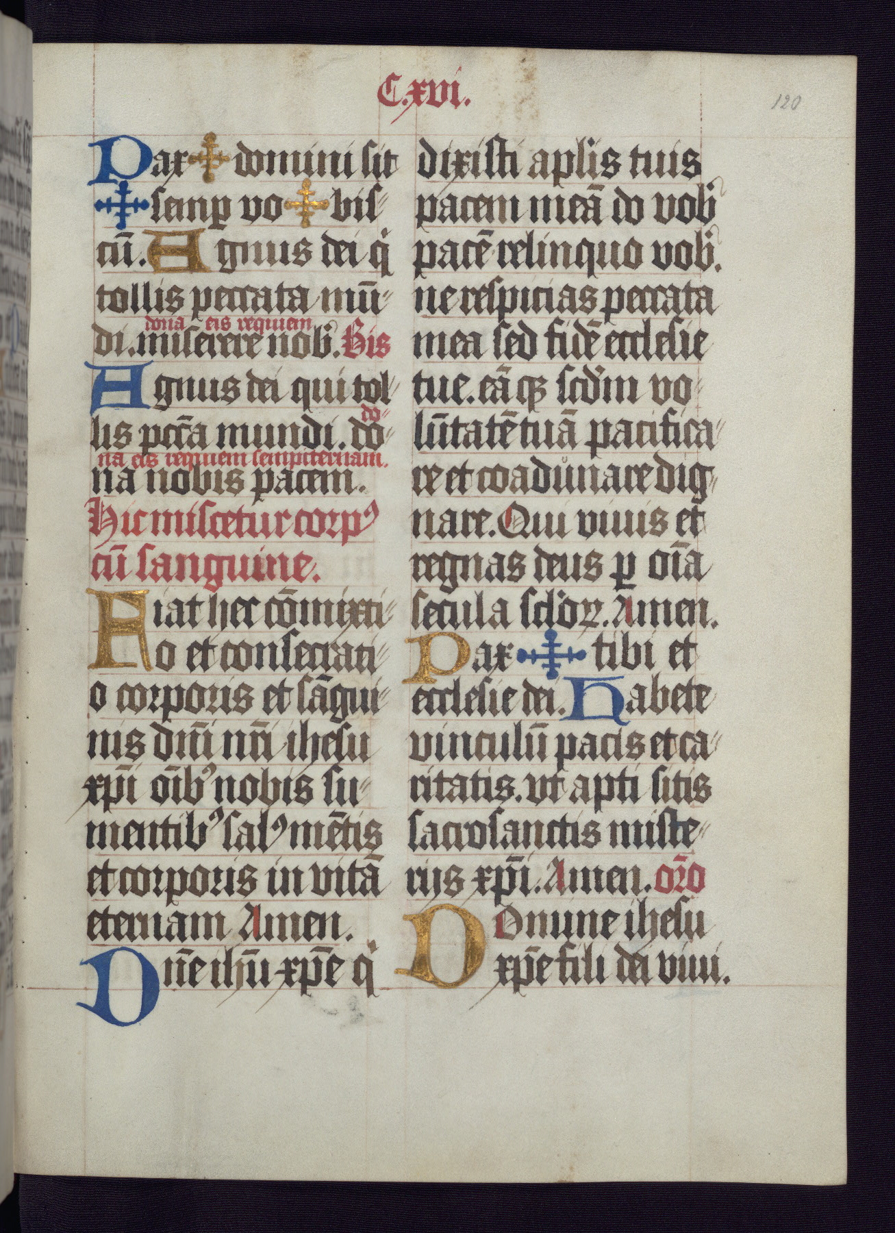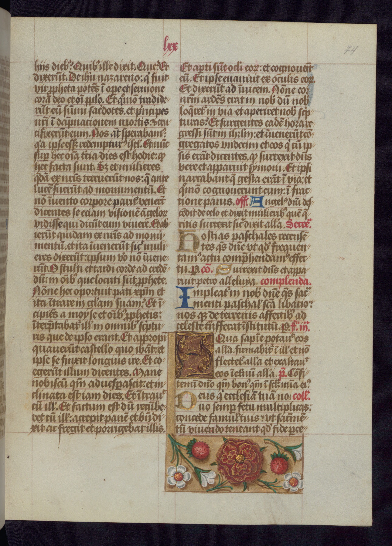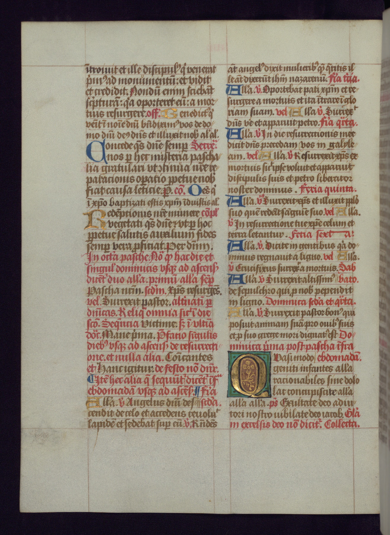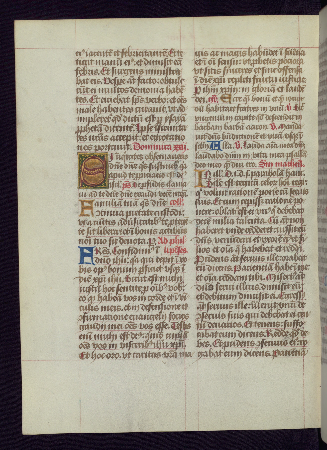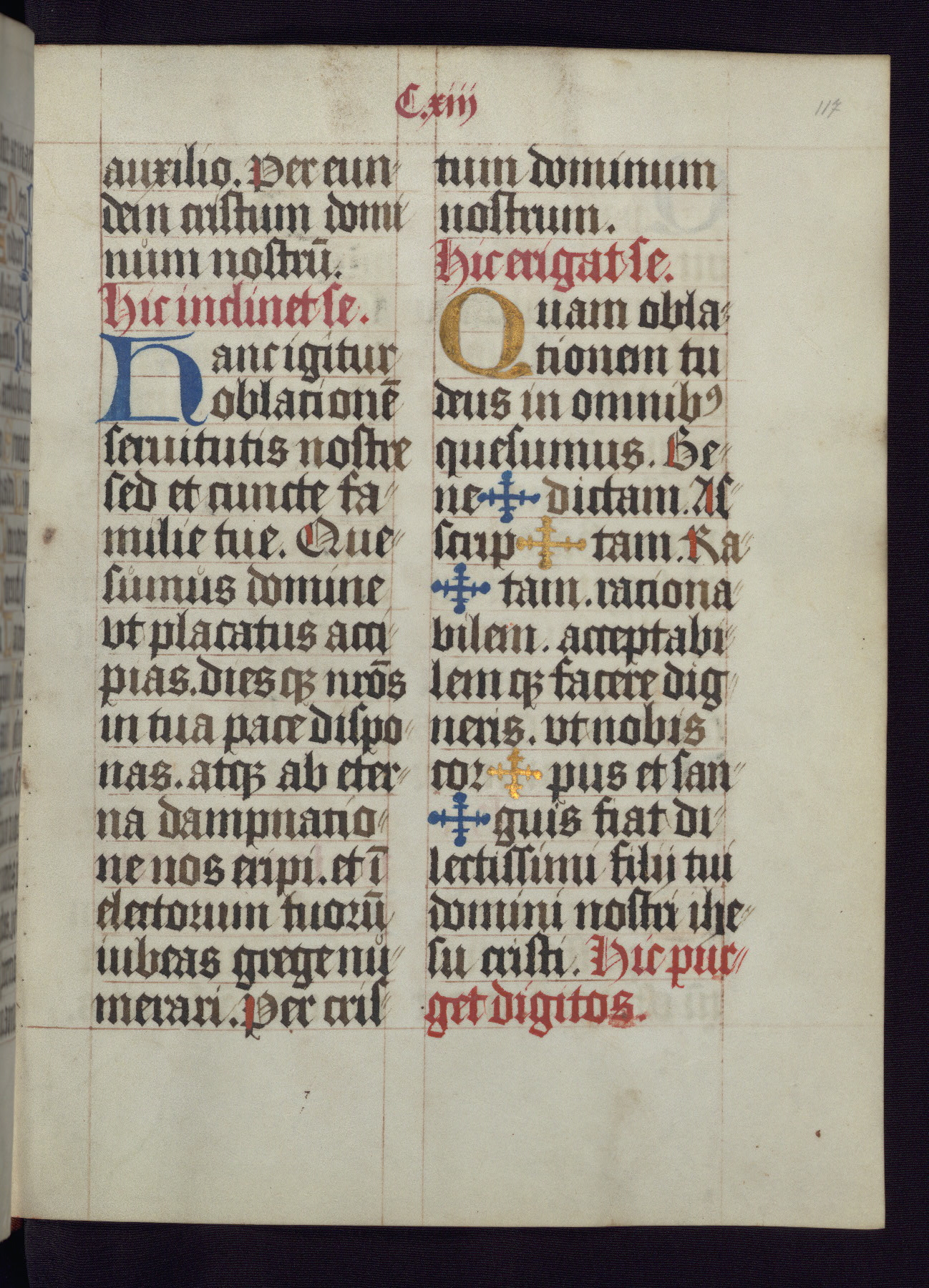 This Latin Missal was written in Utrecht, Netherlands, ca. 1500. Portraits of the original owners, whose names are not recorded, are accompanied by heraldry indicating that the husband was of the family of St. Férréol of Dauphiné; the wife was of the Cambronne of Ponthieu family. The manuscript is heavily illuminated with more than fifty historiated initials and miniatures by a group of artists known in scholarship as the "Masters of the Dark Eyes." The marginal decoration is also notable, for along with naturalistic flowers, insects, and jewels, there are several instances where the margin itself is historiated. This Missal provides an excellent example of the "Masters of the Dark Eyes" style, and there are a number of related manuscripts that have been identified by these same artists, including two at The Hague: KB, 76 G 9, and KB, 135 E 19.