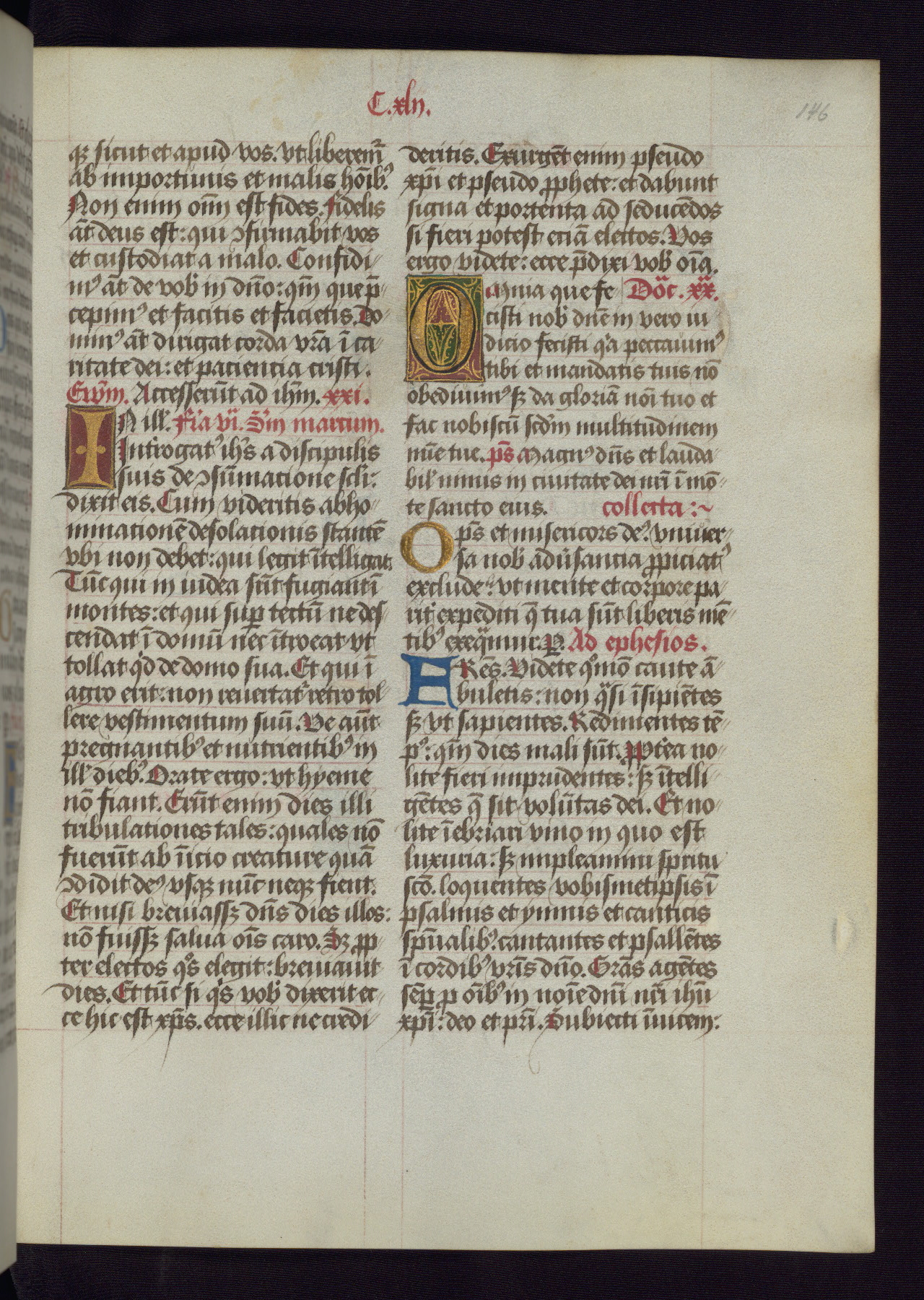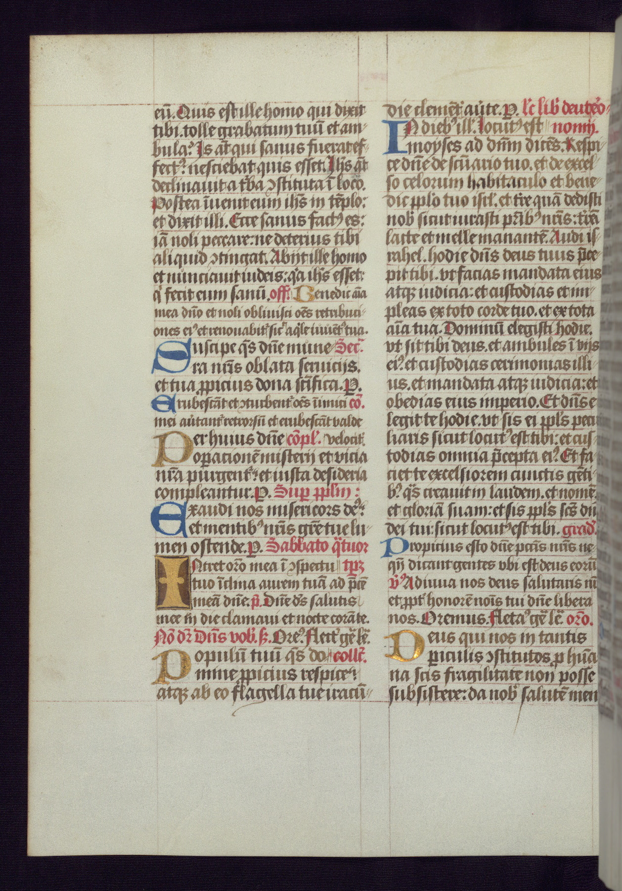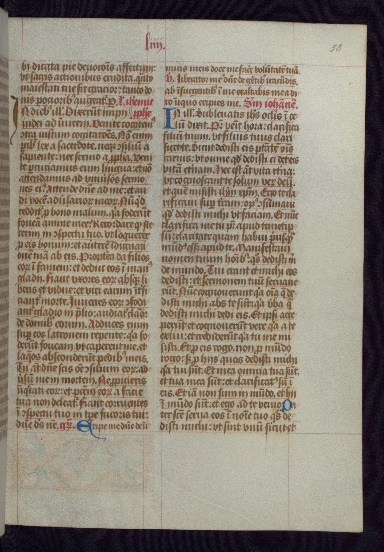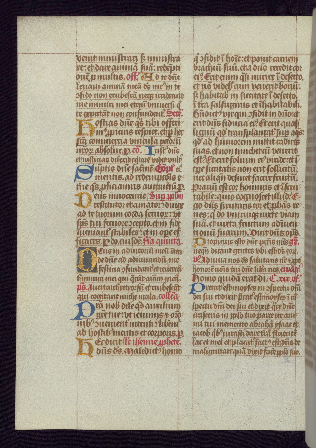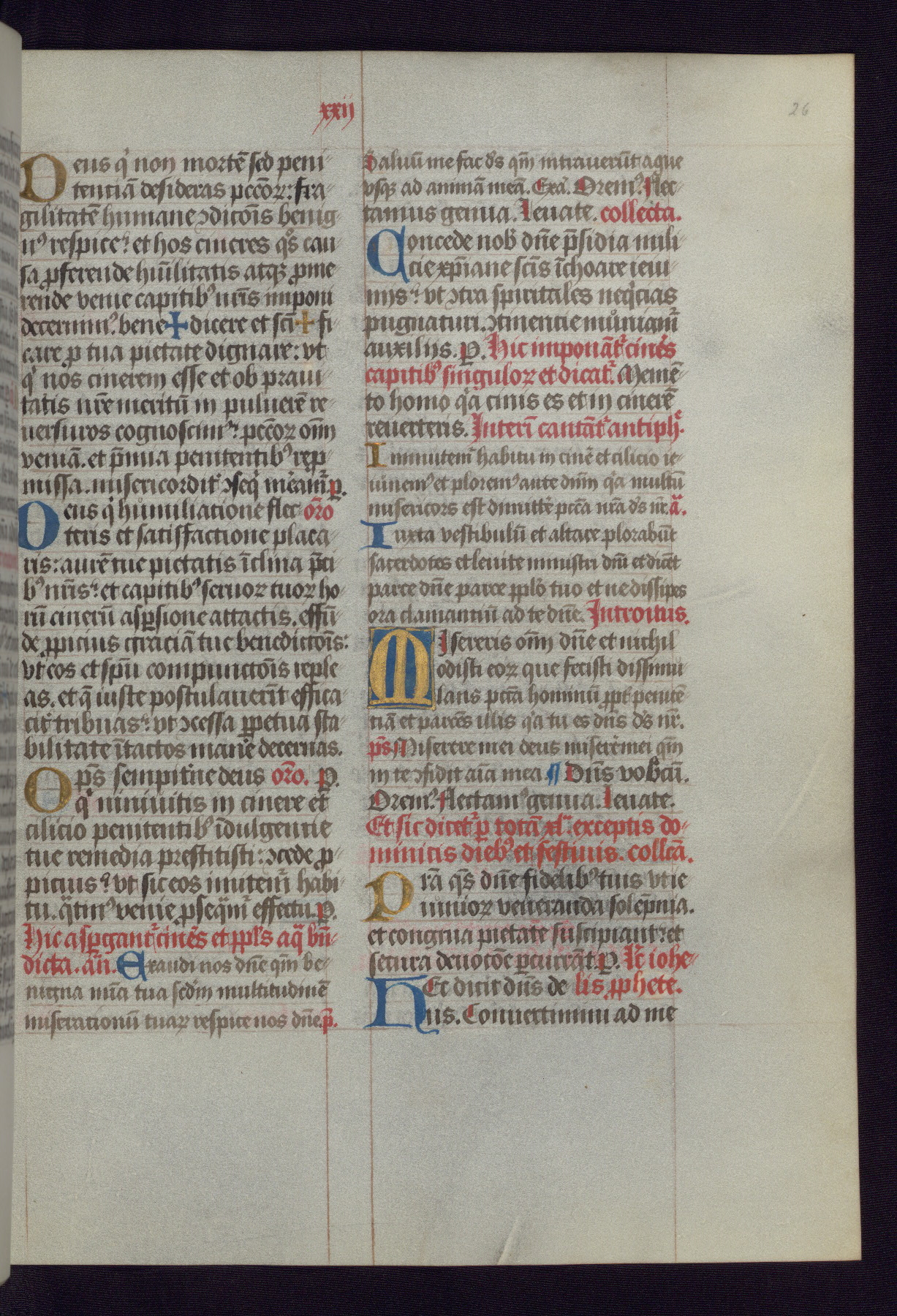 This Latin Missal was written in Utrecht, Netherlands, ca. 1500. Portraits of the original owners, whose names are not recorded, are accompanied by heraldry indicating that the husband was of the family of St. Férréol of Dauphiné; the wife was of the Cambronne of Ponthieu family. The manuscript is heavily illuminated with more than fifty historiated initials and miniatures by a group of artists known in scholarship as the "Masters of the Dark Eyes." The marginal decoration is also notable, for along with naturalistic flowers, insects, and jewels, there are several instances where the margin itself is historiated. This Missal provides an excellent example of the "Masters of the Dark Eyes" style, and there are a number of related manuscripts that have been identified by these same artists, including two at The Hague: KB, 76 G 9, and KB, 135 E 19.
