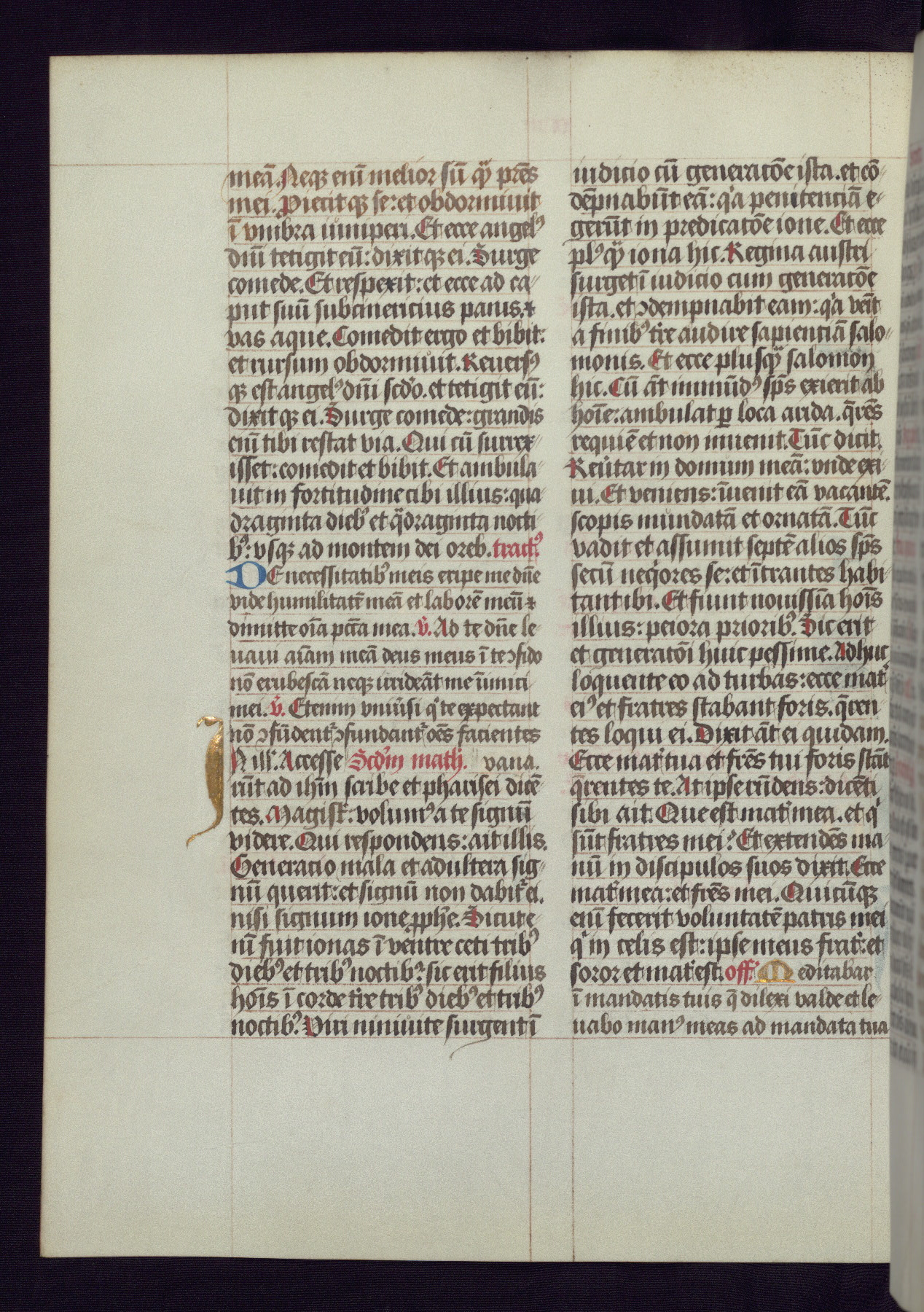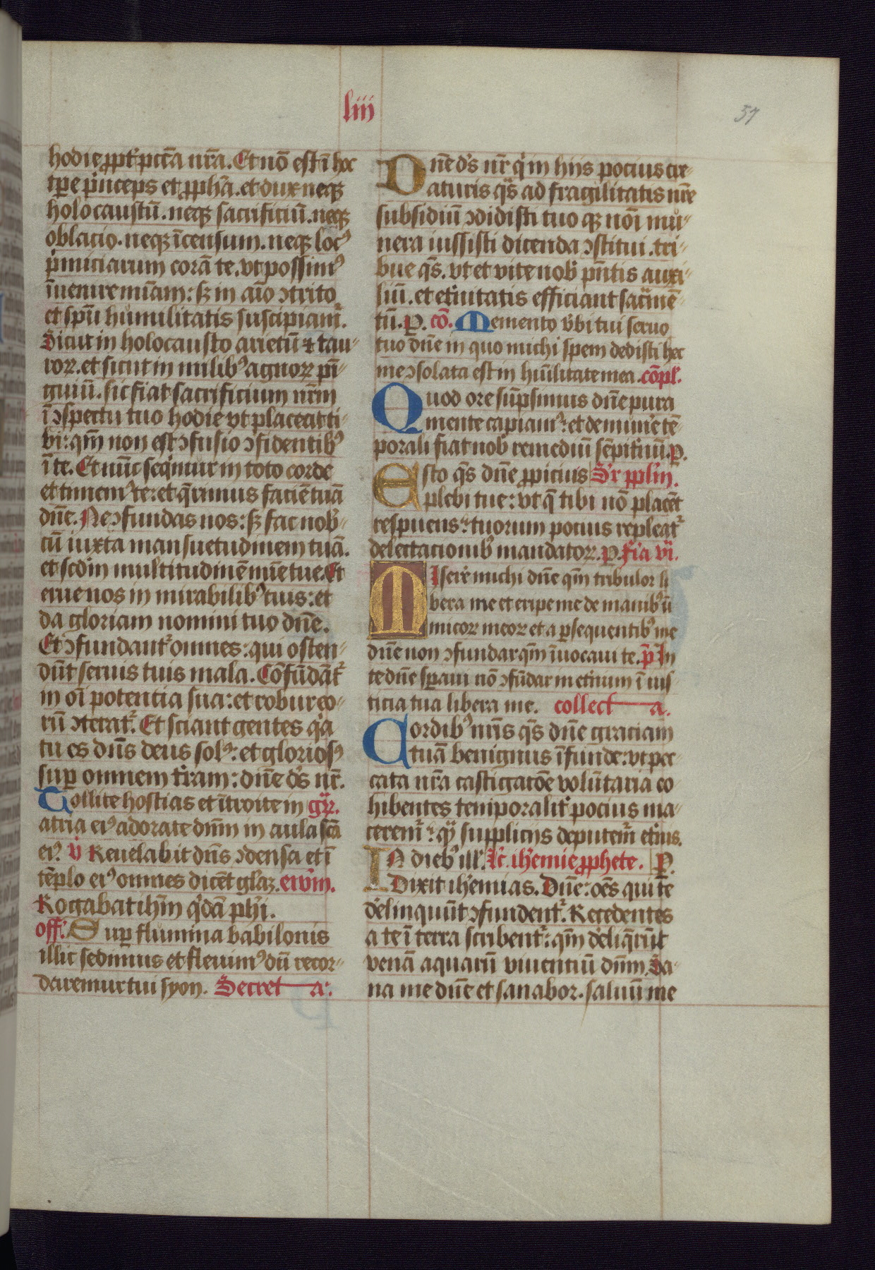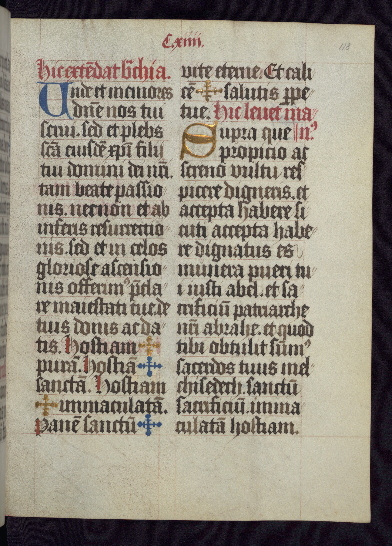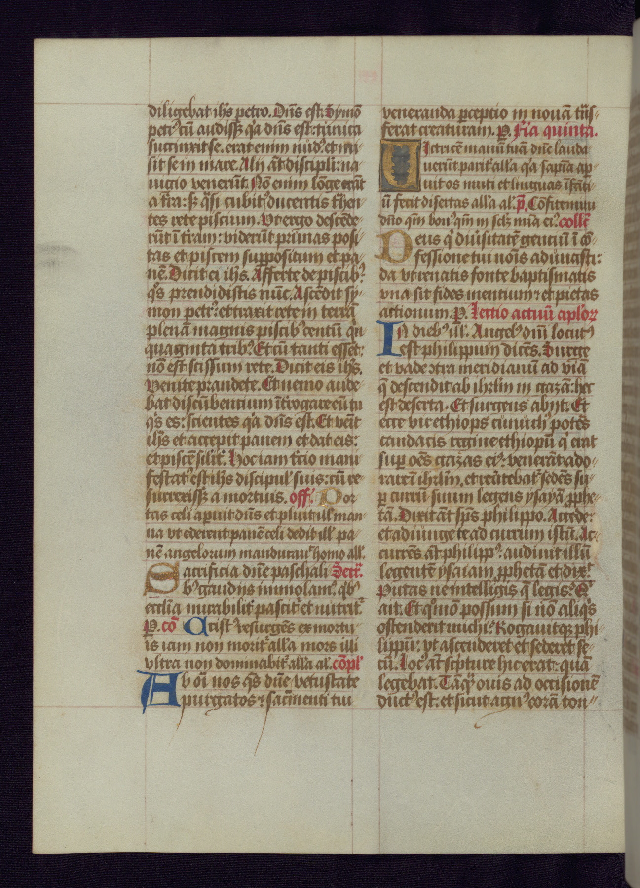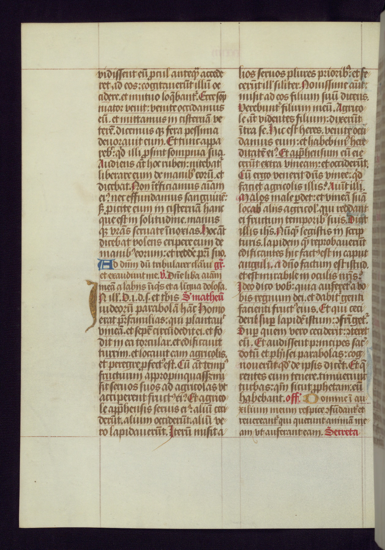 This Latin Missal was written in Utrecht, Netherlands, ca. 1500. Portraits of the original owners, whose names are not recorded, are accompanied by heraldry indicating that the husband was of the family of St. Férréol of Dauphiné; the wife was of the Cambronne of Ponthieu family. The manuscript is heavily illuminated with more than fifty historiated initials and miniatures by a group of artists known in scholarship as the "Masters of the Dark Eyes." The marginal decoration is also notable, for along with naturalistic flowers, insects, and jewels, there are several instances where the margin itself is historiated. This Missal provides an excellent example of the "Masters of the Dark Eyes" style, and there are a number of related manuscripts that have been identified by these same artists, including two at The Hague: KB, 76 G 9, and KB, 135 E 19.