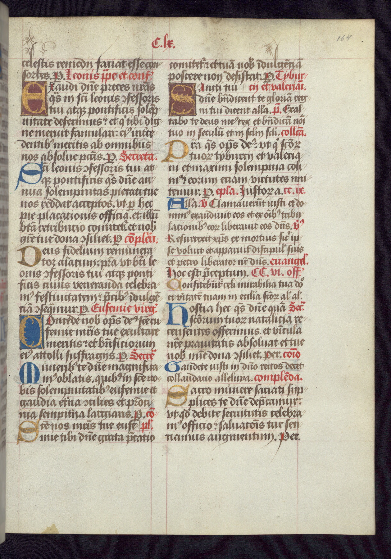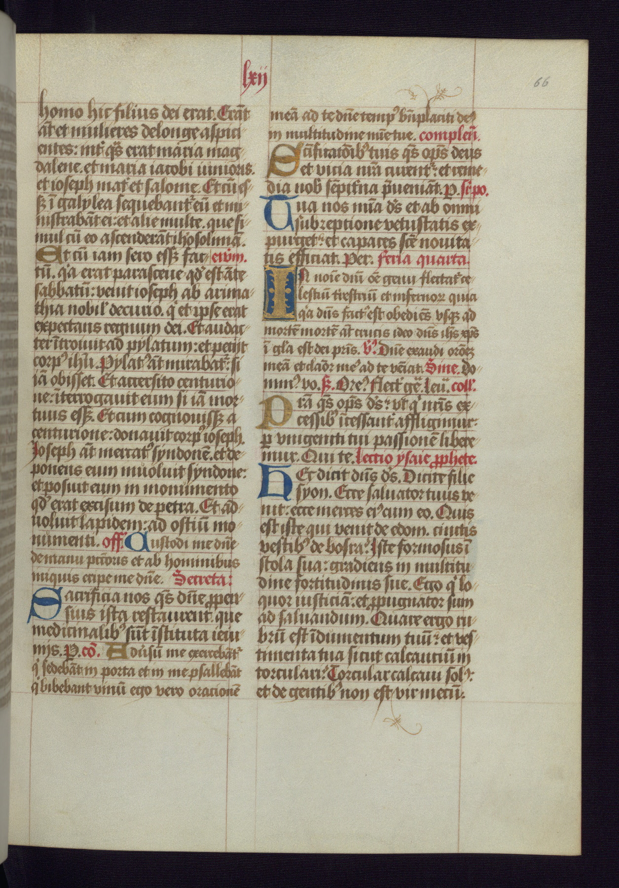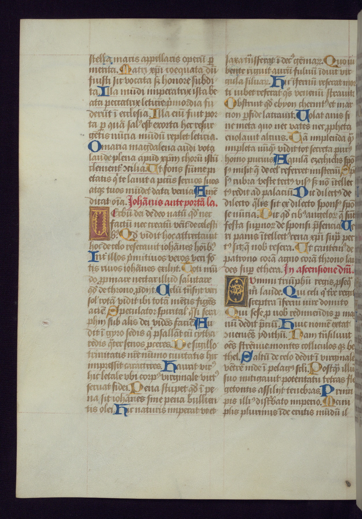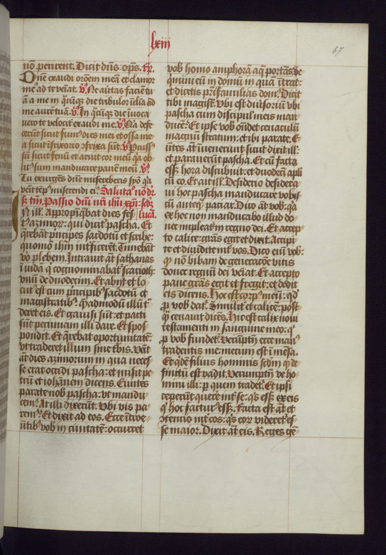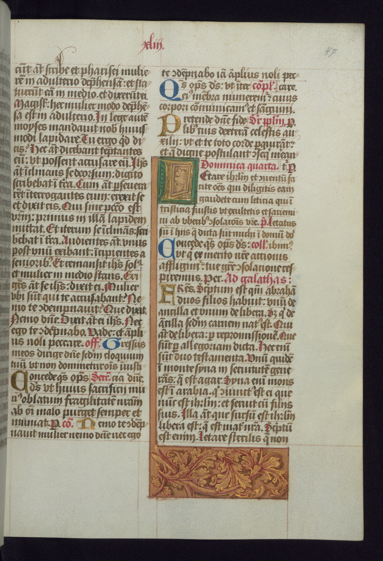 This Latin Missal was written in Utrecht, Netherlands, ca. 1500. Portraits of the original owners, whose names are not recorded, are accompanied by heraldry indicating that the husband was of the family of St. Férréol of Dauphiné; the wife was of the Cambronne of Ponthieu family. The manuscript is heavily illuminated with more than fifty historiated initials and miniatures by a group of artists known in scholarship as the "Masters of the Dark Eyes." The marginal decoration is also notable, for along with naturalistic flowers, insects, and jewels, there are several instances where the margin itself is historiated. This Missal provides an excellent example of the "Masters of the Dark Eyes" style, and there are a number of related manuscripts that have been identified by these same artists, including two at The Hague: KB, 76 G 9, and KB, 135 E 19.