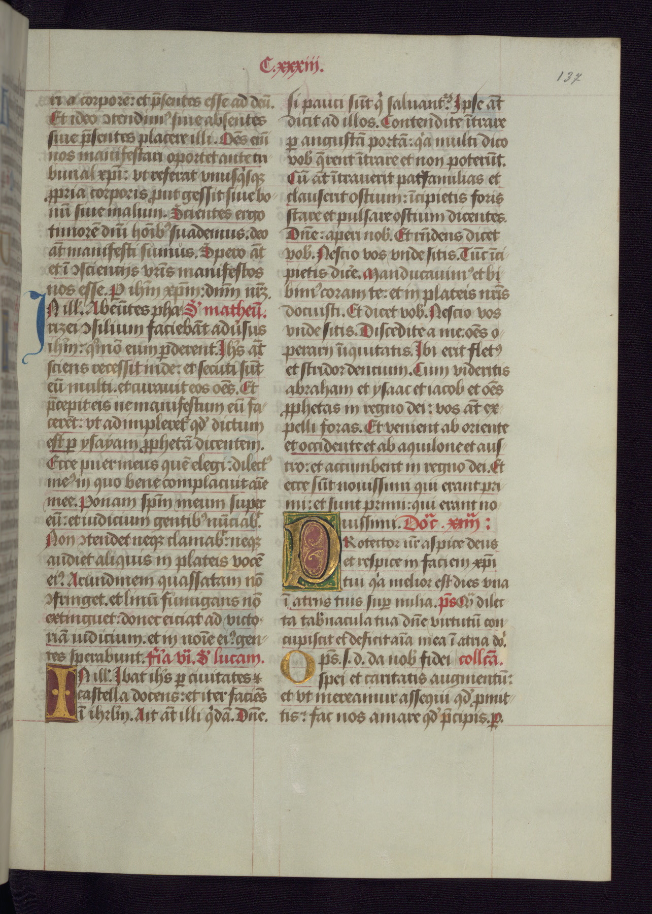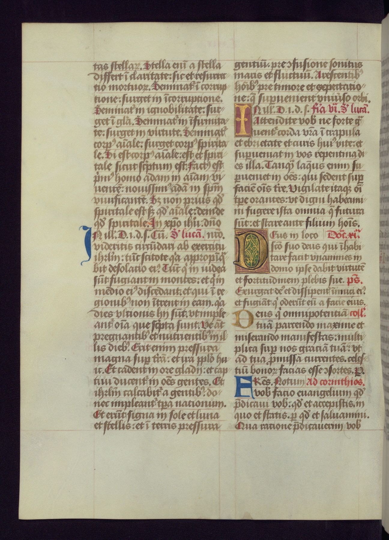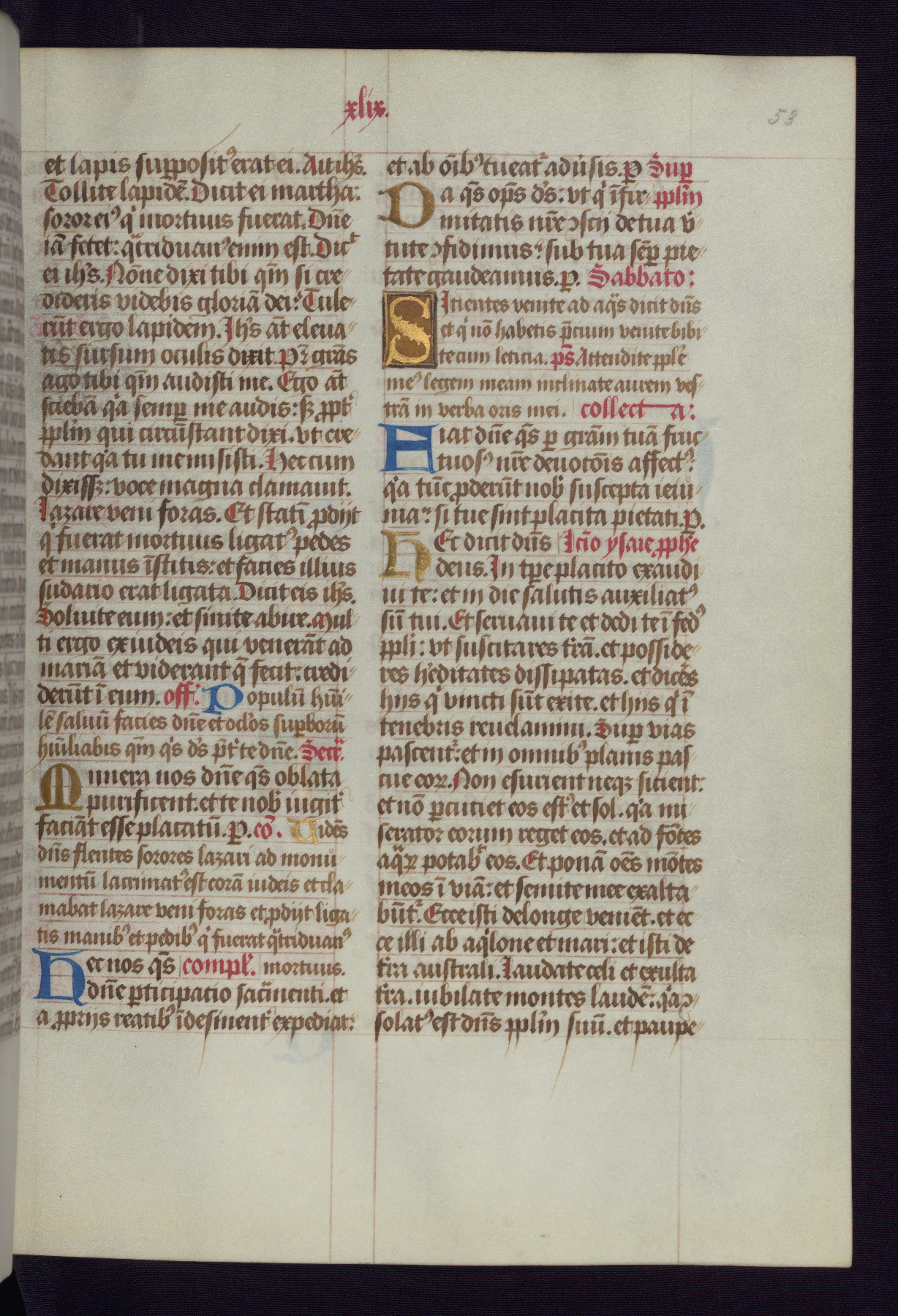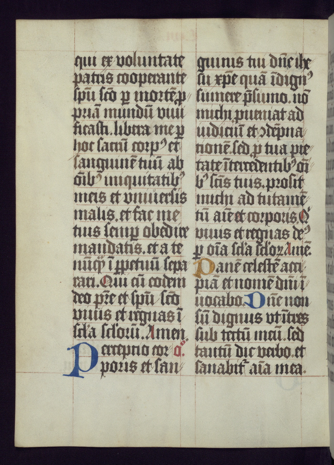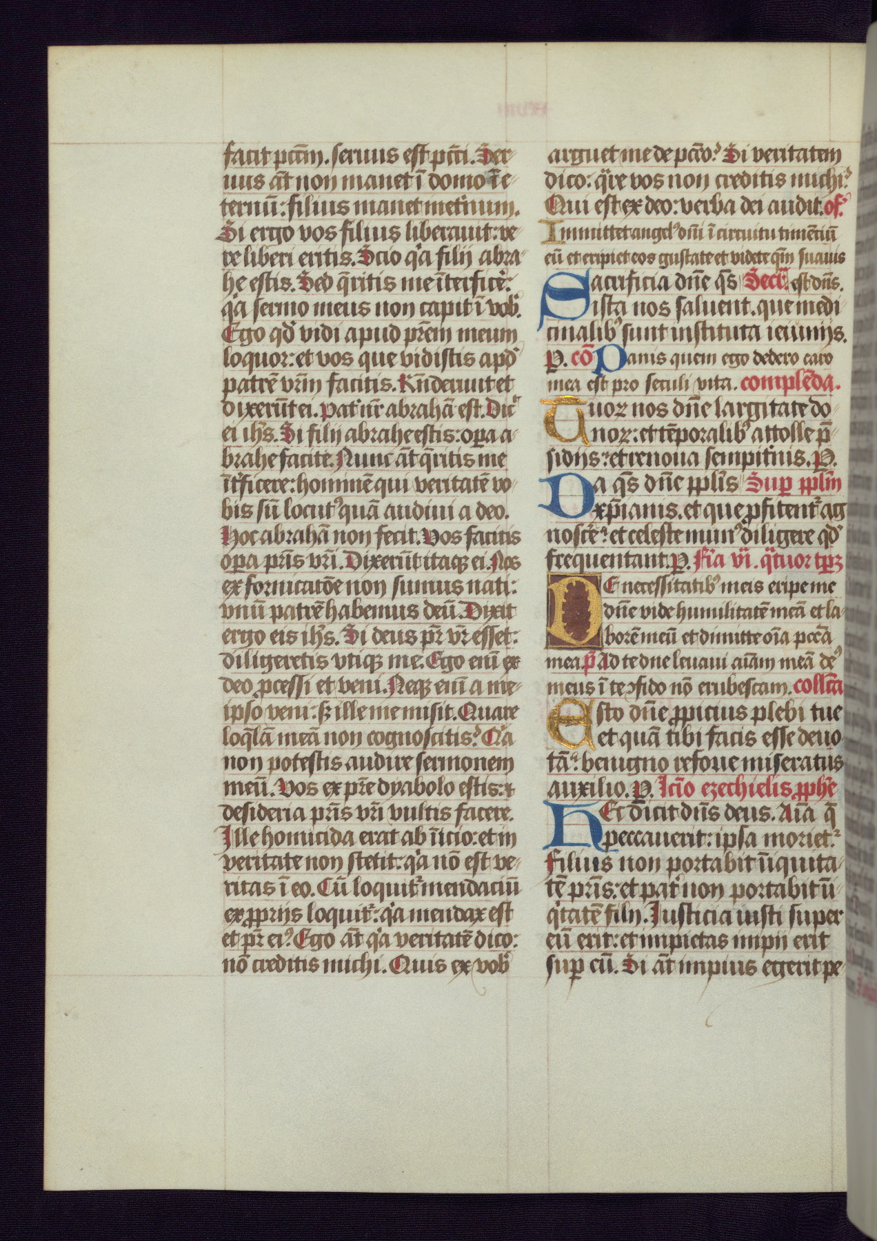 This Latin Missal was written in Utrecht, Netherlands, ca. 1500. Portraits of the original owners, whose names are not recorded, are accompanied by heraldry indicating that the husband was of the family of St. Férréol of Dauphiné; the wife was of the Cambronne of Ponthieu family. The manuscript is heavily illuminated with more than fifty historiated initials and miniatures by a group of artists known in scholarship as the "Masters of the Dark Eyes." The marginal decoration is also notable, for along with naturalistic flowers, insects, and jewels, there are several instances where the margin itself is historiated. This Missal provides an excellent example of the "Masters of the Dark Eyes" style, and there are a number of related manuscripts that have been identified by these same artists, including two at The Hague: KB, 76 G 9, and KB, 135 E 19.