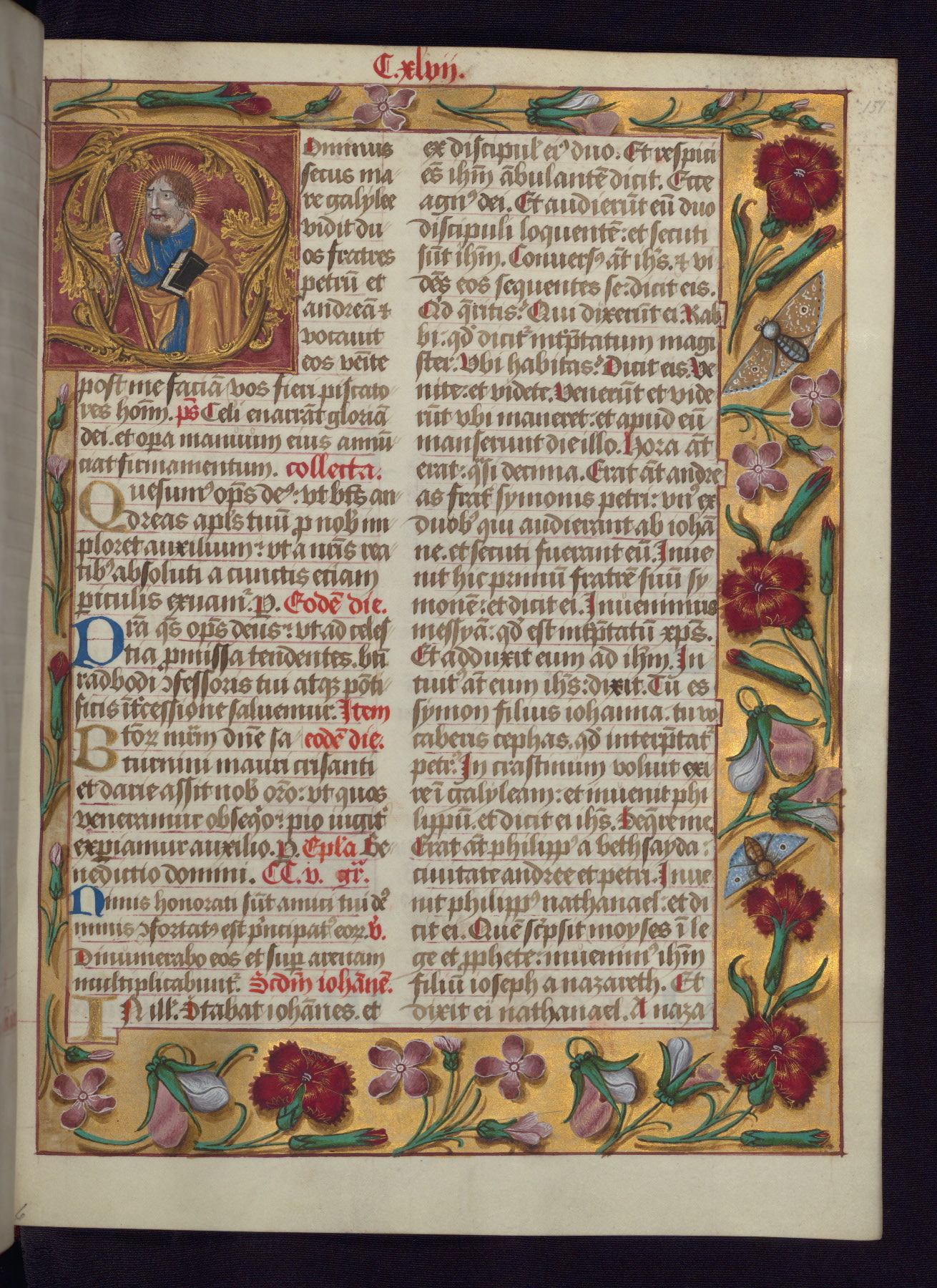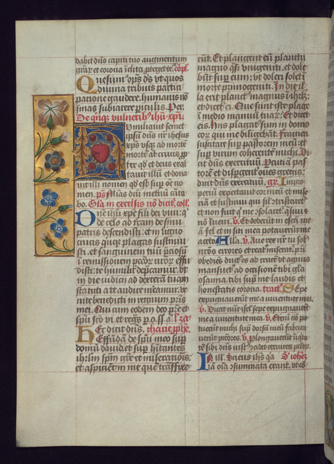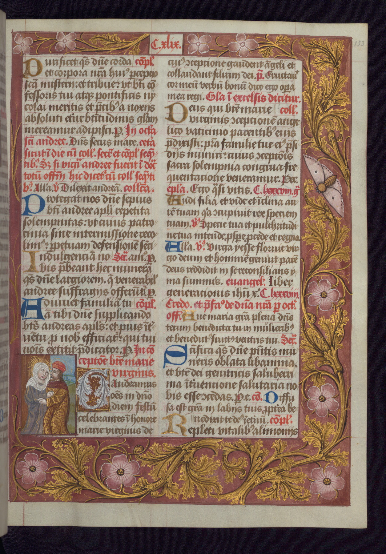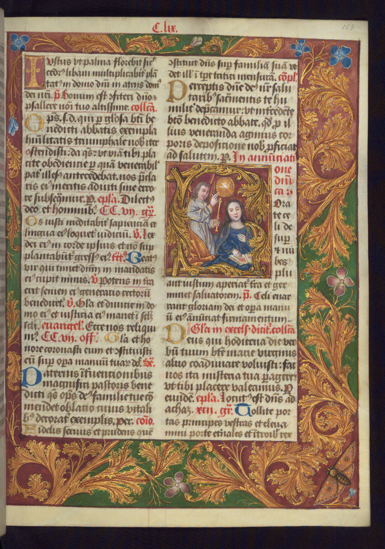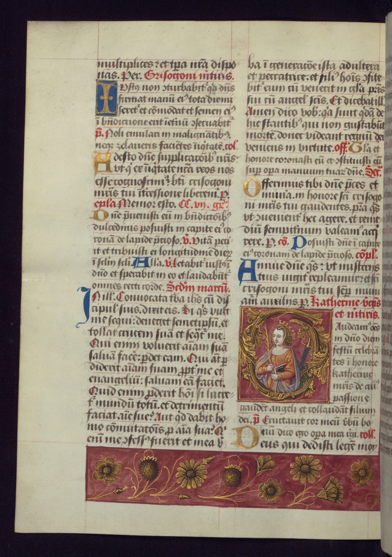 - Decoration note: One full-page and one half-page miniature; fifty historiated initials (5-14 lines); periodic marginal illumination, ranging from a small strip to all four margins, containing illusionistic flowers, insects, jewels, textiles, and occasionally figures; enlarged foliate initials throughout (3-6 lines); smaller blue and gold initials throughout (2 lines); rubrics in red; text in brown ink