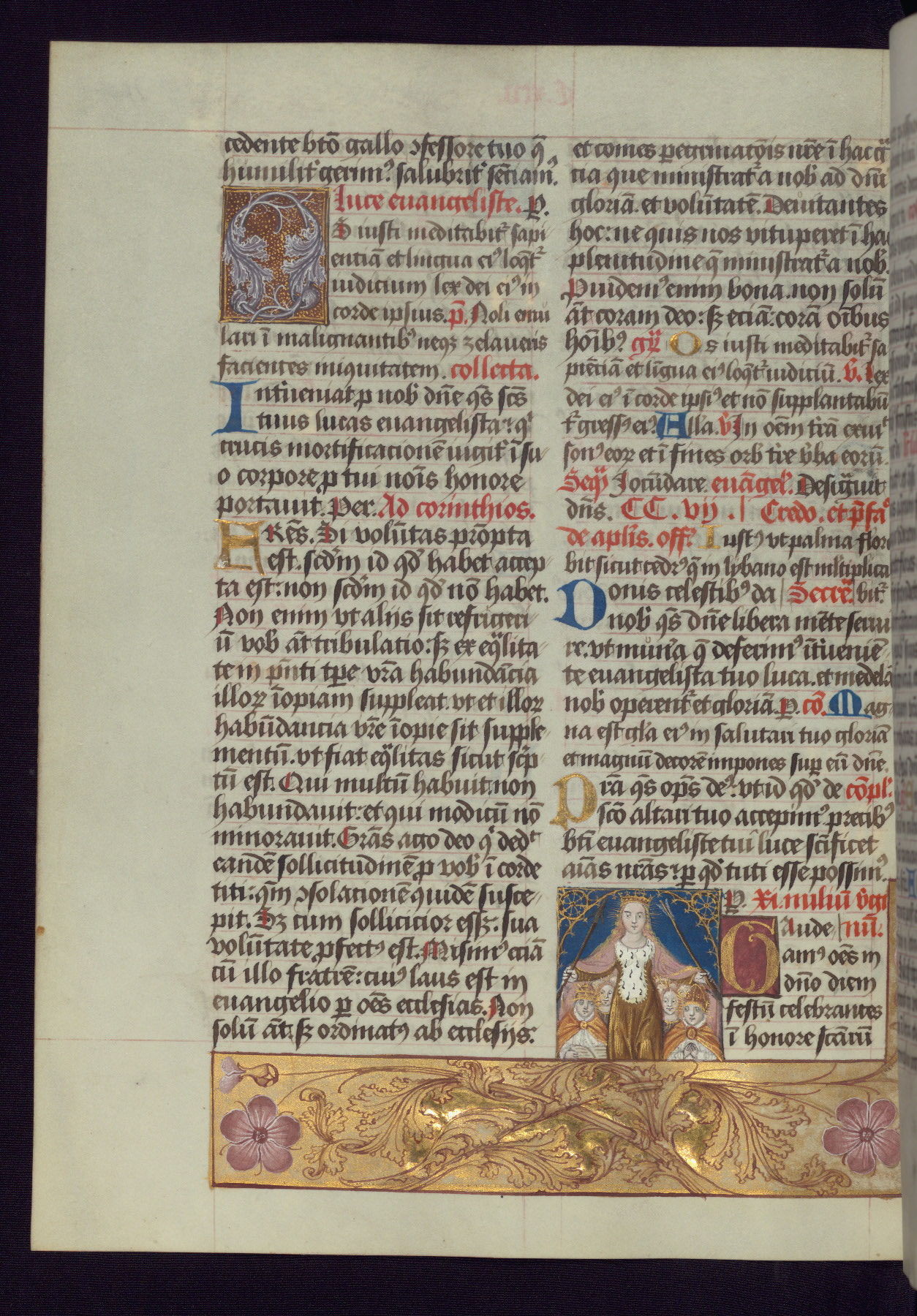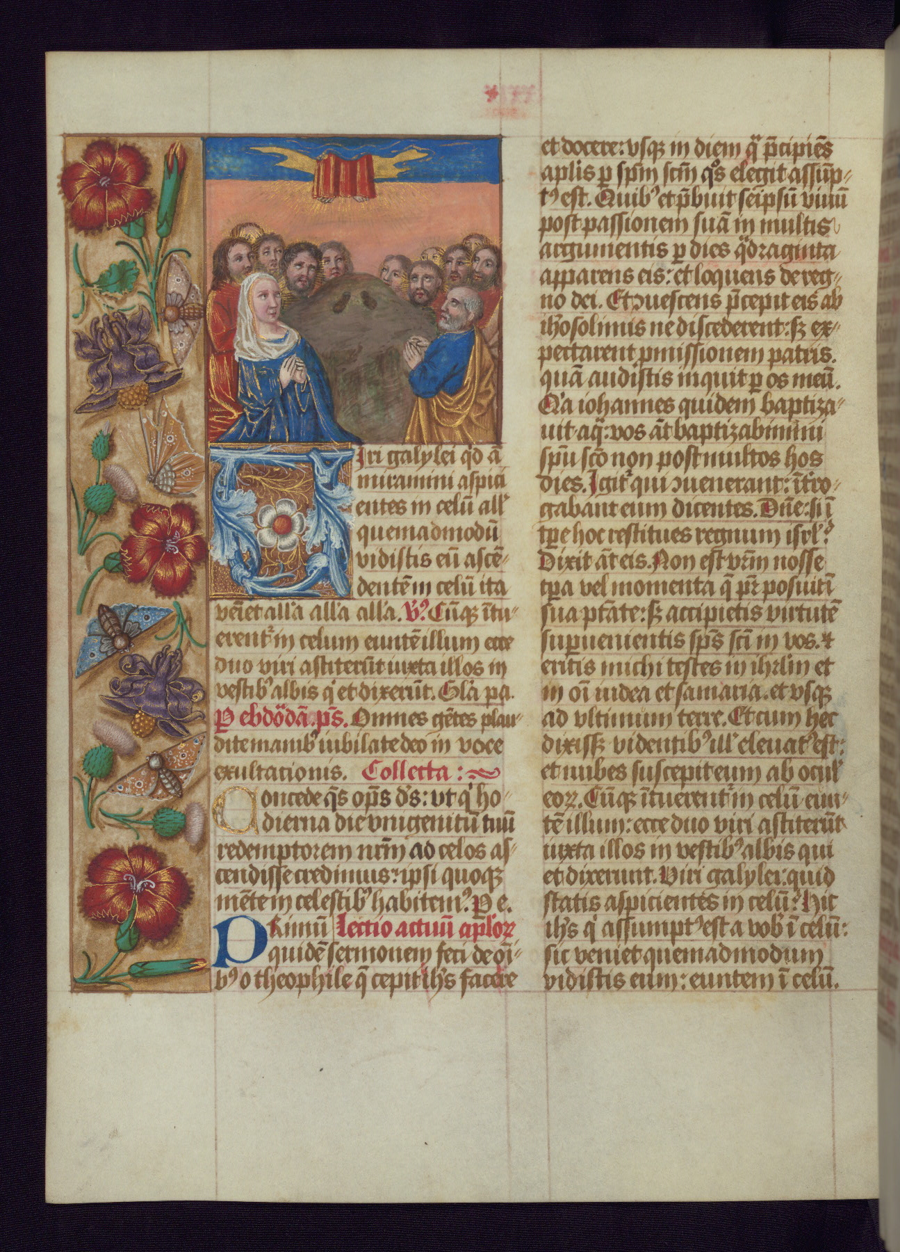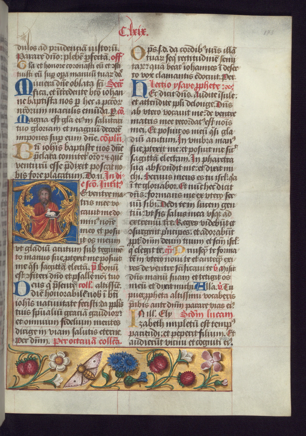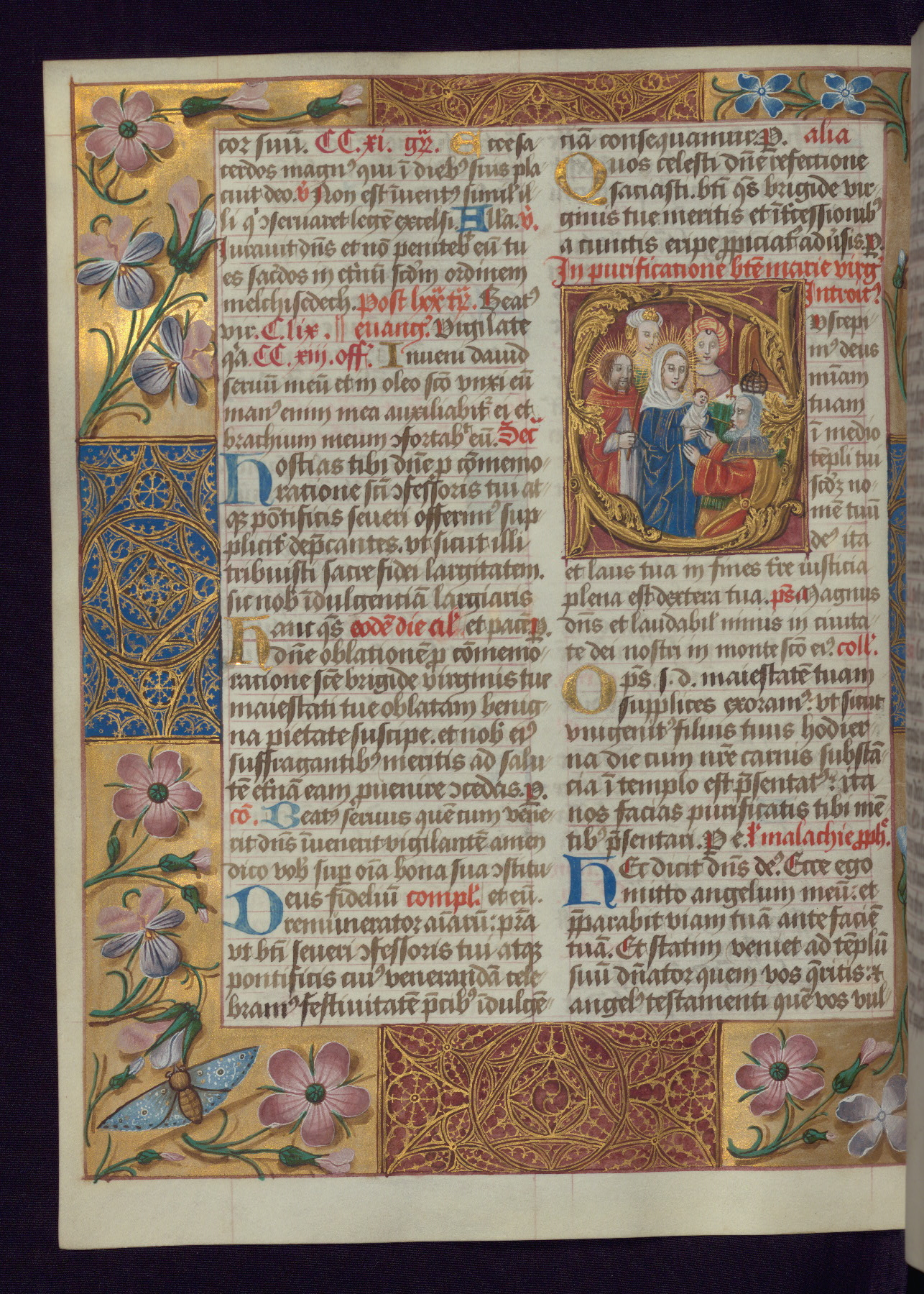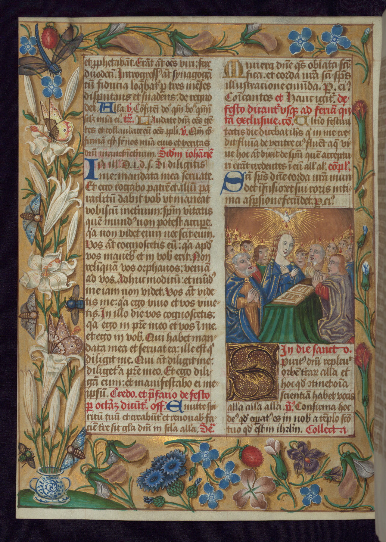 - Decoration note: One full-page and one half-page miniature; fifty historiated initials (5-14 lines); periodic marginal illumination, ranging from a small strip to all four margins, containing illusionistic flowers, insects, jewels, textiles, and occasionally figures; enlarged foliate initials throughout (3-6 lines); smaller blue and gold initials throughout (2 lines); rubrics in red; text in brown ink