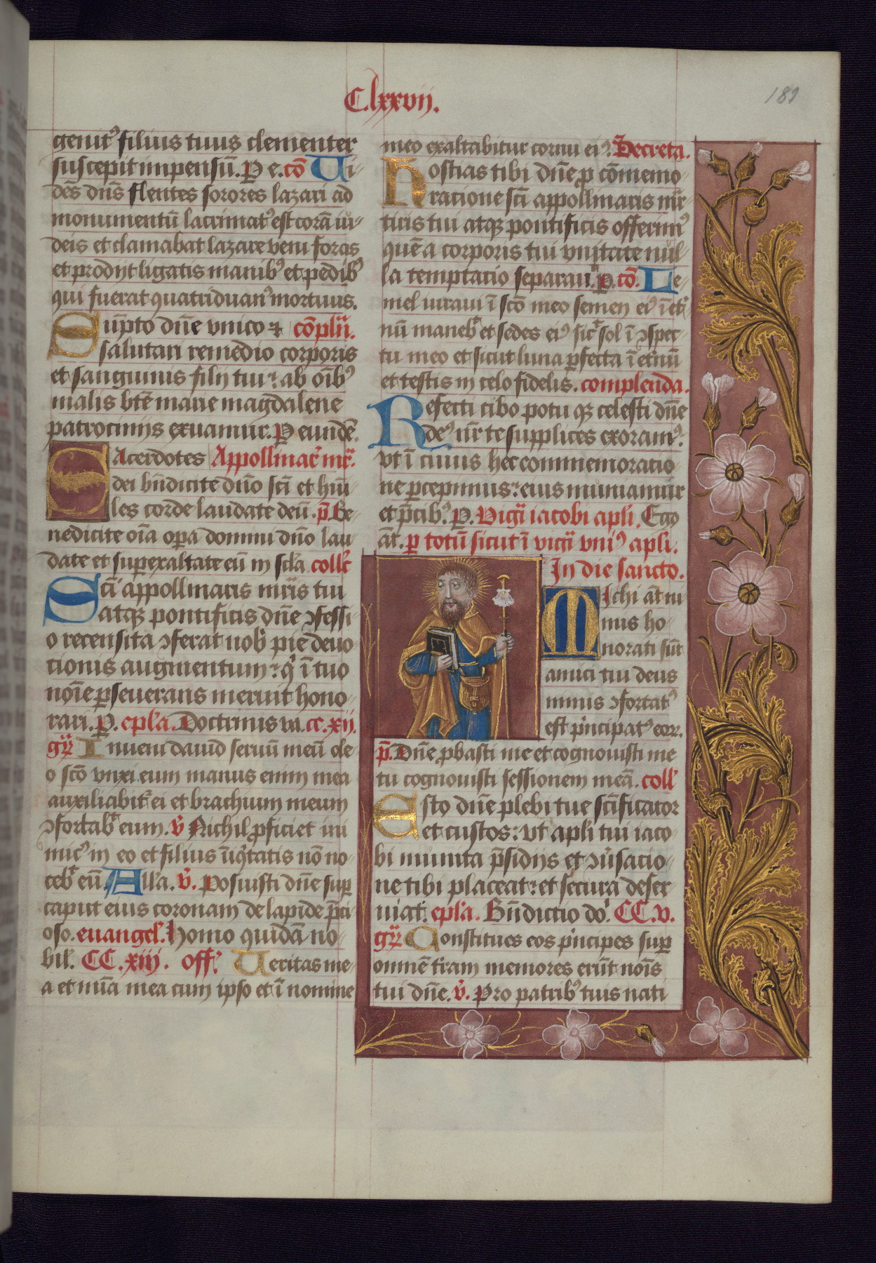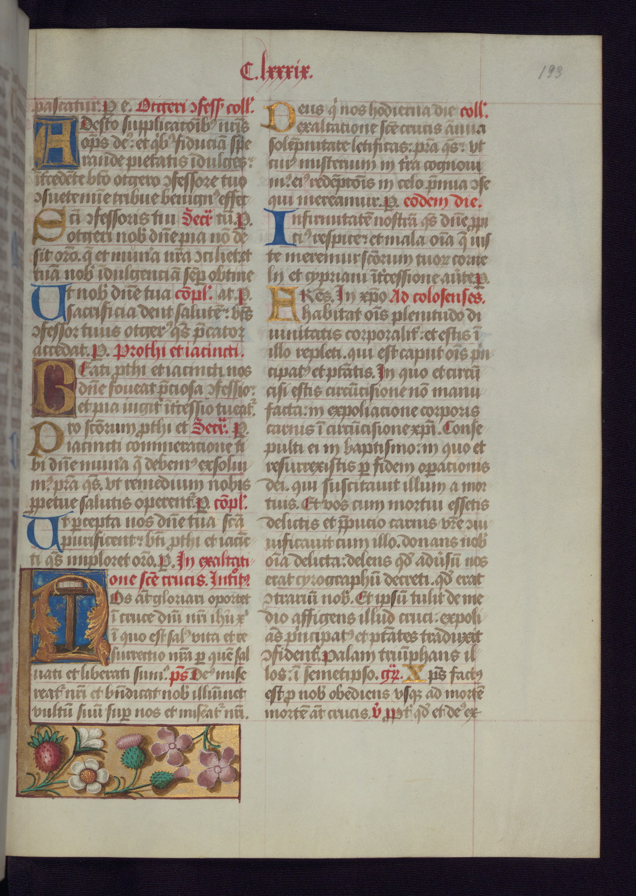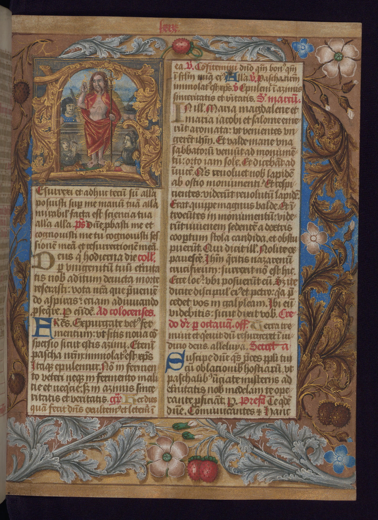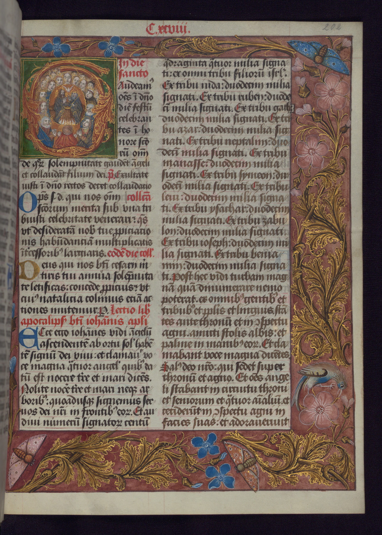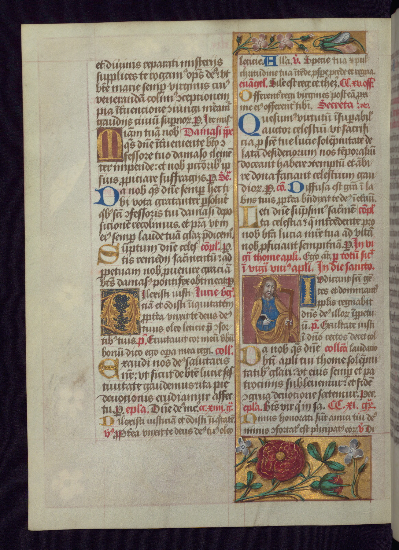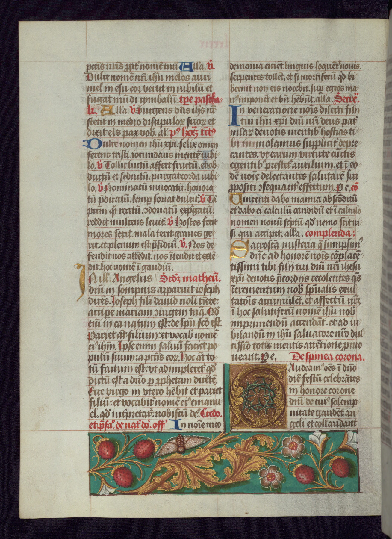 - Decoration note: One full-page and one half-page miniature; fifty historiated initials (5-14 lines); periodic marginal illumination, ranging from a small strip to all four margins, containing illusionistic flowers, insects, jewels, textiles, and occasionally figures; enlarged foliate initials throughout (3-6 lines); smaller blue and gold initials throughout (2 lines); rubrics in red; text in brown ink