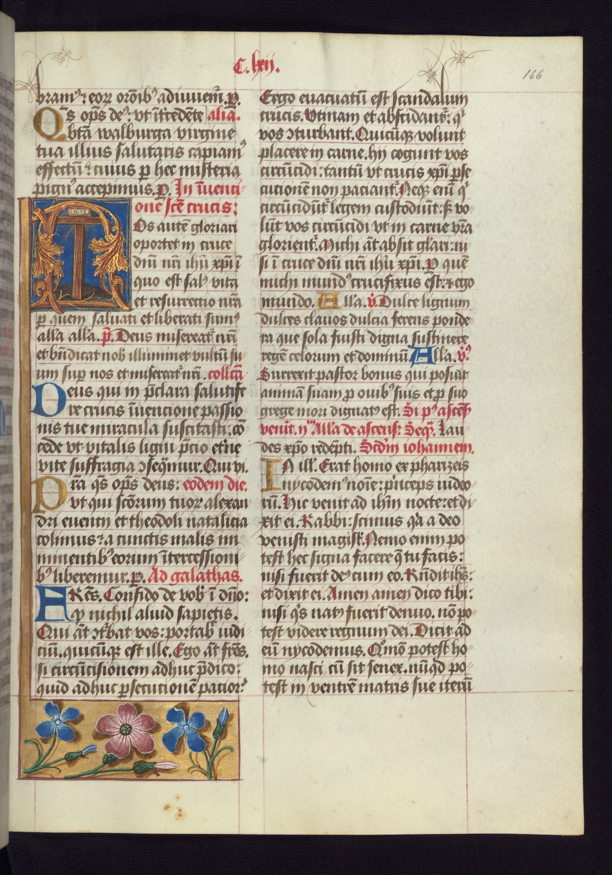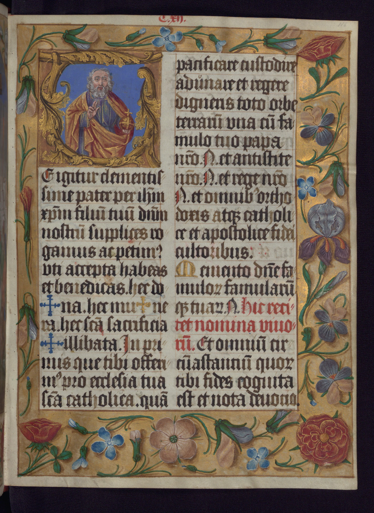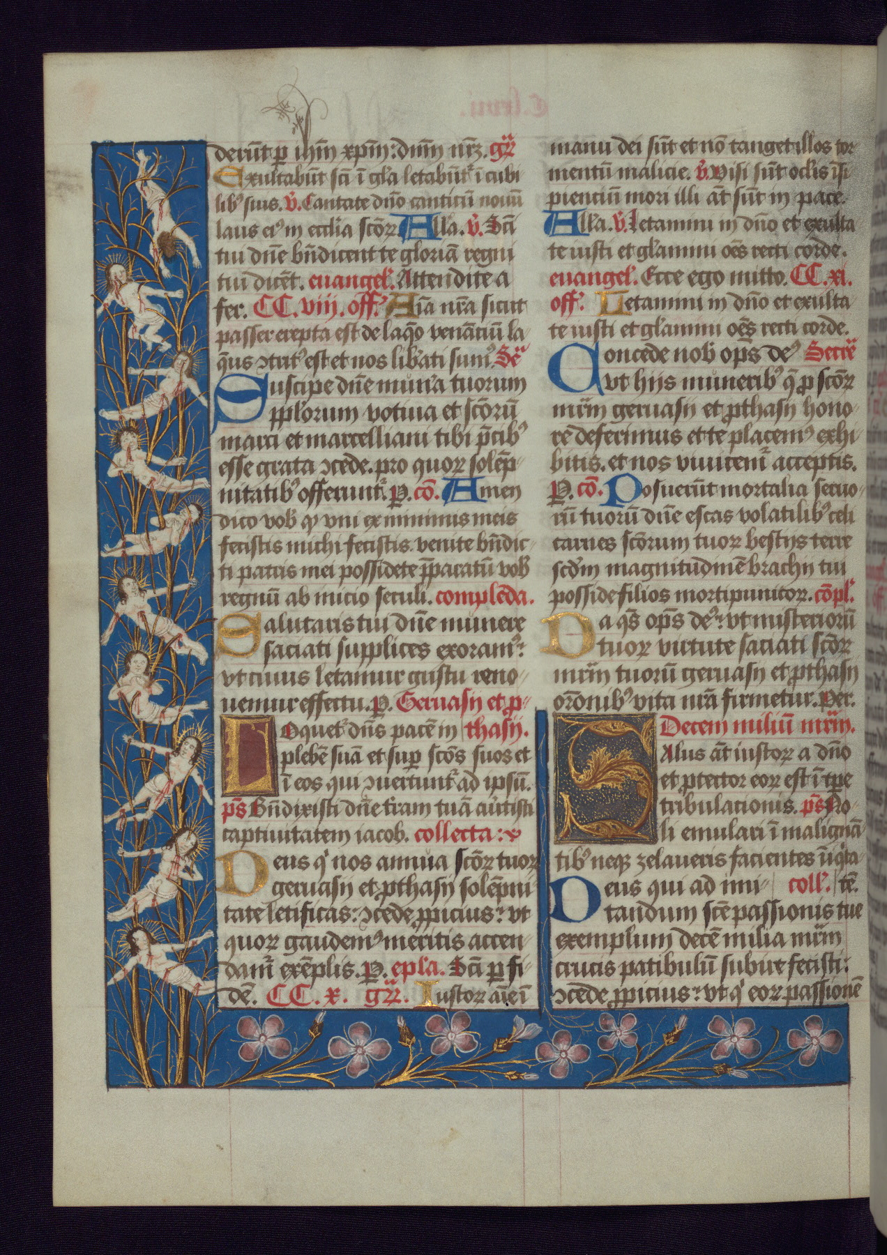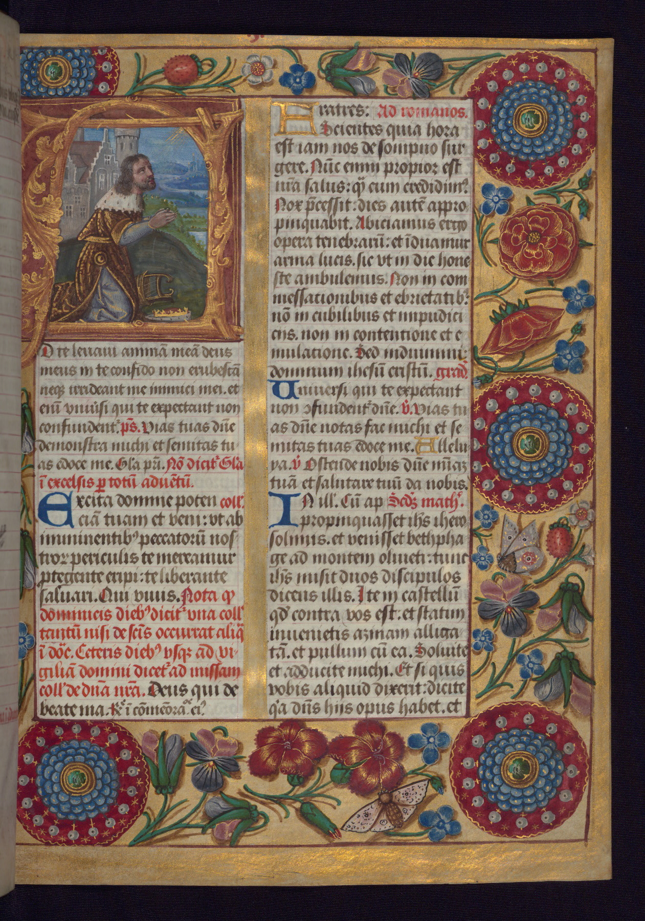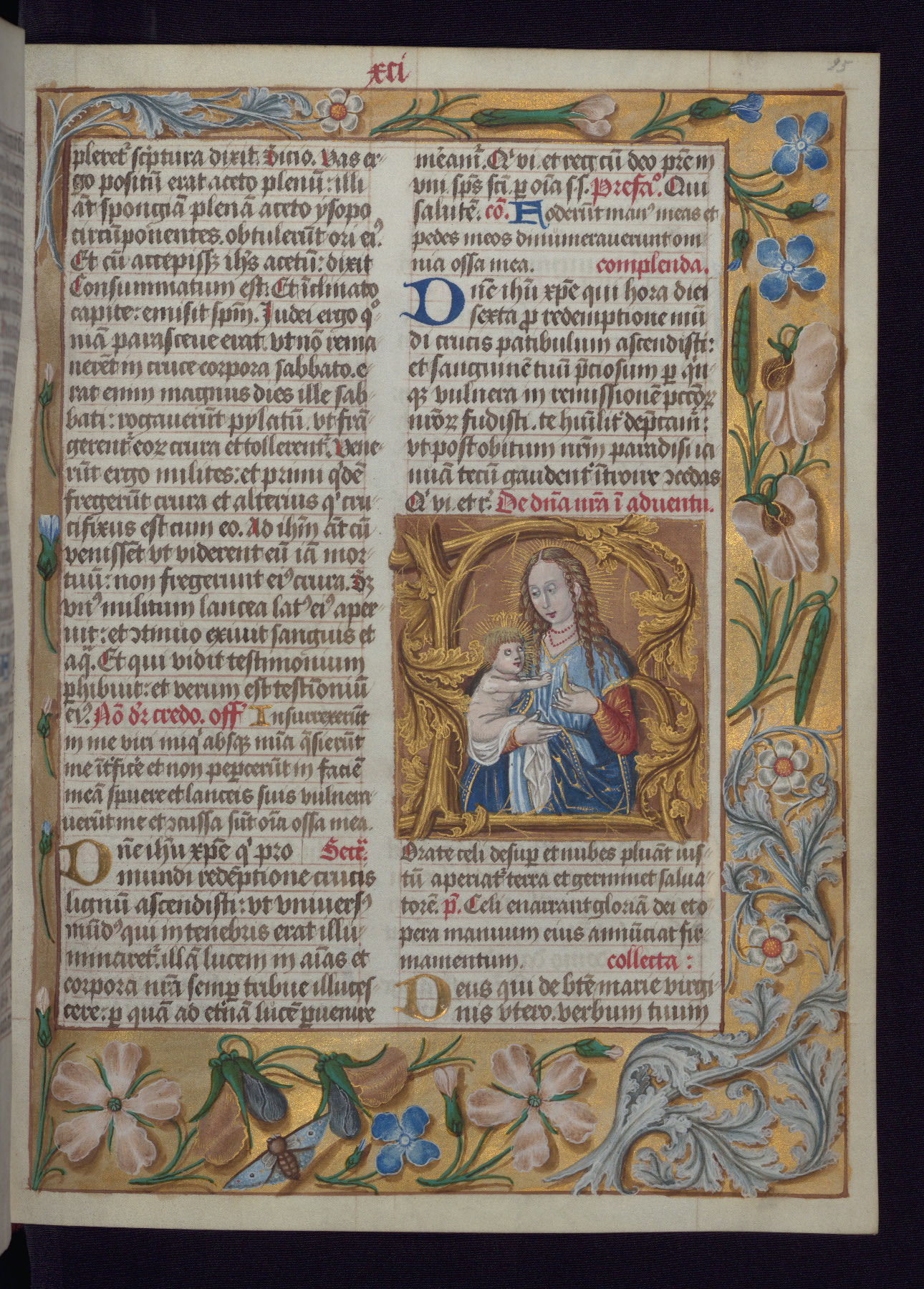 - Decoration note: One full-page and one half-page miniature; fifty historiated initials (5-14 lines); periodic marginal illumination, ranging from a small strip to all four margins, containing illusionistic flowers, insects, jewels, textiles, and occasionally figures; enlarged foliate initials throughout (3-6 lines); smaller blue and gold initials throughout (2 lines); rubrics in red; text in brown ink