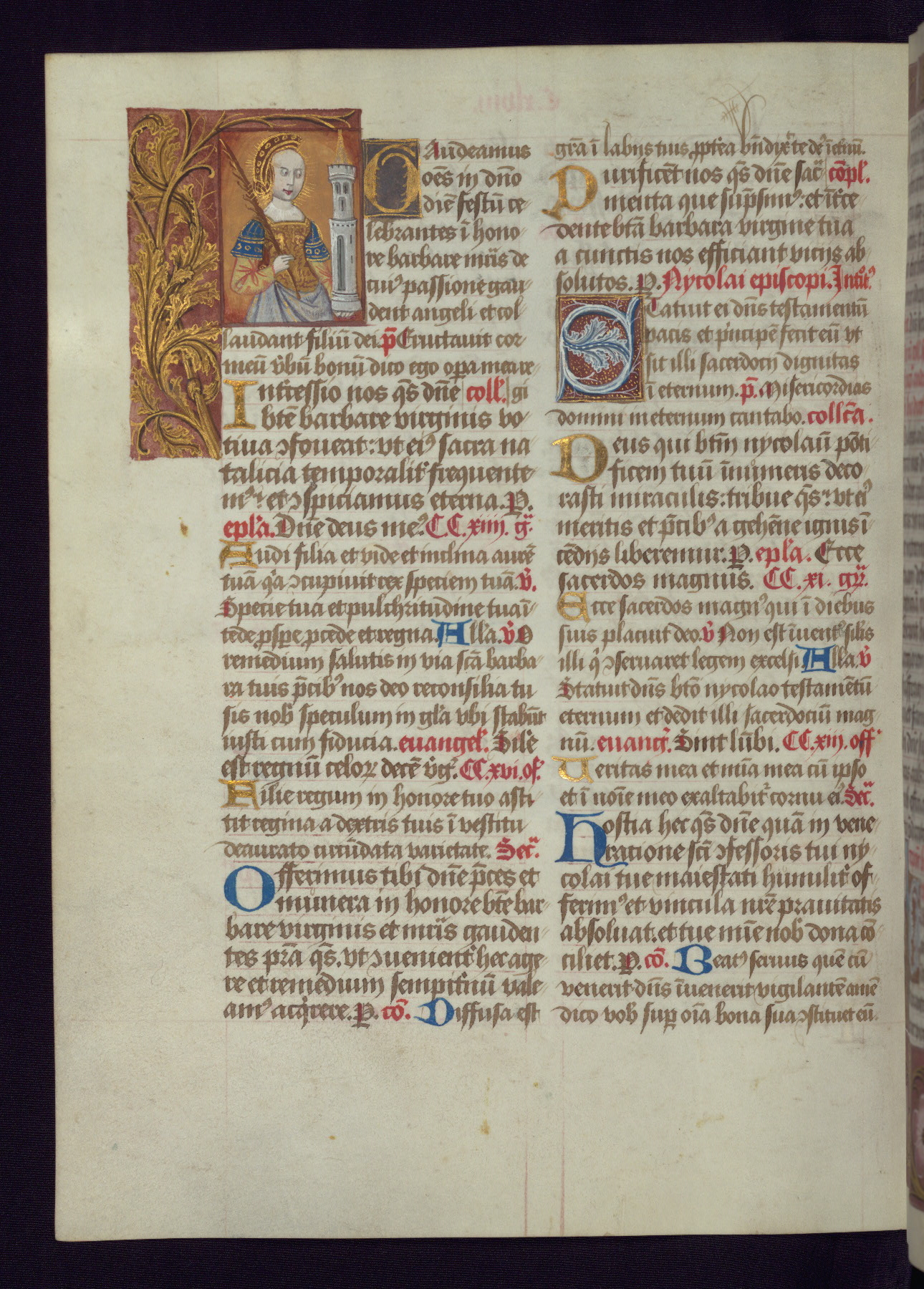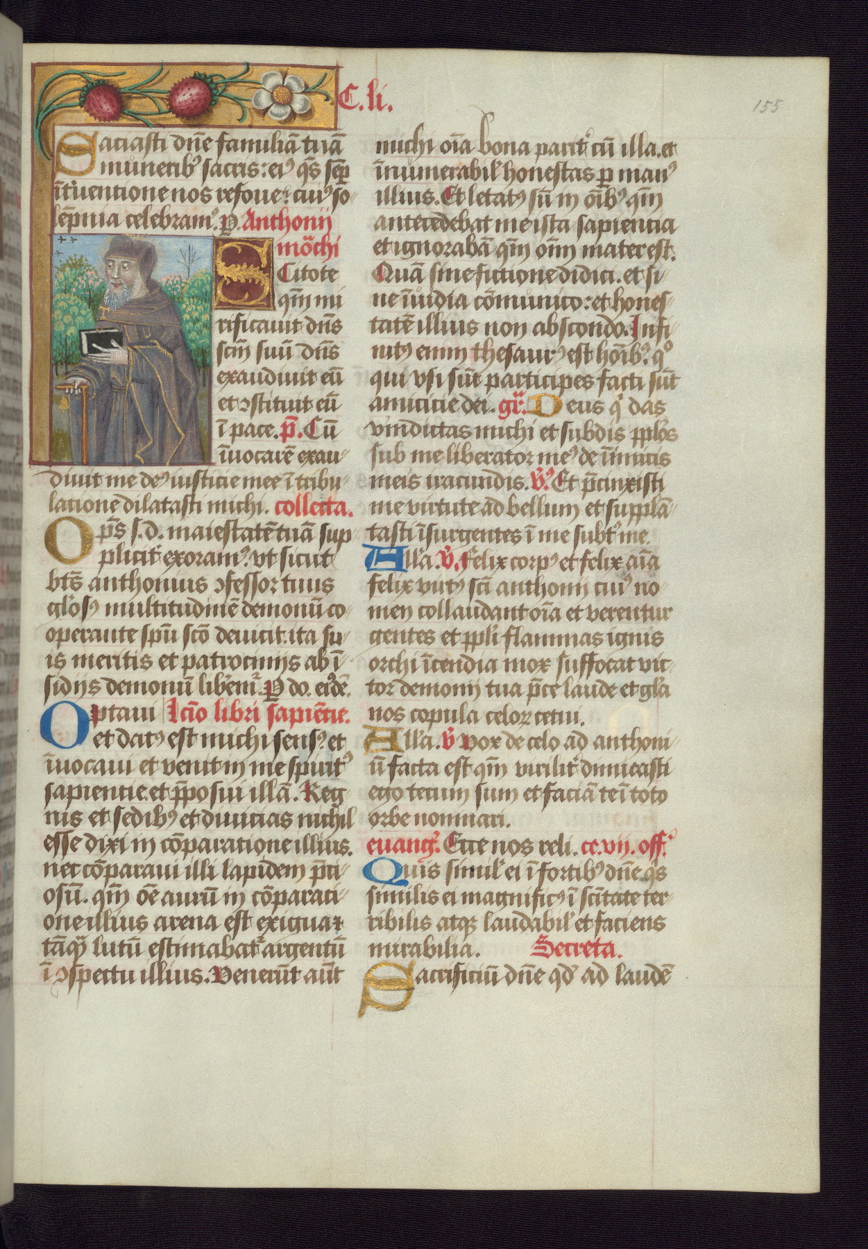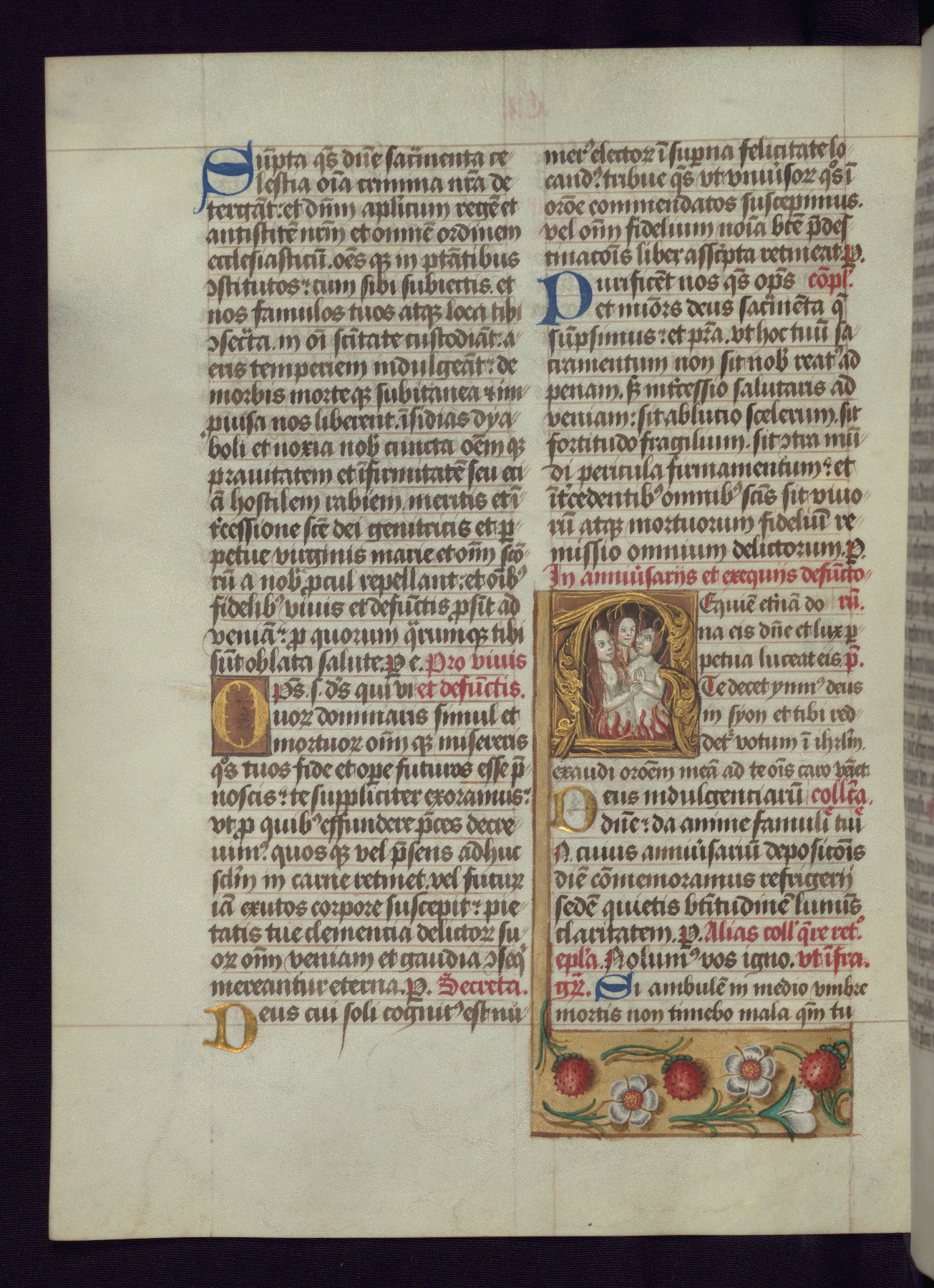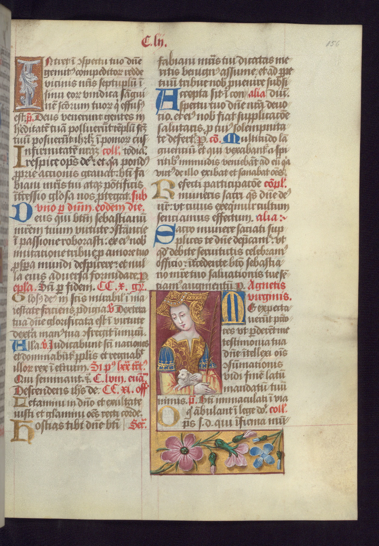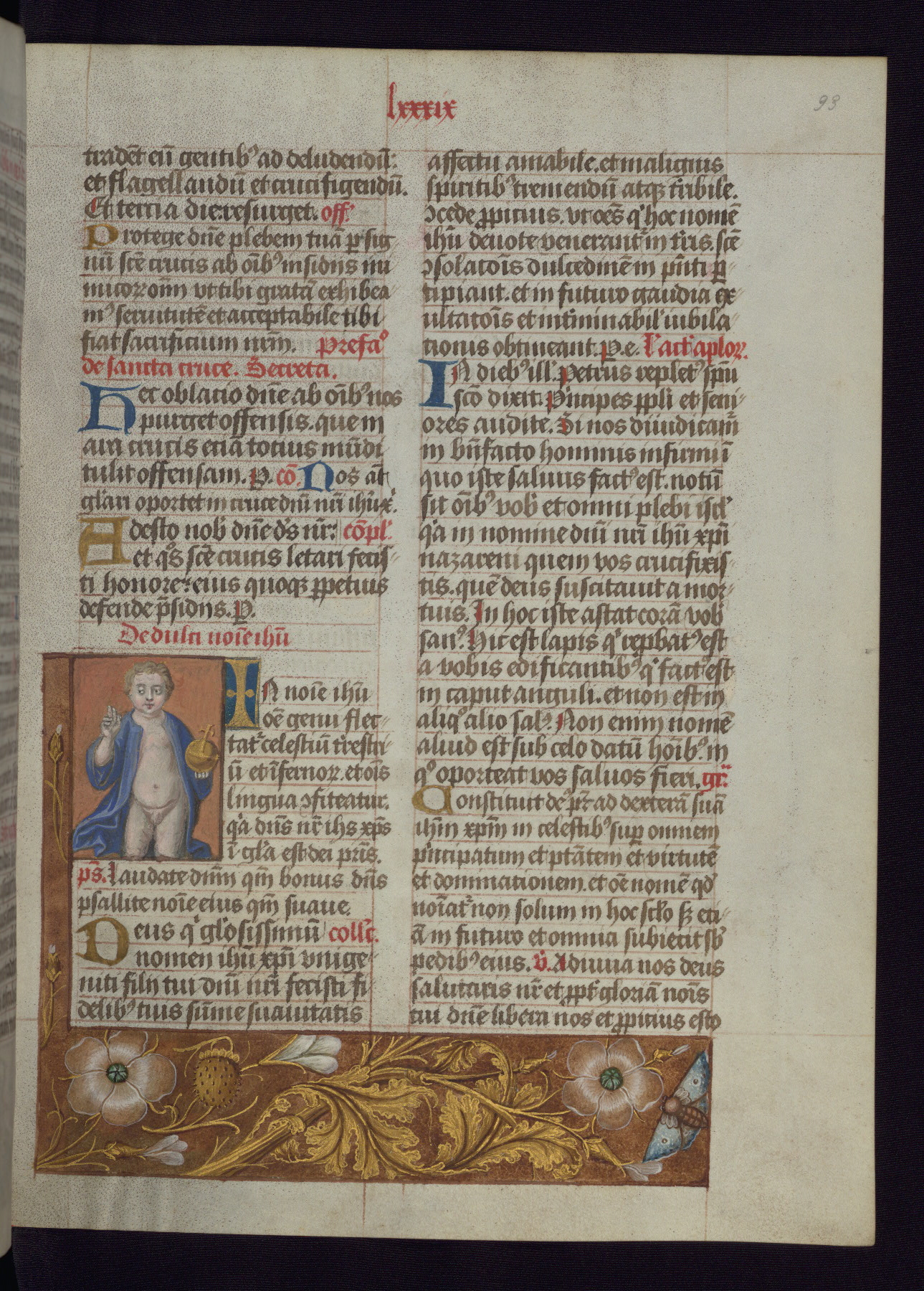 - Decoration note: One full-page and one half-page miniature; fifty historiated initials (5-14 lines); periodic marginal illumination, ranging from a small strip to all four margins, containing illusionistic flowers, insects, jewels, textiles, and occasionally figures; enlarged foliate initials throughout (3-6 lines); smaller blue and gold initials throughout (2 lines); rubrics in red; text in brown ink