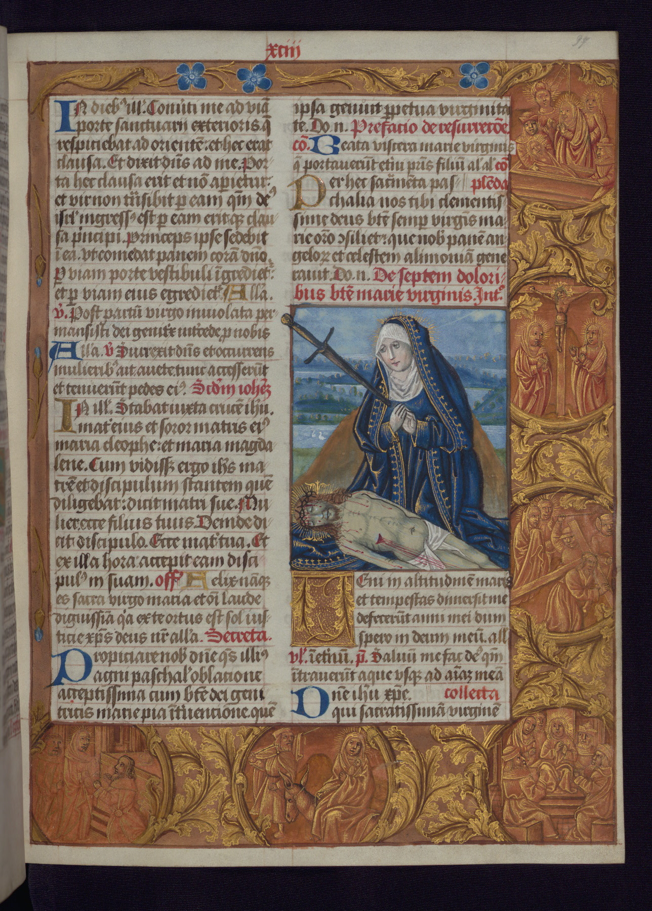 This Latin Missal was written in Utrecht, Netherlands, ca. 1500. Portraits of the original owners, whose names are not recorded, are accompanied by heraldry indicating that the husband was of the family of St. Férréol of Dauphiné; the wife was of the Cambronne of Ponthieu family. The manuscript is heavily illuminated with more than fifty historiated initials and miniatures by a group of artists known in scholarship as the "Masters of the Dark Eyes." The marginal decoration is also notable, for along with naturalistic flowers, insects, and jewels, there are several instances where the margin itself is historiated. This Missal provides an excellent example of the "Masters of the Dark Eyes" style, and there are a number of related manuscripts that have been identified by these same artists, including two at The Hague: KB, 76 G 9, and KB, 135 E 19.