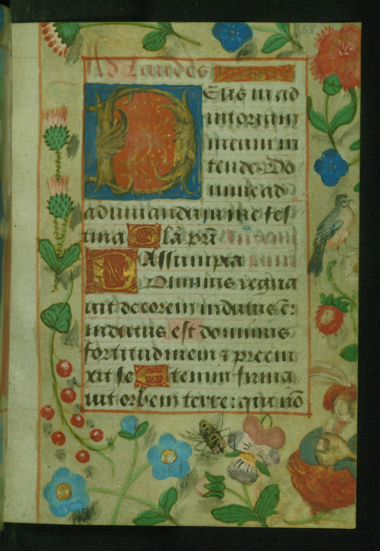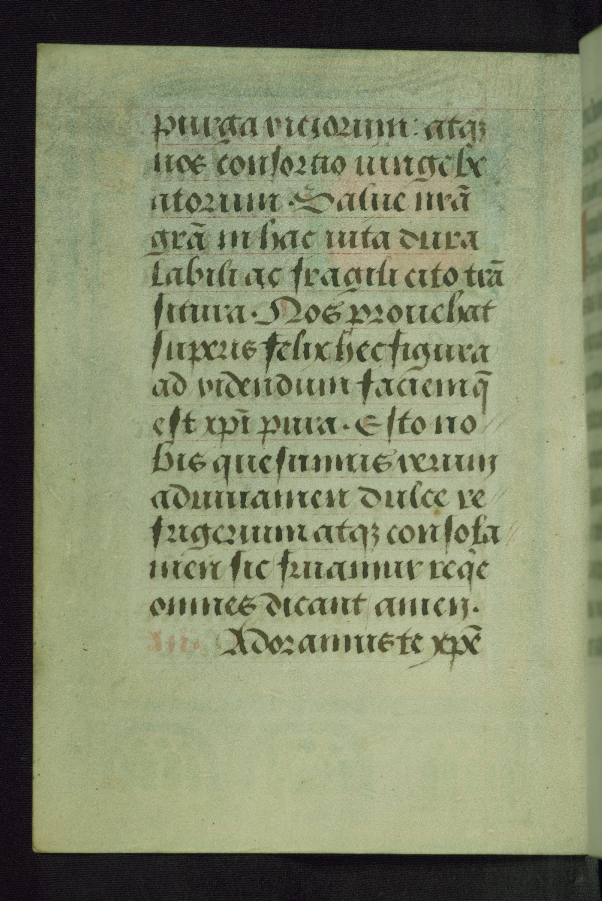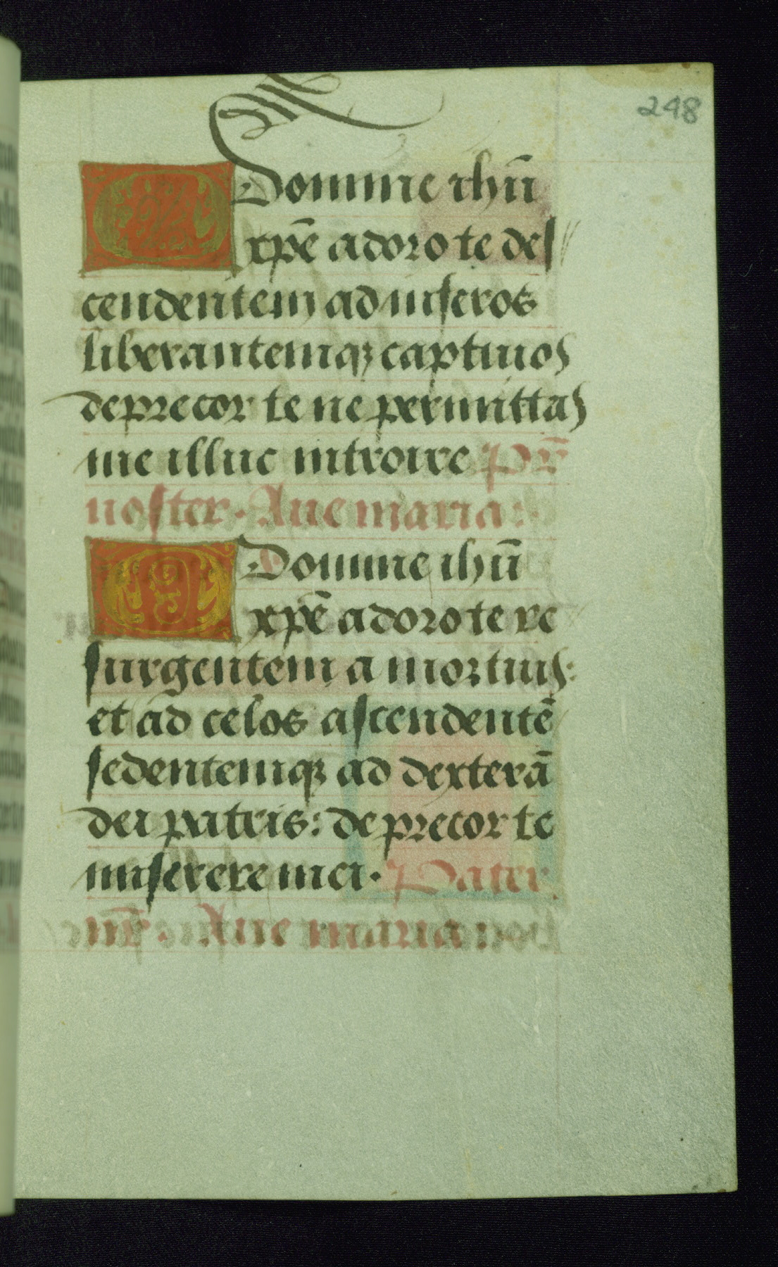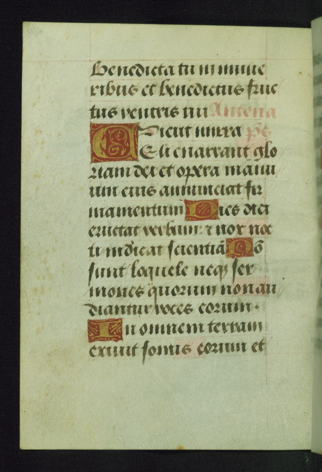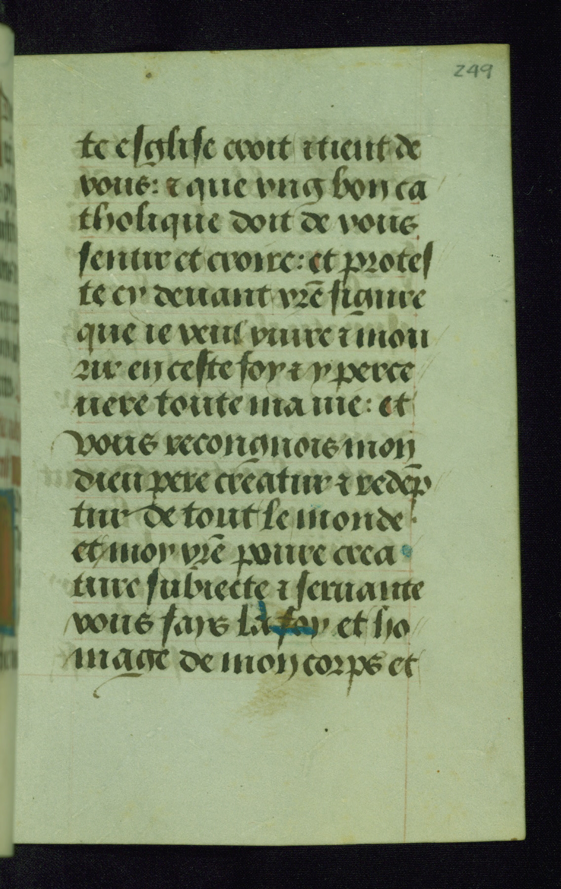 This small Book of Hours was made at the turn of the sixteenth century. The illuminations are in the style of the Master of the Prayerbook of ca. 1500, active in Bruges. The name of the first owner is inscribed in the book in a prayer on fol. 241v, in which a man named Philip confesses himself a sinner and prays for his heart to be pure. The series of full-page miniatures opens with an interesting illumination of the Salvator Mundi that was a common theme in South Netherlandish illumination in this period. A comparable example, painted by the Master of the Prayerbook c. 1500, is found in the manuscript Vat. Ross. Lat. 94.
