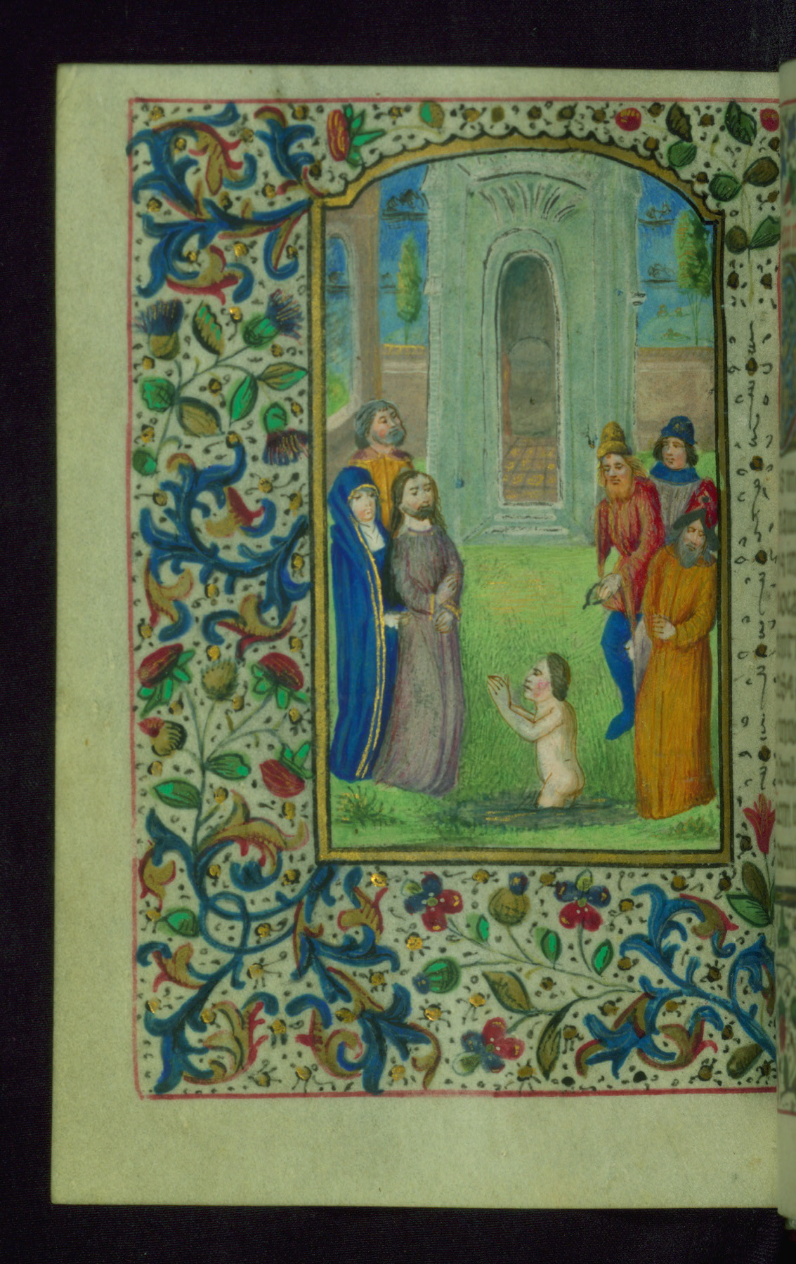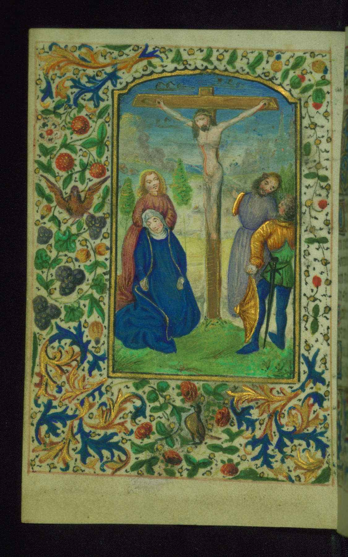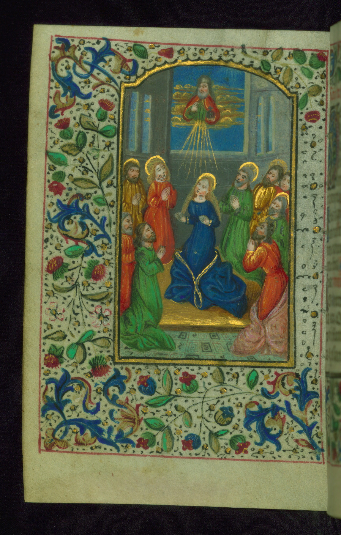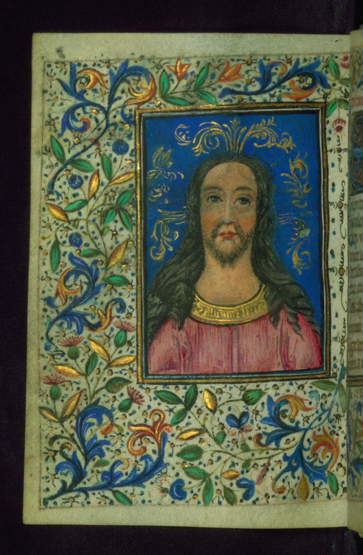 - Decoration note: Fifteen extant full-page inserted miniatures (figures heavily repainted); foliate borders match across openings around full-page miniatures and facing texts; large decorated initials in gold, blue, rose, and green begin major text divisions (5 lines) and similar initials without green at secondary text divisions and for KL in calendar (2-3 lines); small flourished initials in alternating blue and gold with red and black penwork for versals (1 line); line fillers in litany in gold and blue geometric patterns; rubrics in red; text in brown ink