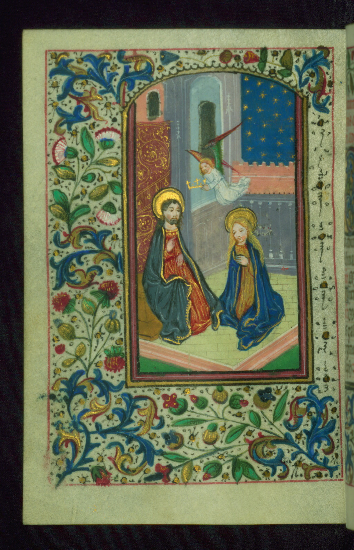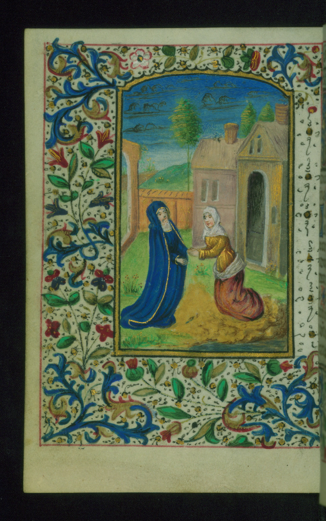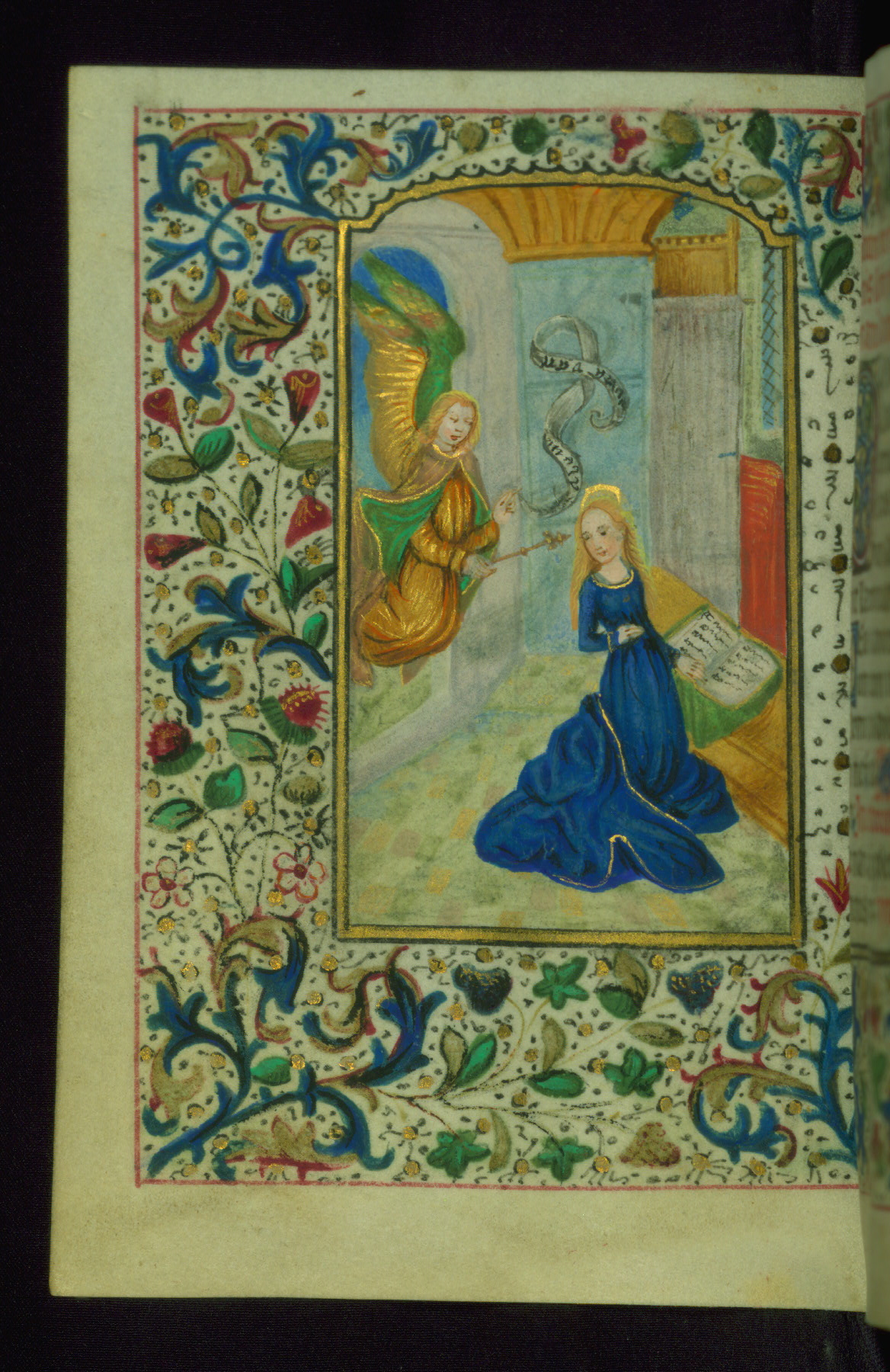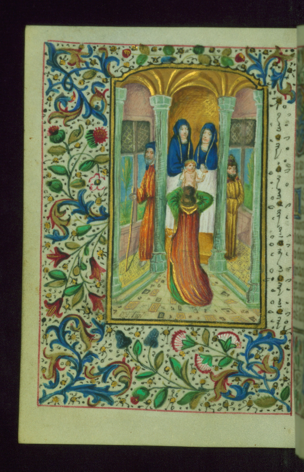 - Decoration note: Fifteen extant full-page inserted miniatures (figures heavily repainted); foliate borders match across openings around full-page miniatures and facing texts; large decorated initials in gold, blue, rose, and green begin major text divisions (5 lines) and similar initials without green at secondary text divisions and for KL in calendar (2-3 lines); small flourished initials in alternating blue and gold with red and black penwork for versals (1 line); line fillers in litany in gold and blue geometric patterns; rubrics in red; text in brown ink