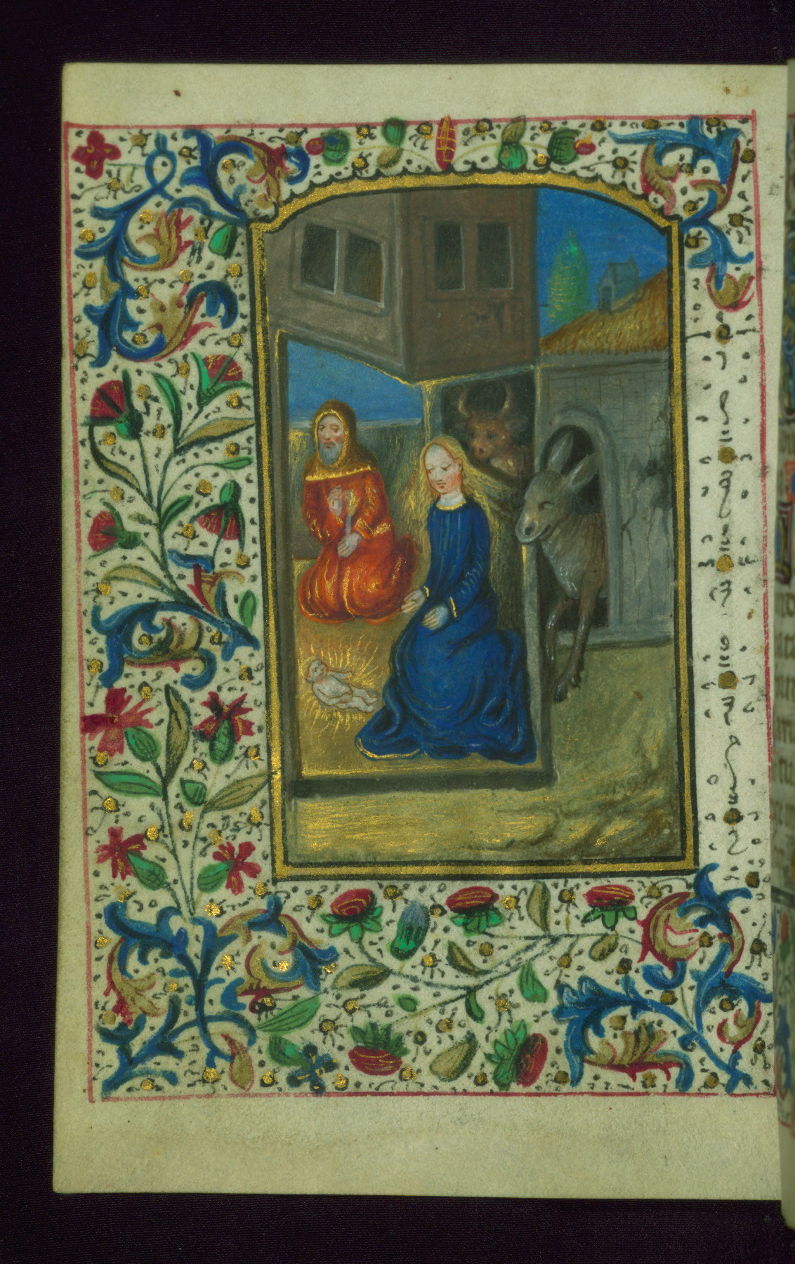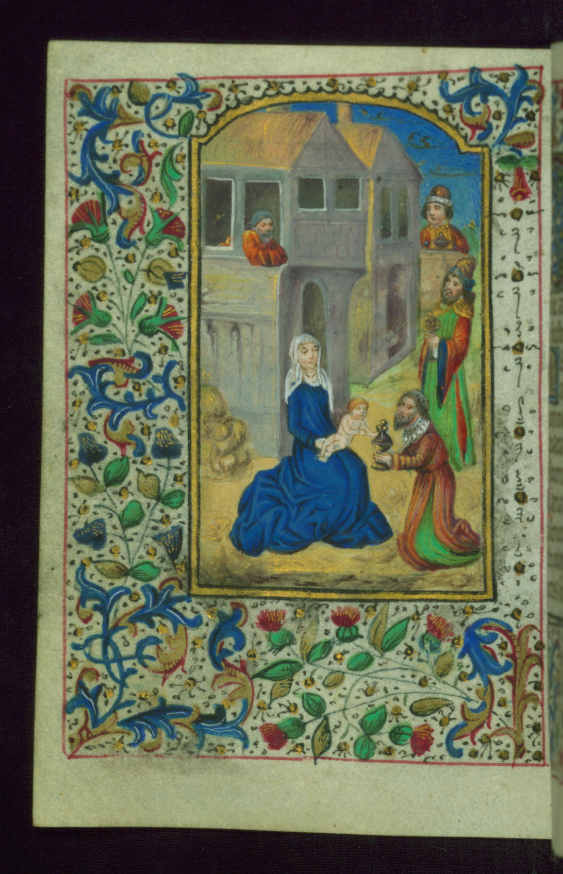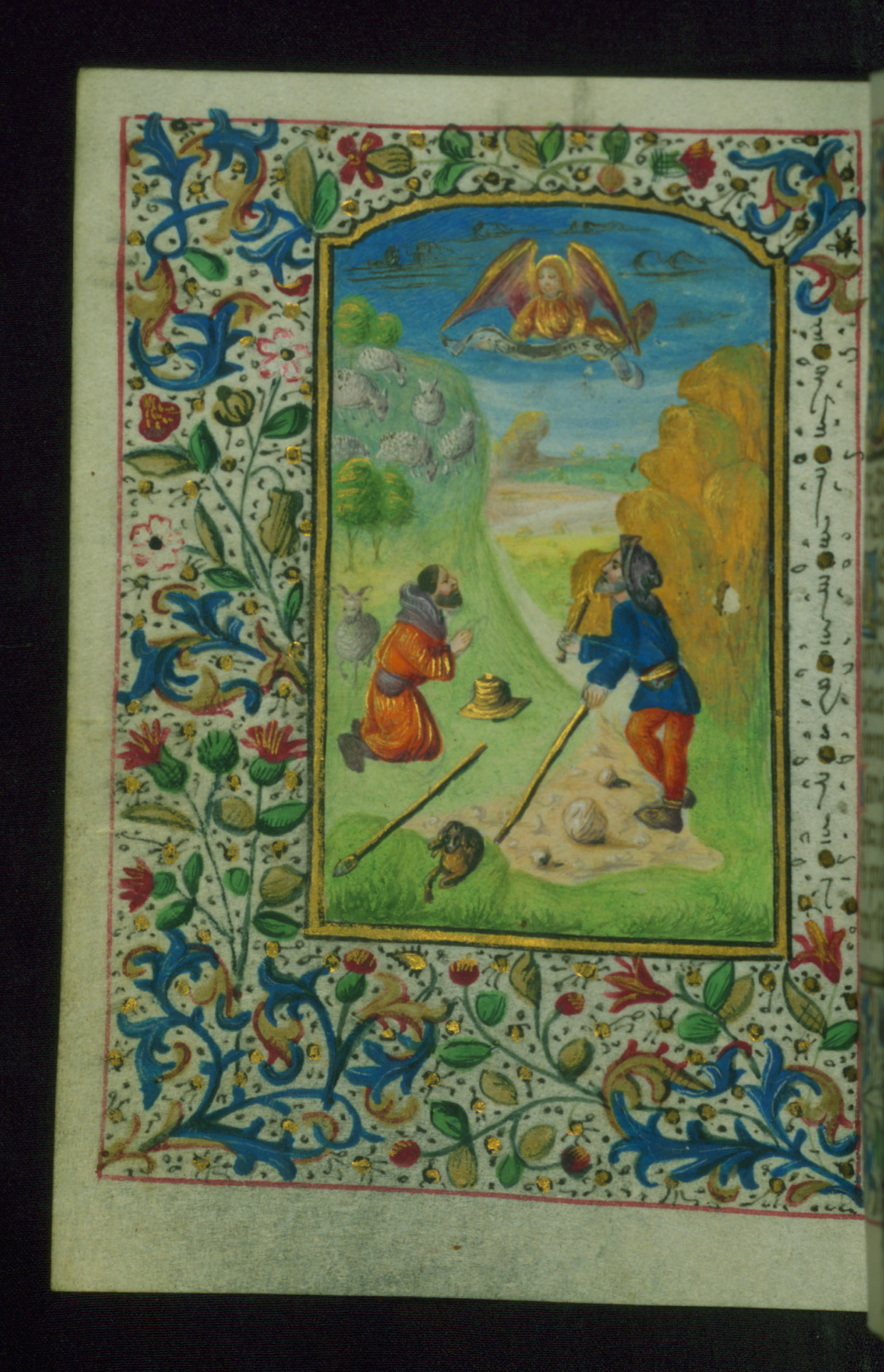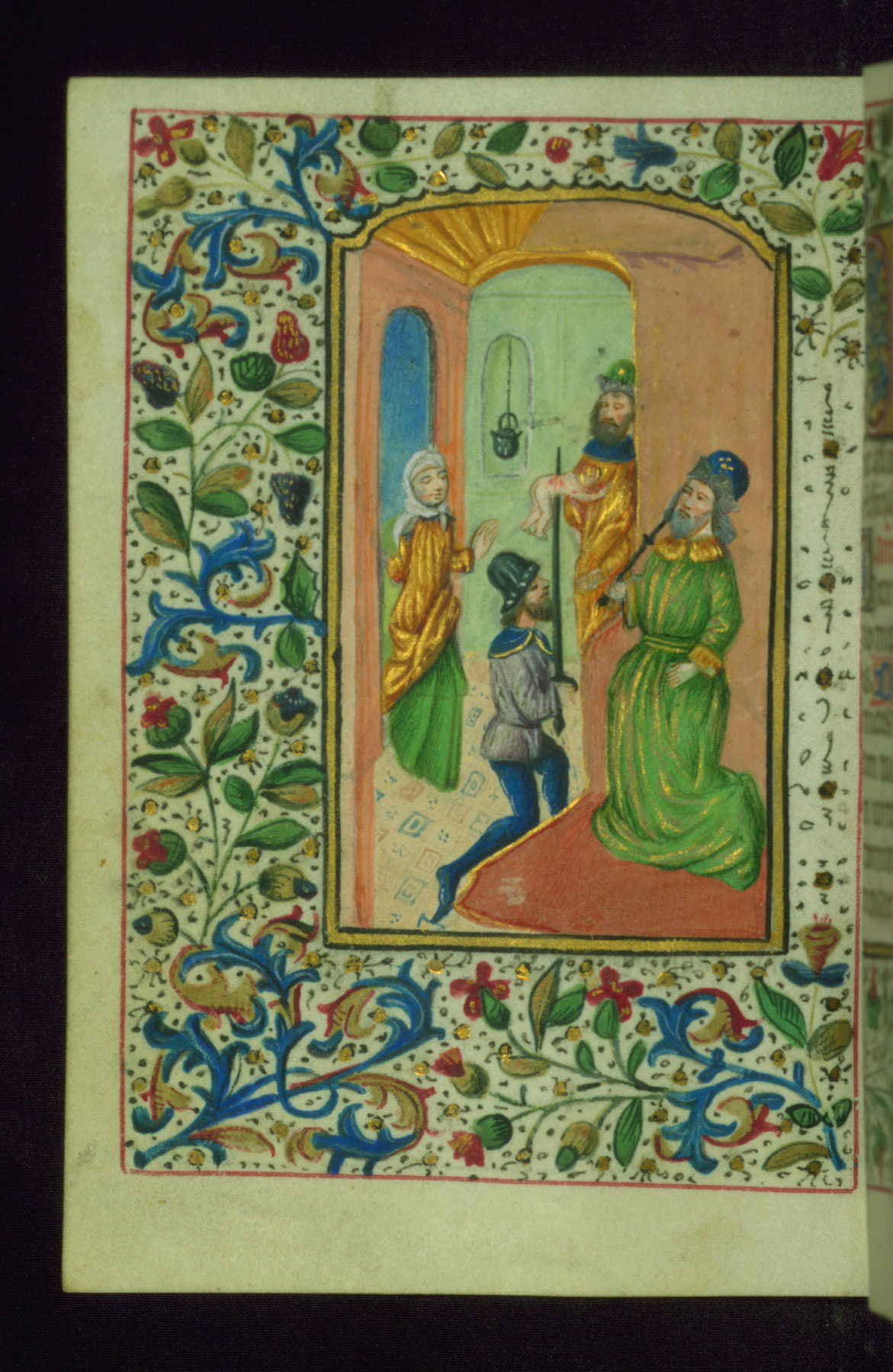 - Decoration note: Fifteen extant full-page inserted miniatures (figures heavily repainted); foliate borders match across openings around full-page miniatures and facing texts; large decorated initials in gold, blue, rose, and green begin major text divisions (5 lines) and similar initials without green at secondary text divisions and for KL in calendar (2-3 lines); small flourished initials in alternating blue and gold with red and black penwork for versals (1 line); line fillers in litany in gold and blue geometric patterns; rubrics in red; text in brown ink
