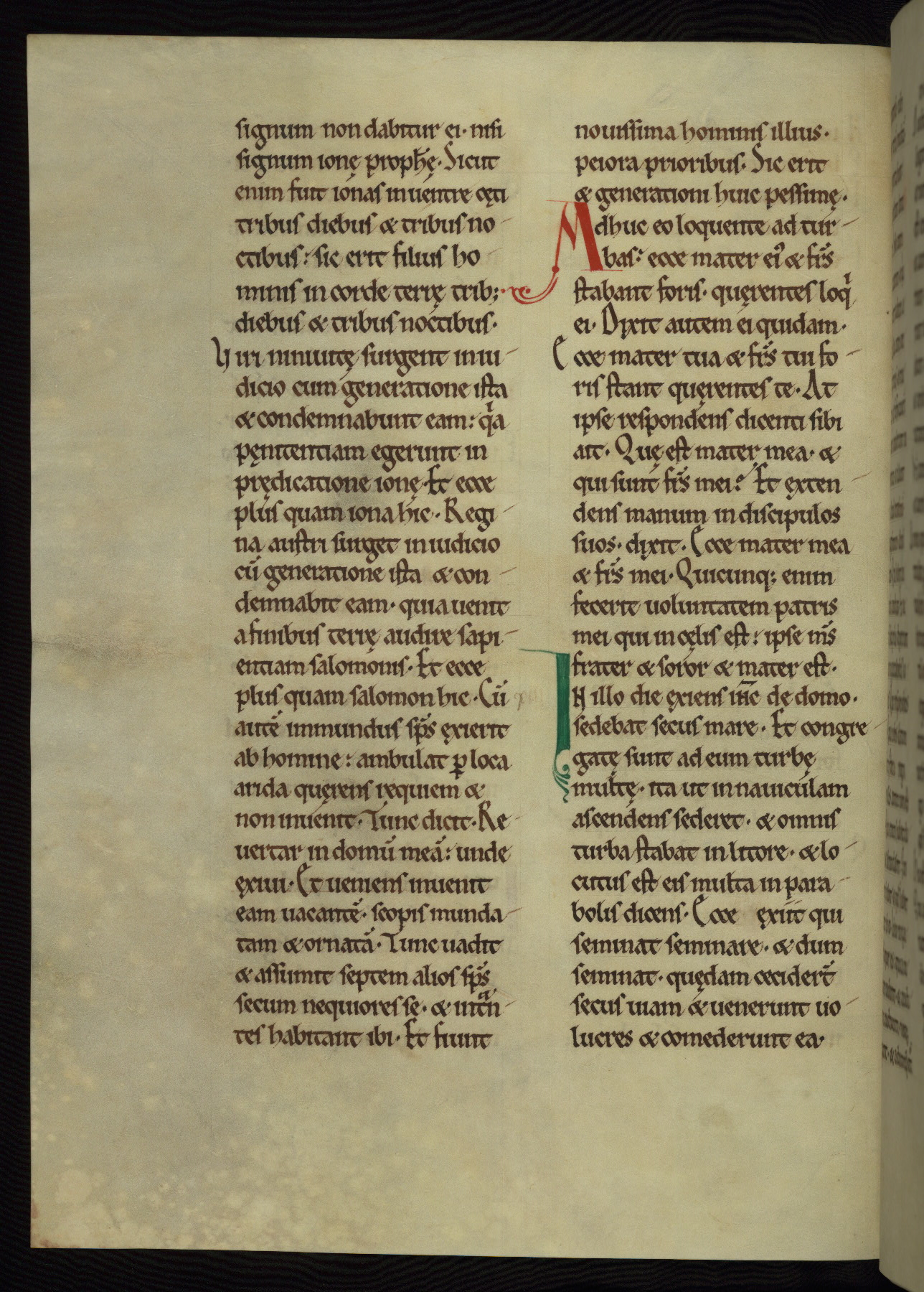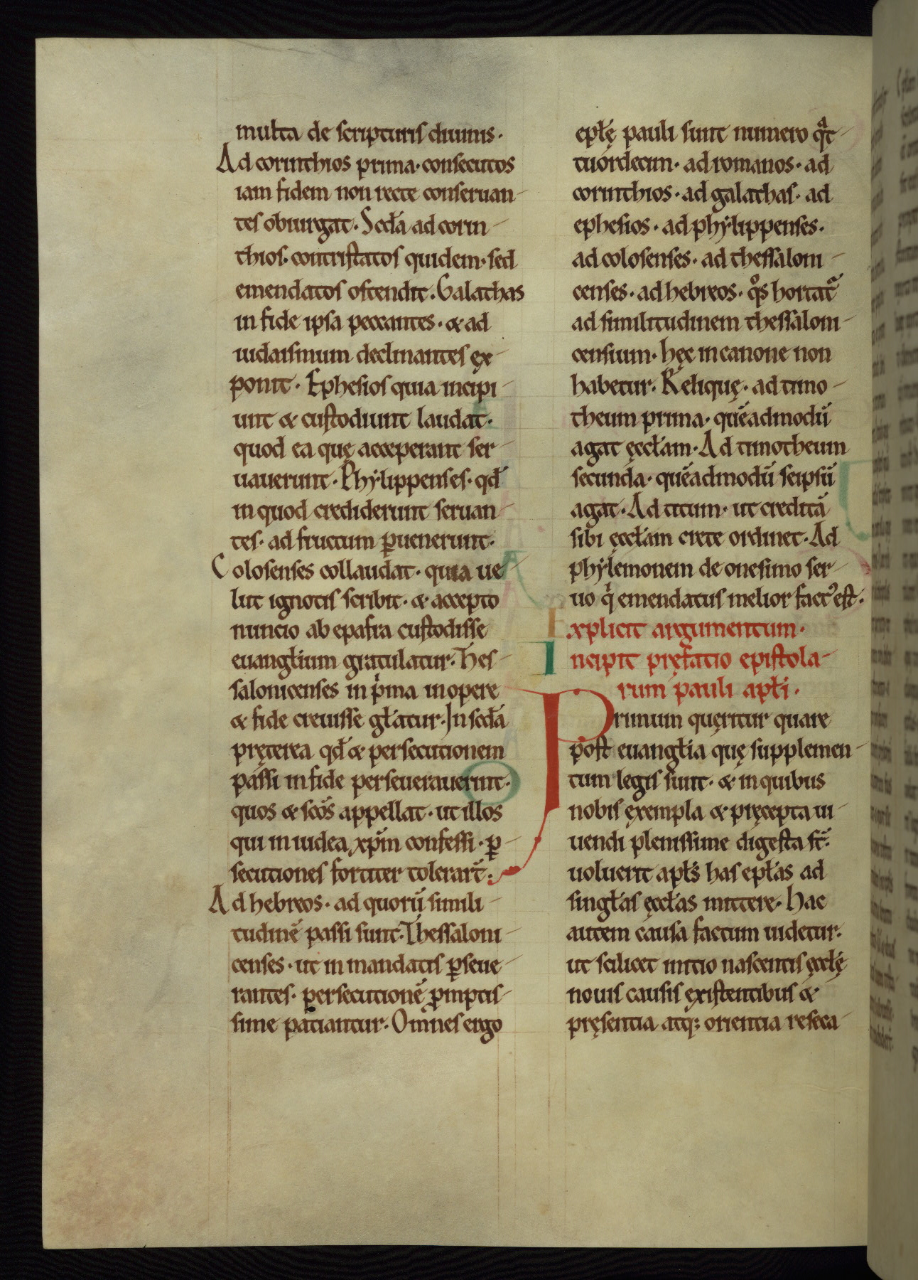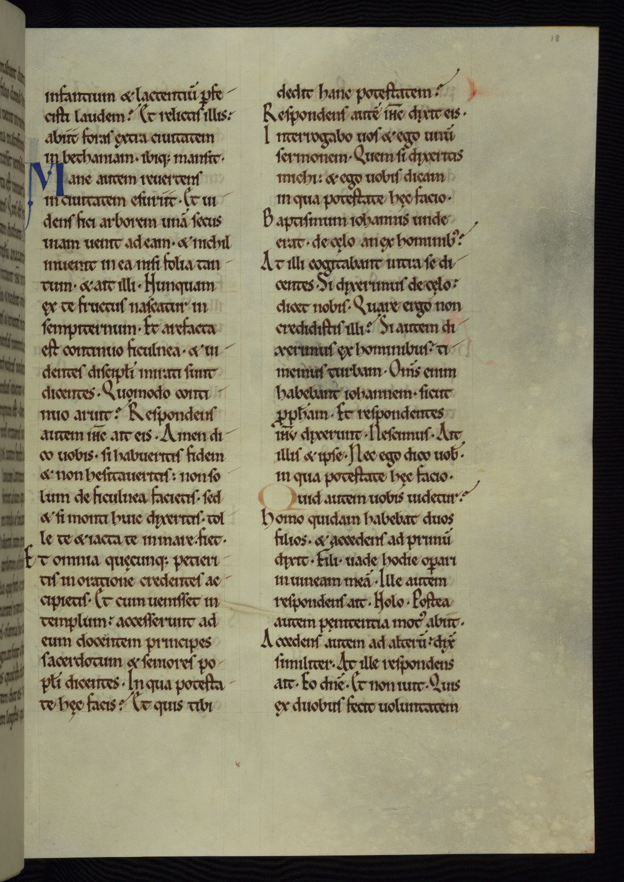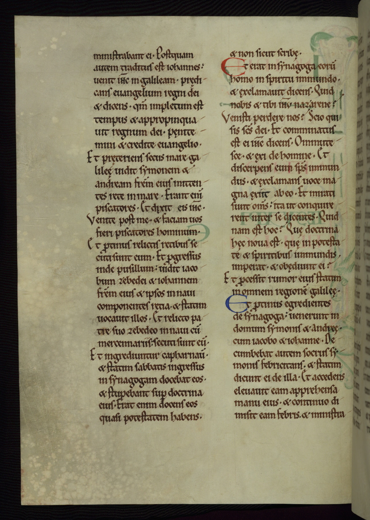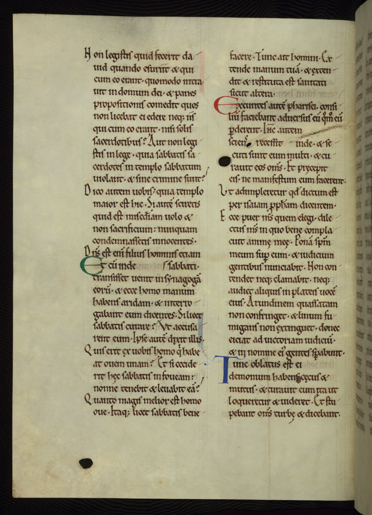 This large-format copy of the New Testament was almost certainly created at Rochester Cathedral Priory, England, in the first half of the twelfth century. It was part of a five-volume Bible, only one other volume of which, London, British Library Ms. Royal I.C.VII, has survived. The decorated initials in these manuscripts compare closely with those in other books securely attributed to Rochester. Textually these books are closely related to the Gundulph Bible (San Marino, Huntington Library Ms. HM 62), known to have been produced at Rochester in the second half of the eleventh century. Although neither the Walters' nor the British Library's volume includes an inscription associating this Bible with Rochester, the two medieval catalogs of the Rochester Cathedral library, produced around 1130 and in 1202, contain references to manuscripts that correspond well with them. The book’s large size indicates it that was designed to be read aloud, either during services or at meals in the refectory. Large, fanciful initials filled with succulent foliage, fruit, dragons, animals, and human faces begin each section of the text. Executed in a vibrant palette of red, blue, green, ochre (in place of gold), and yellow, the intricate, dynamic designs capture the essence of Romanesque manuscript illumination. Royal I.C.VII also includes four historiated initials (for the books of Joshua, I Samuel, 2 Samuel, and 2 Kings). Although the Bible was made at Rochester, the pre-Gothic script of W.18 in particular is extremely close to that practiced at nearby Canterbury at the time.