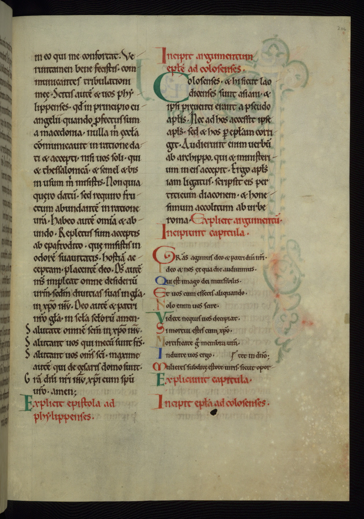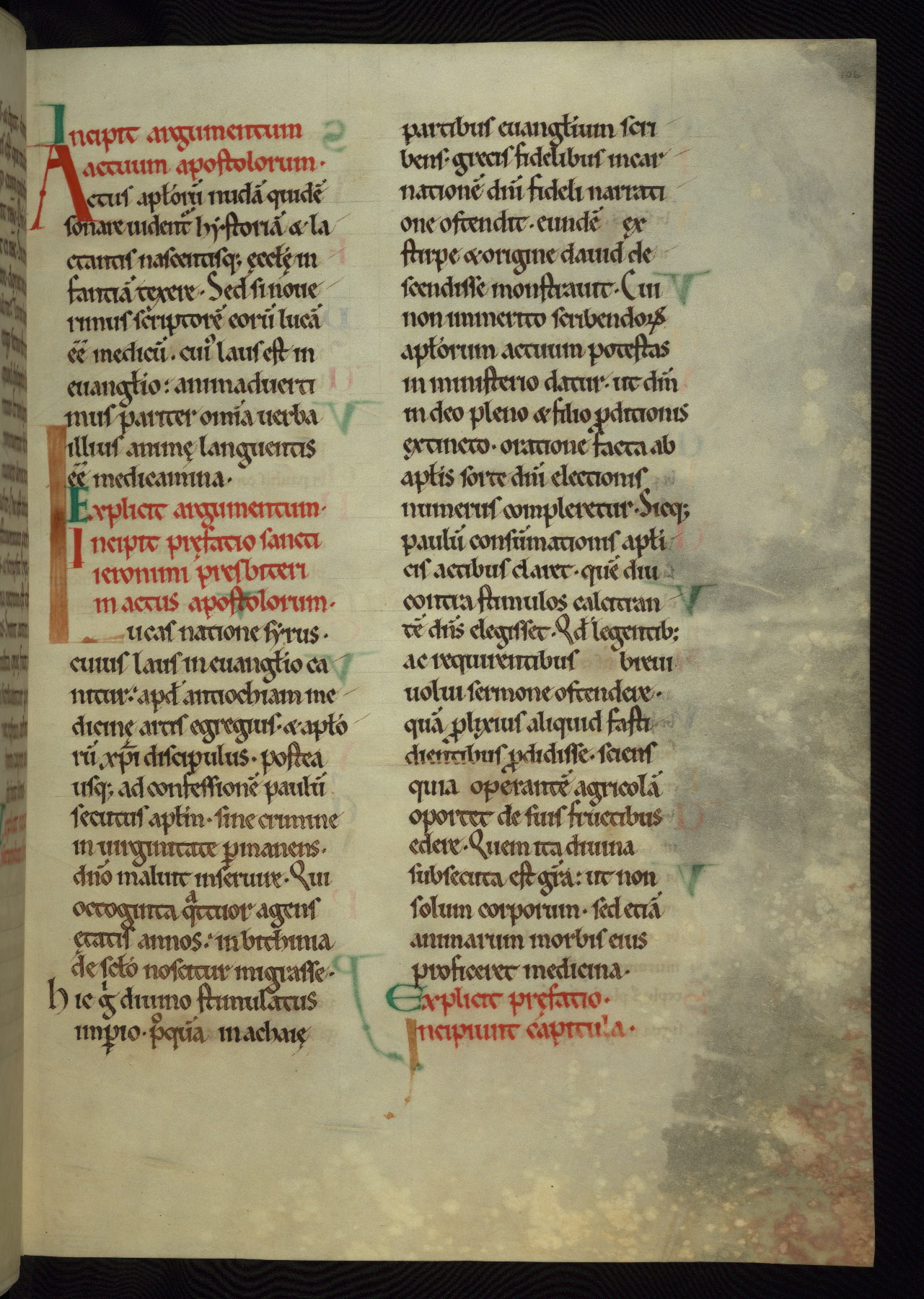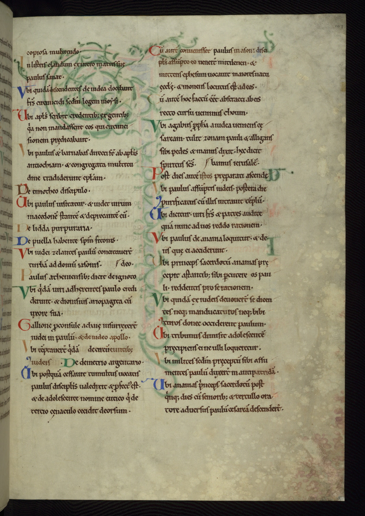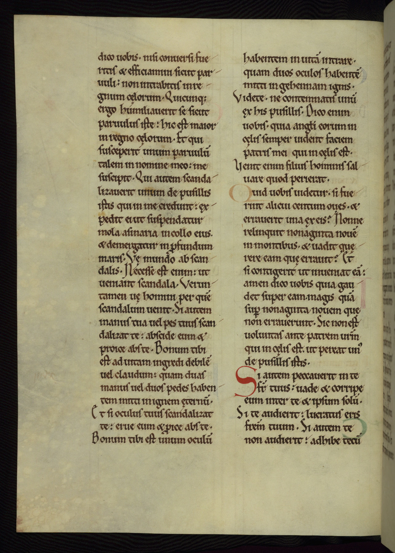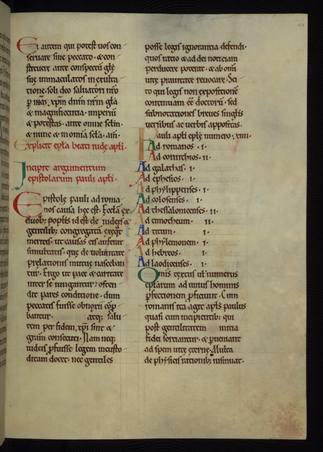 This large-format copy of the New Testament was almost certainly created at Rochester Cathedral Priory, England, in the first half of the twelfth century. It was part of a five-volume Bible, only one other volume of which, London, British Library Ms. Royal I.C.VII, has survived. The decorated initials in these manuscripts compare closely with those in other books securely attributed to Rochester. Textually these books are closely related to the Gundulph Bible (San Marino, Huntington Library Ms. HM 62), known to have been produced at Rochester in the second half of the eleventh century. Although neither the Walters' nor the British Library's volume includes an inscription associating this Bible with Rochester, the two medieval catalogs of the Rochester Cathedral library, produced around 1130 and in 1202, contain references to manuscripts that correspond well with them. The book’s large size indicates it that was designed to be read aloud, either during services or at meals in the refectory. Large, fanciful initials filled with succulent foliage, fruit, dragons, animals, and human faces begin each section of the text. Executed in a vibrant palette of red, blue, green, ochre (in place of gold), and yellow, the intricate, dynamic designs capture the essence of Romanesque manuscript illumination. Royal I.C.VII also includes four historiated initials (for the books of Joshua, I Samuel, 2 Samuel, and 2 Kings). Although the Bible was made at Rochester, the pre-Gothic script of W.18 in particular is extremely close to that practiced at nearby Canterbury at the time.