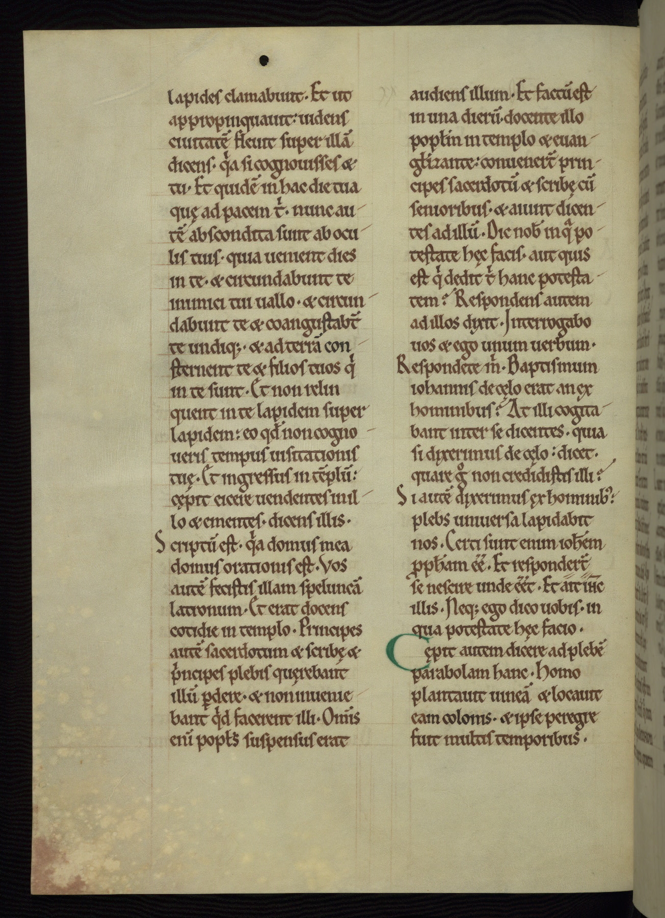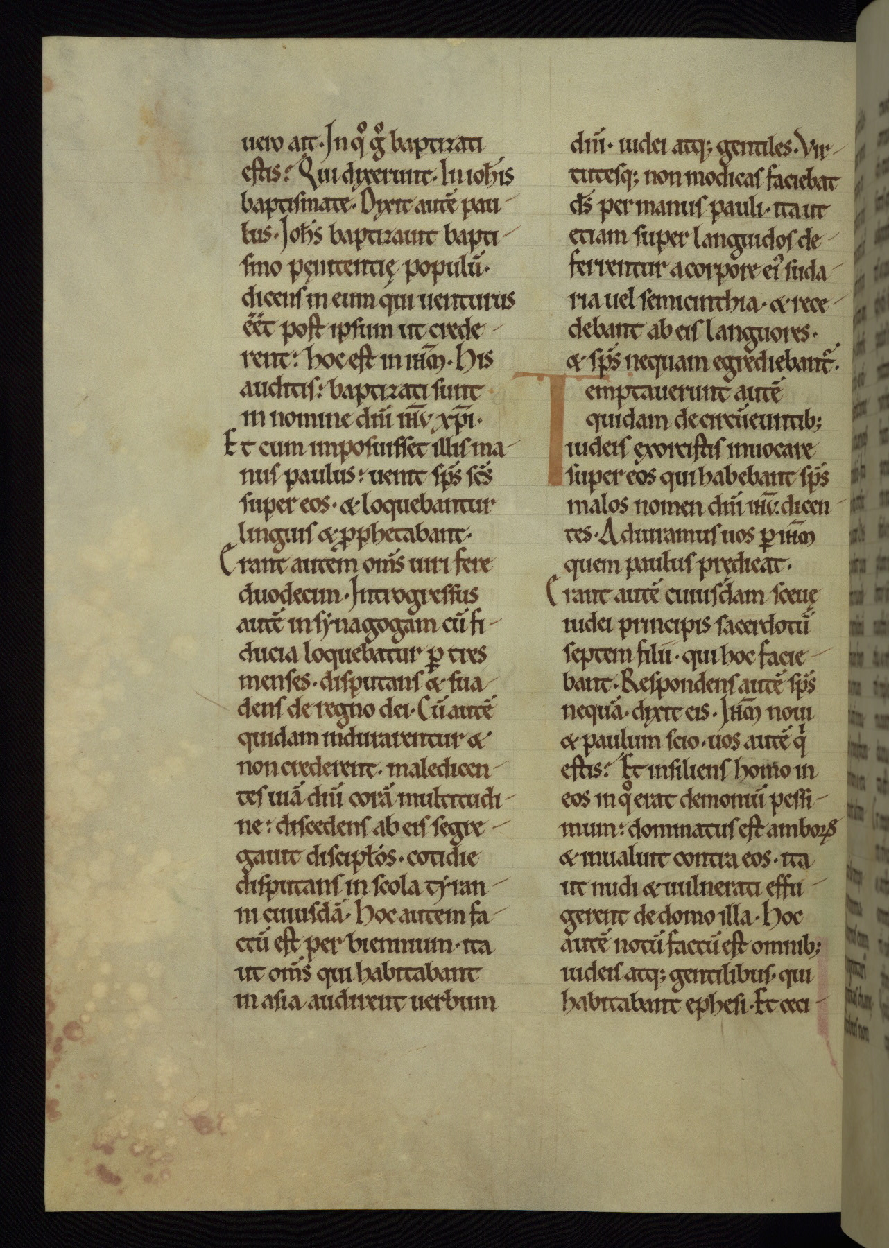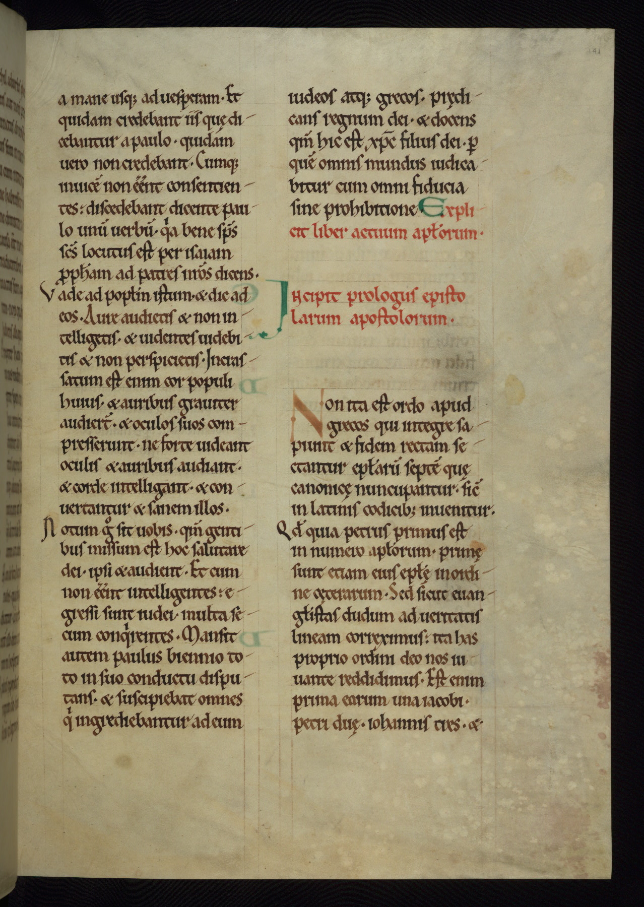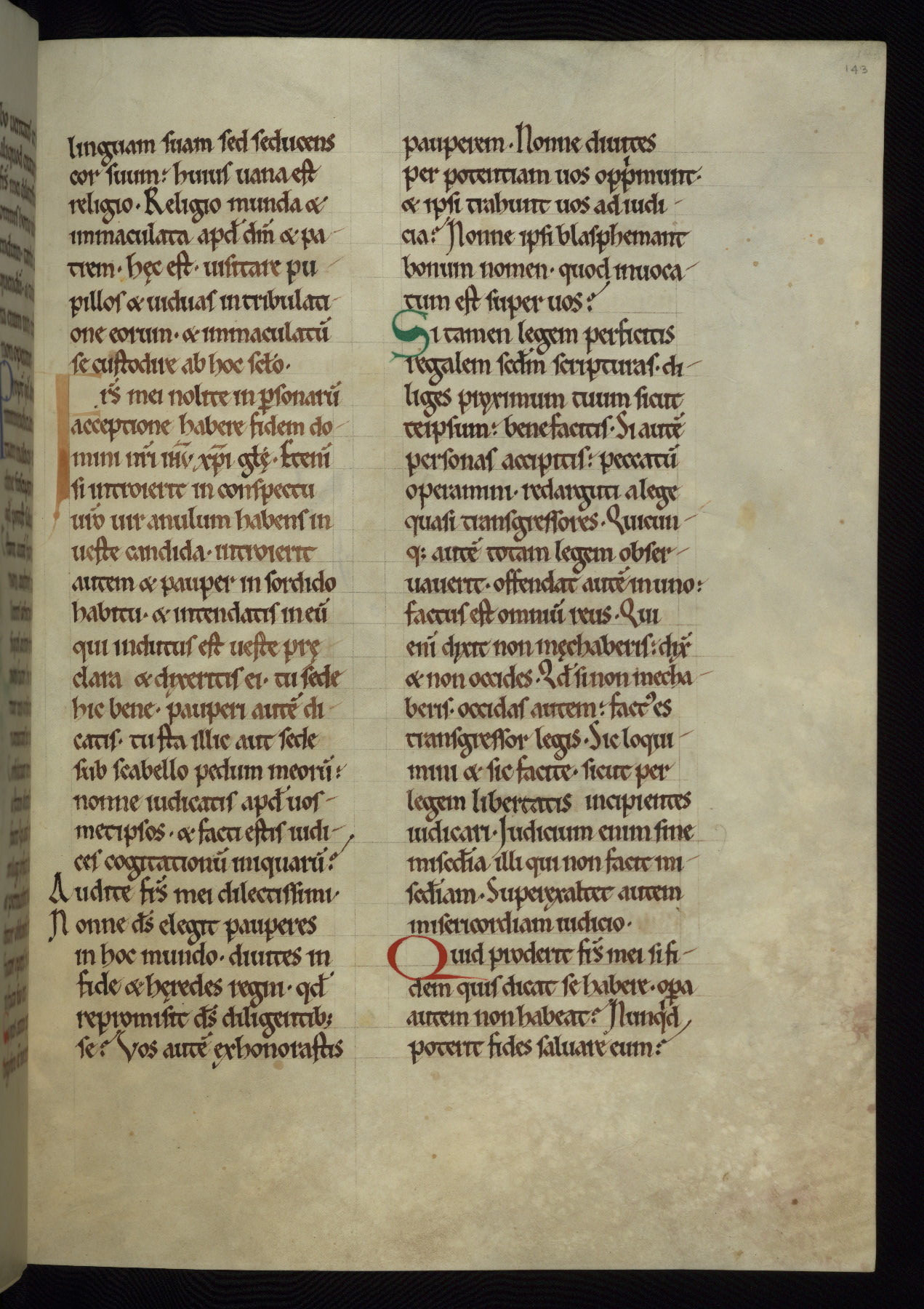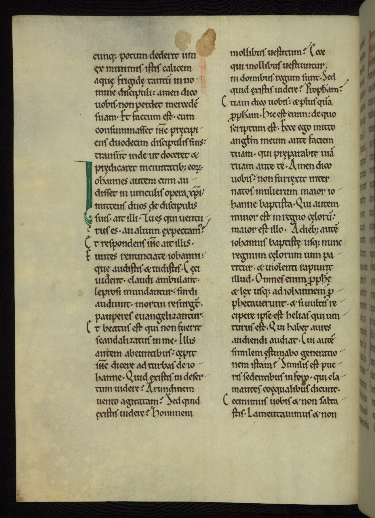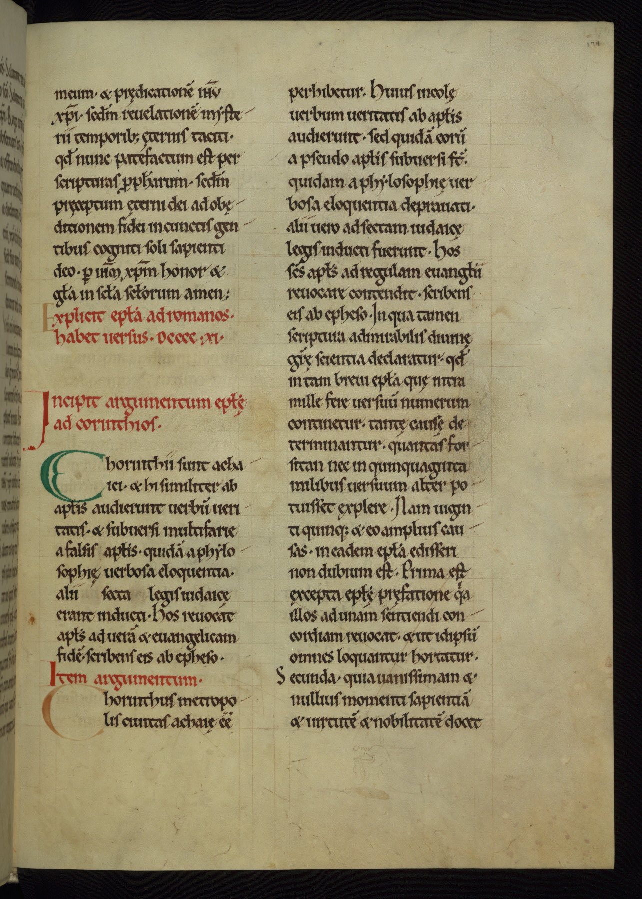 This large-format copy of the New Testament was almost certainly created at Rochester Cathedral Priory, England, in the first half of the twelfth century. It was part of a five-volume Bible, only one other volume of which, London, British Library Ms. Royal I.C.VII, has survived. The decorated initials in these manuscripts compare closely with those in other books securely attributed to Rochester. Textually these books are closely related to the Gundulph Bible (San Marino, Huntington Library Ms. HM 62), known to have been produced at Rochester in the second half of the eleventh century. Although neither the Walters' nor the British Library's volume includes an inscription associating this Bible with Rochester, the two medieval catalogs of the Rochester Cathedral library, produced around 1130 and in 1202, contain references to manuscripts that correspond well with them. The book’s large size indicates it that was designed to be read aloud, either during services or at meals in the refectory. Large, fanciful initials filled with succulent foliage, fruit, dragons, animals, and human faces begin each section of the text. Executed in a vibrant palette of red, blue, green, ochre (in place of gold), and yellow, the intricate, dynamic designs capture the essence of Romanesque manuscript illumination. Royal I.C.VII also includes four historiated initials (for the books of Joshua, I Samuel, 2 Samuel, and 2 Kings). Although the Bible was made at Rochester, the pre-Gothic script of W.18 in particular is extremely close to that practiced at nearby Canterbury at the time.