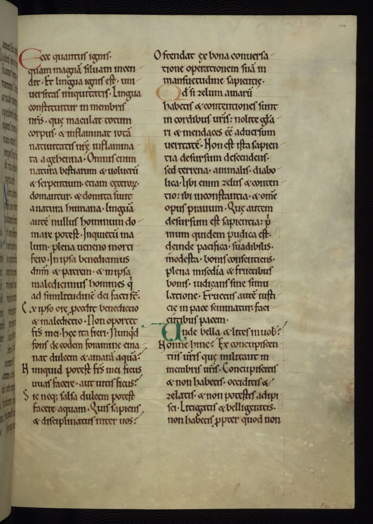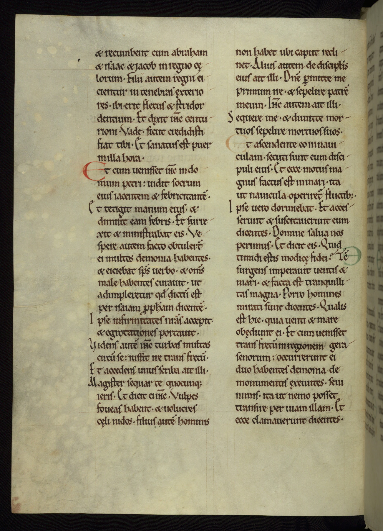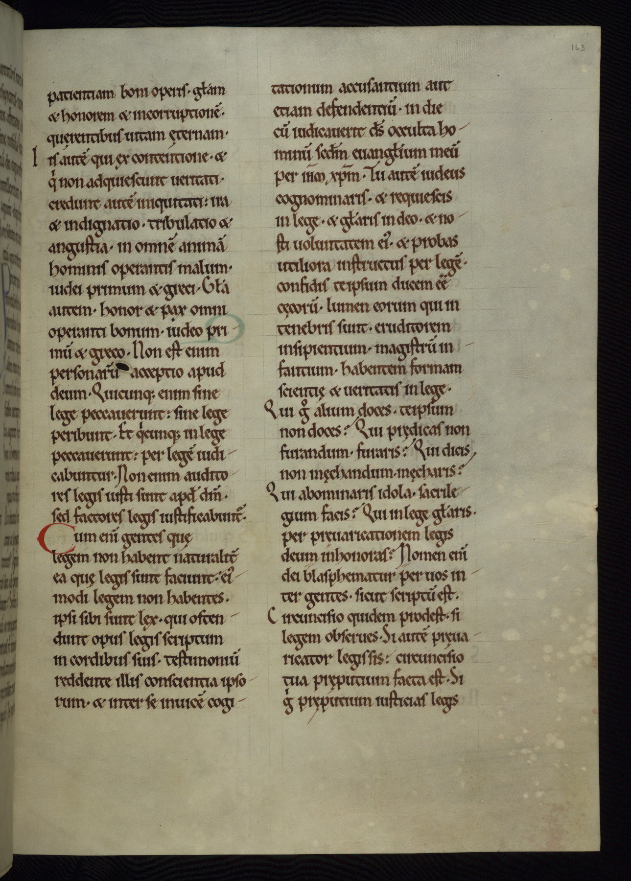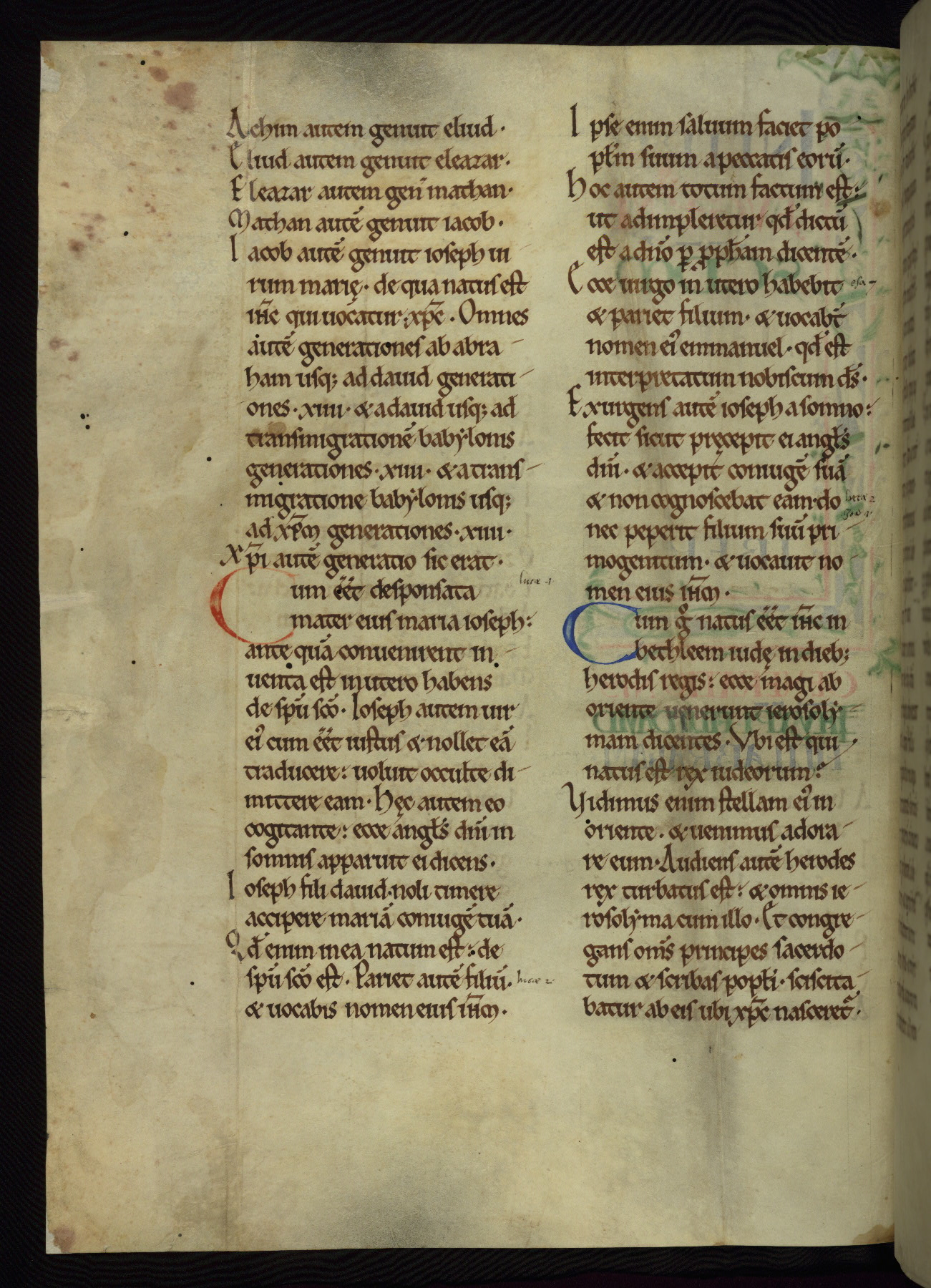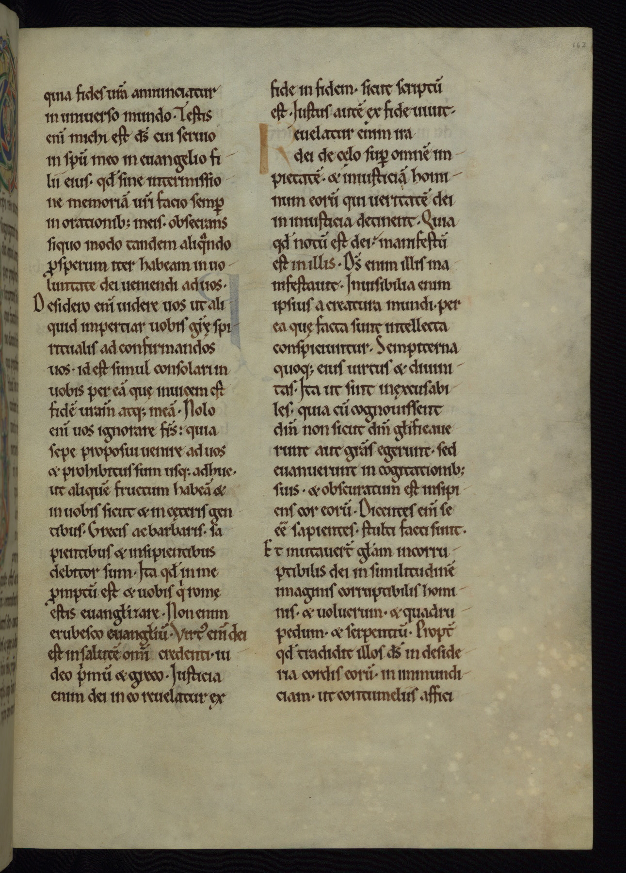 This large-format copy of the New Testament was almost certainly created at Rochester Cathedral Priory, England, in the first half of the twelfth century. It was part of a five-volume Bible, only one other volume of which, London, British Library Ms. Royal I.C.VII, has survived. The decorated initials in these manuscripts compare closely with those in other books securely attributed to Rochester. Textually these books are closely related to the Gundulph Bible (San Marino, Huntington Library Ms. HM 62), known to have been produced at Rochester in the second half of the eleventh century. Although neither the Walters' nor the British Library's volume includes an inscription associating this Bible with Rochester, the two medieval catalogs of the Rochester Cathedral library, produced around 1130 and in 1202, contain references to manuscripts that correspond well with them. The book’s large size indicates it that was designed to be read aloud, either during services or at meals in the refectory. Large, fanciful initials filled with succulent foliage, fruit, dragons, animals, and human faces begin each section of the text. Executed in a vibrant palette of red, blue, green, ochre (in place of gold), and yellow, the intricate, dynamic designs capture the essence of Romanesque manuscript illumination. Royal I.C.VII also includes four historiated initials (for the books of Joshua, I Samuel, 2 Samuel, and 2 Kings). Although the Bible was made at Rochester, the pre-Gothic script of W.18 in particular is extremely close to that practiced at nearby Canterbury at the time.