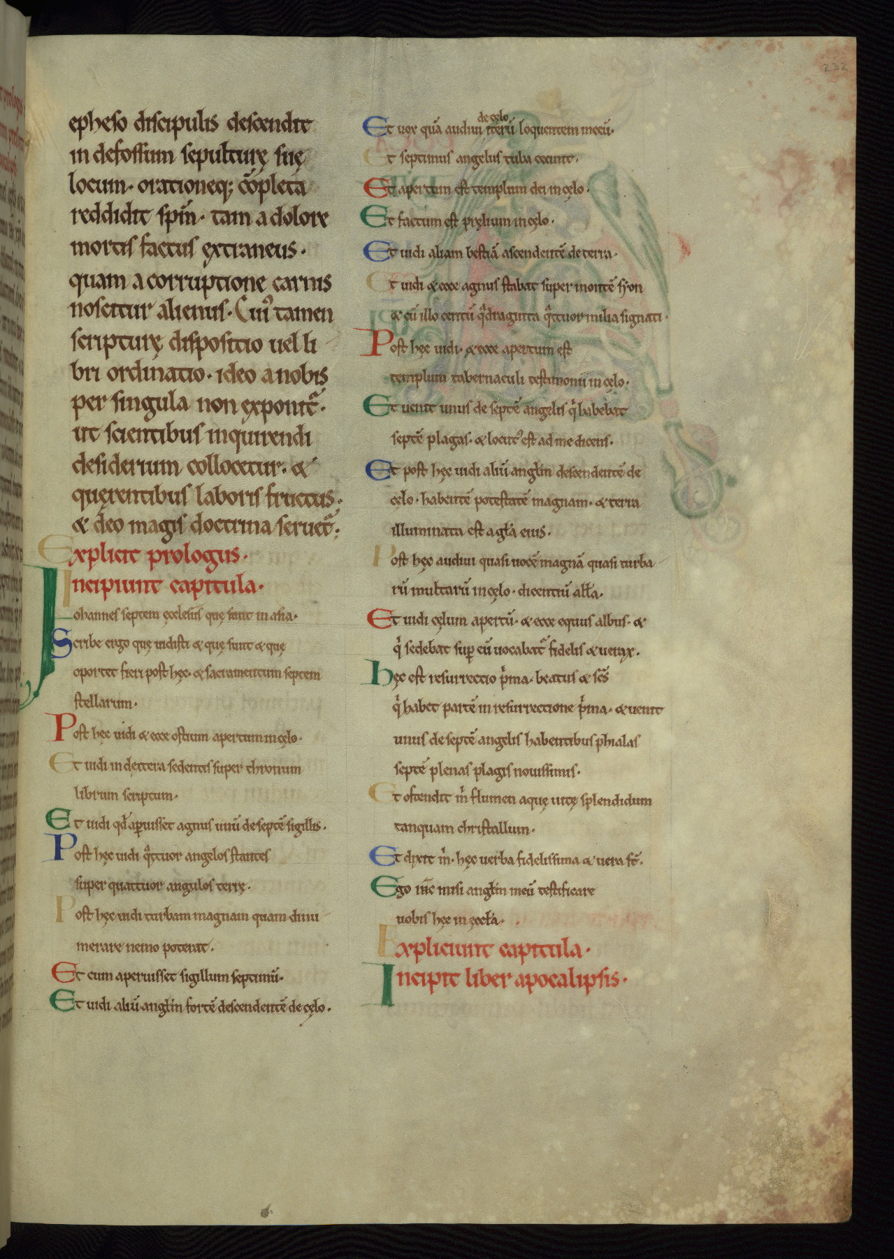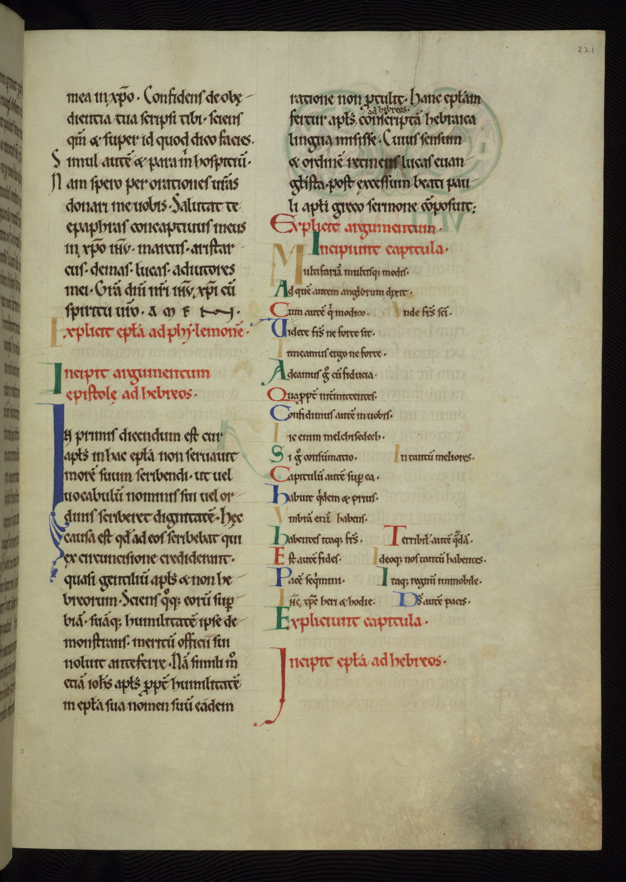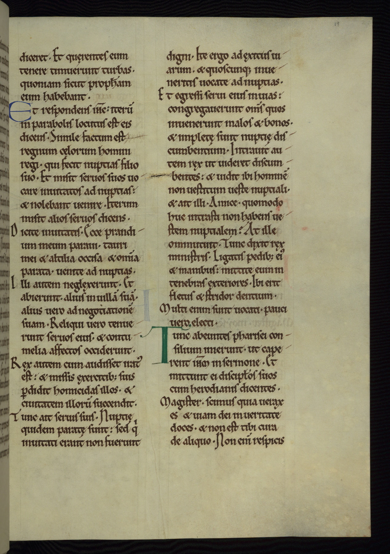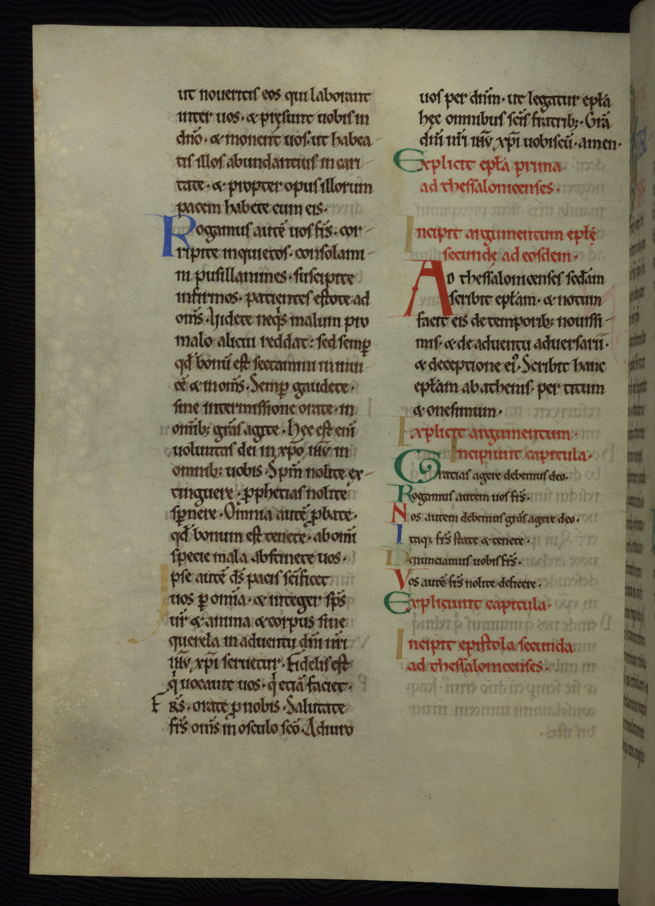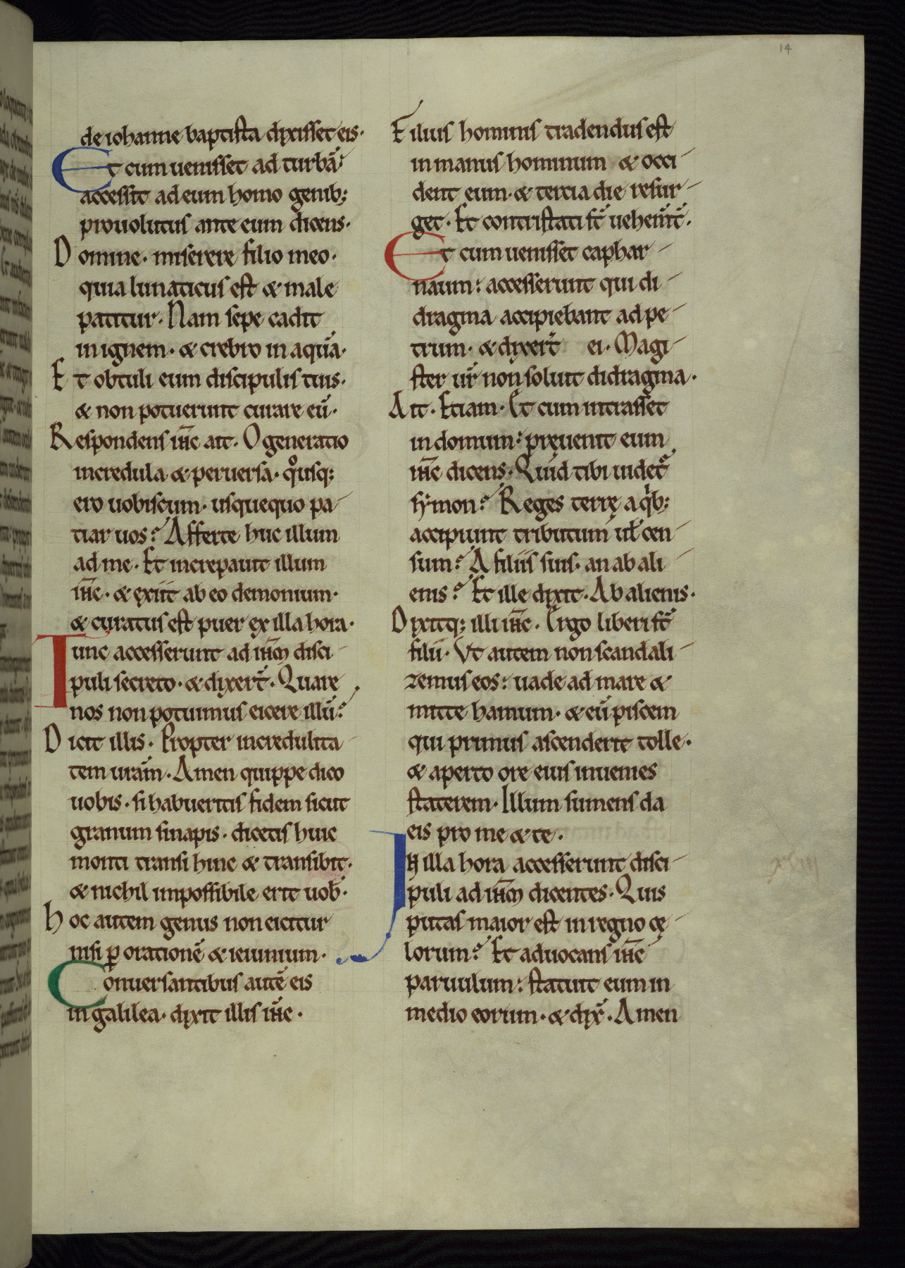This large-format copy of the New Testament was almost certainly created at Rochester Cathedral Priory, England, in the first half of the twelfth century. It was part of a five-volume Bible, only one other volume of which, London, British Library Ms. Royal I.C.VII, has survived. The decorated initials in these manuscripts compare closely with those in other books securely attributed to Rochester. Textually these books are closely related to the Gundulph Bible (San Marino, Huntington Library Ms. HM 62), known to have been produced at Rochester in the second half of the eleventh century. Although neither the Walters' nor the British Library's volume includes an inscription associating this Bible with Rochester, the two medieval catalogs of the Rochester Cathedral library, produced around 1130 and in 1202, contain references to manuscripts that correspond well with them. The book’s large size indicates it that was designed to be read aloud, either during services or at meals in the refectory. Large, fanciful initials filled with succulent foliage, fruit, dragons, animals, and human faces begin each section of the text. Executed in a vibrant palette of red, blue, green, ochre (in place of gold), and yellow, the intricate, dynamic designs capture the essence of Romanesque manuscript illumination. Royal I.C.VII also includes four historiated initials (for the books of Joshua, I Samuel, 2 Samuel, and 2 Kings). Although the Bible was made at Rochester, the pre-Gothic script of W.18 in particular is extremely close to that practiced at nearby Canterbury at the time.