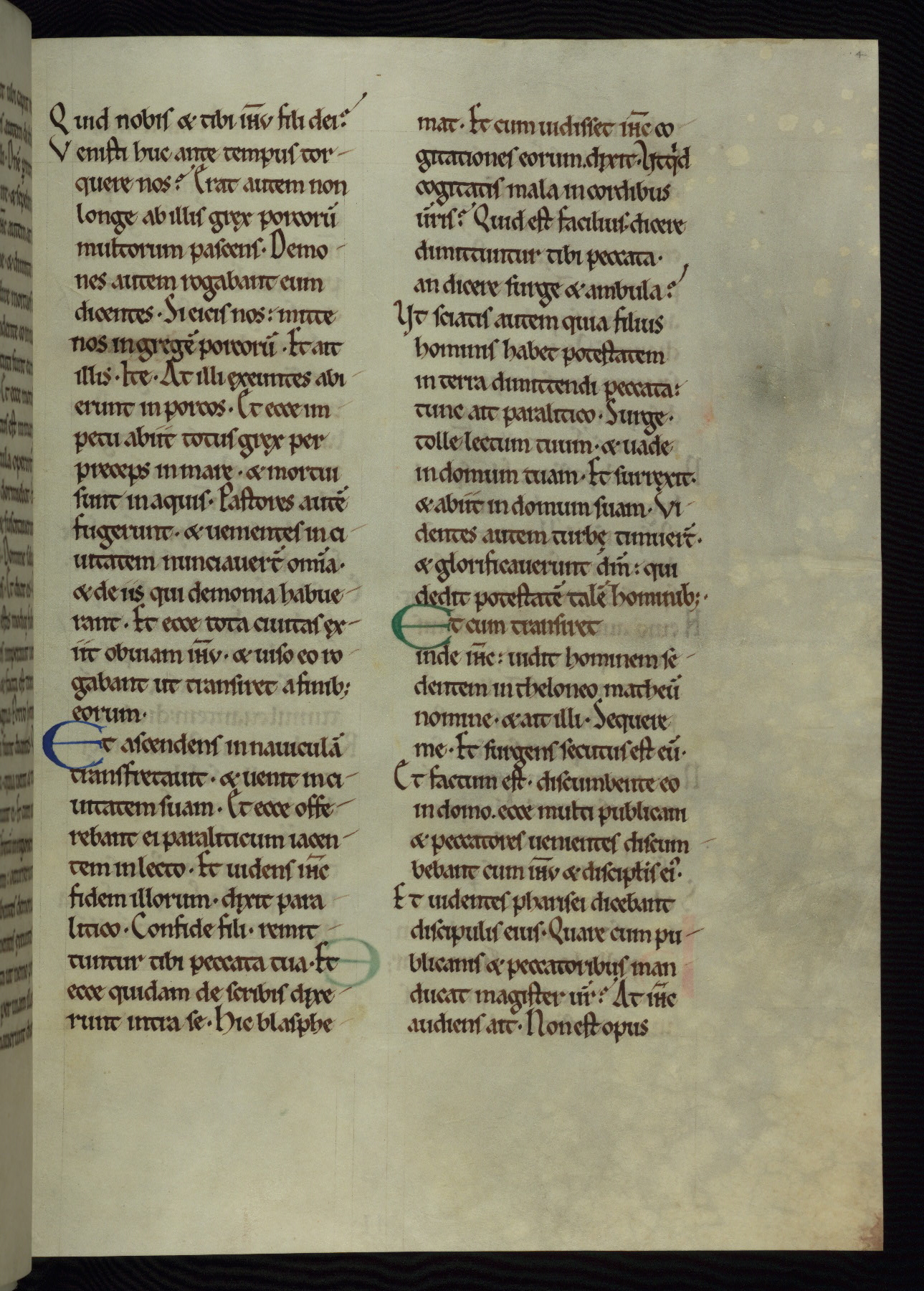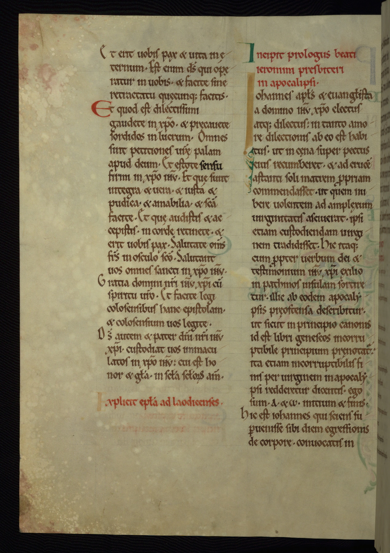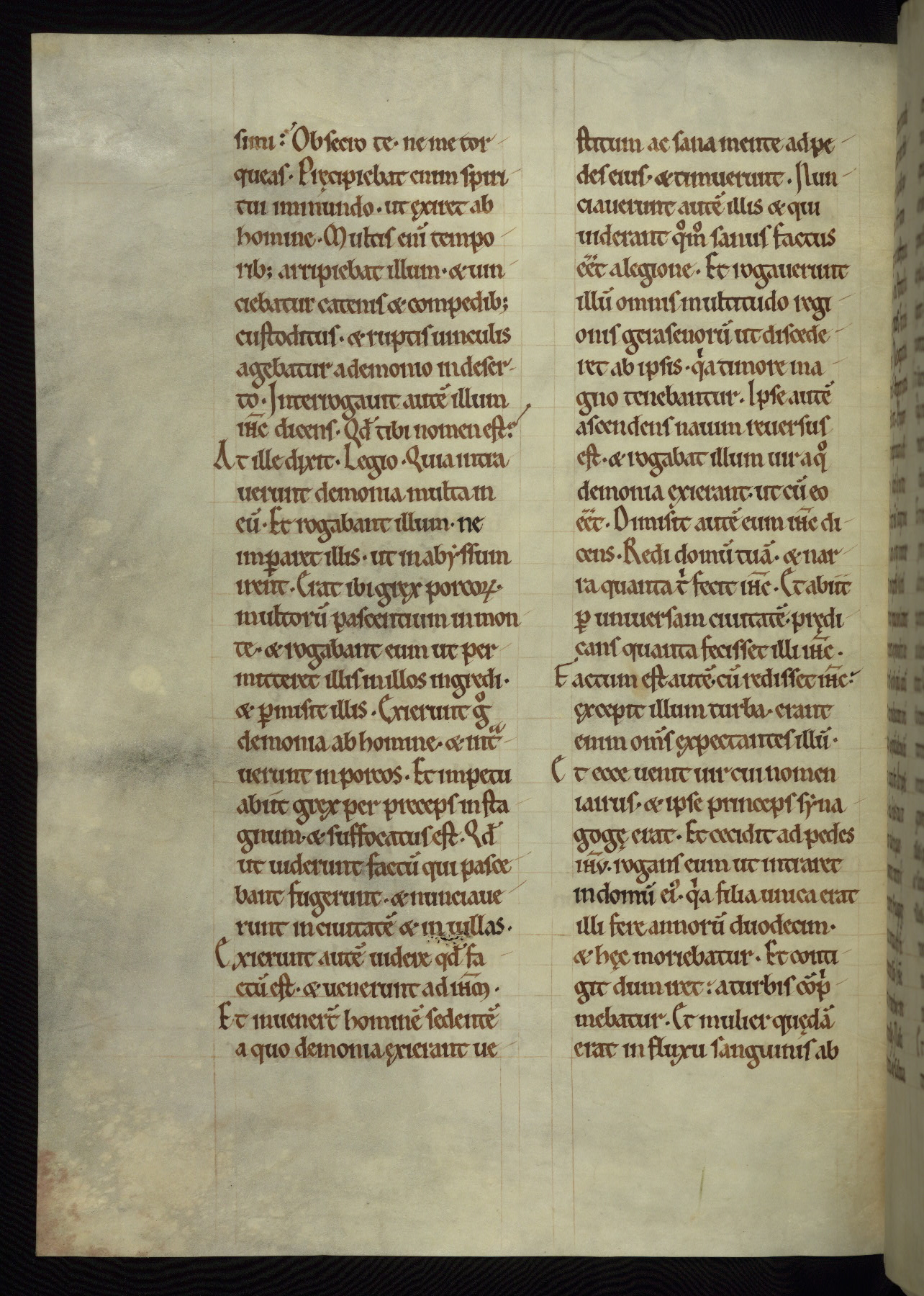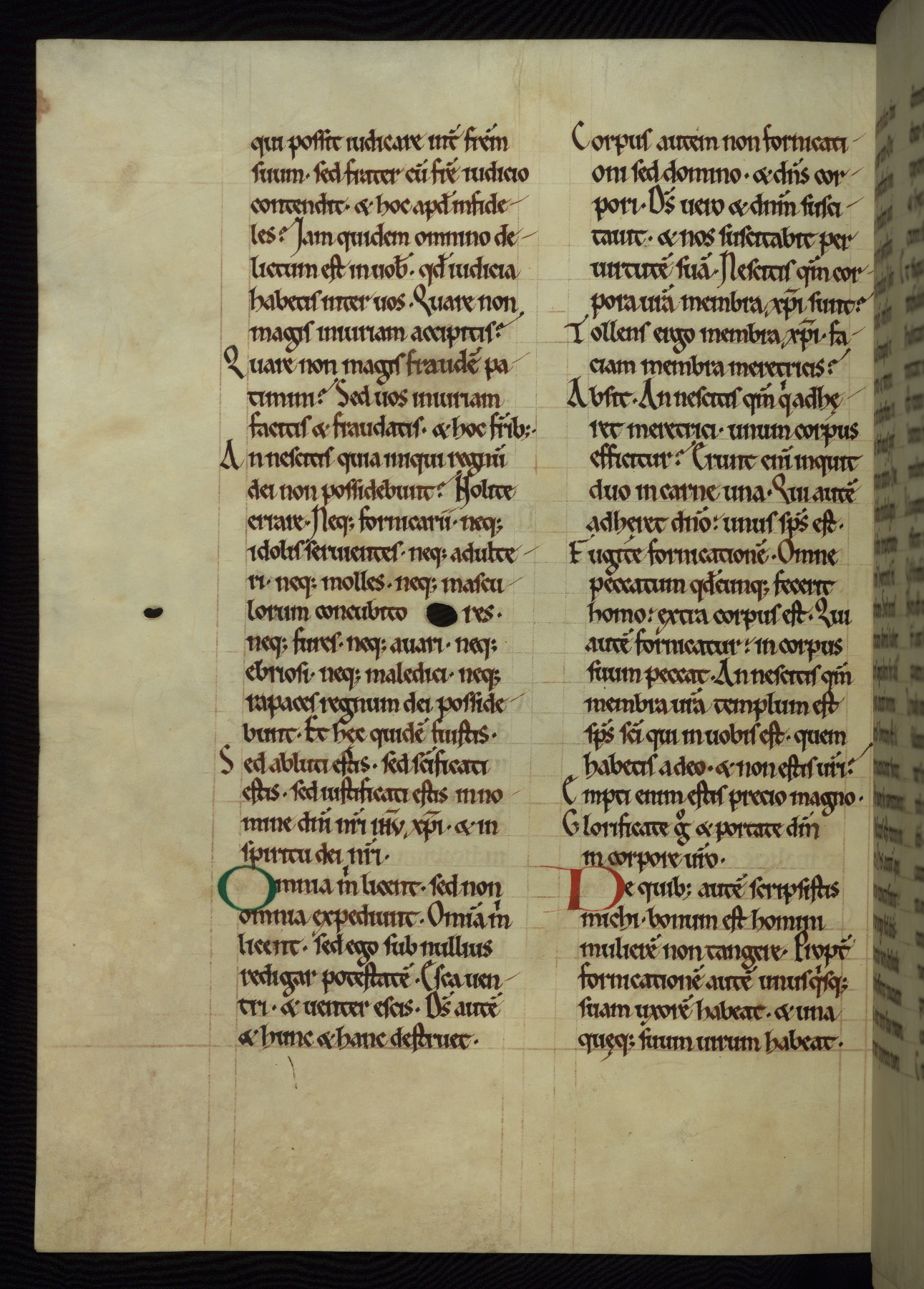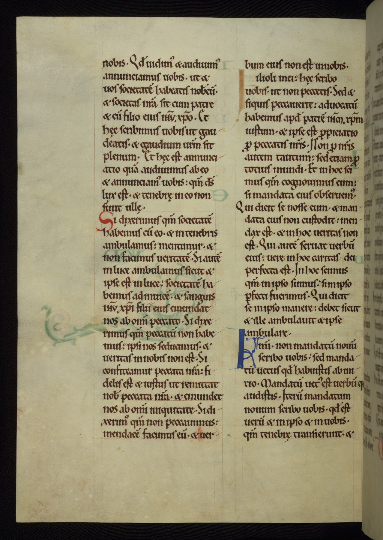This large-format copy of the New Testament was almost certainly created at Rochester Cathedral Priory, England, in the first half of the twelfth century. It was part of a five-volume Bible, only one other volume of which, London, British Library Ms. Royal I.C.VII, has survived. The decorated initials in these manuscripts compare closely with those in other books securely attributed to Rochester. Textually these books are closely related to the Gundulph Bible (San Marino, Huntington Library Ms. HM 62), known to have been produced at Rochester in the second half of the eleventh century. Although neither the Walters' nor the British Library's volume includes an inscription associating this Bible with Rochester, the two medieval catalogs of the Rochester Cathedral library, produced around 1130 and in 1202, contain references to manuscripts that correspond well with them. The book’s large size indicates it that was designed to be read aloud, either during services or at meals in the refectory. Large, fanciful initials filled with succulent foliage, fruit, dragons, animals, and human faces begin each section of the text. Executed in a vibrant palette of red, blue, green, ochre (in place of gold), and yellow, the intricate, dynamic designs capture the essence of Romanesque manuscript illumination. Royal I.C.VII also includes four historiated initials (for the books of Joshua, I Samuel, 2 Samuel, and 2 Kings). Although the Bible was made at Rochester, the pre-Gothic script of W.18 in particular is extremely close to that practiced at nearby Canterbury at the time.