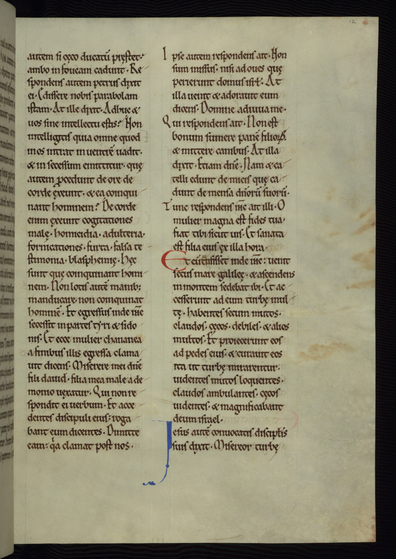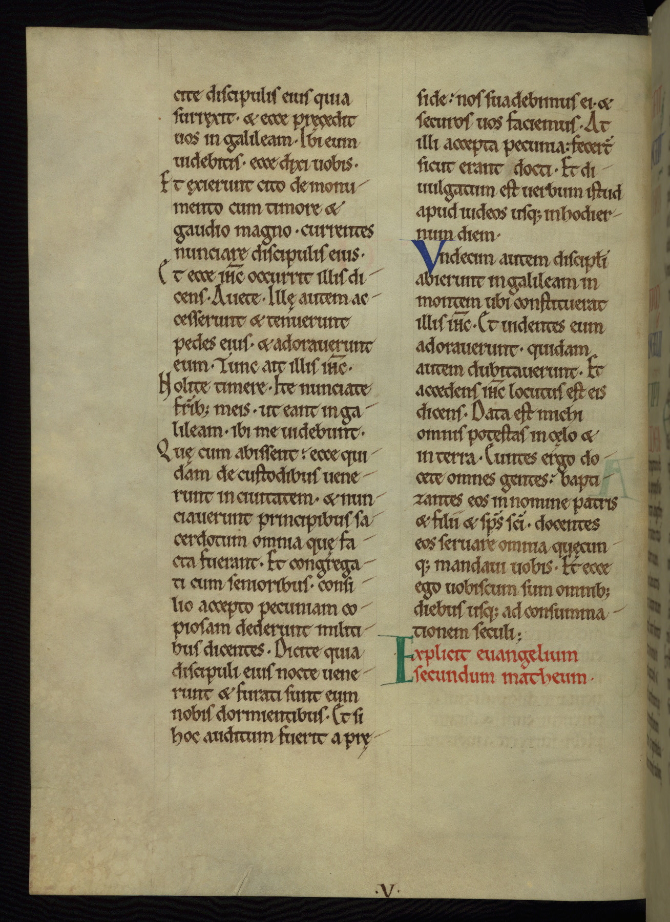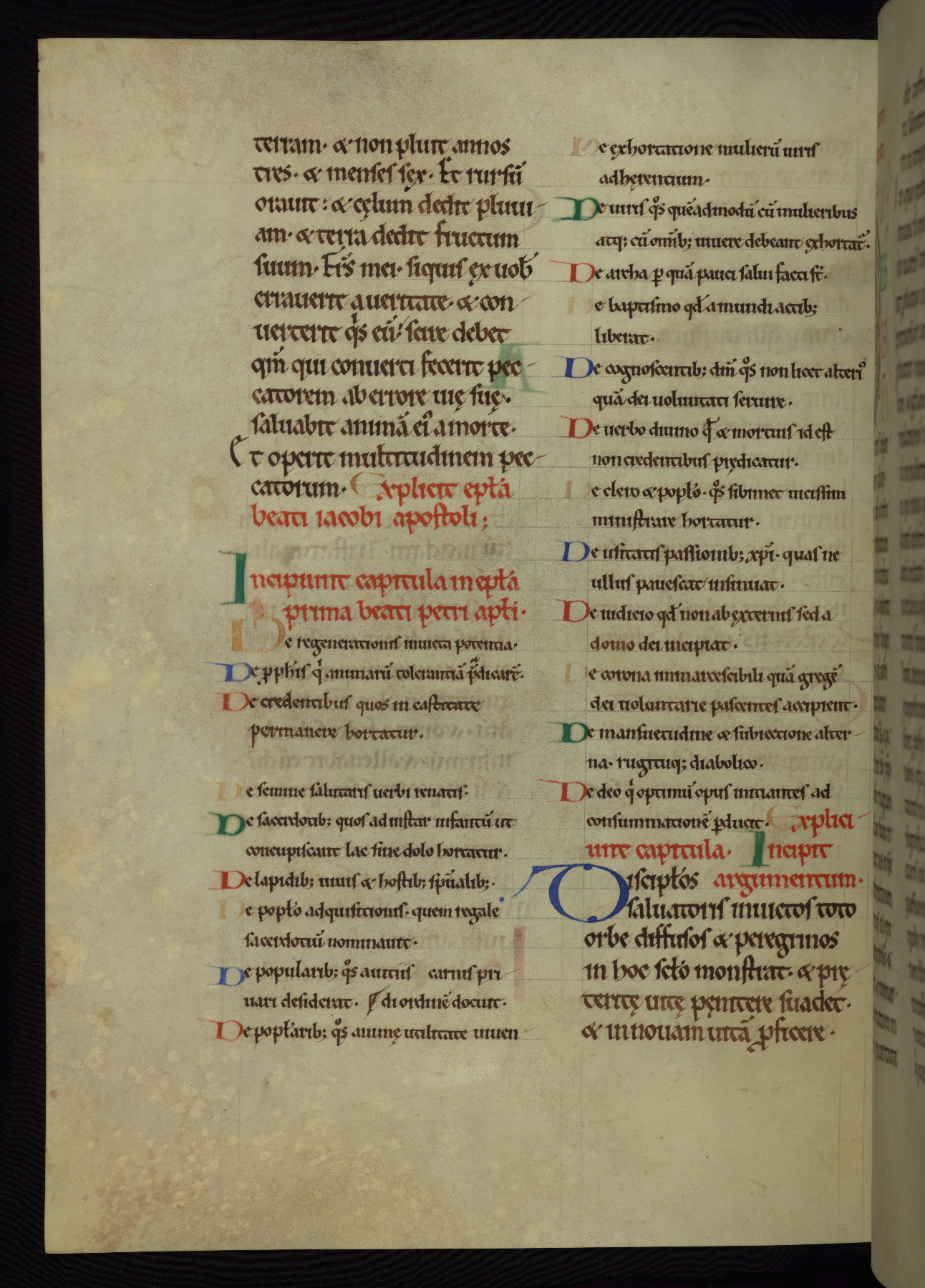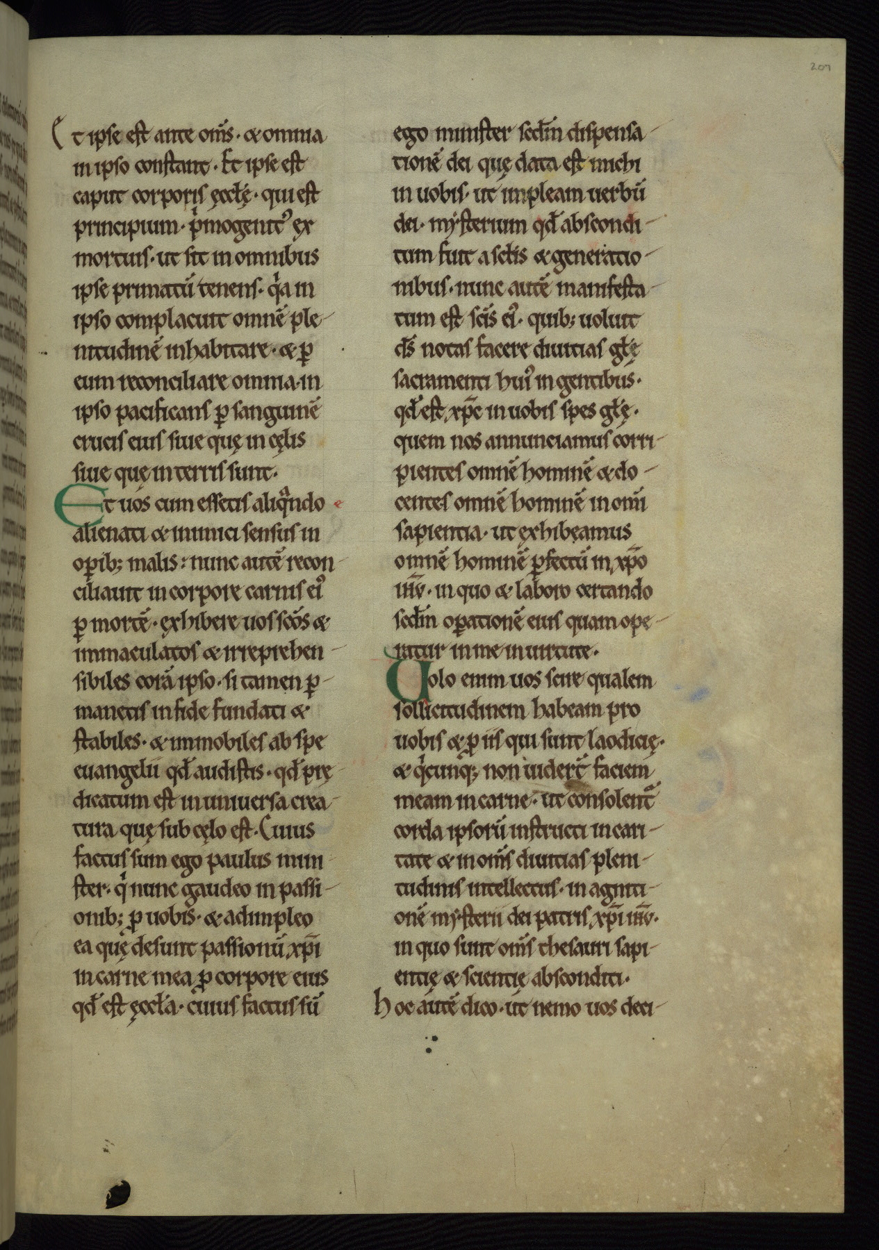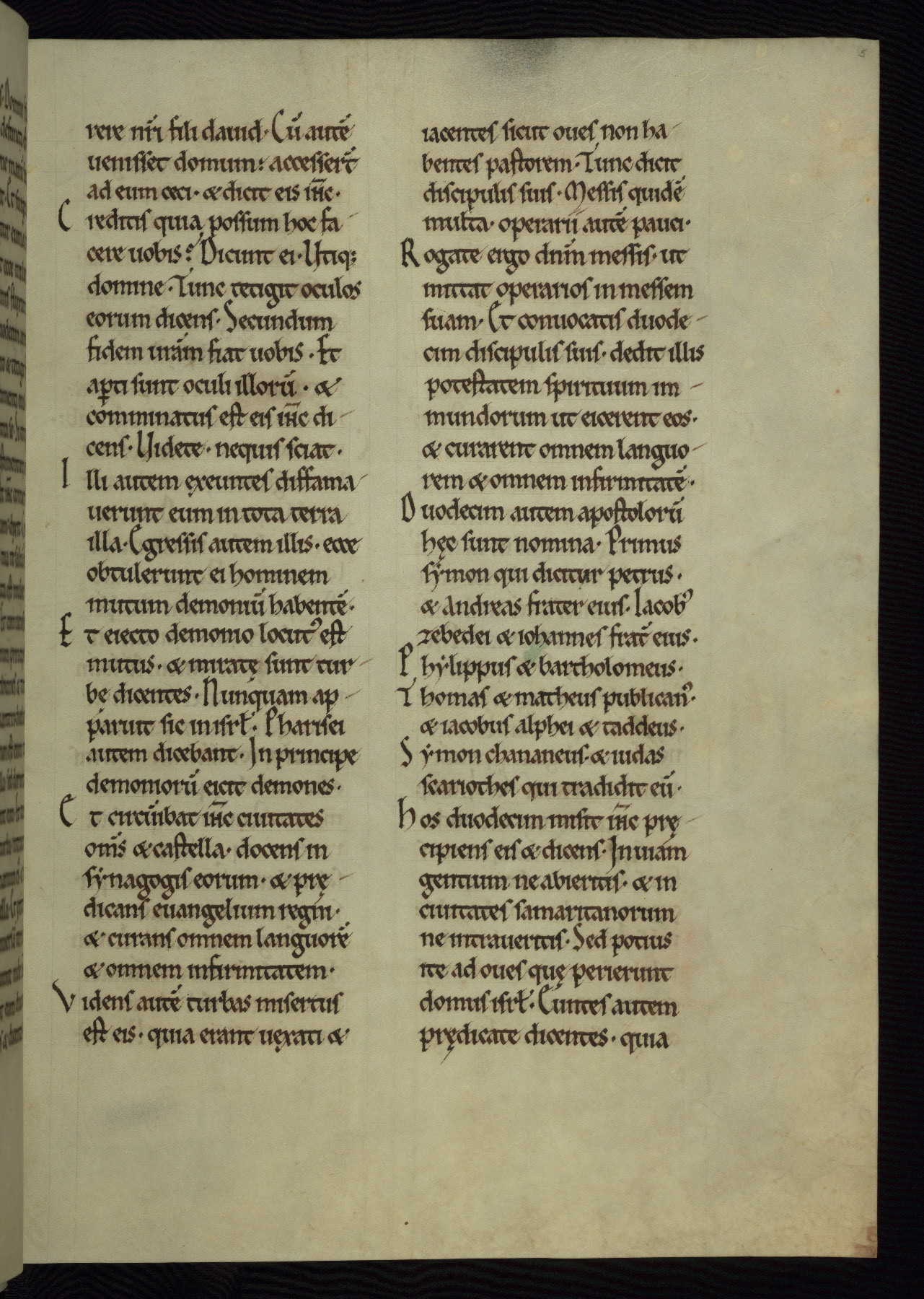 This large-format copy of the New Testament was almost certainly created at Rochester Cathedral Priory, England, in the first half of the twelfth century. It was part of a five-volume Bible, only one other volume of which, London, British Library Ms. Royal I.C.VII, has survived. The decorated initials in these manuscripts compare closely with those in other books securely attributed to Rochester. Textually these books are closely related to the Gundulph Bible (San Marino, Huntington Library Ms. HM 62), known to have been produced at Rochester in the second half of the eleventh century. Although neither the Walters' nor the British Library's volume includes an inscription associating this Bible with Rochester, the two medieval catalogs of the Rochester Cathedral library, produced around 1130 and in 1202, contain references to manuscripts that correspond well with them. The book’s large size indicates it that was designed to be read aloud, either during services or at meals in the refectory. Large, fanciful initials filled with succulent foliage, fruit, dragons, animals, and human faces begin each section of the text. Executed in a vibrant palette of red, blue, green, ochre (in place of gold), and yellow, the intricate, dynamic designs capture the essence of Romanesque manuscript illumination. Royal I.C.VII also includes four historiated initials (for the books of Joshua, I Samuel, 2 Samuel, and 2 Kings). Although the Bible was made at Rochester, the pre-Gothic script of W.18 in particular is extremely close to that practiced at nearby Canterbury at the time.