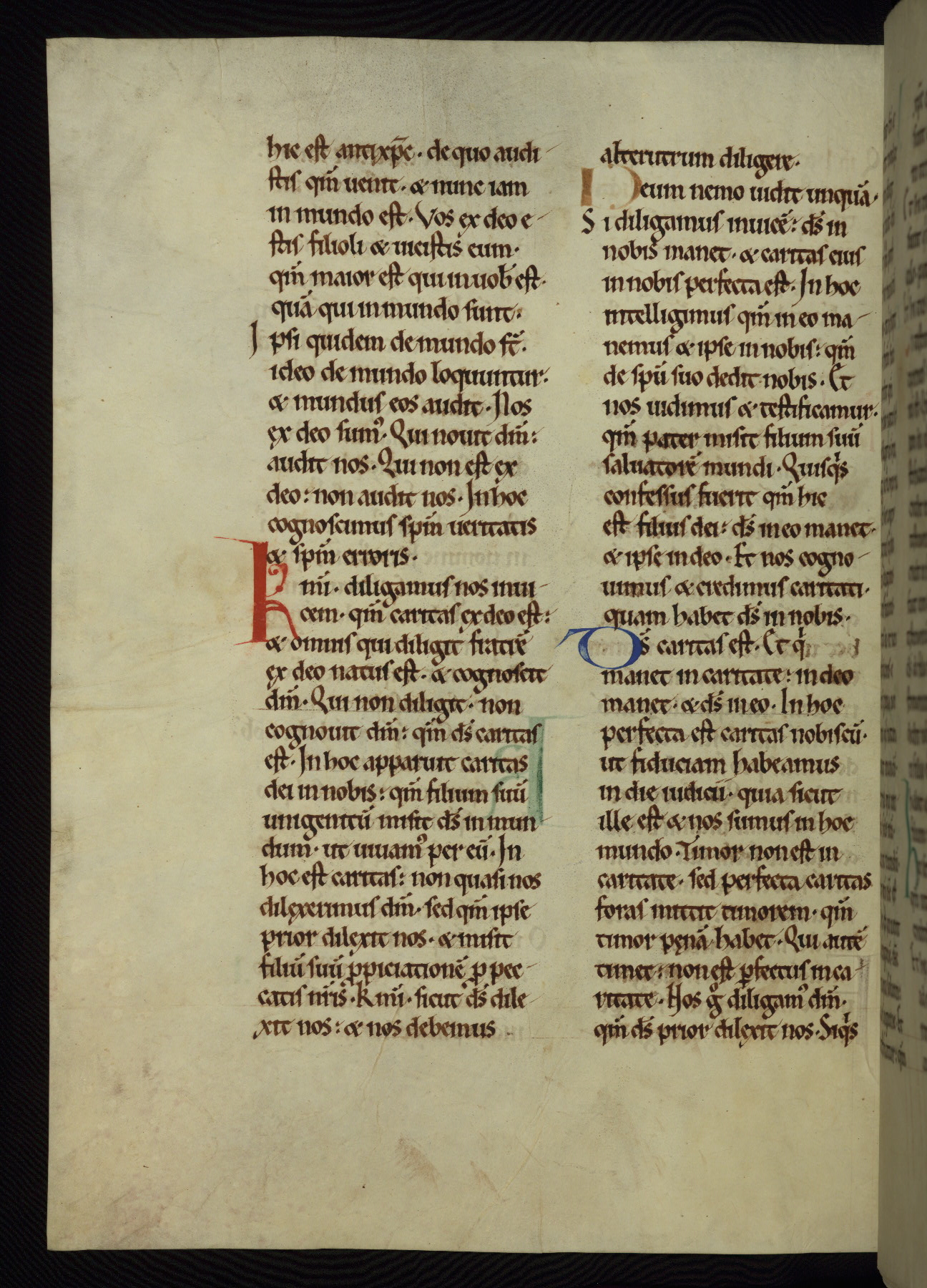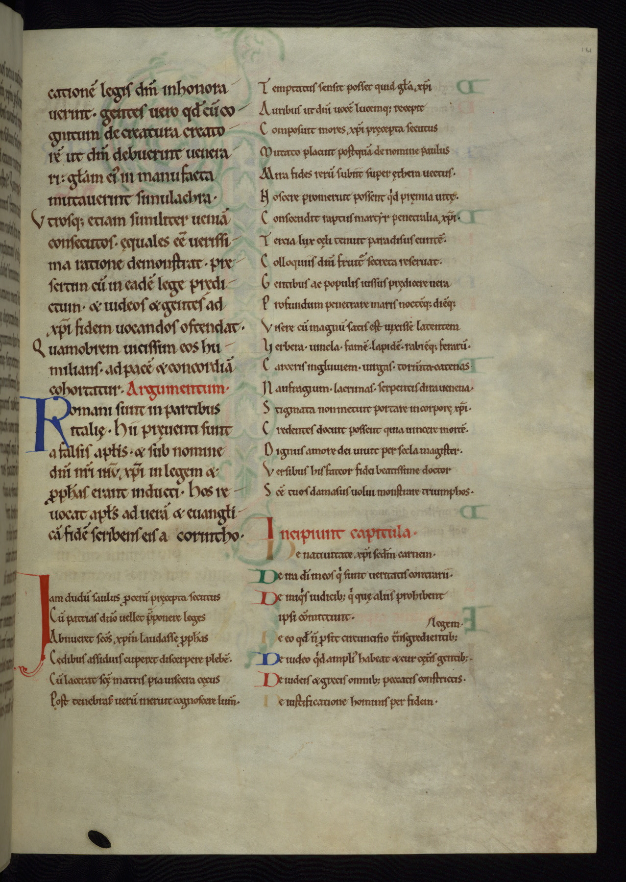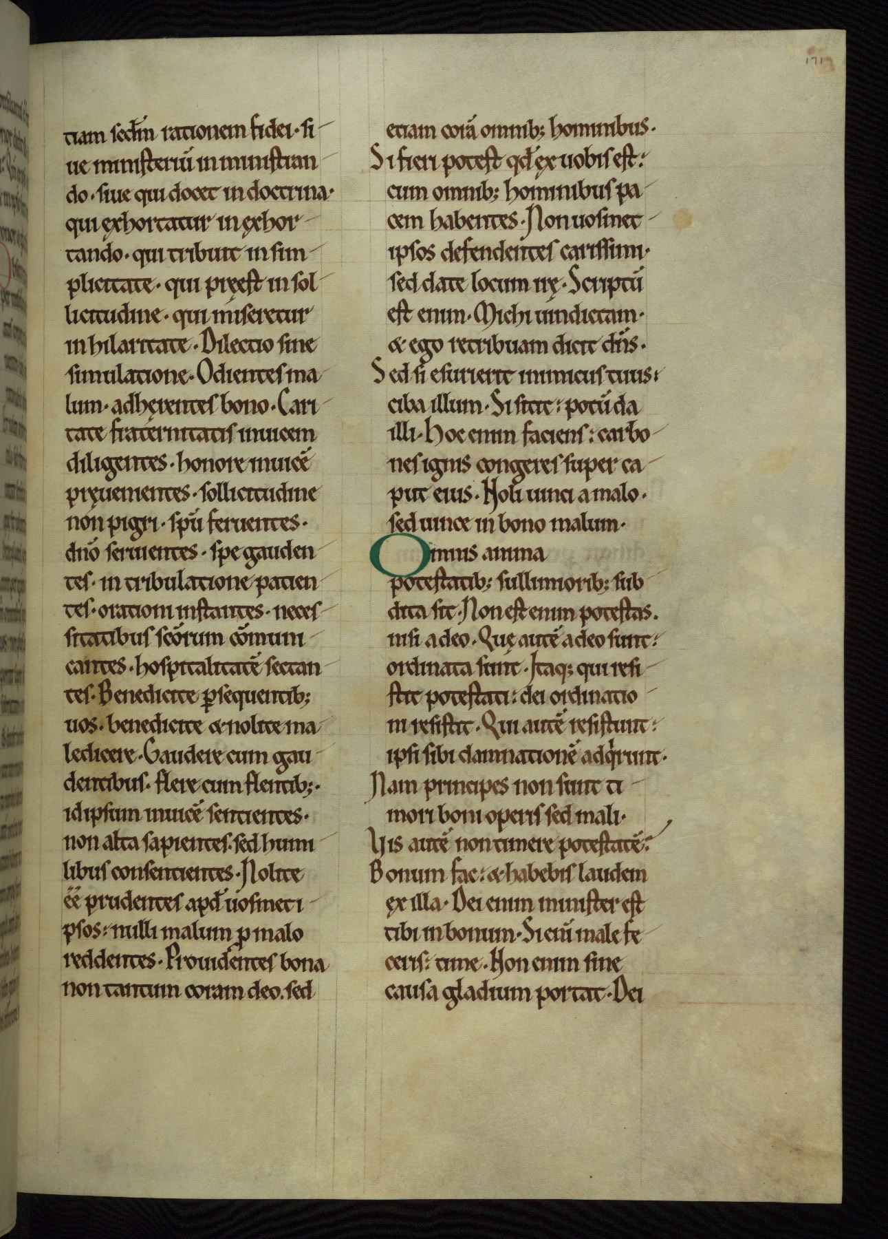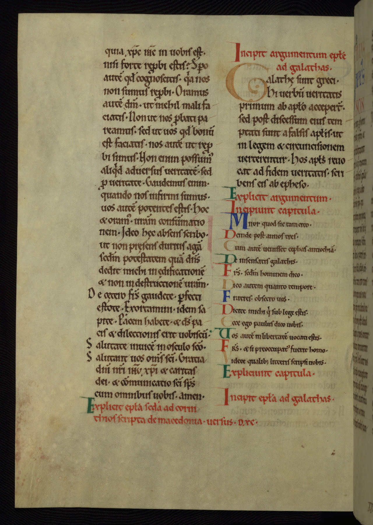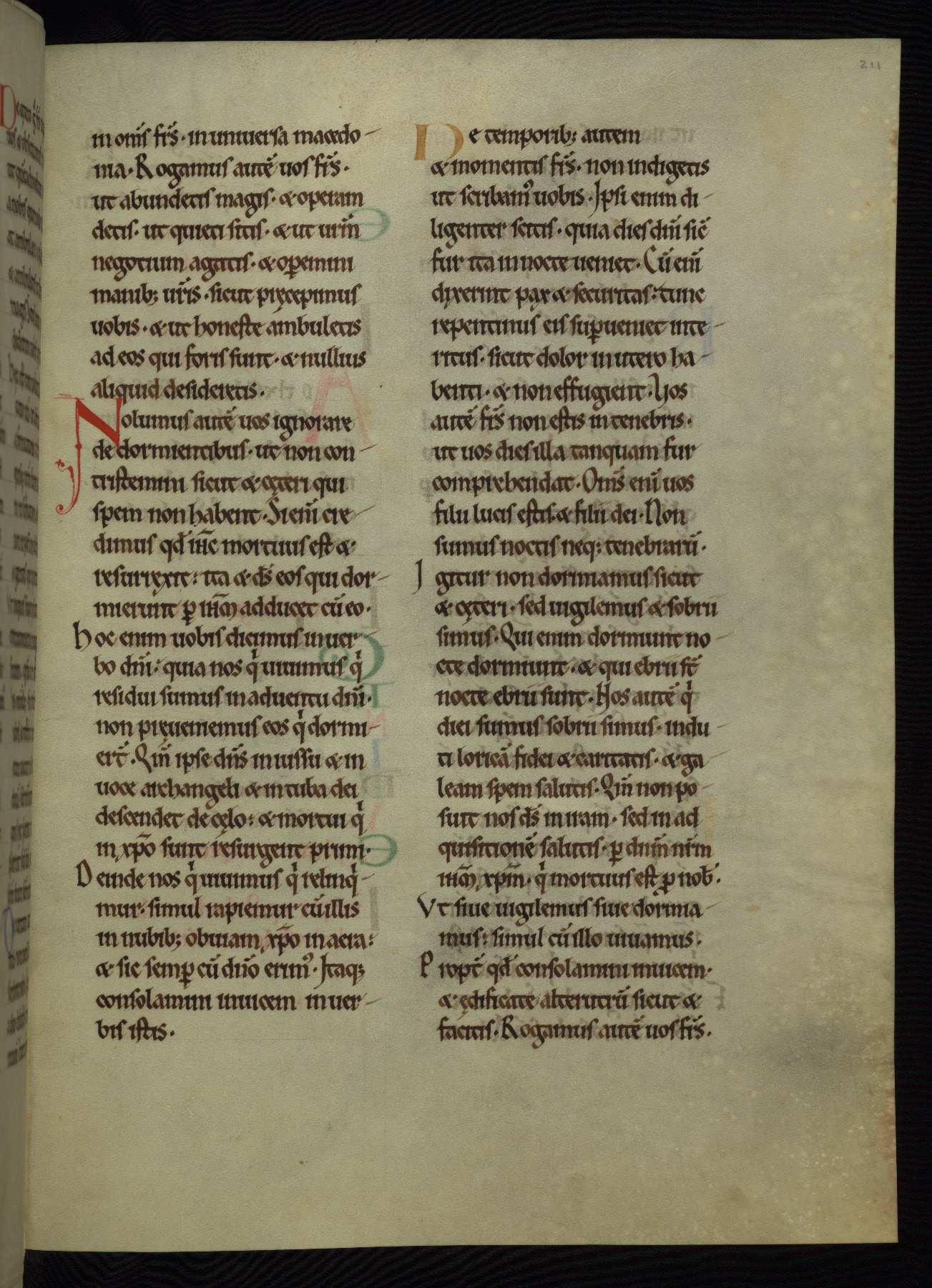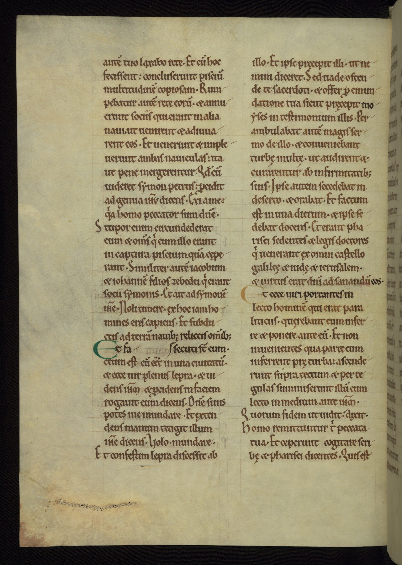 This large-format copy of the New Testament was almost certainly created at Rochester Cathedral Priory, England, in the first half of the twelfth century. It was part of a five-volume Bible, only one other volume of which, London, British Library Ms. Royal I.C.VII, has survived. The decorated initials in these manuscripts compare closely with those in other books securely attributed to Rochester. Textually these books are closely related to the Gundulph Bible (San Marino, Huntington Library Ms. HM 62), known to have been produced at Rochester in the second half of the eleventh century. Although neither the Walters' nor the British Library's volume includes an inscription associating this Bible with Rochester, the two medieval catalogs of the Rochester Cathedral library, produced around 1130 and in 1202, contain references to manuscripts that correspond well with them. The book’s large size indicates it that was designed to be read aloud, either during services or at meals in the refectory. Large, fanciful initials filled with succulent foliage, fruit, dragons, animals, and human faces begin each section of the text. Executed in a vibrant palette of red, blue, green, ochre (in place of gold), and yellow, the intricate, dynamic designs capture the essence of Romanesque manuscript illumination. Royal I.C.VII also includes four historiated initials (for the books of Joshua, I Samuel, 2 Samuel, and 2 Kings). Although the Bible was made at Rochester, the pre-Gothic script of W.18 in particular is extremely close to that practiced at nearby Canterbury at the time.