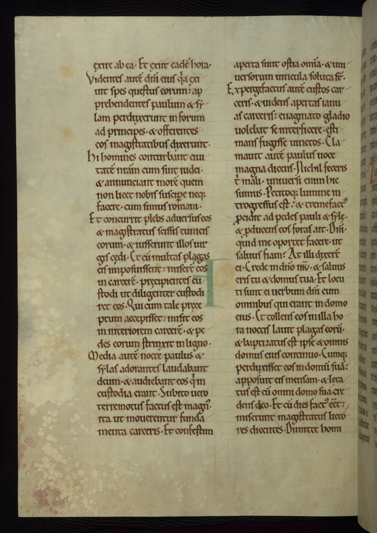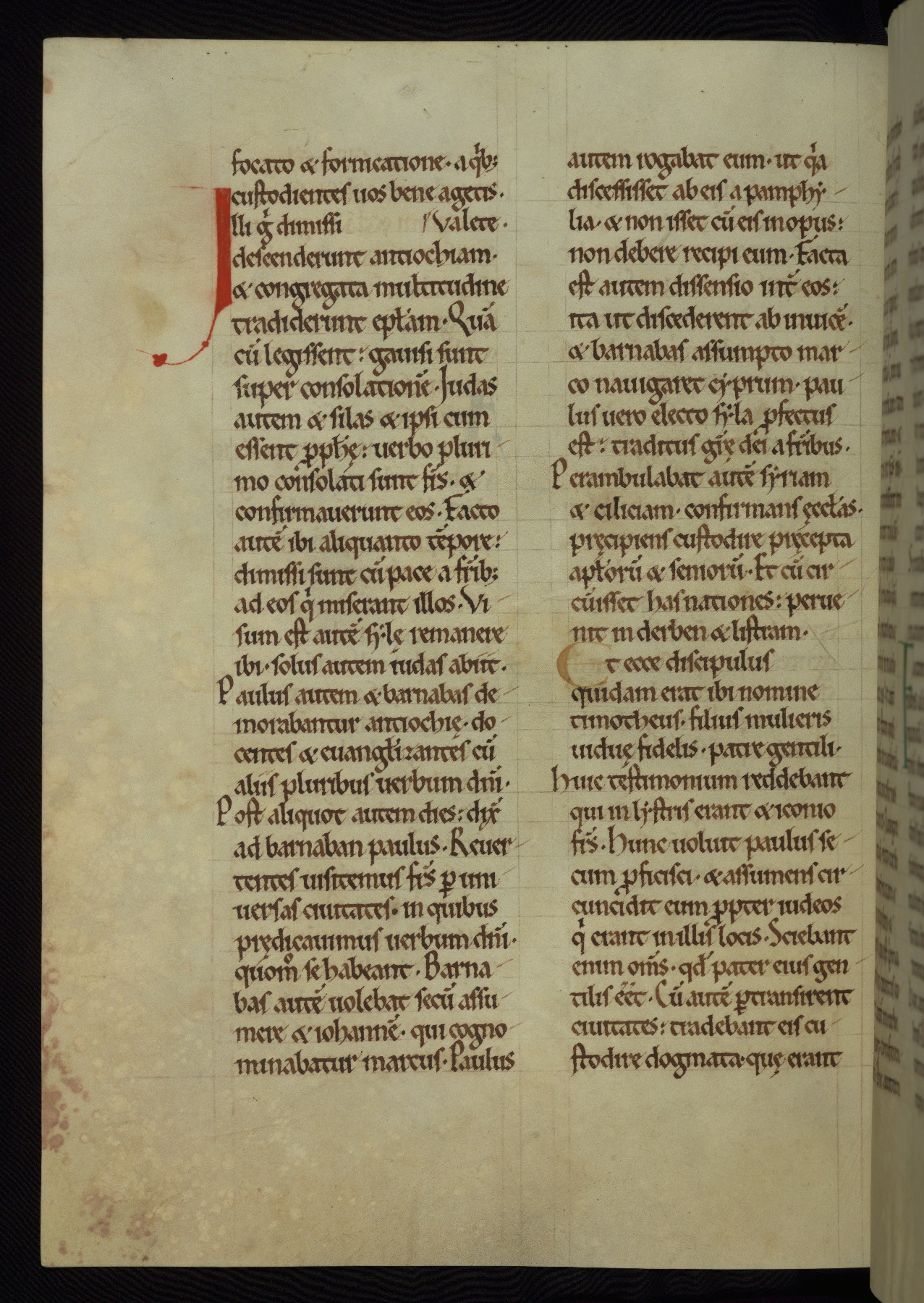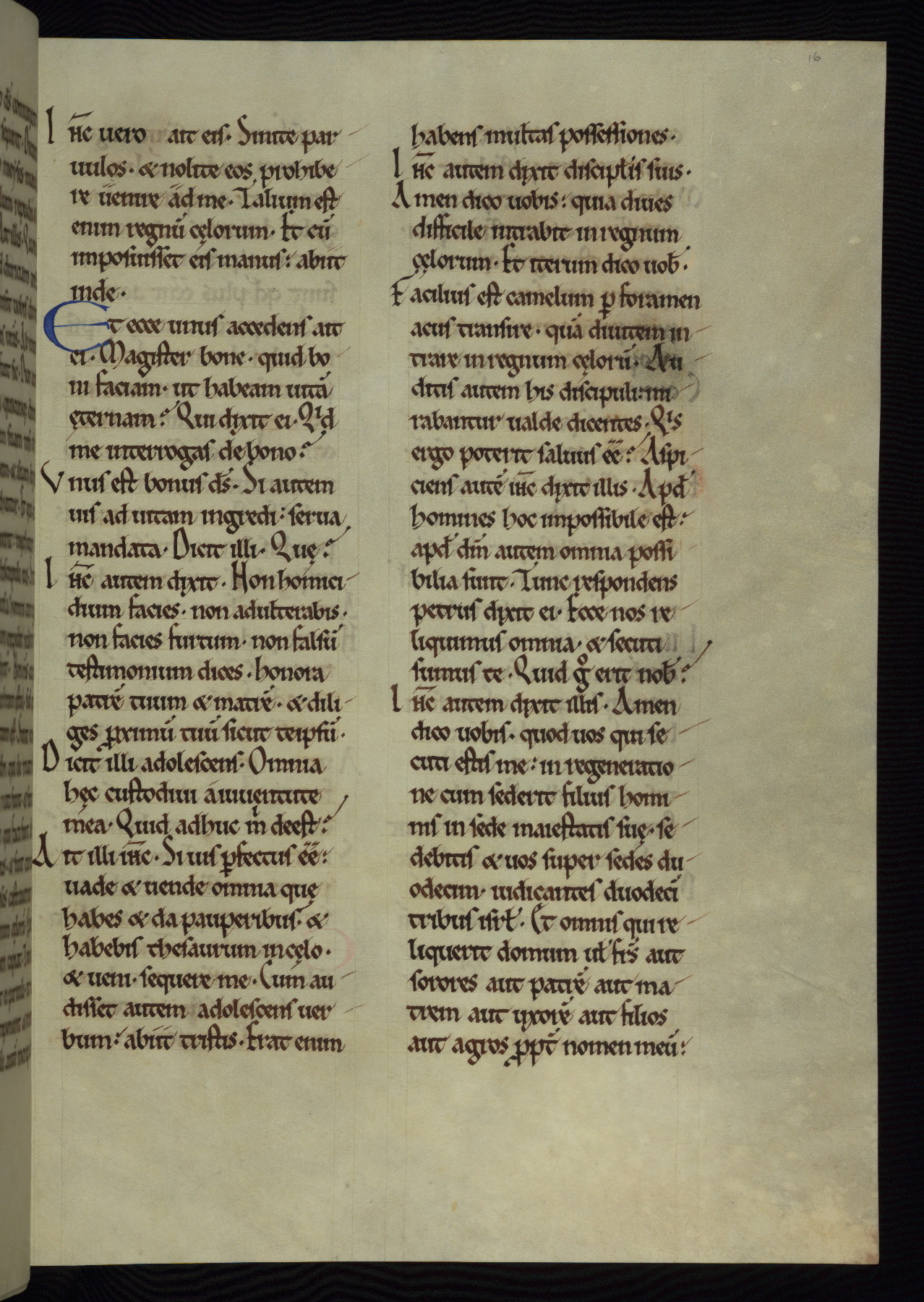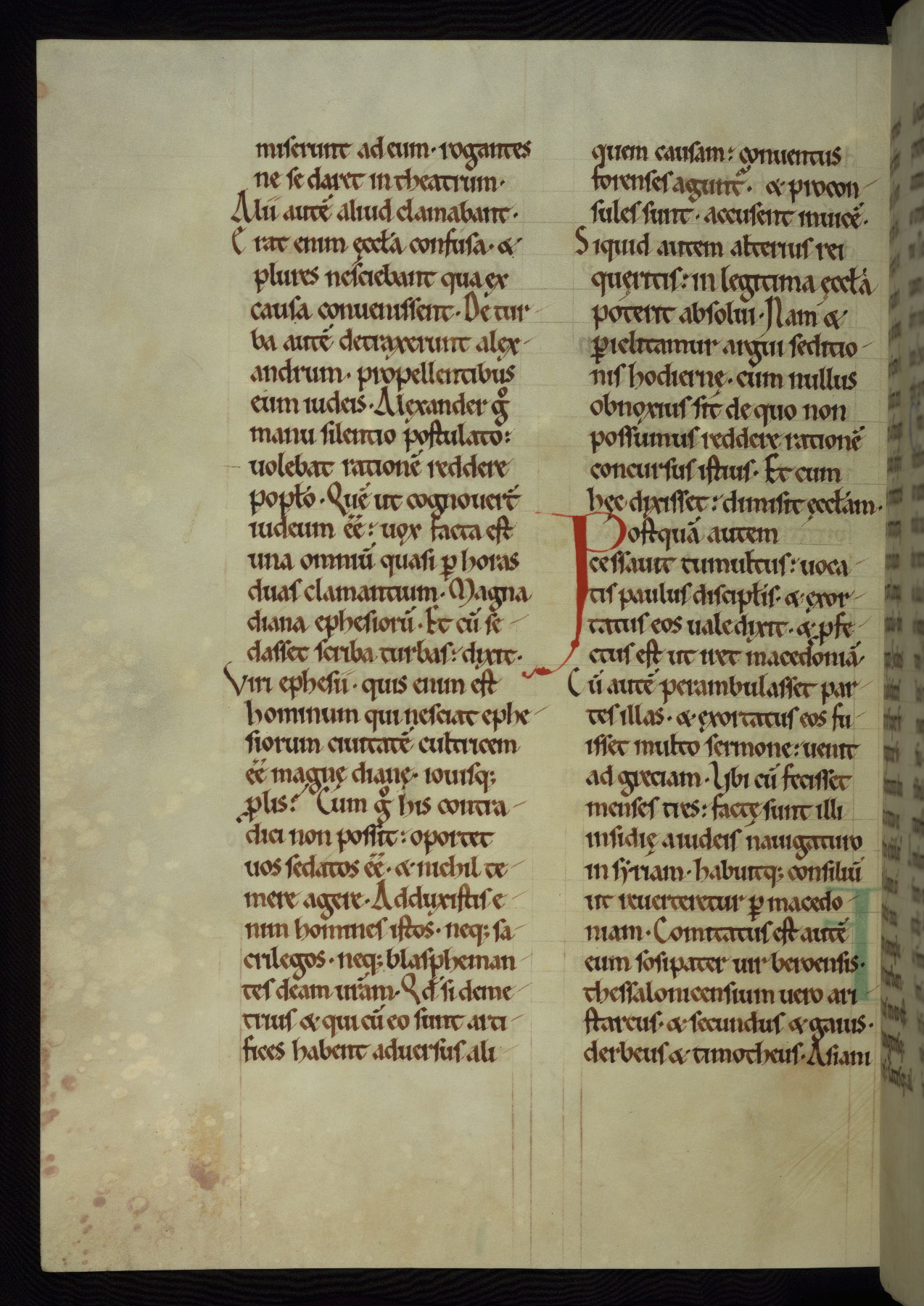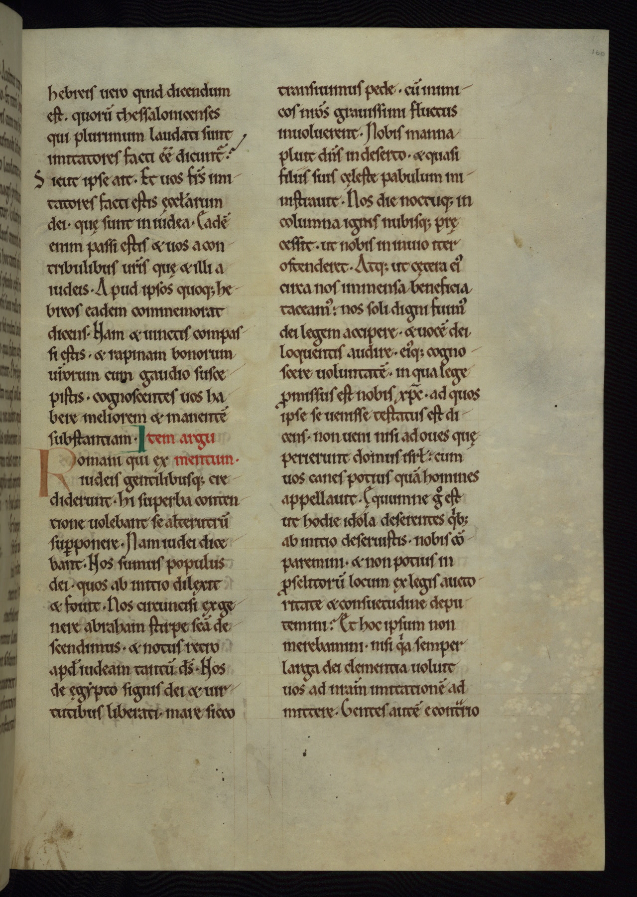 This large-format copy of the New Testament was almost certainly created at Rochester Cathedral Priory, England, in the first half of the twelfth century. It was part of a five-volume Bible, only one other volume of which, London, British Library Ms. Royal I.C.VII, has survived. The decorated initials in these manuscripts compare closely with those in other books securely attributed to Rochester. Textually these books are closely related to the Gundulph Bible (San Marino, Huntington Library Ms. HM 62), known to have been produced at Rochester in the second half of the eleventh century. Although neither the Walters' nor the British Library's volume includes an inscription associating this Bible with Rochester, the two medieval catalogs of the Rochester Cathedral library, produced around 1130 and in 1202, contain references to manuscripts that correspond well with them. The book’s large size indicates it that was designed to be read aloud, either during services or at meals in the refectory. Large, fanciful initials filled with succulent foliage, fruit, dragons, animals, and human faces begin each section of the text. Executed in a vibrant palette of red, blue, green, ochre (in place of gold), and yellow, the intricate, dynamic designs capture the essence of Romanesque manuscript illumination. Royal I.C.VII also includes four historiated initials (for the books of Joshua, I Samuel, 2 Samuel, and 2 Kings). Although the Bible was made at Rochester, the pre-Gothic script of W.18 in particular is extremely close to that practiced at nearby Canterbury at the time.