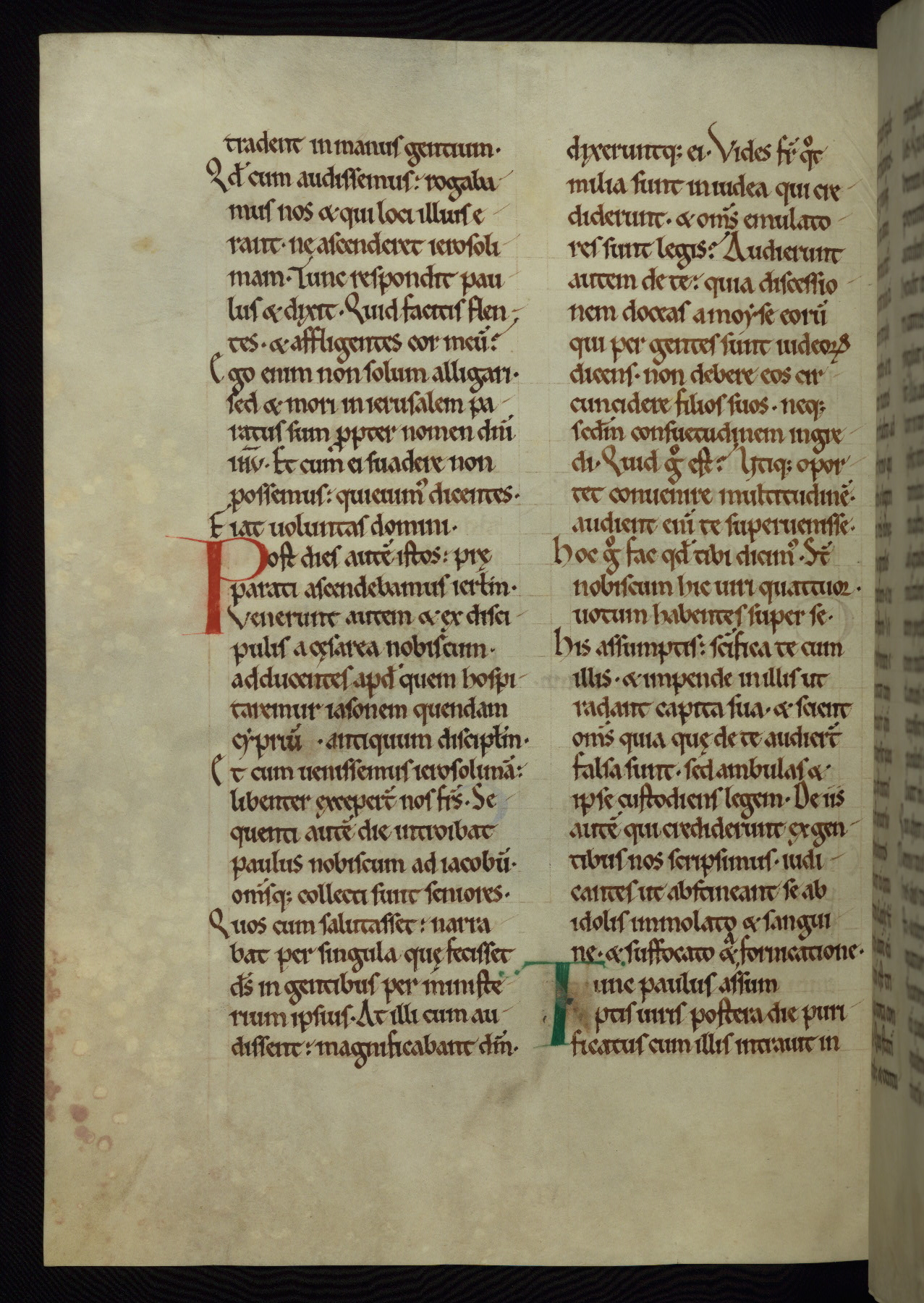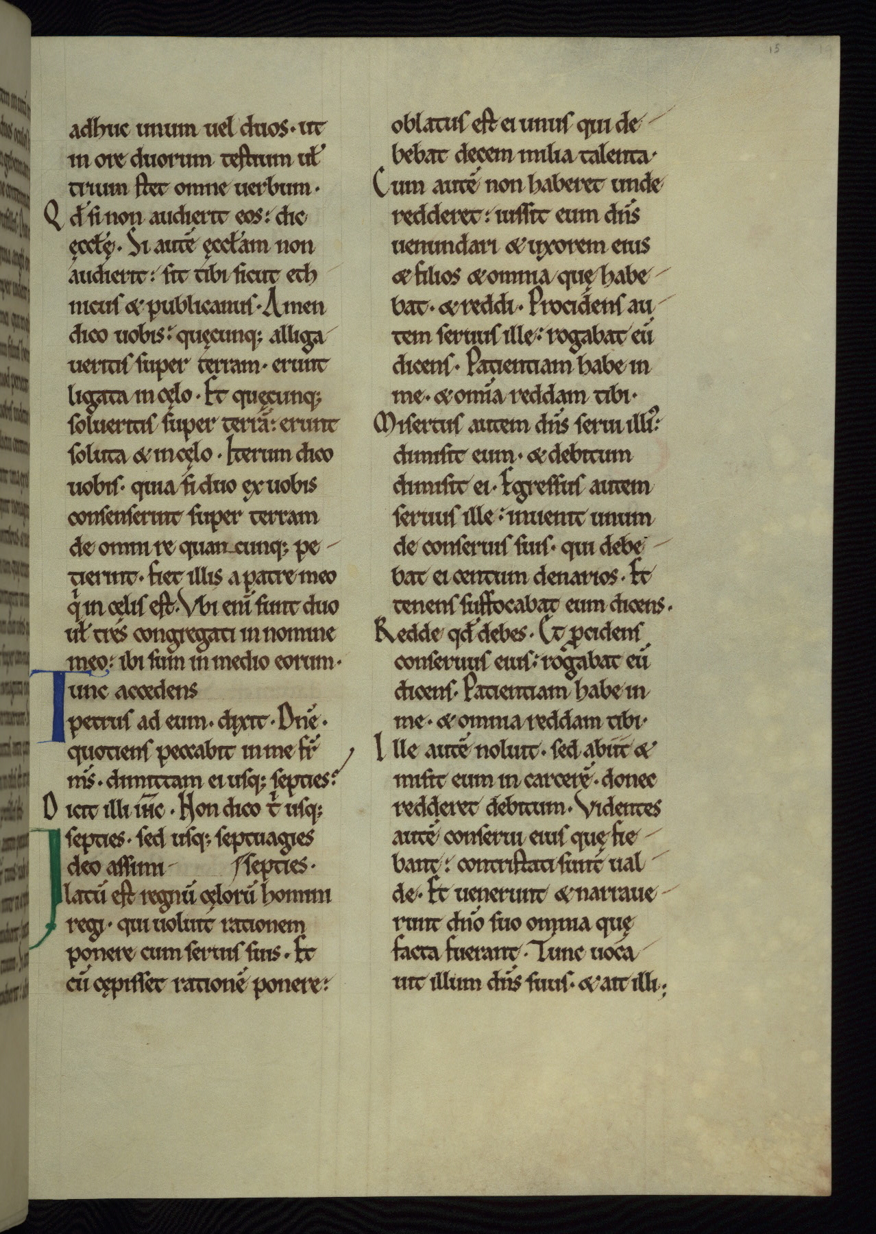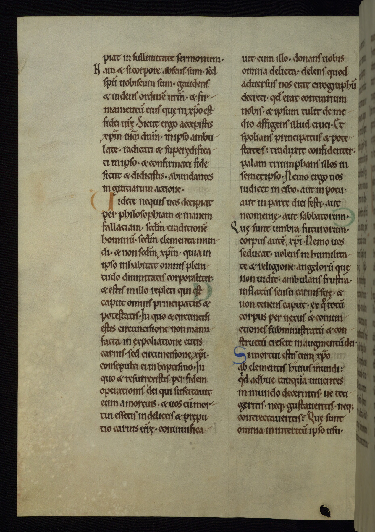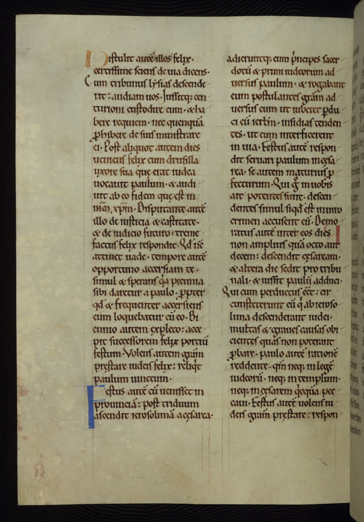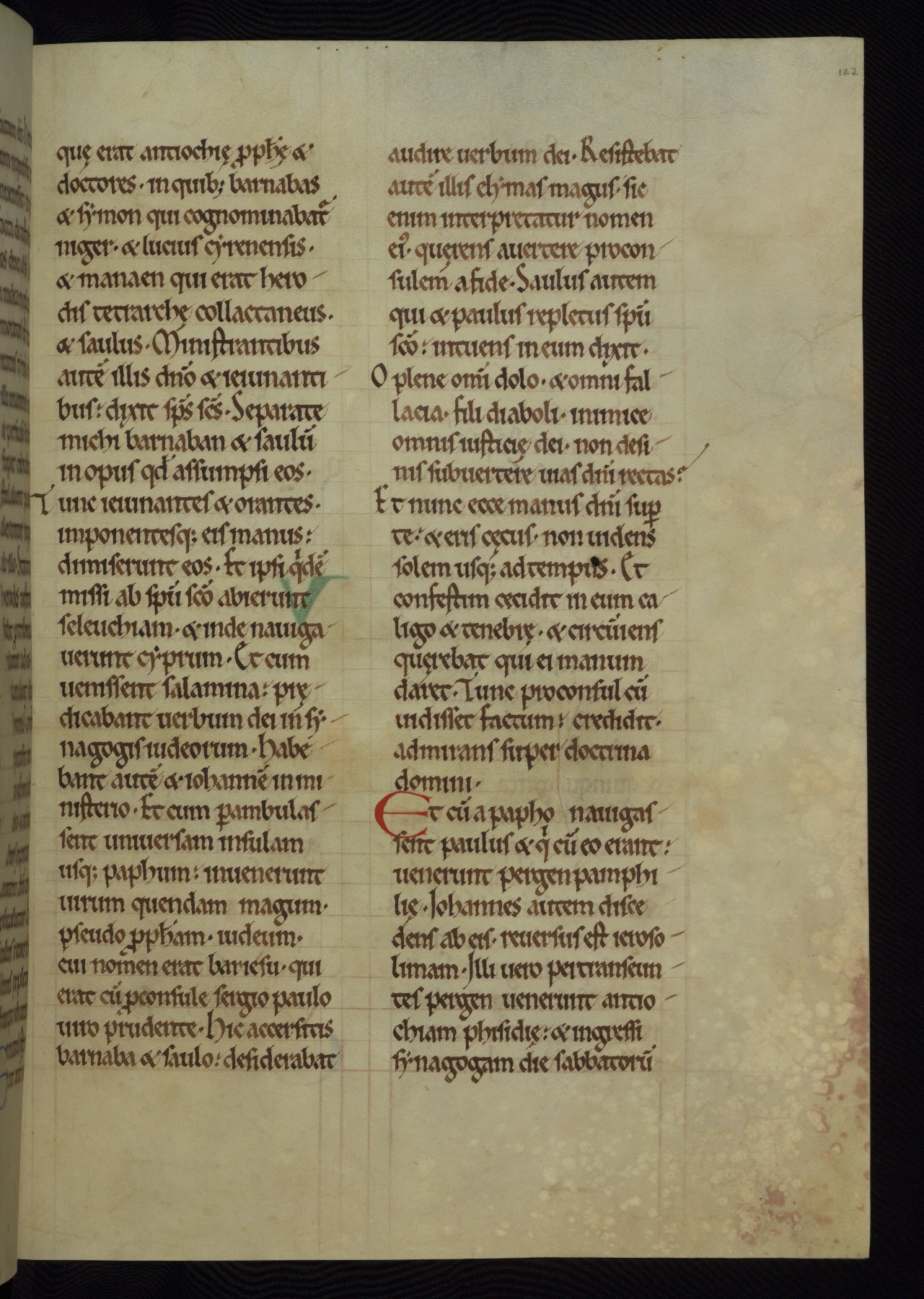 This large-format copy of the New Testament was almost certainly created at Rochester Cathedral Priory, England, in the first half of the twelfth century. It was part of a five-volume Bible, only one other volume of which, London, British Library Ms. Royal I.C.VII, has survived. The decorated initials in these manuscripts compare closely with those in other books securely attributed to Rochester. Textually these books are closely related to the Gundulph Bible (San Marino, Huntington Library Ms. HM 62), known to have been produced at Rochester in the second half of the eleventh century. Although neither the Walters' nor the British Library's volume includes an inscription associating this Bible with Rochester, the two medieval catalogs of the Rochester Cathedral library, produced around 1130 and in 1202, contain references to manuscripts that correspond well with them. The book’s large size indicates it that was designed to be read aloud, either during services or at meals in the refectory. Large, fanciful initials filled with succulent foliage, fruit, dragons, animals, and human faces begin each section of the text. Executed in a vibrant palette of red, blue, green, ochre (in place of gold), and yellow, the intricate, dynamic designs capture the essence of Romanesque manuscript illumination. Royal I.C.VII also includes four historiated initials (for the books of Joshua, I Samuel, 2 Samuel, and 2 Kings). Although the Bible was made at Rochester, the pre-Gothic script of W.18 in particular is extremely close to that practiced at nearby Canterbury at the time.