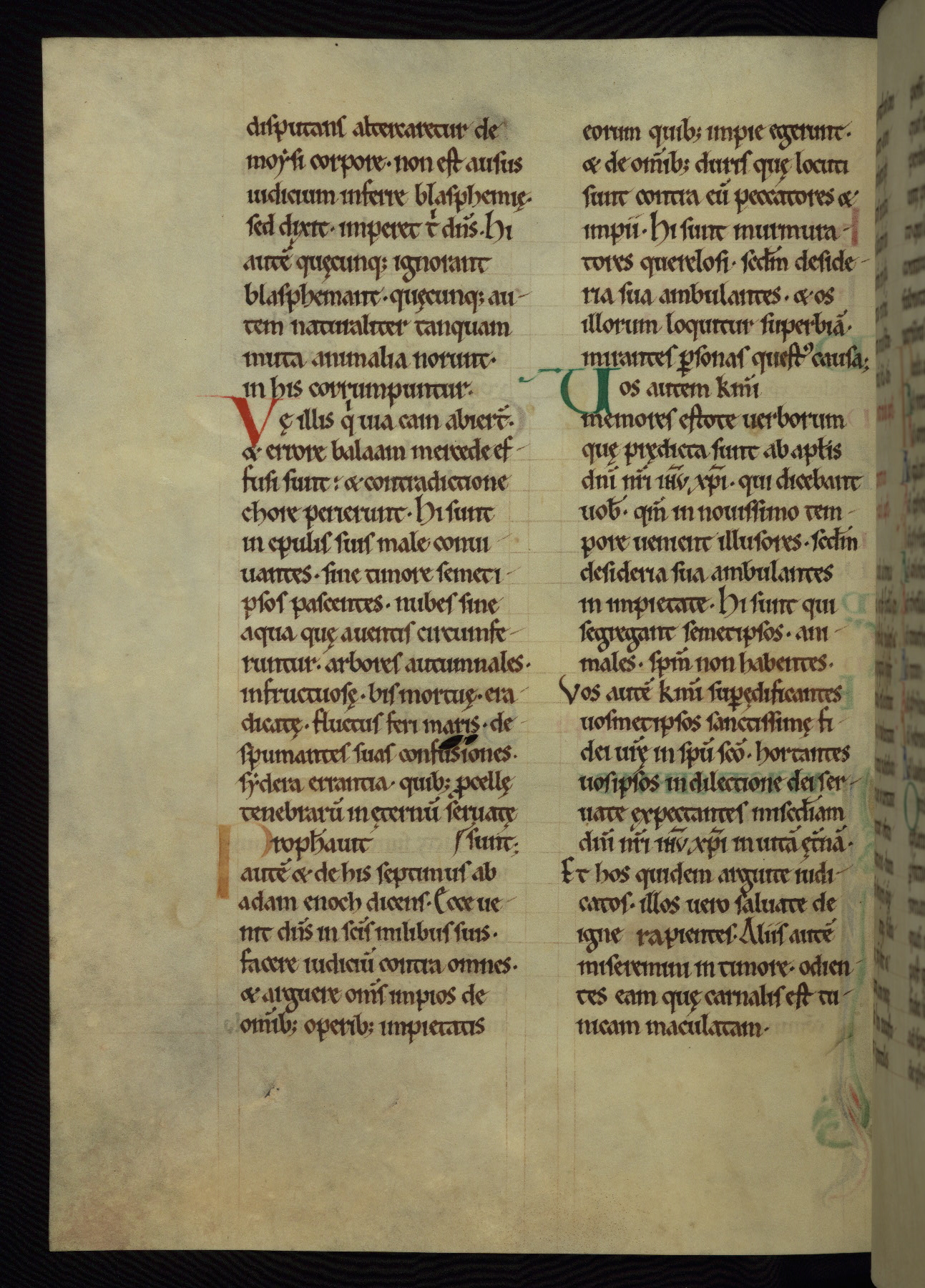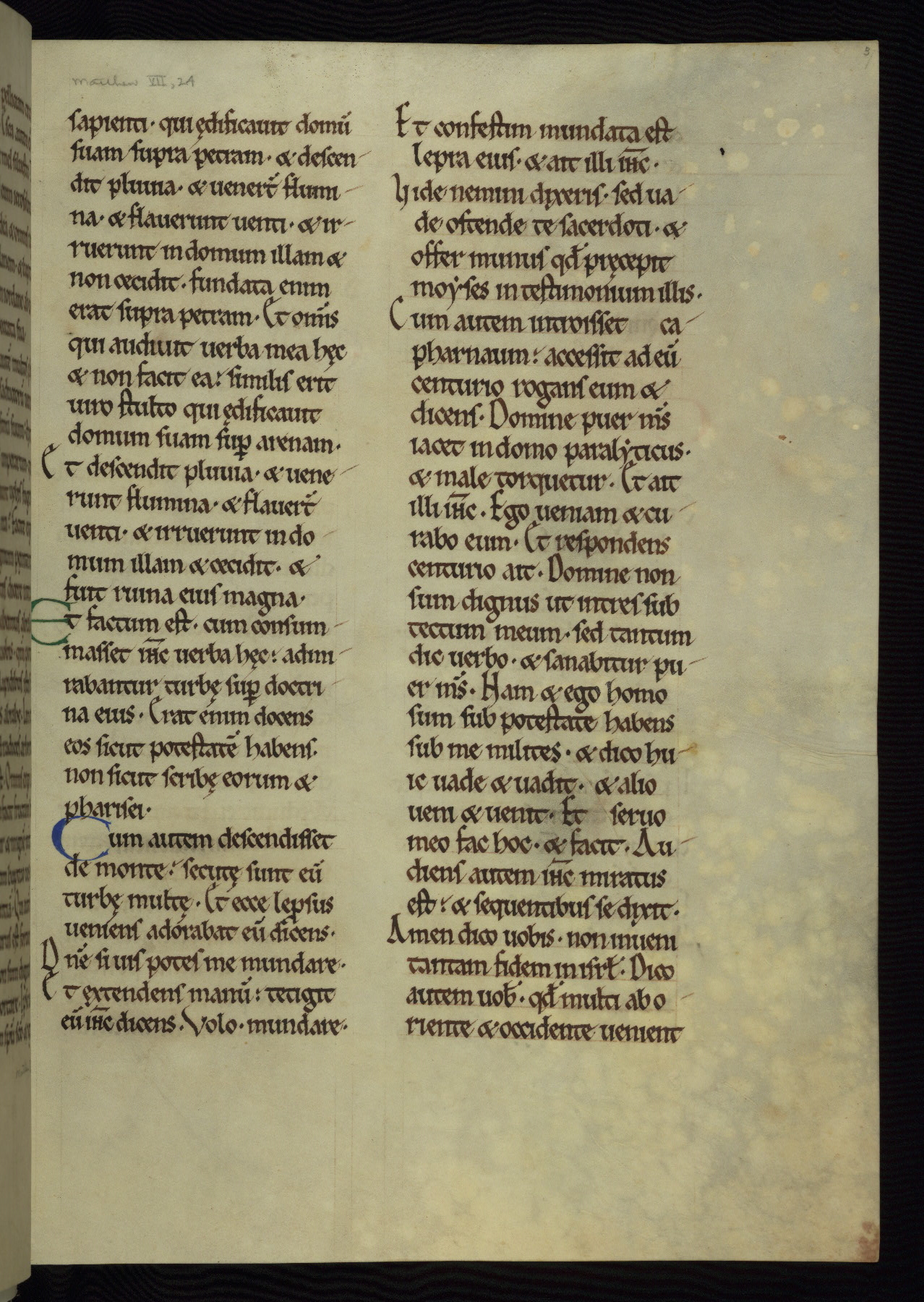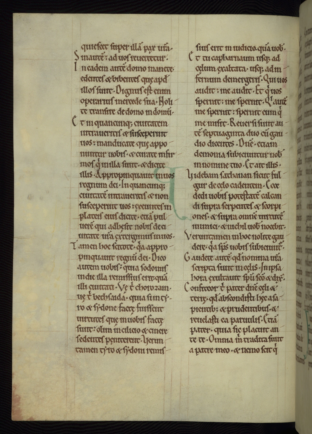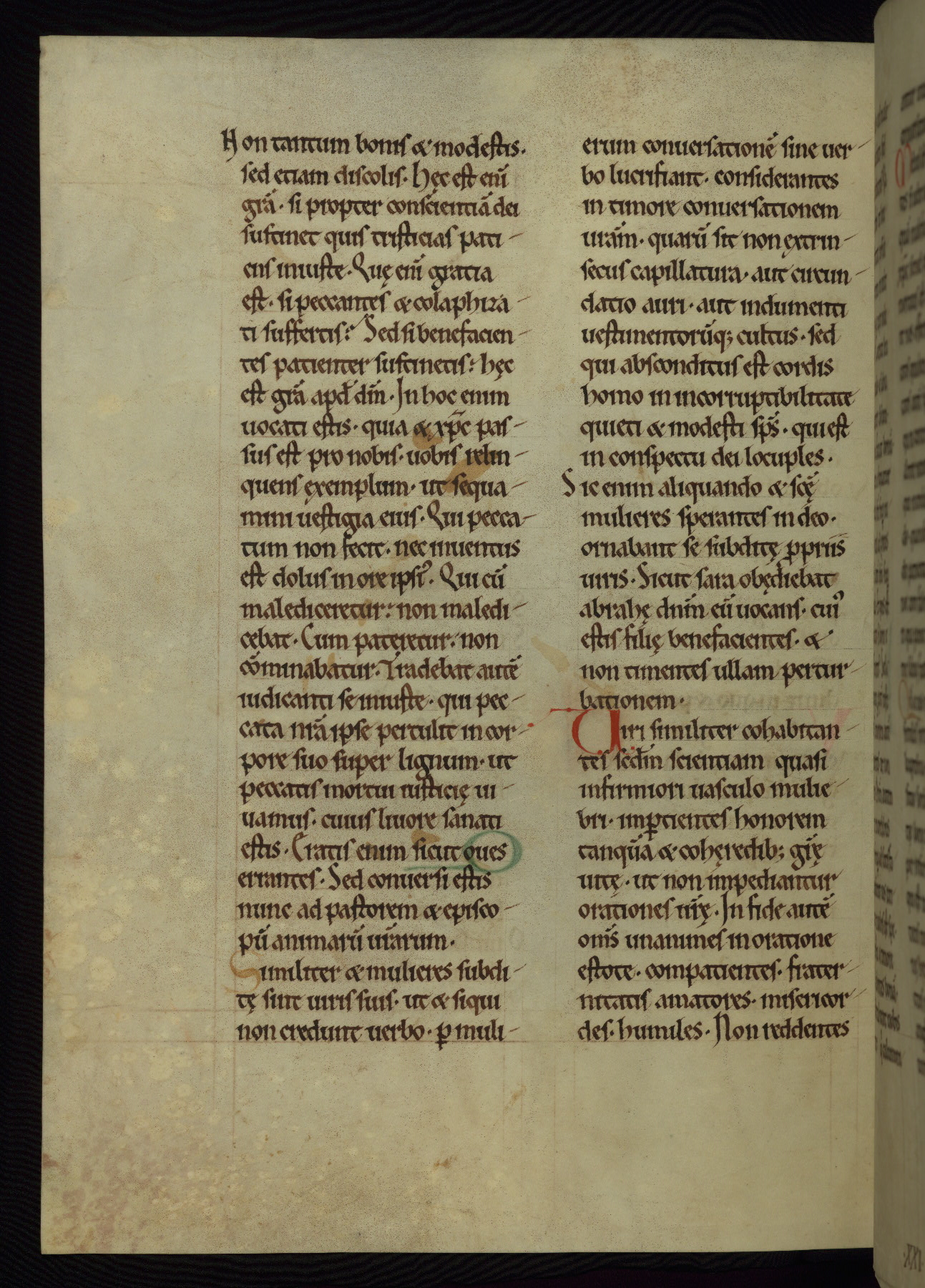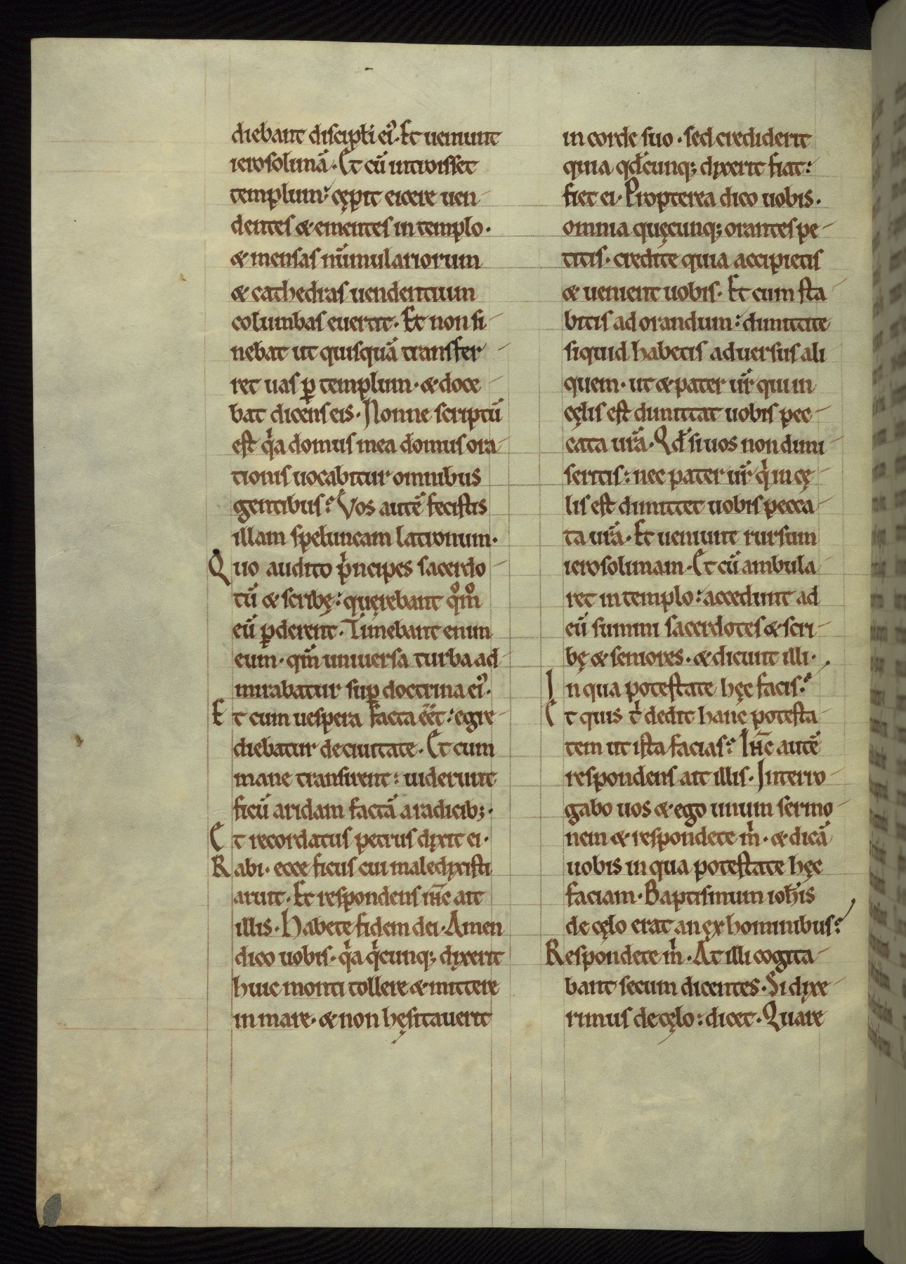 This large-format copy of the New Testament was almost certainly created at Rochester Cathedral Priory, England, in the first half of the twelfth century. It was part of a five-volume Bible, only one other volume of which, London, British Library Ms. Royal I.C.VII, has survived. The decorated initials in these manuscripts compare closely with those in other books securely attributed to Rochester. Textually these books are closely related to the Gundulph Bible (San Marino, Huntington Library Ms. HM 62), known to have been produced at Rochester in the second half of the eleventh century. Although neither the Walters' nor the British Library's volume includes an inscription associating this Bible with Rochester, the two medieval catalogs of the Rochester Cathedral library, produced around 1130 and in 1202, contain references to manuscripts that correspond well with them. The book’s large size indicates it that was designed to be read aloud, either during services or at meals in the refectory. Large, fanciful initials filled with succulent foliage, fruit, dragons, animals, and human faces begin each section of the text. Executed in a vibrant palette of red, blue, green, ochre (in place of gold), and yellow, the intricate, dynamic designs capture the essence of Romanesque manuscript illumination. Royal I.C.VII also includes four historiated initials (for the books of Joshua, I Samuel, 2 Samuel, and 2 Kings). Although the Bible was made at Rochester, the pre-Gothic script of W.18 in particular is extremely close to that practiced at nearby Canterbury at the time.