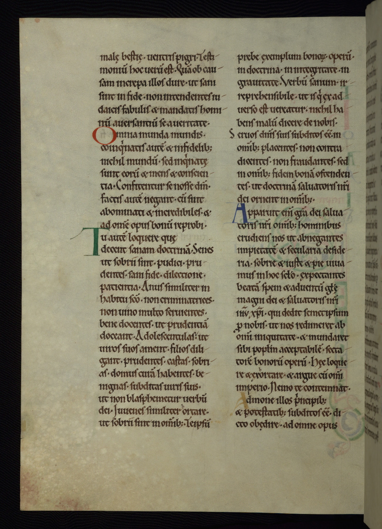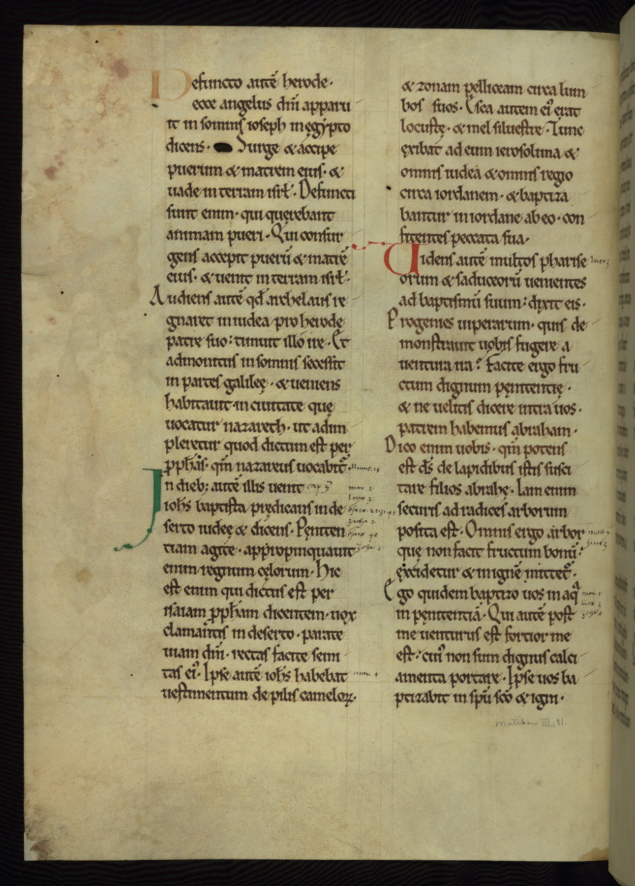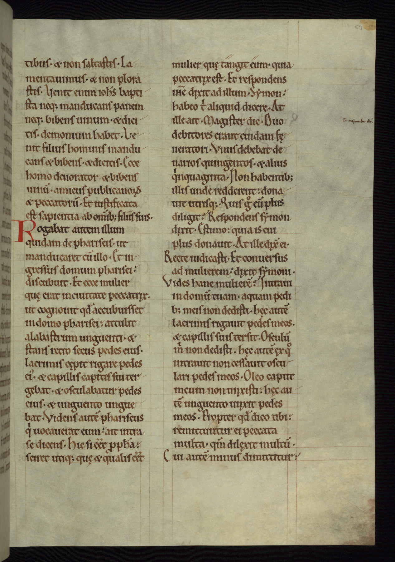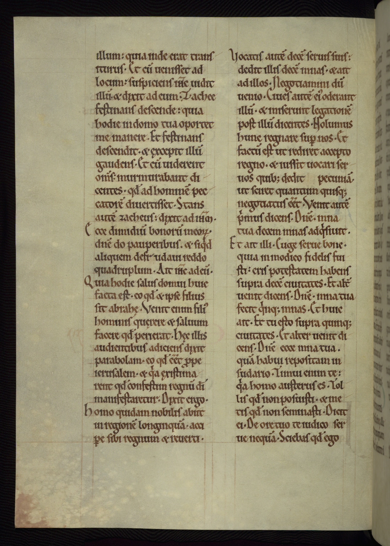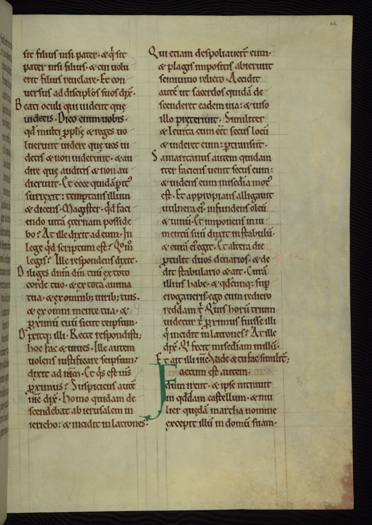 This large-format copy of the New Testament was almost certainly created at Rochester Cathedral Priory, England, in the first half of the twelfth century. It was part of a five-volume Bible, only one other volume of which, London, British Library Ms. Royal I.C.VII, has survived. The decorated initials in these manuscripts compare closely with those in other books securely attributed to Rochester. Textually these books are closely related to the Gundulph Bible (San Marino, Huntington Library Ms. HM 62), known to have been produced at Rochester in the second half of the eleventh century. Although neither the Walters' nor the British Library's volume includes an inscription associating this Bible with Rochester, the two medieval catalogs of the Rochester Cathedral library, produced around 1130 and in 1202, contain references to manuscripts that correspond well with them. The book’s large size indicates it that was designed to be read aloud, either during services or at meals in the refectory. Large, fanciful initials filled with succulent foliage, fruit, dragons, animals, and human faces begin each section of the text. Executed in a vibrant palette of red, blue, green, ochre (in place of gold), and yellow, the intricate, dynamic designs capture the essence of Romanesque manuscript illumination. Royal I.C.VII also includes four historiated initials (for the books of Joshua, I Samuel, 2 Samuel, and 2 Kings). Although the Bible was made at Rochester, the pre-Gothic script of W.18 in particular is extremely close to that practiced at nearby Canterbury at the time.