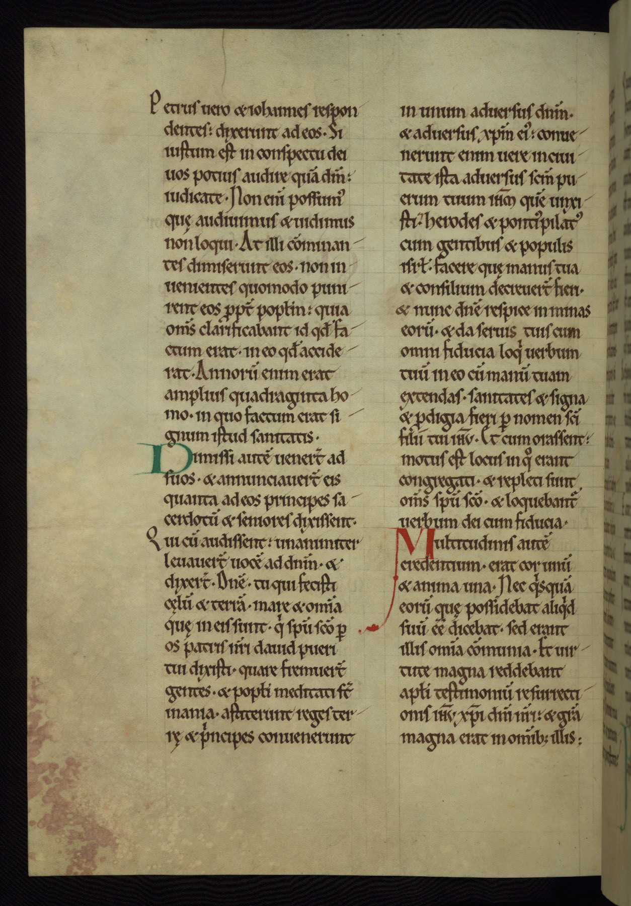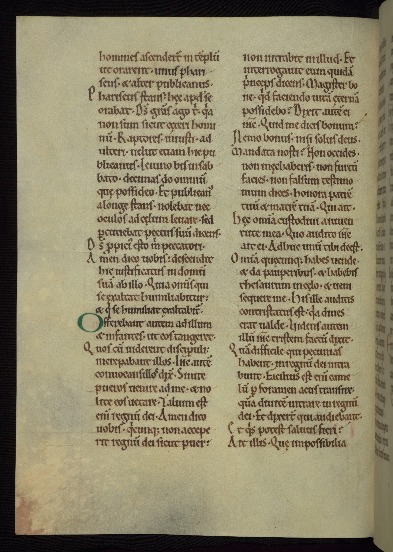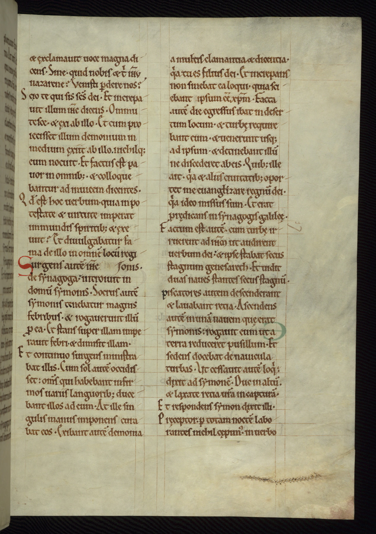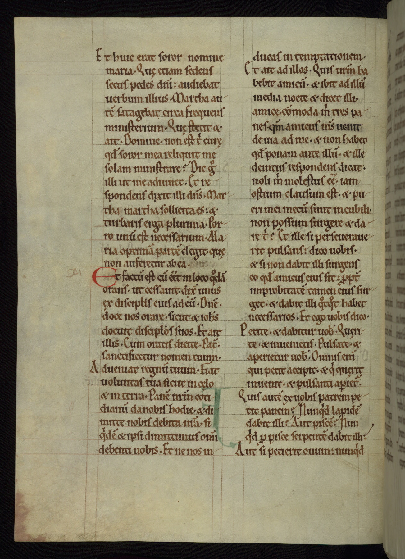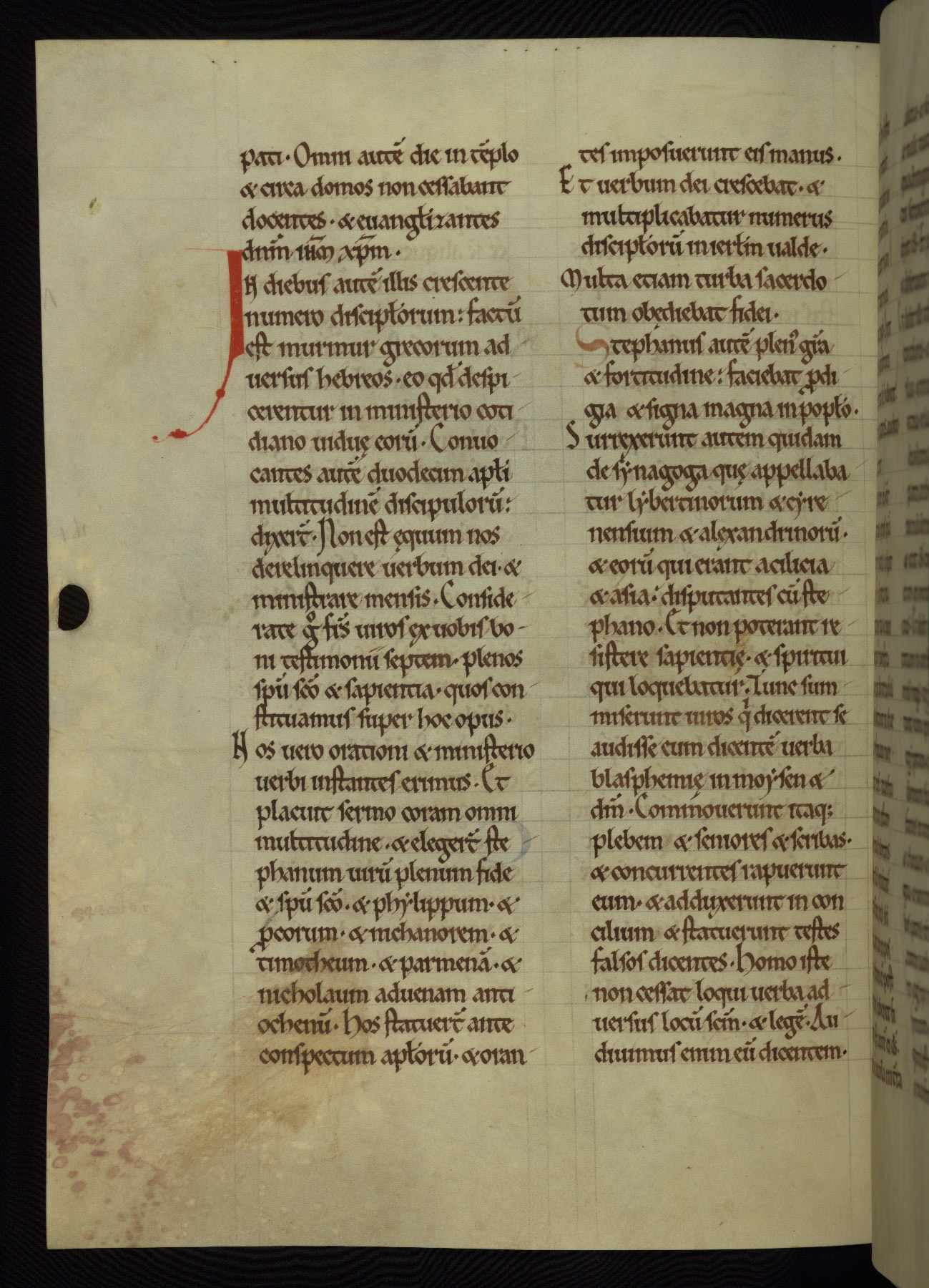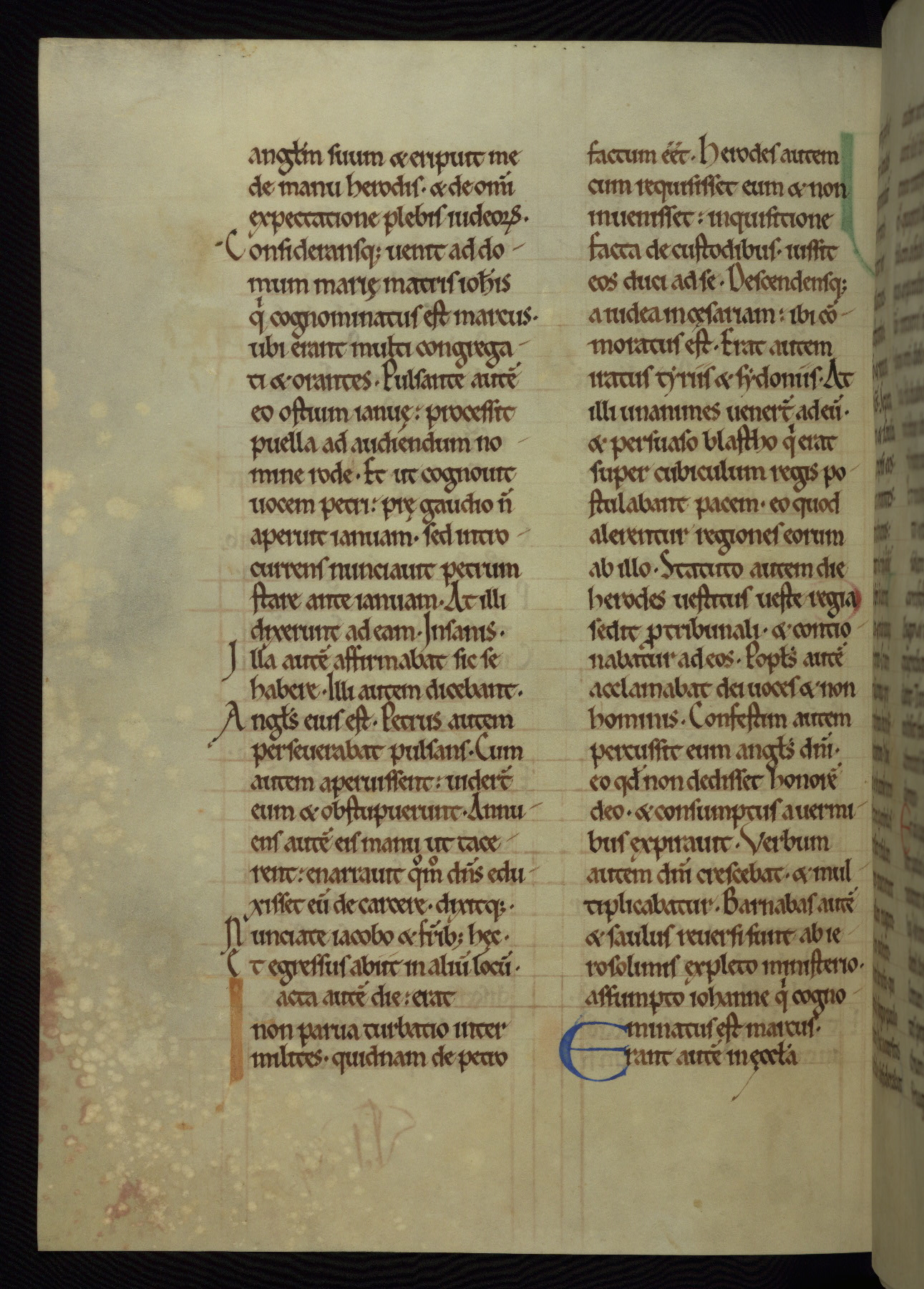 This large-format copy of the New Testament was almost certainly created at Rochester Cathedral Priory, England, in the first half of the twelfth century. It was part of a five-volume Bible, only one other volume of which, London, British Library Ms. Royal I.C.VII, has survived. The decorated initials in these manuscripts compare closely with those in other books securely attributed to Rochester. Textually these books are closely related to the Gundulph Bible (San Marino, Huntington Library Ms. HM 62), known to have been produced at Rochester in the second half of the eleventh century. Although neither the Walters' nor the British Library's volume includes an inscription associating this Bible with Rochester, the two medieval catalogs of the Rochester Cathedral library, produced around 1130 and in 1202, contain references to manuscripts that correspond well with them. The book’s large size indicates it that was designed to be read aloud, either during services or at meals in the refectory. Large, fanciful initials filled with succulent foliage, fruit, dragons, animals, and human faces begin each section of the text. Executed in a vibrant palette of red, blue, green, ochre (in place of gold), and yellow, the intricate, dynamic designs capture the essence of Romanesque manuscript illumination. Royal I.C.VII also includes four historiated initials (for the books of Joshua, I Samuel, 2 Samuel, and 2 Kings). Although the Bible was made at Rochester, the pre-Gothic script of W.18 in particular is extremely close to that practiced at nearby Canterbury at the time.