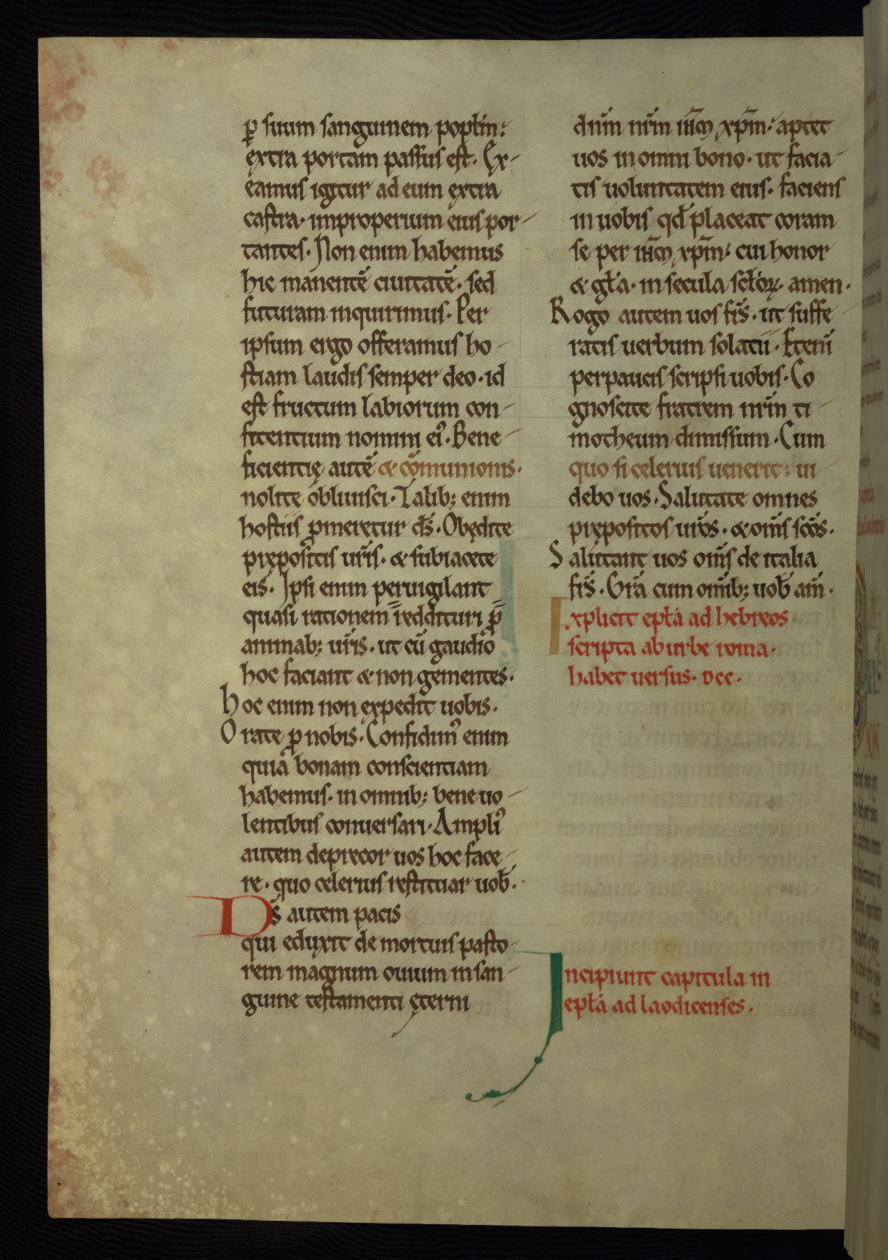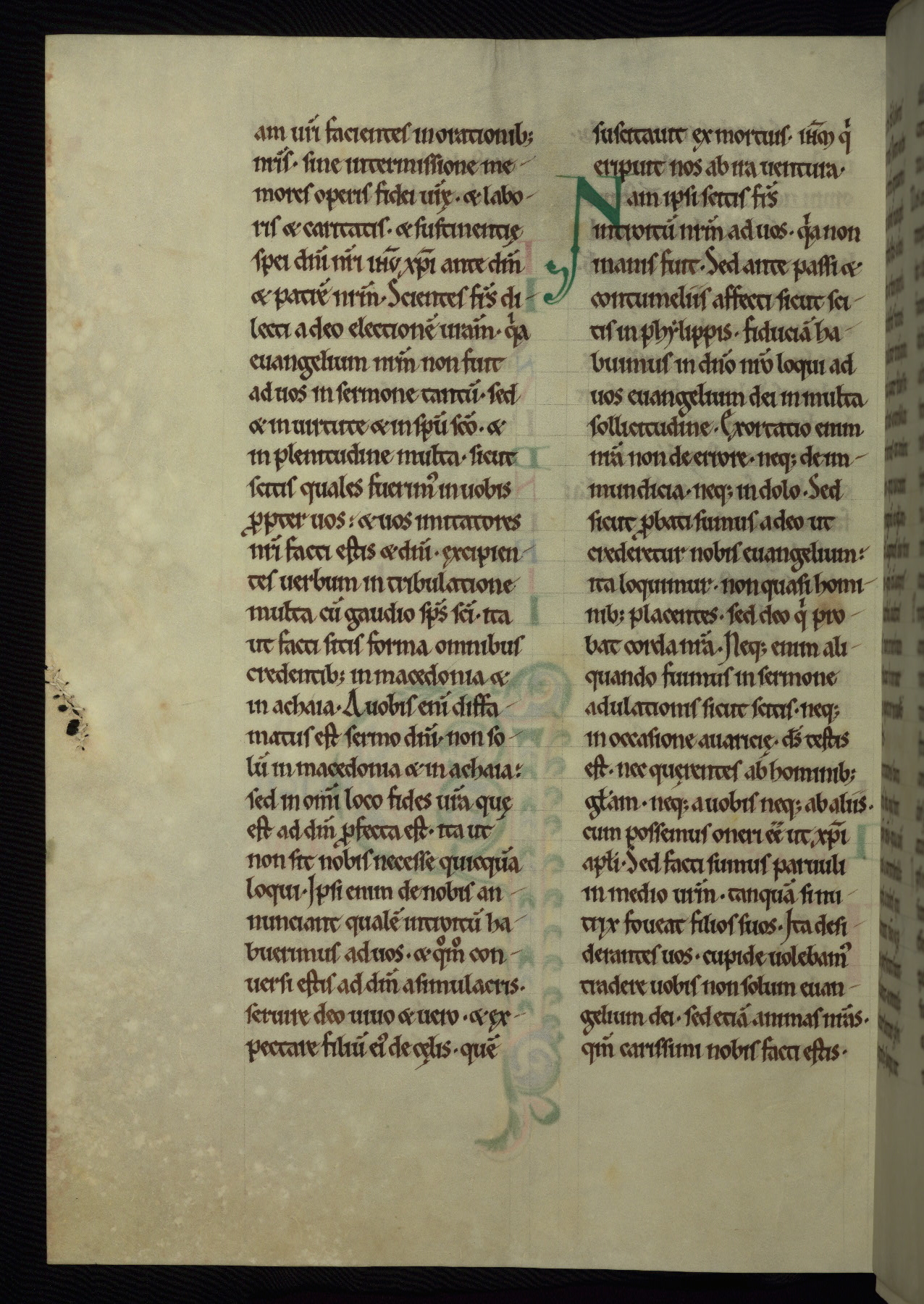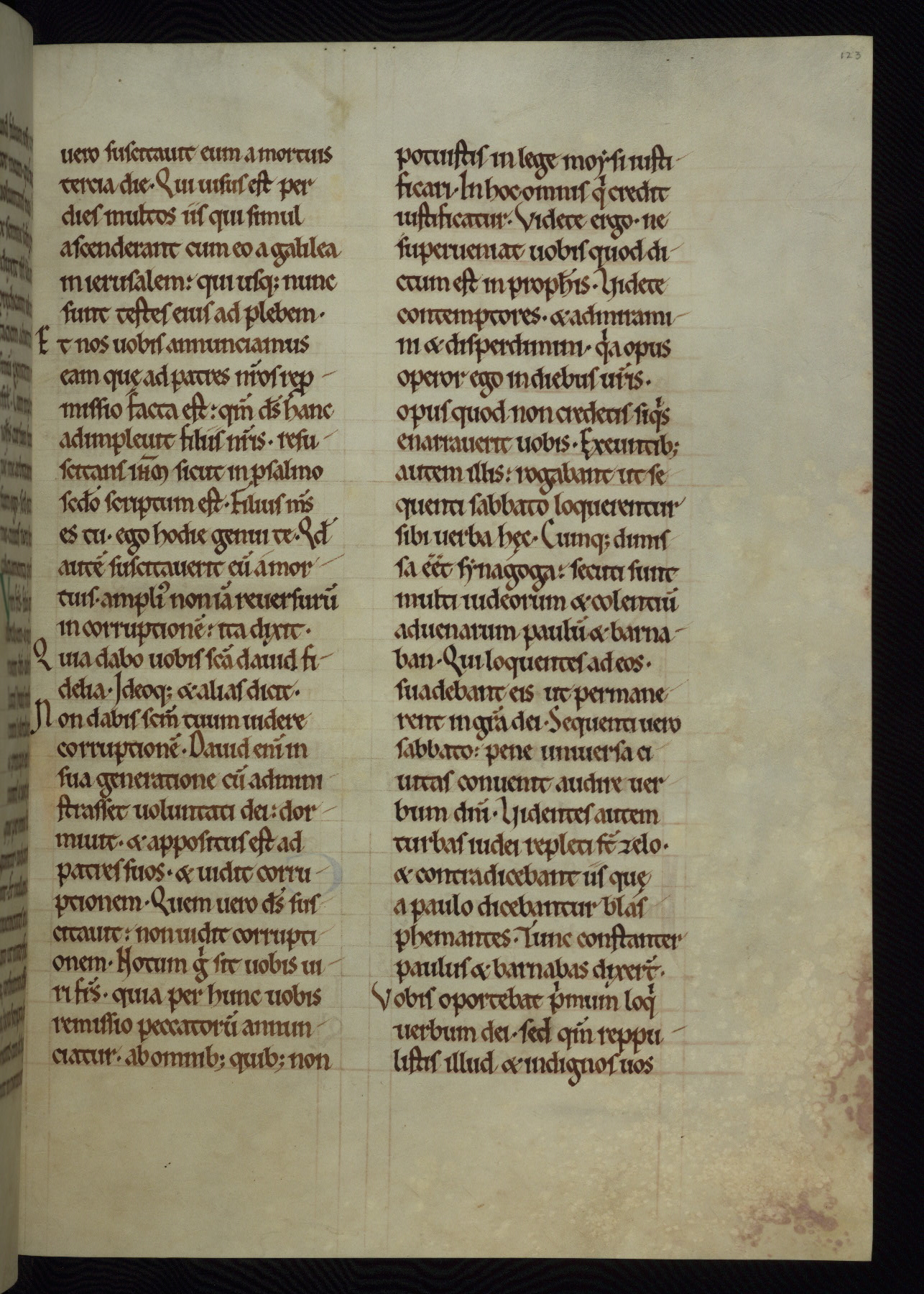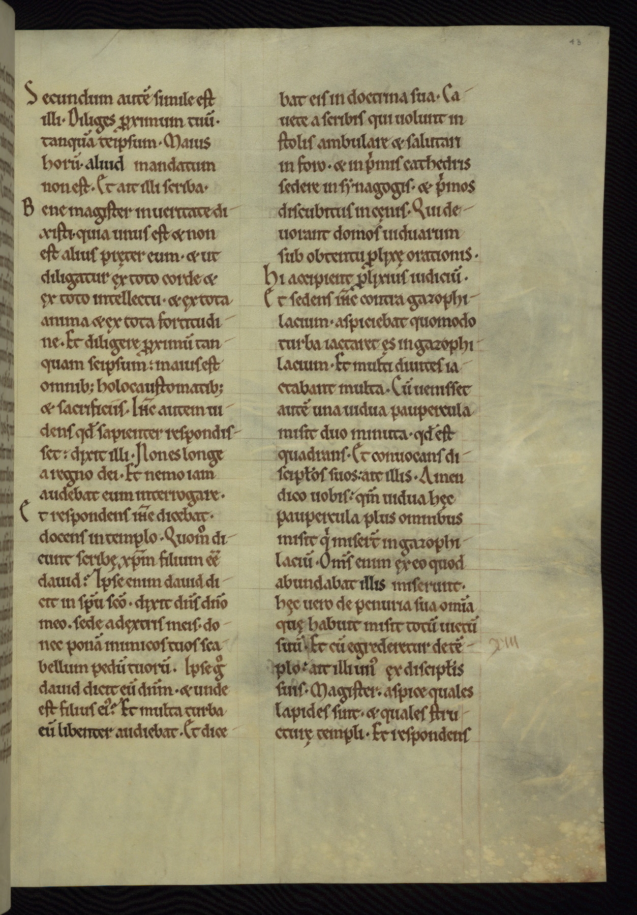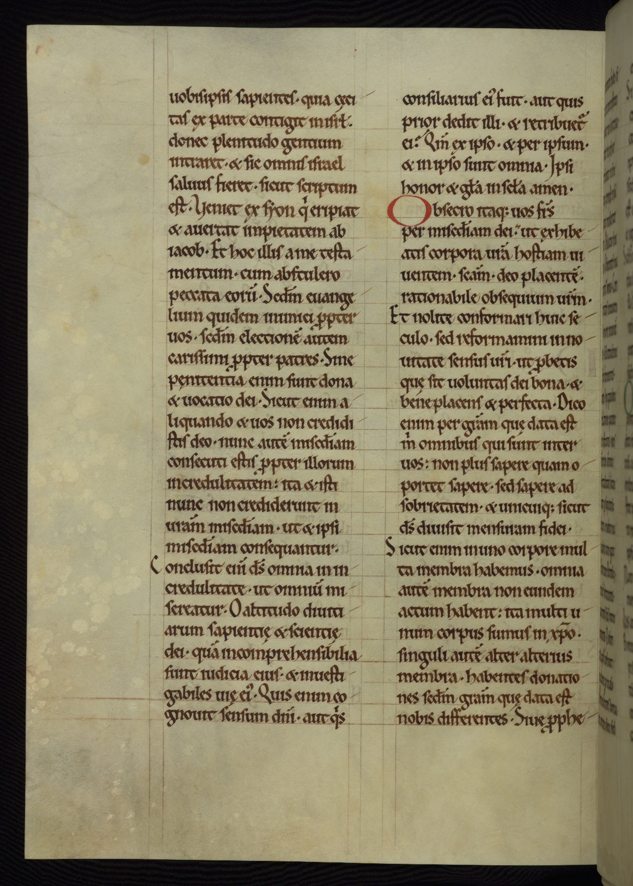 This large-format copy of the New Testament was almost certainly created at Rochester Cathedral Priory, England, in the first half of the twelfth century. It was part of a five-volume Bible, only one other volume of which, London, British Library Ms. Royal I.C.VII, has survived. The decorated initials in these manuscripts compare closely with those in other books securely attributed to Rochester. Textually these books are closely related to the Gundulph Bible (San Marino, Huntington Library Ms. HM 62), known to have been produced at Rochester in the second half of the eleventh century. Although neither the Walters' nor the British Library's volume includes an inscription associating this Bible with Rochester, the two medieval catalogs of the Rochester Cathedral library, produced around 1130 and in 1202, contain references to manuscripts that correspond well with them. The book’s large size indicates it that was designed to be read aloud, either during services or at meals in the refectory. Large, fanciful initials filled with succulent foliage, fruit, dragons, animals, and human faces begin each section of the text. Executed in a vibrant palette of red, blue, green, ochre (in place of gold), and yellow, the intricate, dynamic designs capture the essence of Romanesque manuscript illumination. Royal I.C.VII also includes four historiated initials (for the books of Joshua, I Samuel, 2 Samuel, and 2 Kings). Although the Bible was made at Rochester, the pre-Gothic script of W.18 in particular is extremely close to that practiced at nearby Canterbury at the time.