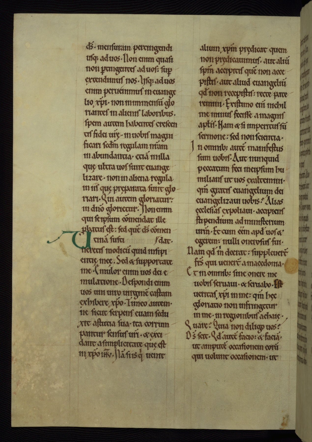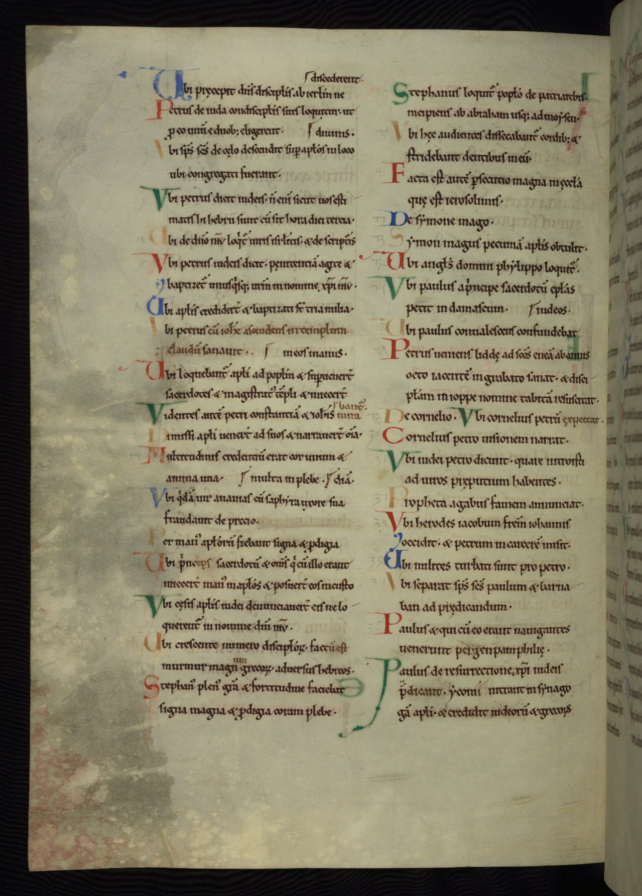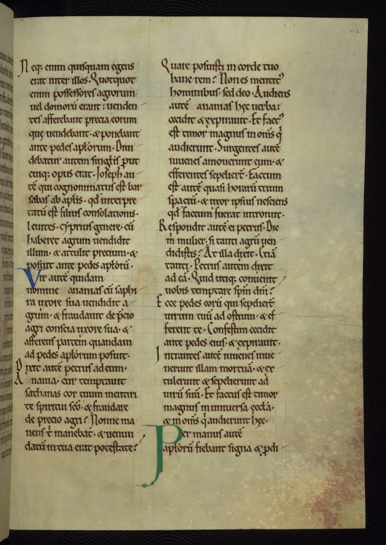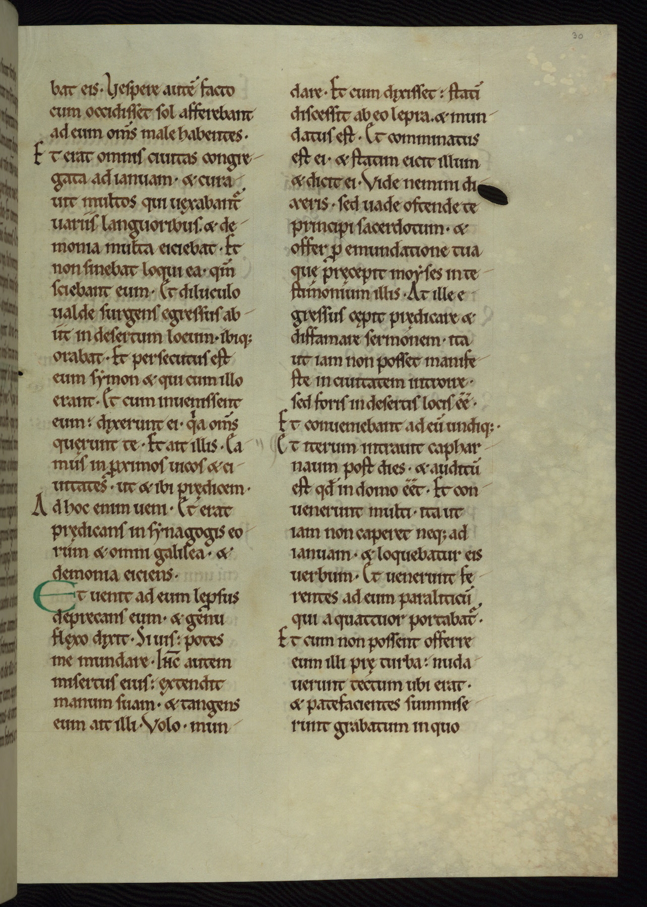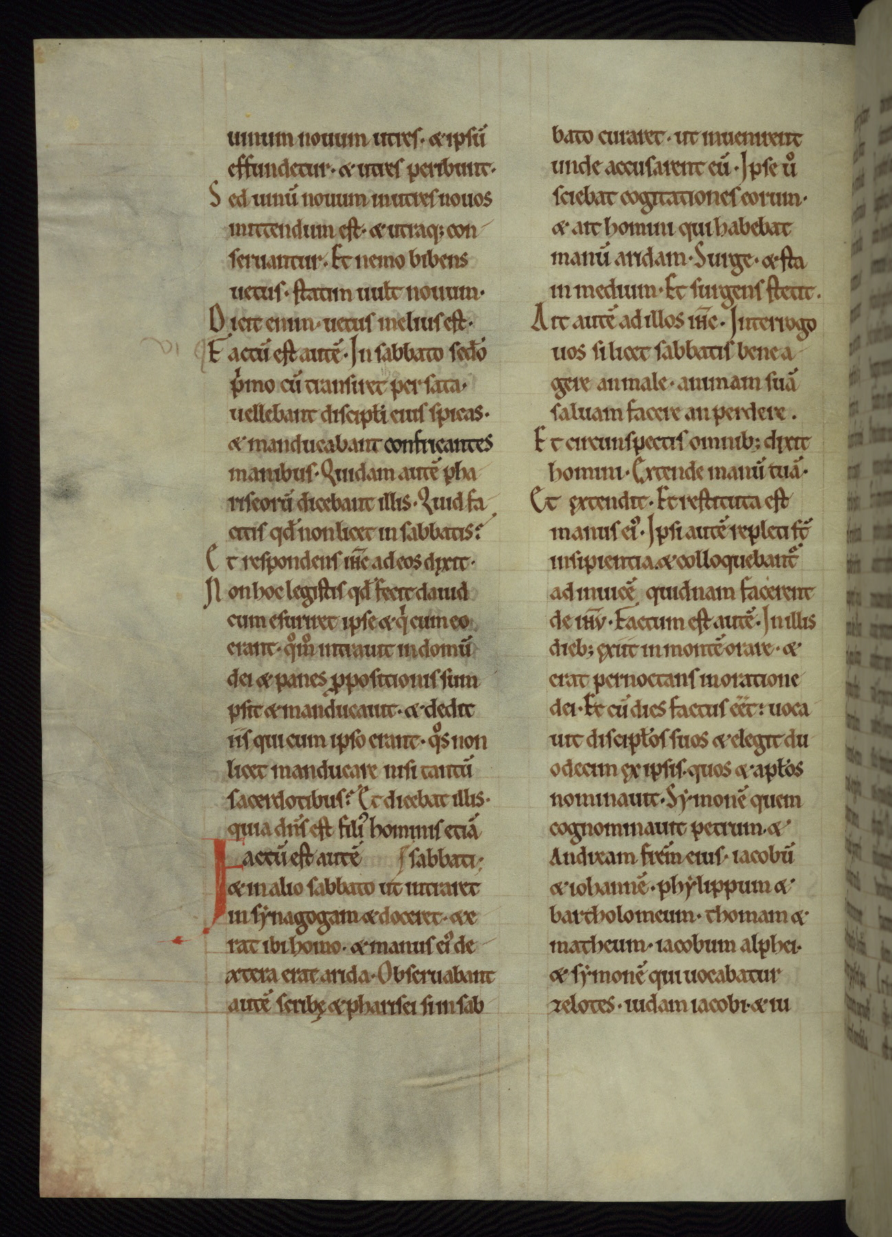 This large-format copy of the New Testament was almost certainly created at Rochester Cathedral Priory, England, in the first half of the twelfth century. It was part of a five-volume Bible, only one other volume of which, London, British Library Ms. Royal I.C.VII, has survived. The decorated initials in these manuscripts compare closely with those in other books securely attributed to Rochester. Textually these books are closely related to the Gundulph Bible (San Marino, Huntington Library Ms. HM 62), known to have been produced at Rochester in the second half of the eleventh century. Although neither the Walters' nor the British Library's volume includes an inscription associating this Bible with Rochester, the two medieval catalogs of the Rochester Cathedral library, produced around 1130 and in 1202, contain references to manuscripts that correspond well with them. The book’s large size indicates it that was designed to be read aloud, either during services or at meals in the refectory. Large, fanciful initials filled with succulent foliage, fruit, dragons, animals, and human faces begin each section of the text. Executed in a vibrant palette of red, blue, green, ochre (in place of gold), and yellow, the intricate, dynamic designs capture the essence of Romanesque manuscript illumination. Royal I.C.VII also includes four historiated initials (for the books of Joshua, I Samuel, 2 Samuel, and 2 Kings). Although the Bible was made at Rochester, the pre-Gothic script of W.18 in particular is extremely close to that practiced at nearby Canterbury at the time.
