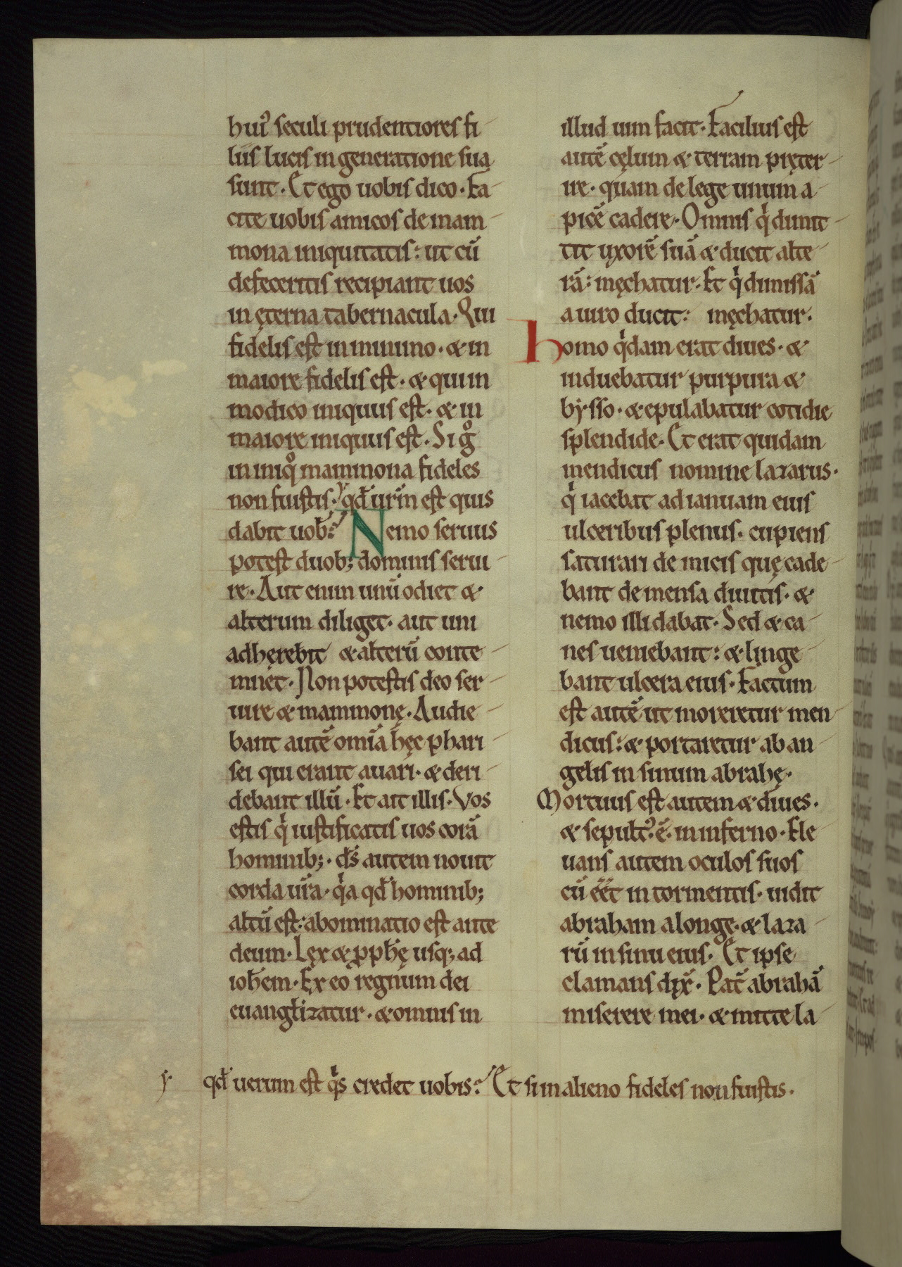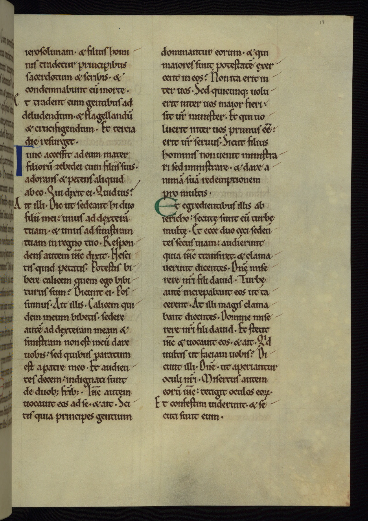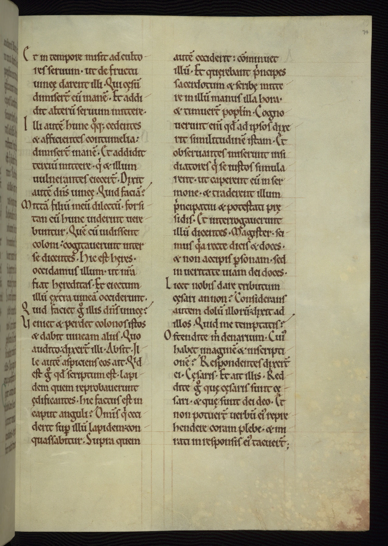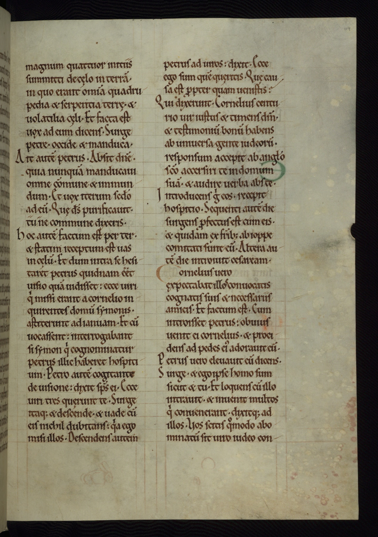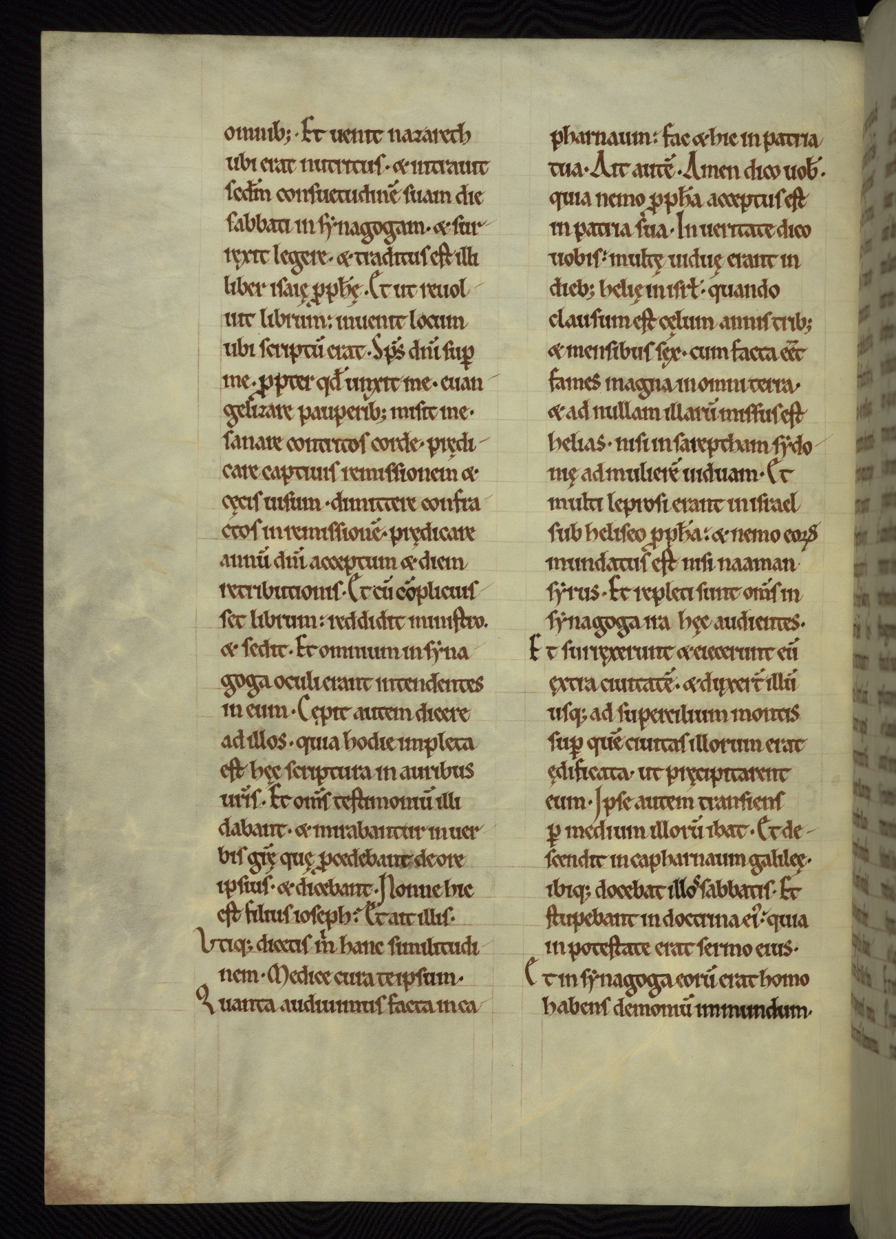 This large-format copy of the New Testament was almost certainly created at Rochester Cathedral Priory, England, in the first half of the twelfth century. It was part of a five-volume Bible, only one other volume of which, London, British Library Ms. Royal I.C.VII, has survived. The decorated initials in these manuscripts compare closely with those in other books securely attributed to Rochester. Textually these books are closely related to the Gundulph Bible (San Marino, Huntington Library Ms. HM 62), known to have been produced at Rochester in the second half of the eleventh century. Although neither the Walters' nor the British Library's volume includes an inscription associating this Bible with Rochester, the two medieval catalogs of the Rochester Cathedral library, produced around 1130 and in 1202, contain references to manuscripts that correspond well with them. The book’s large size indicates it that was designed to be read aloud, either during services or at meals in the refectory. Large, fanciful initials filled with succulent foliage, fruit, dragons, animals, and human faces begin each section of the text. Executed in a vibrant palette of red, blue, green, ochre (in place of gold), and yellow, the intricate, dynamic designs capture the essence of Romanesque manuscript illumination. Royal I.C.VII also includes four historiated initials (for the books of Joshua, I Samuel, 2 Samuel, and 2 Kings). Although the Bible was made at Rochester, the pre-Gothic script of W.18 in particular is extremely close to that practiced at nearby Canterbury at the time.