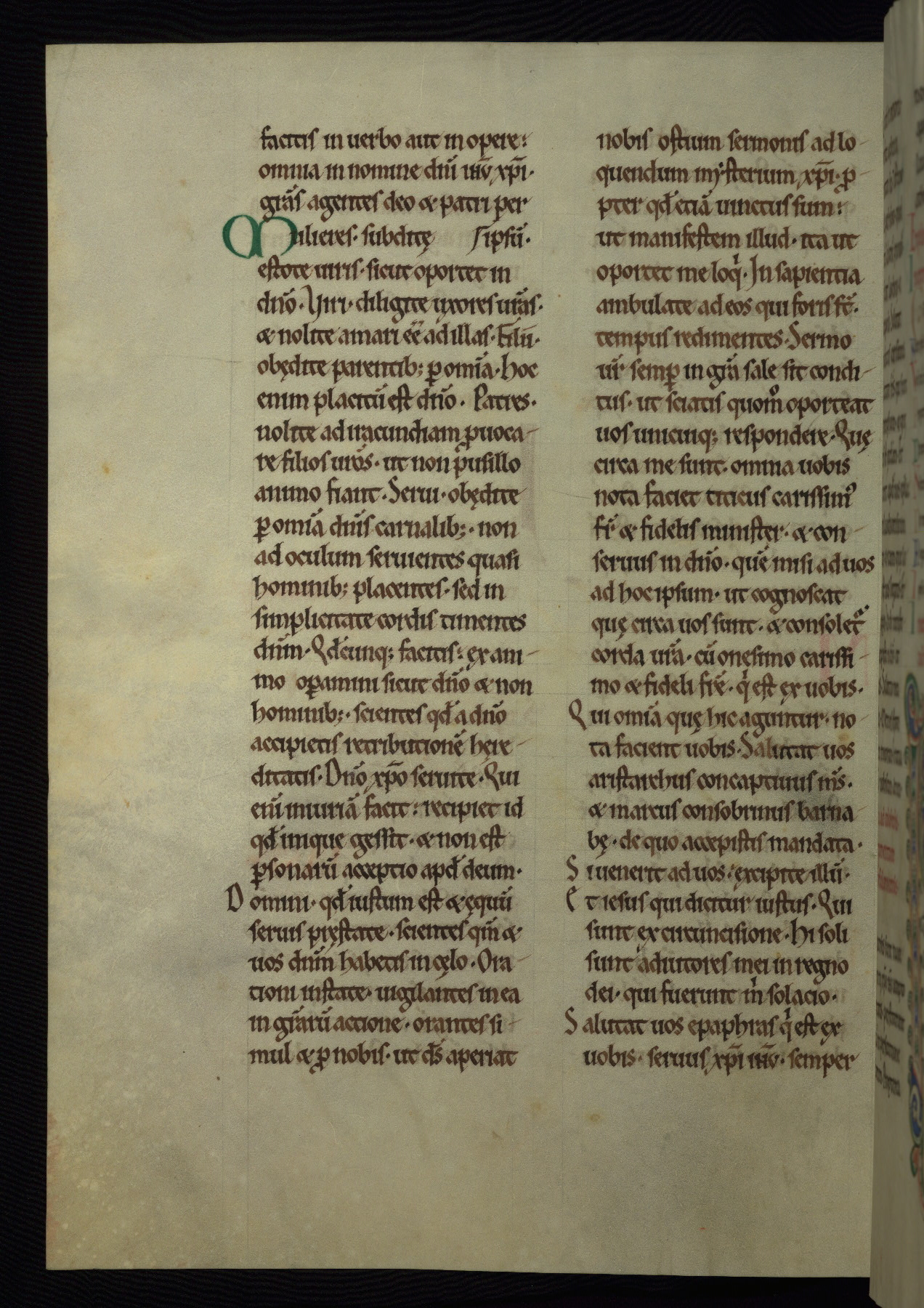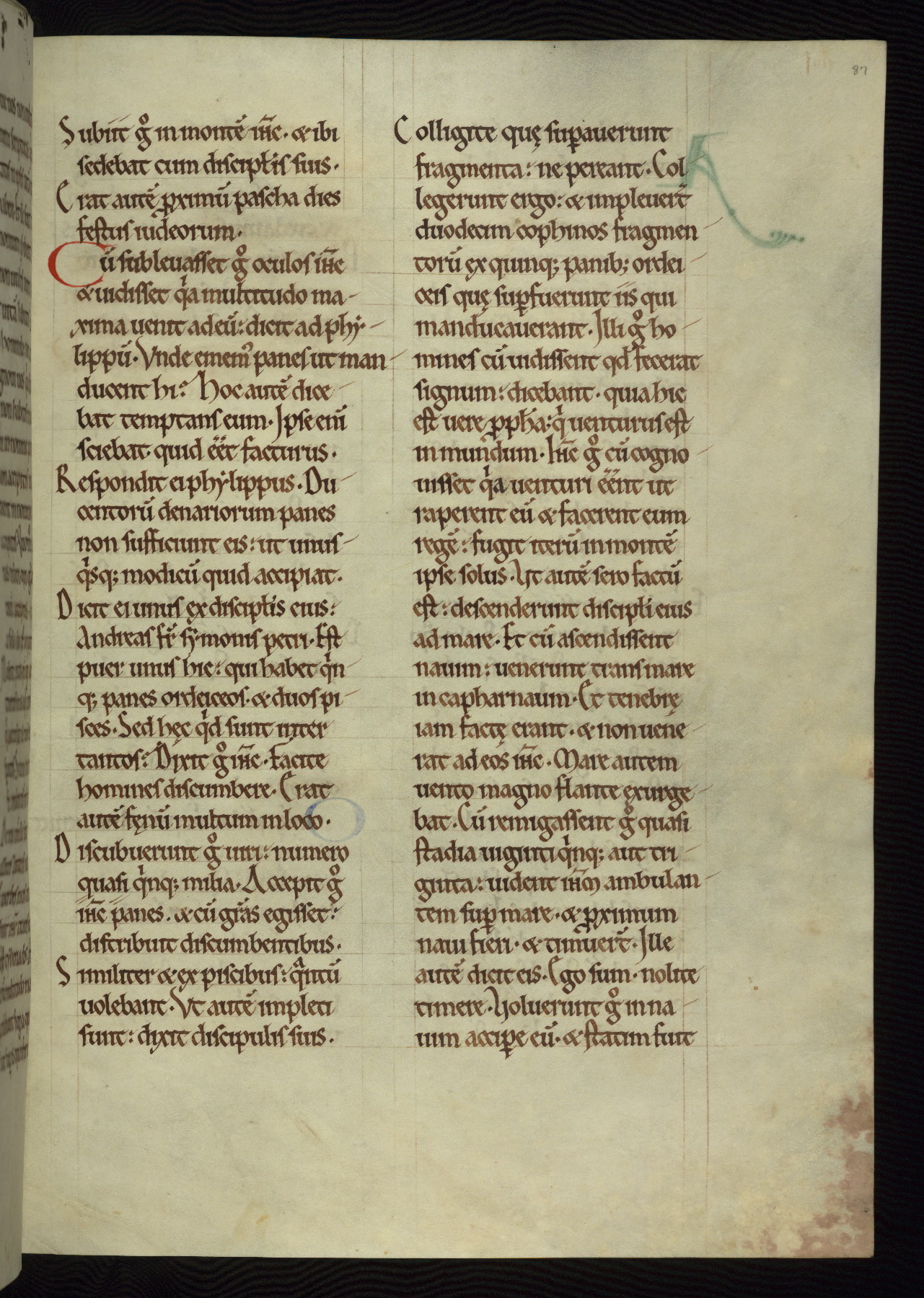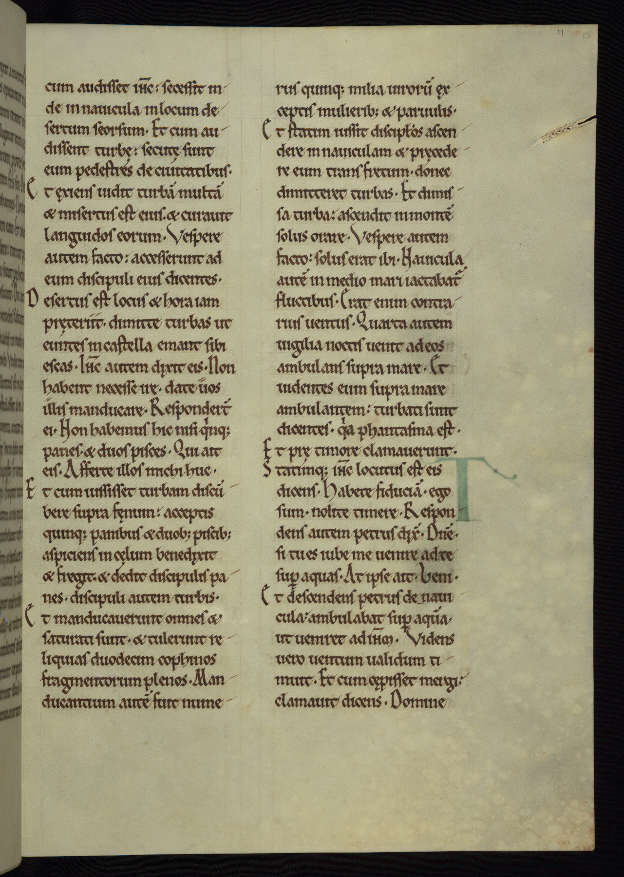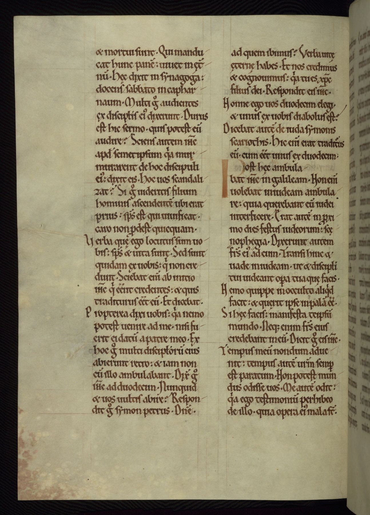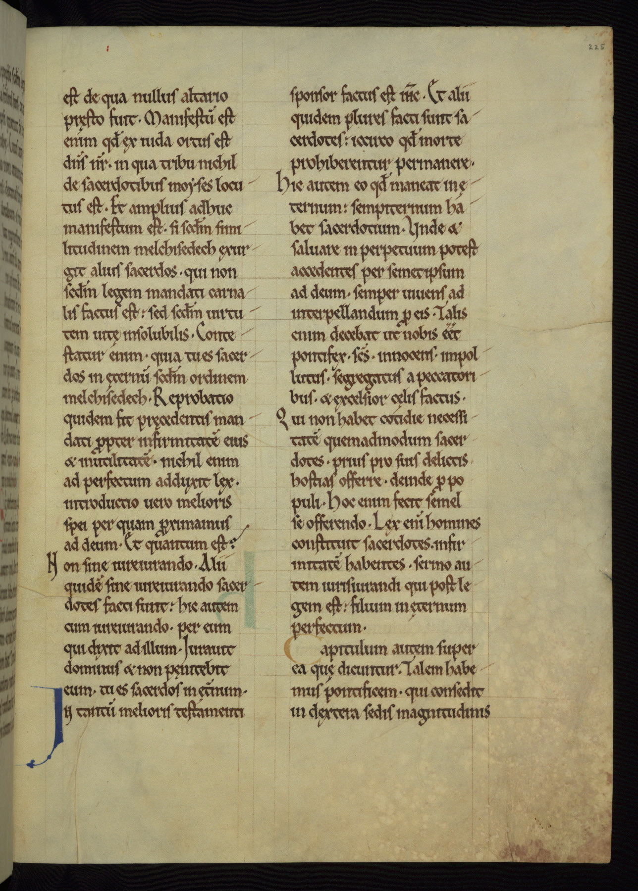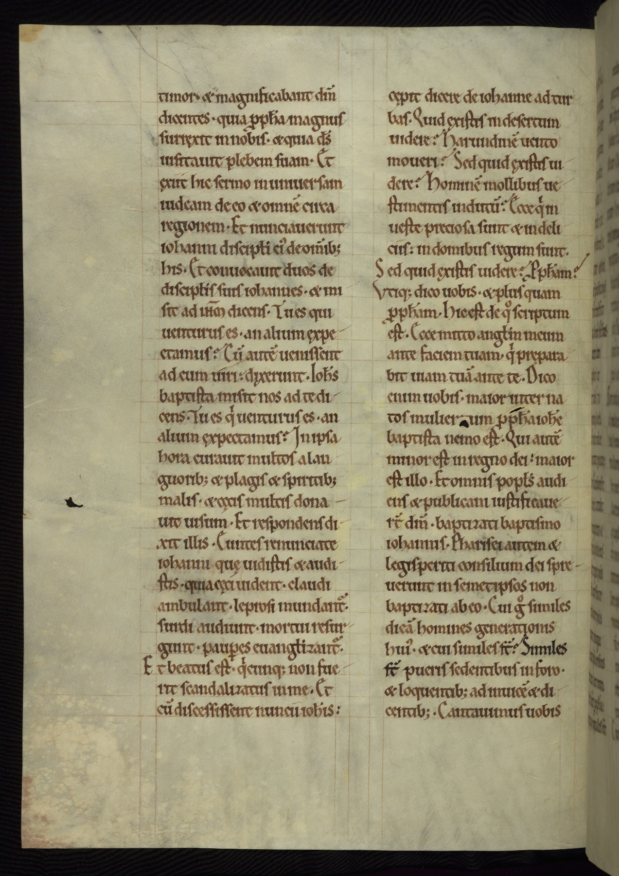 This large-format copy of the New Testament was almost certainly created at Rochester Cathedral Priory, England, in the first half of the twelfth century. It was part of a five-volume Bible, only one other volume of which, London, British Library Ms. Royal I.C.VII, has survived. The decorated initials in these manuscripts compare closely with those in other books securely attributed to Rochester. Textually these books are closely related to the Gundulph Bible (San Marino, Huntington Library Ms. HM 62), known to have been produced at Rochester in the second half of the eleventh century. Although neither the Walters' nor the British Library's volume includes an inscription associating this Bible with Rochester, the two medieval catalogs of the Rochester Cathedral library, produced around 1130 and in 1202, contain references to manuscripts that correspond well with them. The book’s large size indicates it that was designed to be read aloud, either during services or at meals in the refectory. Large, fanciful initials filled with succulent foliage, fruit, dragons, animals, and human faces begin each section of the text. Executed in a vibrant palette of red, blue, green, ochre (in place of gold), and yellow, the intricate, dynamic designs capture the essence of Romanesque manuscript illumination. Royal I.C.VII also includes four historiated initials (for the books of Joshua, I Samuel, 2 Samuel, and 2 Kings). Although the Bible was made at Rochester, the pre-Gothic script of W.18 in particular is extremely close to that practiced at nearby Canterbury at the time.