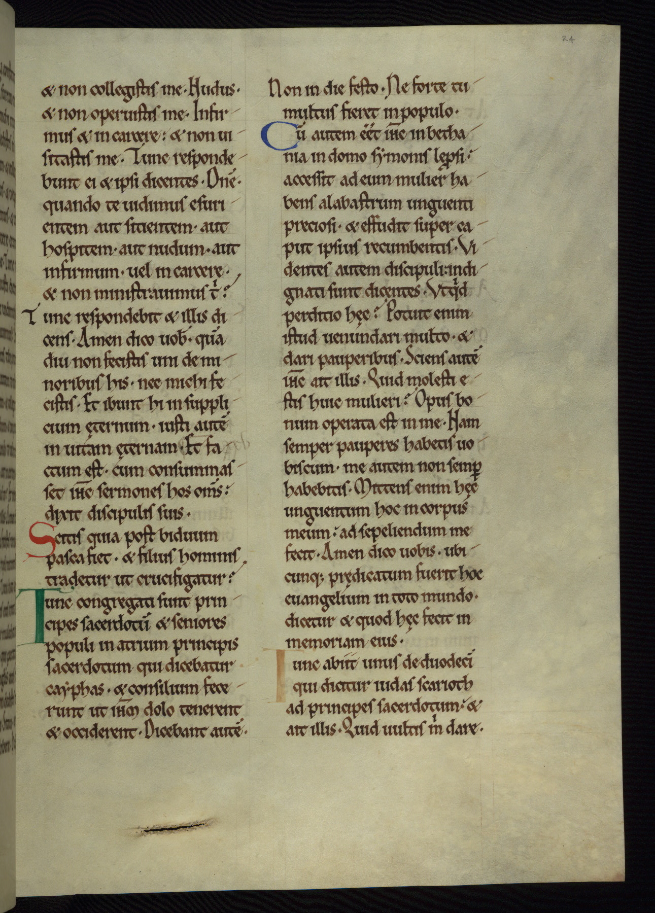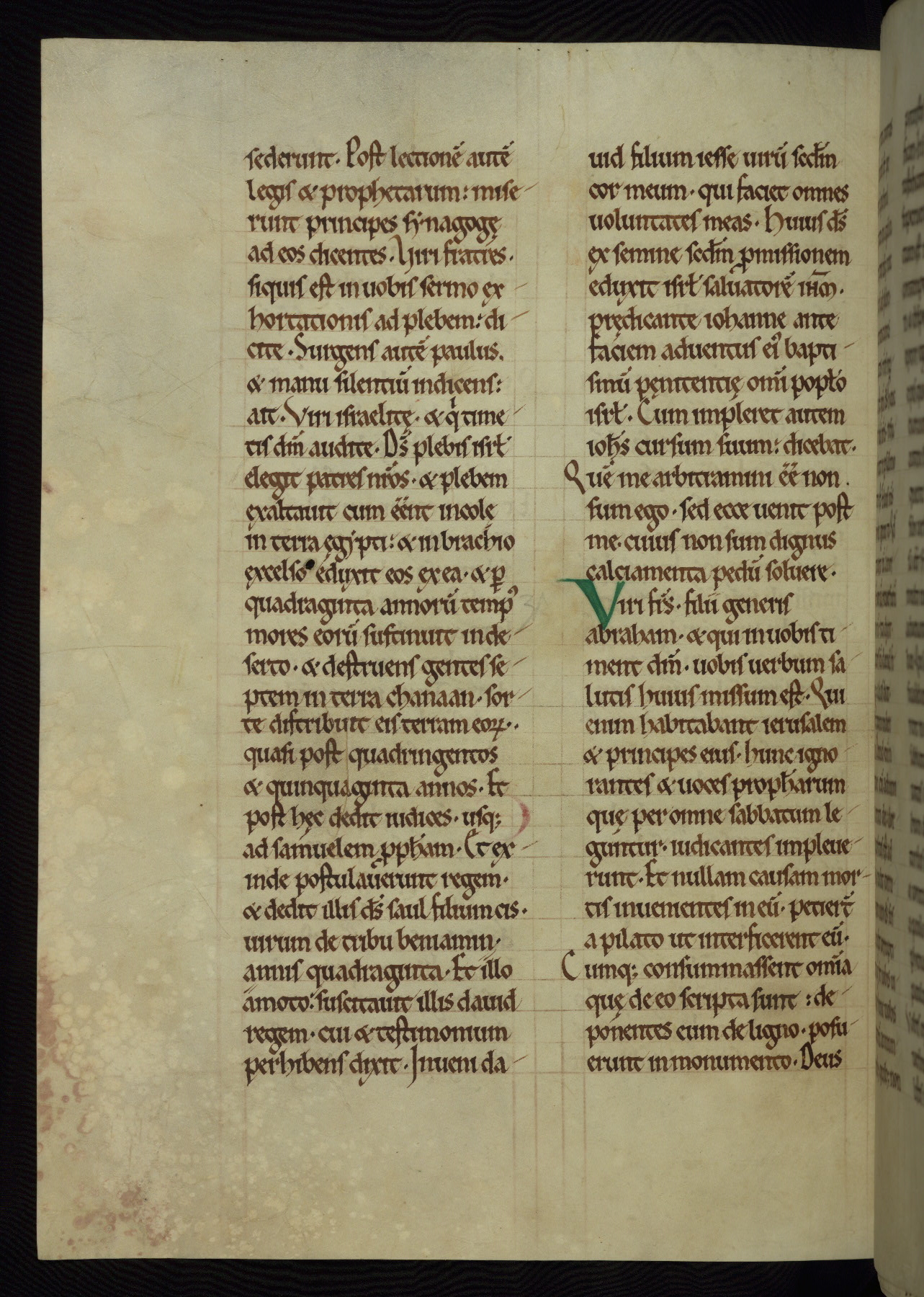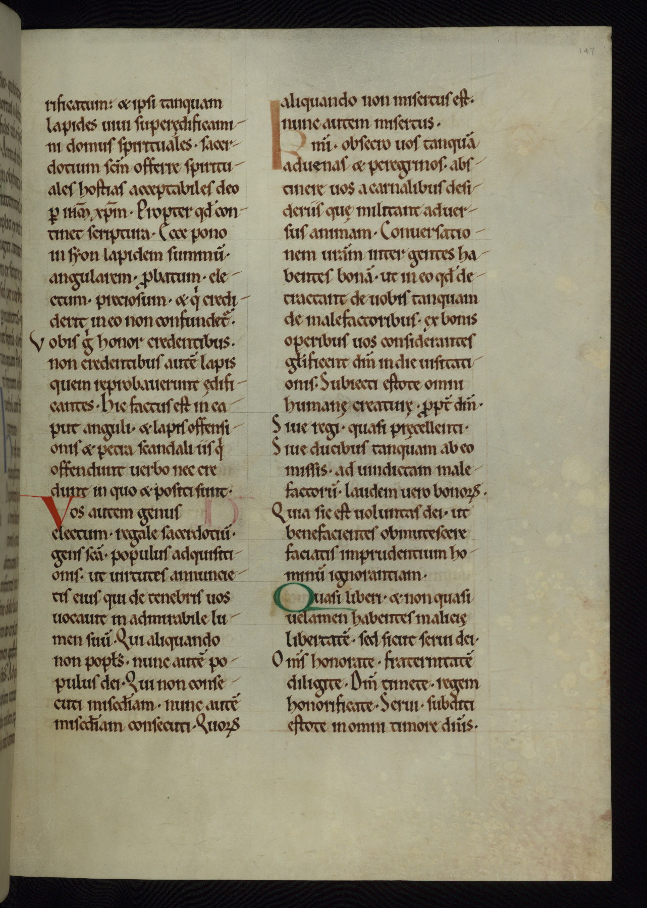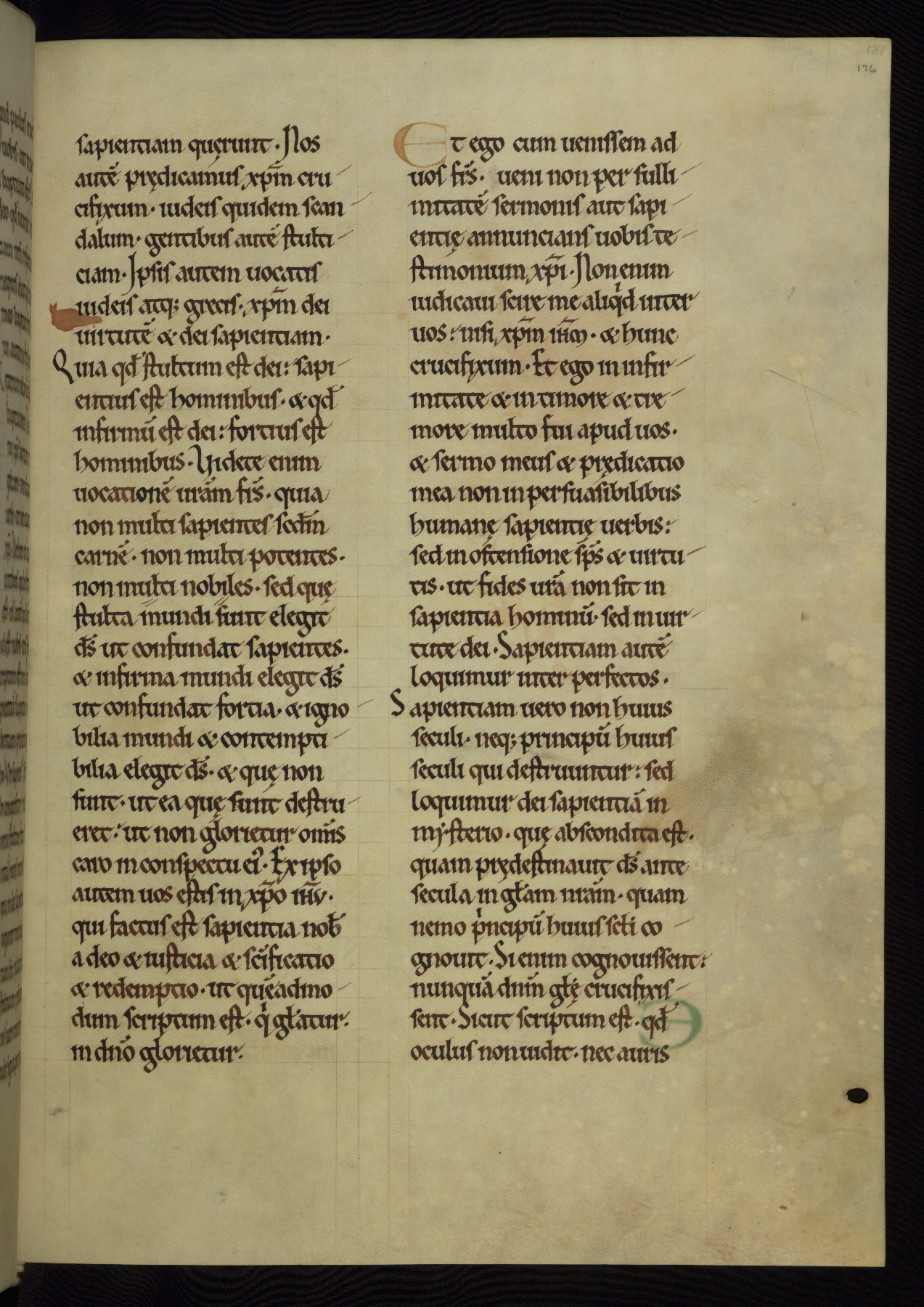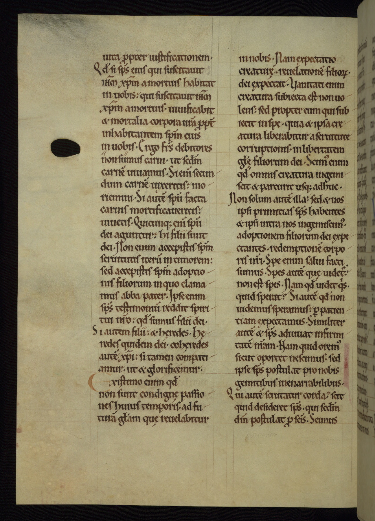 This large-format copy of the New Testament was almost certainly created at Rochester Cathedral Priory, England, in the first half of the twelfth century. It was part of a five-volume Bible, only one other volume of which, London, British Library Ms. Royal I.C.VII, has survived. The decorated initials in these manuscripts compare closely with those in other books securely attributed to Rochester. Textually these books are closely related to the Gundulph Bible (San Marino, Huntington Library Ms. HM 62), known to have been produced at Rochester in the second half of the eleventh century. Although neither the Walters' nor the British Library's volume includes an inscription associating this Bible with Rochester, the two medieval catalogs of the Rochester Cathedral library, produced around 1130 and in 1202, contain references to manuscripts that correspond well with them. The book’s large size indicates it that was designed to be read aloud, either during services or at meals in the refectory. Large, fanciful initials filled with succulent foliage, fruit, dragons, animals, and human faces begin each section of the text. Executed in a vibrant palette of red, blue, green, ochre (in place of gold), and yellow, the intricate, dynamic designs capture the essence of Romanesque manuscript illumination. Royal I.C.VII also includes four historiated initials (for the books of Joshua, I Samuel, 2 Samuel, and 2 Kings). Although the Bible was made at Rochester, the pre-Gothic script of W.18 in particular is extremely close to that practiced at nearby Canterbury at the time.