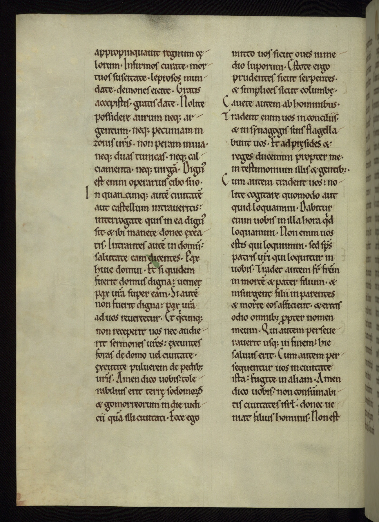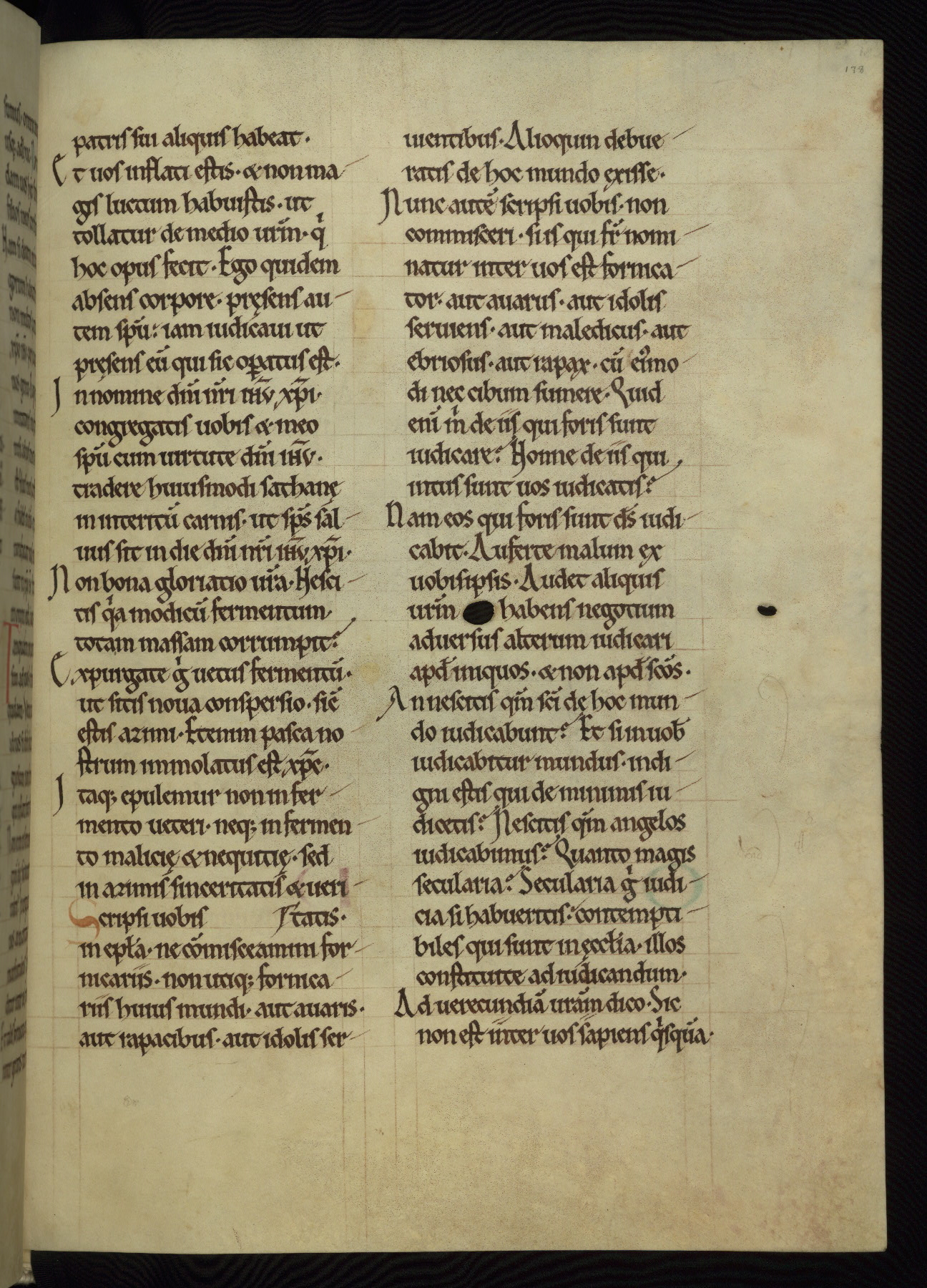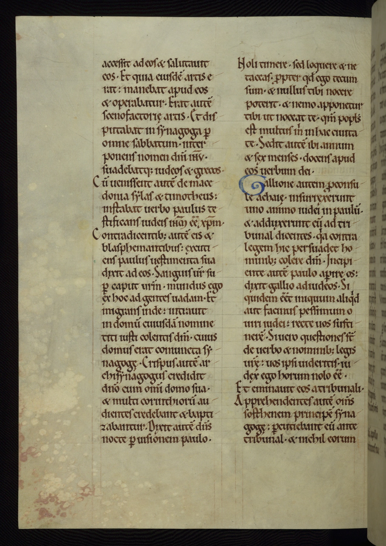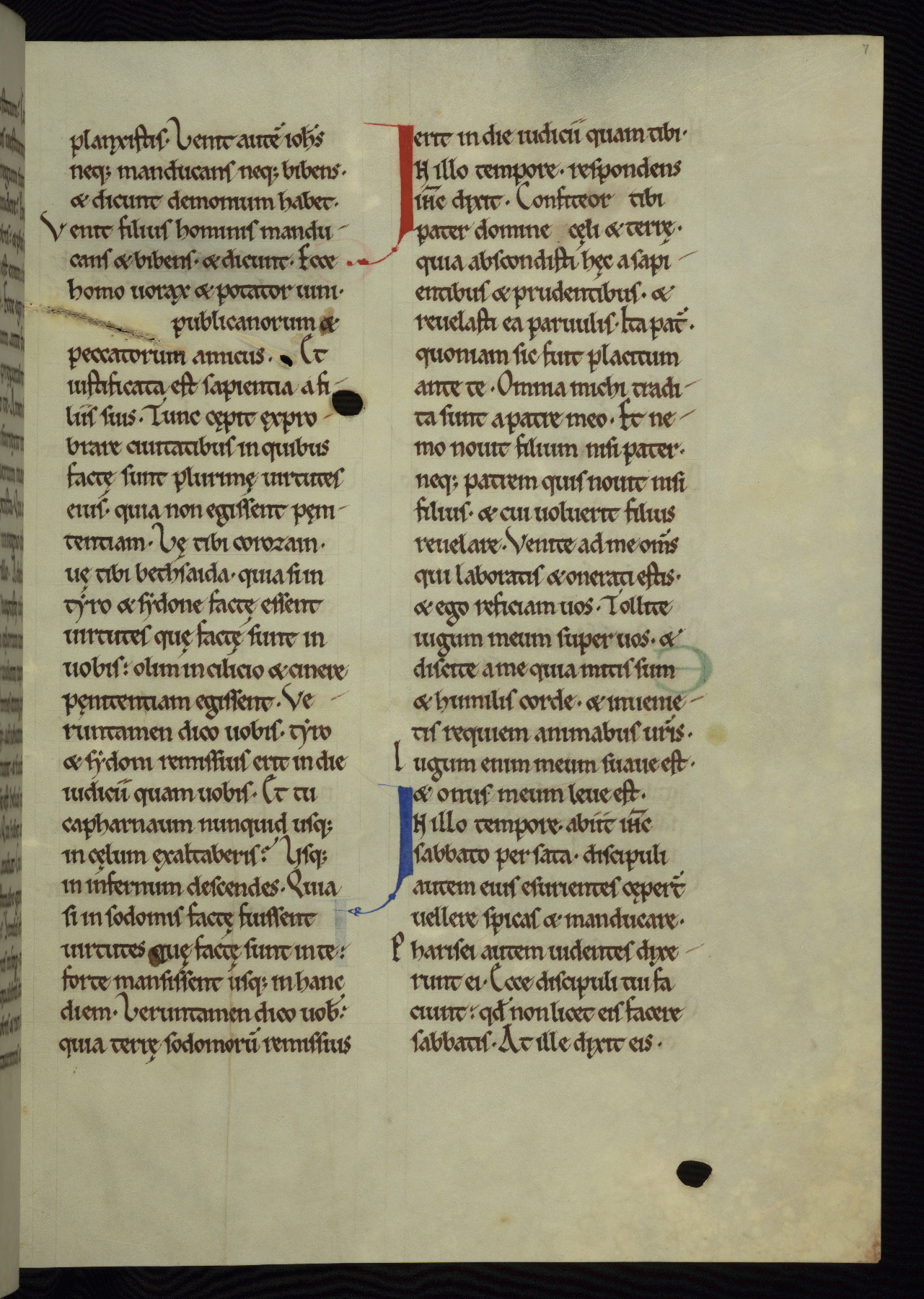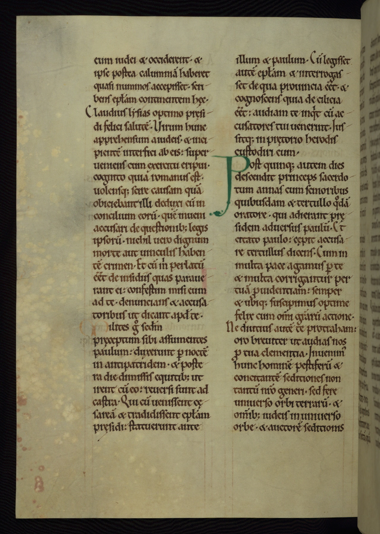 This large-format copy of the New Testament was almost certainly created at Rochester Cathedral Priory, England, in the first half of the twelfth century. It was part of a five-volume Bible, only one other volume of which, London, British Library Ms. Royal I.C.VII, has survived. The decorated initials in these manuscripts compare closely with those in other books securely attributed to Rochester. Textually these books are closely related to the Gundulph Bible (San Marino, Huntington Library Ms. HM 62), known to have been produced at Rochester in the second half of the eleventh century. Although neither the Walters' nor the British Library's volume includes an inscription associating this Bible with Rochester, the two medieval catalogs of the Rochester Cathedral library, produced around 1130 and in 1202, contain references to manuscripts that correspond well with them. The book’s large size indicates it that was designed to be read aloud, either during services or at meals in the refectory. Large, fanciful initials filled with succulent foliage, fruit, dragons, animals, and human faces begin each section of the text. Executed in a vibrant palette of red, blue, green, ochre (in place of gold), and yellow, the intricate, dynamic designs capture the essence of Romanesque manuscript illumination. Royal I.C.VII also includes four historiated initials (for the books of Joshua, I Samuel, 2 Samuel, and 2 Kings). Although the Bible was made at Rochester, the pre-Gothic script of W.18 in particular is extremely close to that practiced at nearby Canterbury at the time.