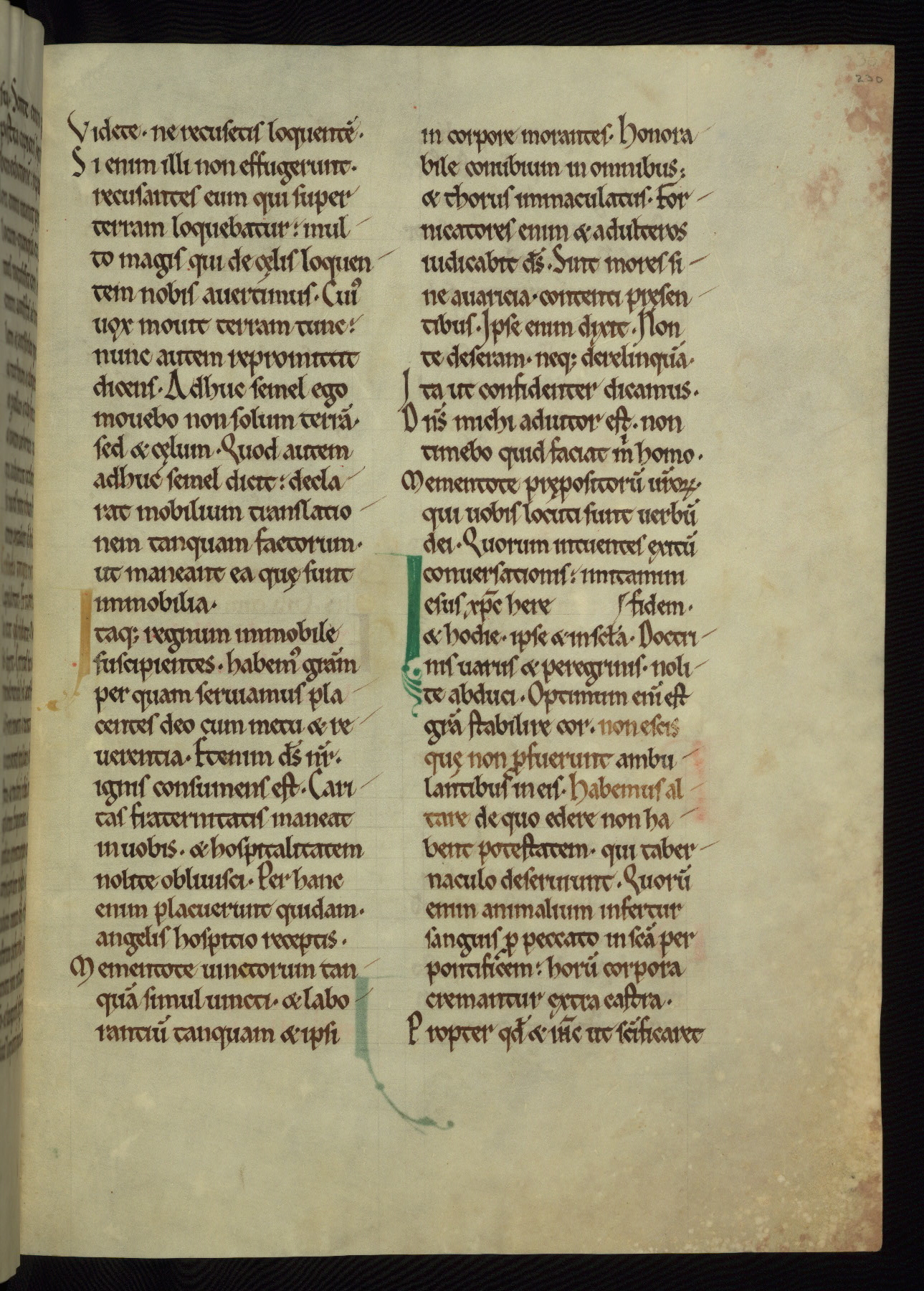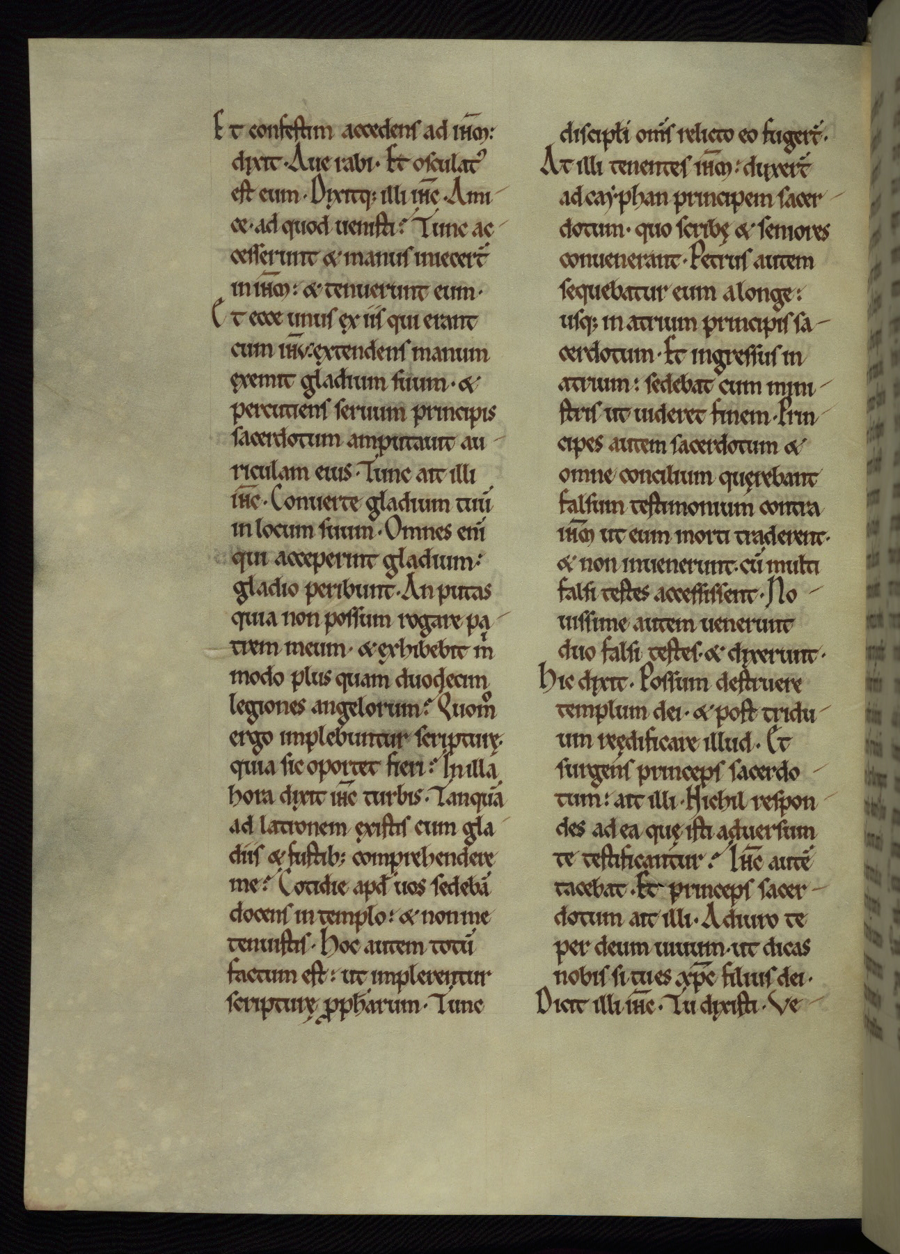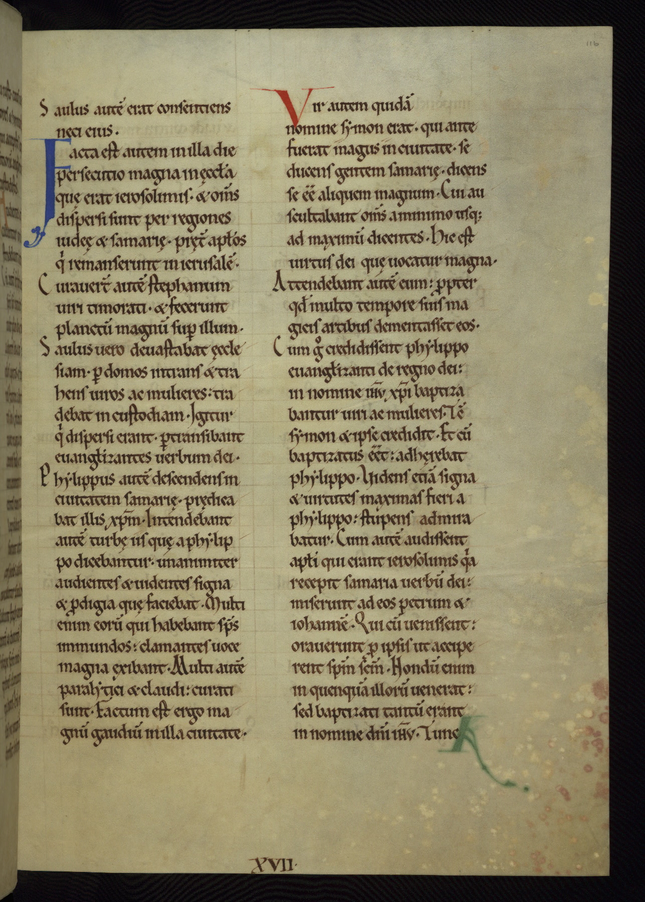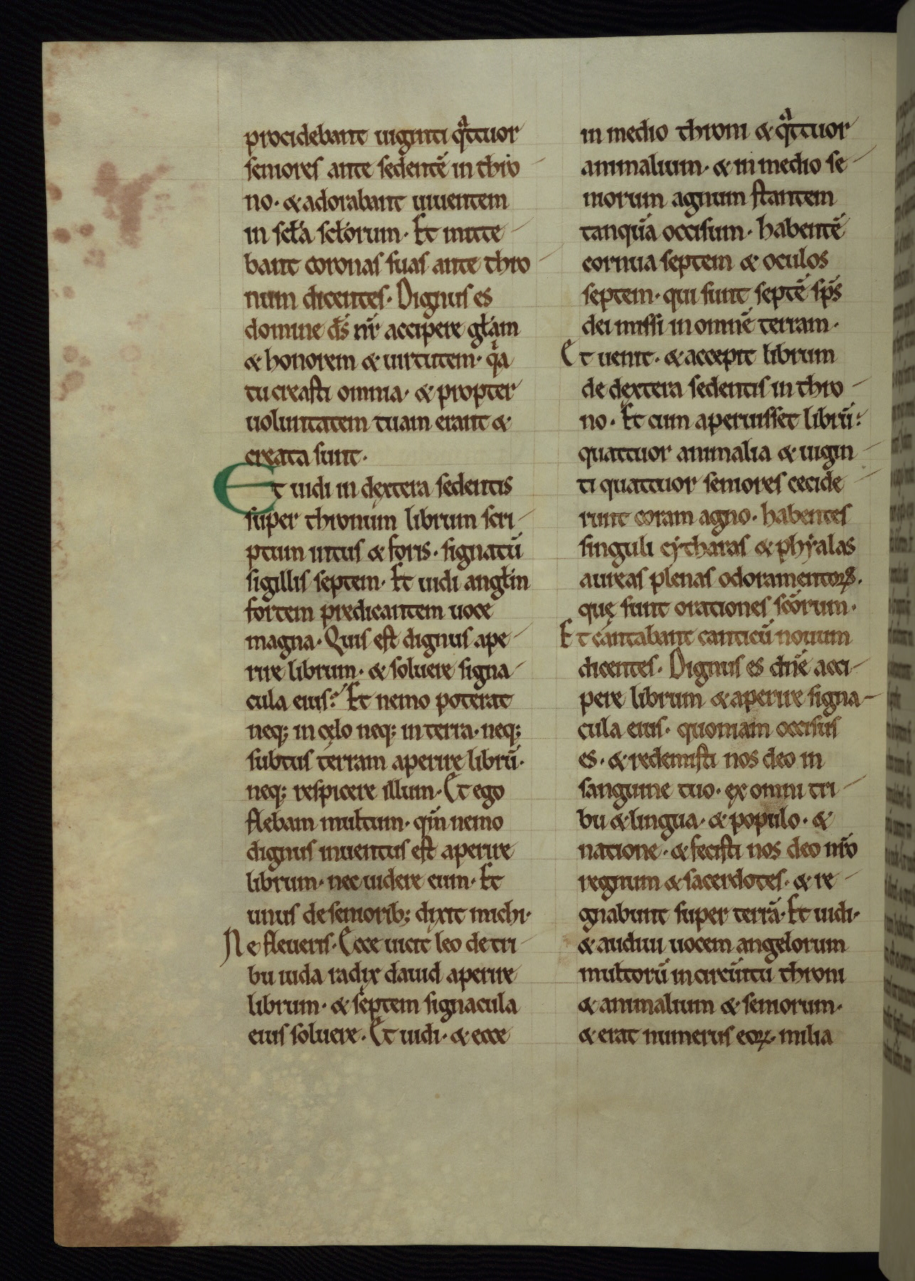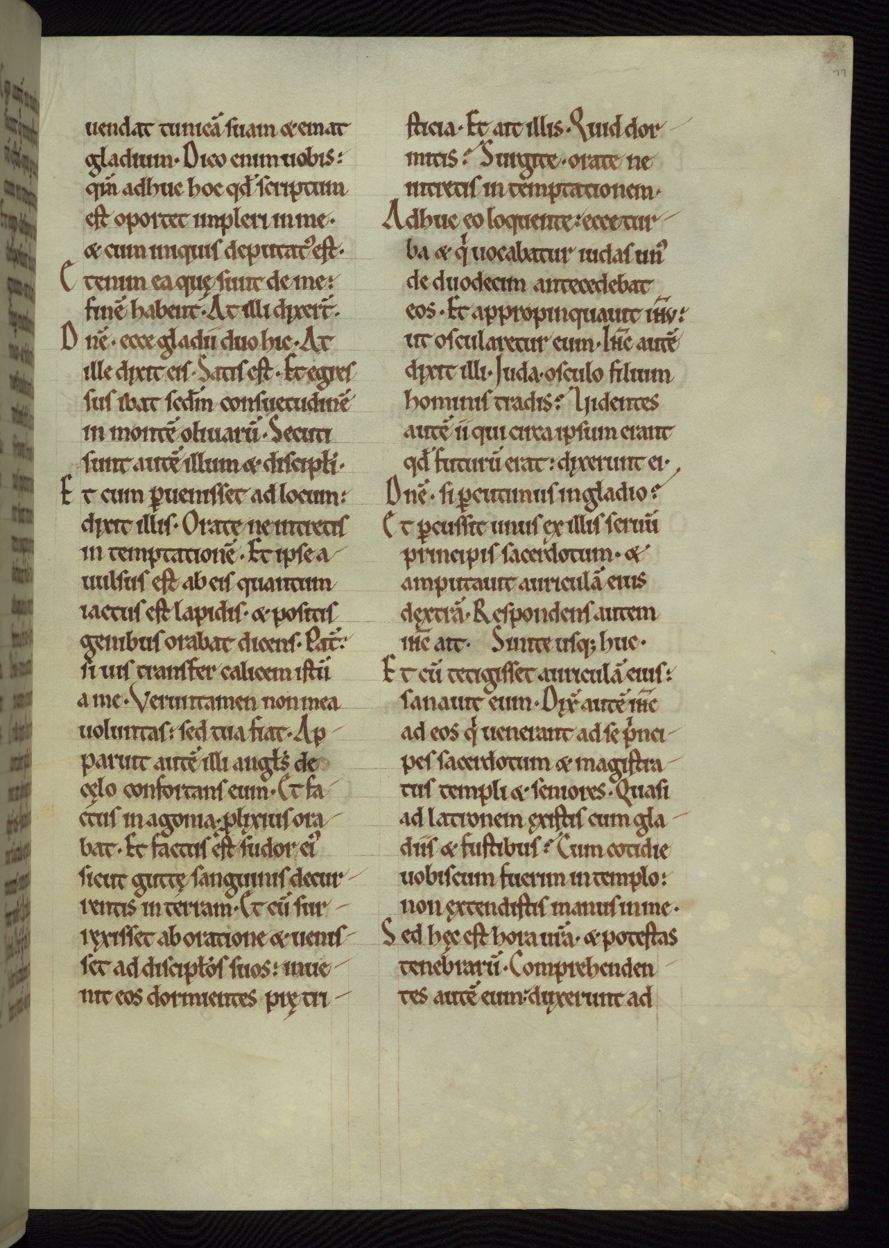This large-format copy of the New Testament was almost certainly created at Rochester Cathedral Priory, England, in the first half of the twelfth century. It was part of a five-volume Bible, only one other volume of which, London, British Library Ms. Royal I.C.VII, has survived. The decorated initials in these manuscripts compare closely with those in other books securely attributed to Rochester. Textually these books are closely related to the Gundulph Bible (San Marino, Huntington Library Ms. HM 62), known to have been produced at Rochester in the second half of the eleventh century. Although neither the Walters' nor the British Library's volume includes an inscription associating this Bible with Rochester, the two medieval catalogs of the Rochester Cathedral library, produced around 1130 and in 1202, contain references to manuscripts that correspond well with them. The book’s large size indicates it that was designed to be read aloud, either during services or at meals in the refectory. Large, fanciful initials filled with succulent foliage, fruit, dragons, animals, and human faces begin each section of the text. Executed in a vibrant palette of red, blue, green, ochre (in place of gold), and yellow, the intricate, dynamic designs capture the essence of Romanesque manuscript illumination. Royal I.C.VII also includes four historiated initials (for the books of Joshua, I Samuel, 2 Samuel, and 2 Kings). Although the Bible was made at Rochester, the pre-Gothic script of W.18 in particular is extremely close to that practiced at nearby Canterbury at the time.