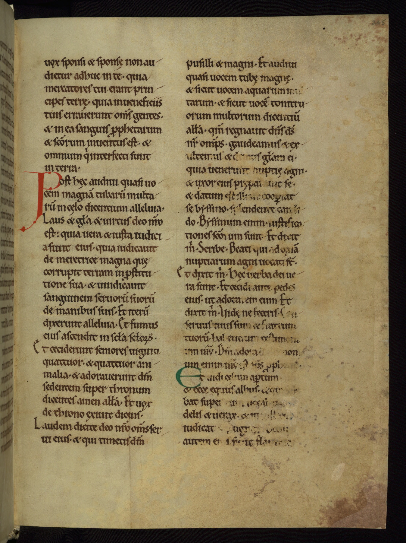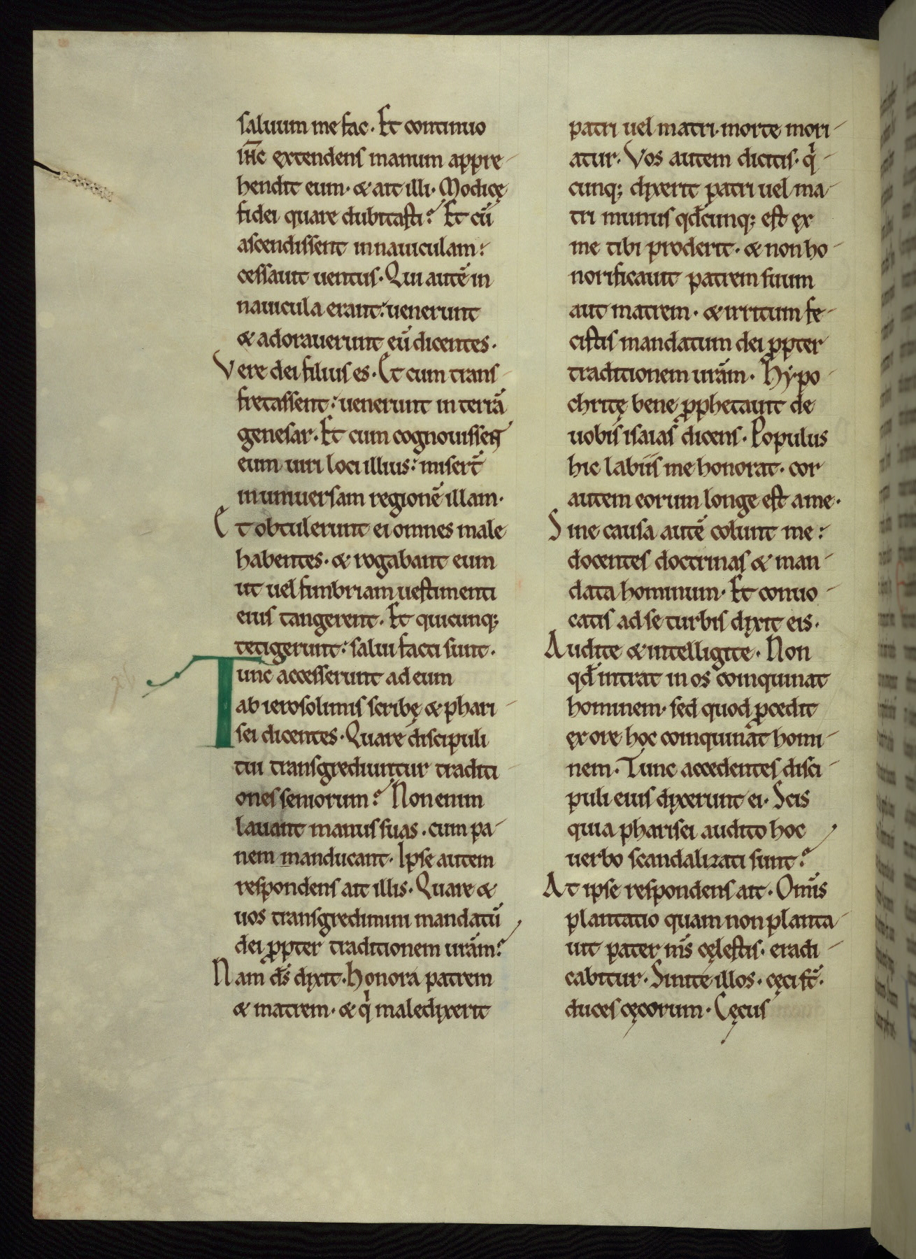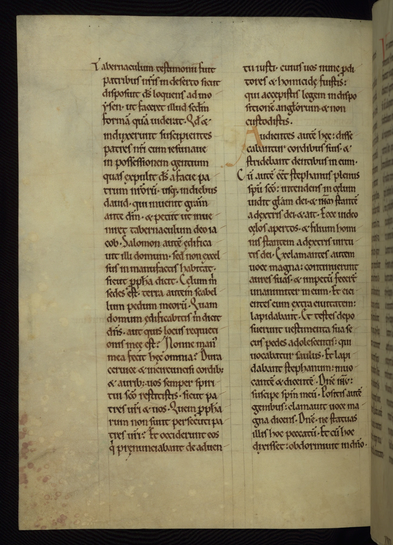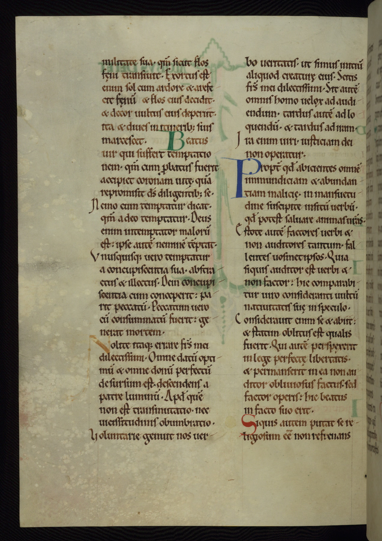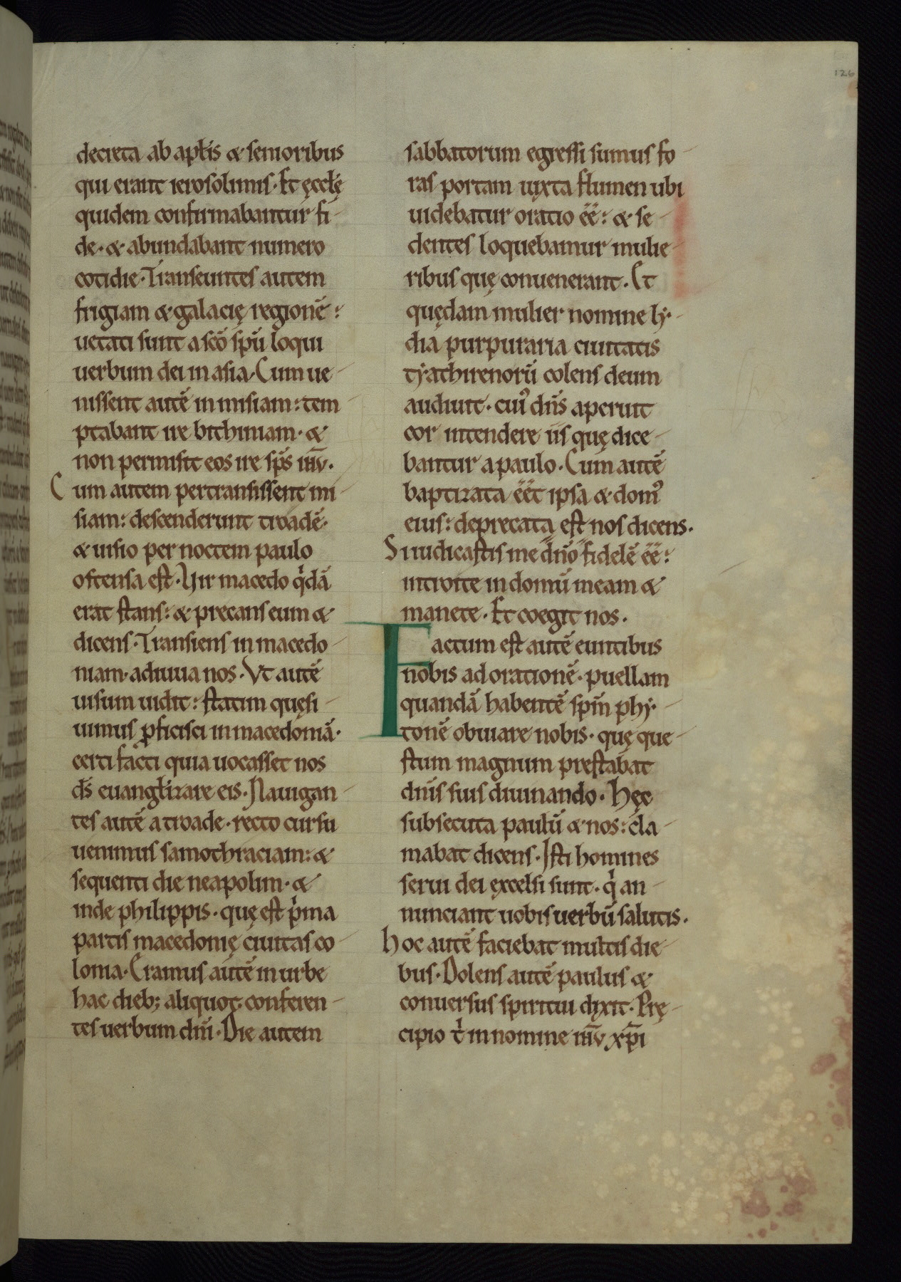 This large-format copy of the New Testament was almost certainly created at Rochester Cathedral Priory, England, in the first half of the twelfth century. It was part of a five-volume Bible, only one other volume of which, London, British Library Ms. Royal I.C.VII, has survived. The decorated initials in these manuscripts compare closely with those in other books securely attributed to Rochester. Textually these books are closely related to the Gundulph Bible (San Marino, Huntington Library Ms. HM 62), known to have been produced at Rochester in the second half of the eleventh century. Although neither the Walters' nor the British Library's volume includes an inscription associating this Bible with Rochester, the two medieval catalogs of the Rochester Cathedral library, produced around 1130 and in 1202, contain references to manuscripts that correspond well with them. The book’s large size indicates it that was designed to be read aloud, either during services or at meals in the refectory. Large, fanciful initials filled with succulent foliage, fruit, dragons, animals, and human faces begin each section of the text. Executed in a vibrant palette of red, blue, green, ochre (in place of gold), and yellow, the intricate, dynamic designs capture the essence of Romanesque manuscript illumination. Royal I.C.VII also includes four historiated initials (for the books of Joshua, I Samuel, 2 Samuel, and 2 Kings). Although the Bible was made at Rochester, the pre-Gothic script of W.18 in particular is extremely close to that practiced at nearby Canterbury at the time.