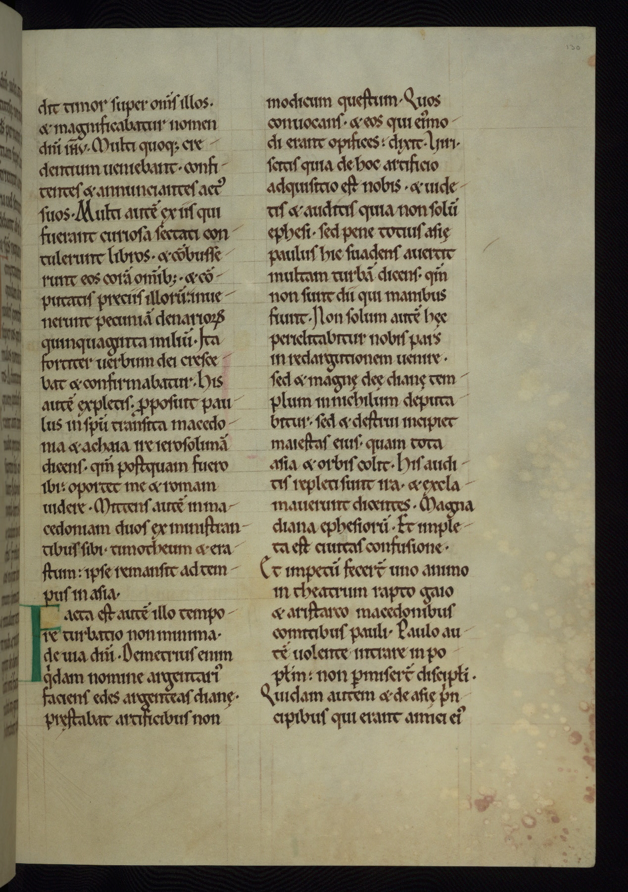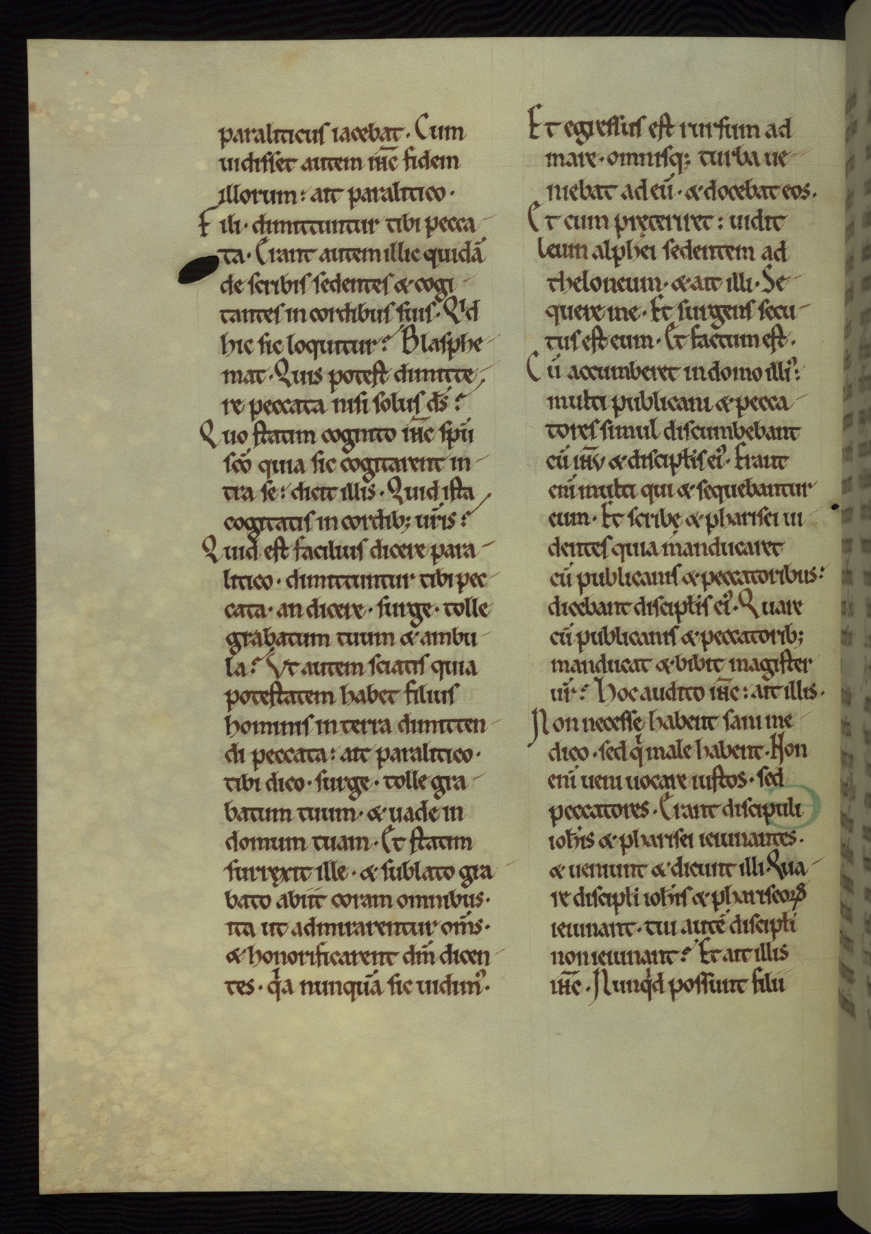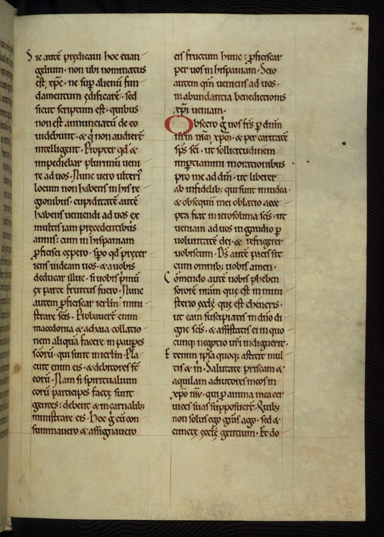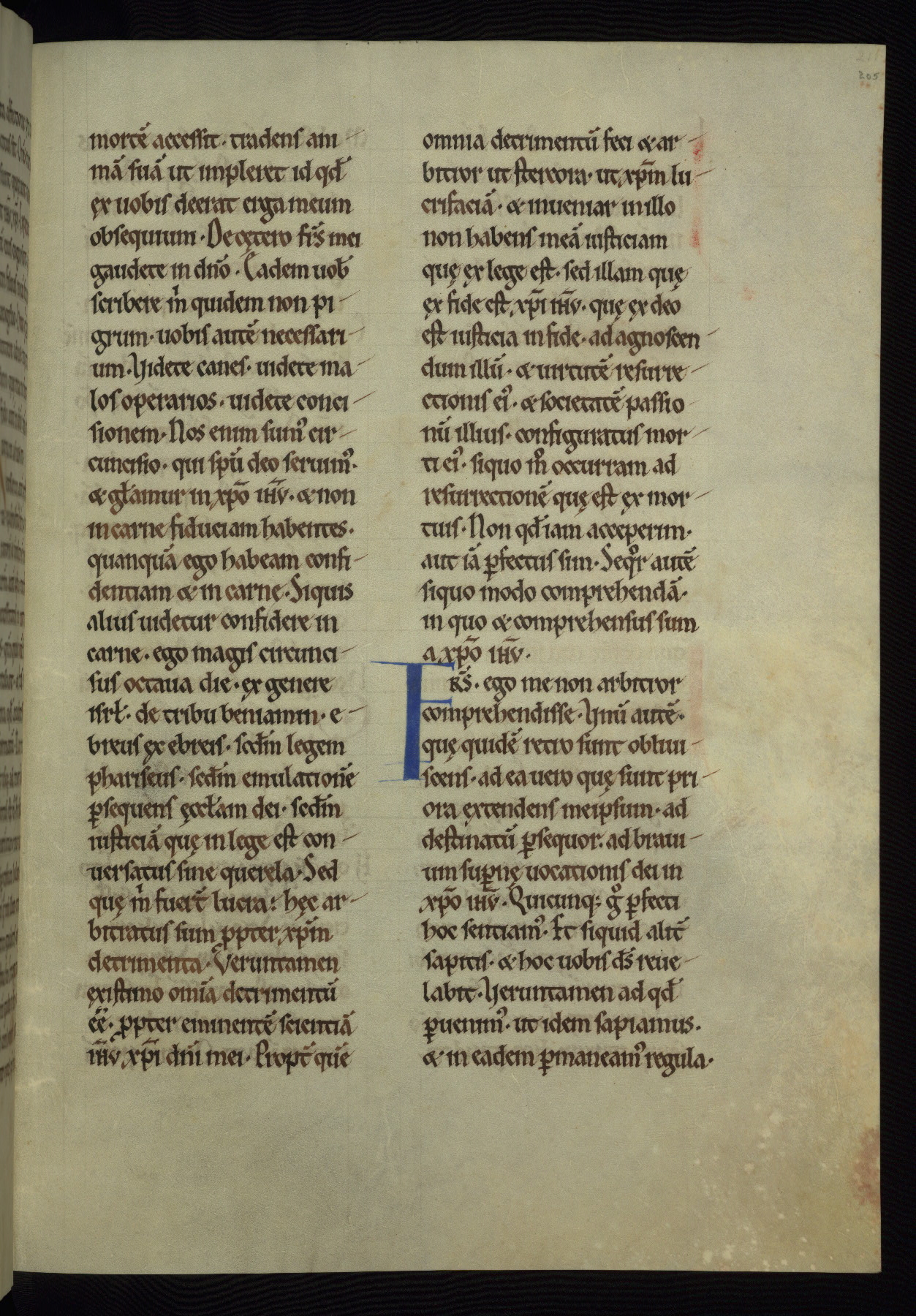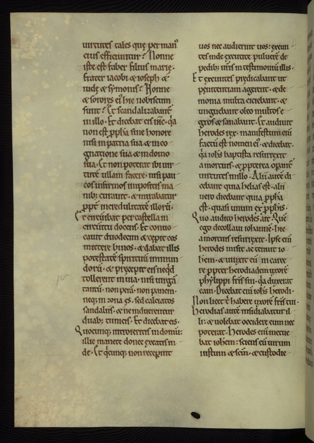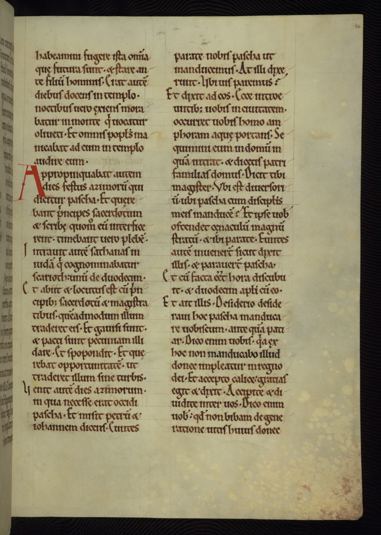 This large-format copy of the New Testament was almost certainly created at Rochester Cathedral Priory, England, in the first half of the twelfth century. It was part of a five-volume Bible, only one other volume of which, London, British Library Ms. Royal I.C.VII, has survived. The decorated initials in these manuscripts compare closely with those in other books securely attributed to Rochester. Textually these books are closely related to the Gundulph Bible (San Marino, Huntington Library Ms. HM 62), known to have been produced at Rochester in the second half of the eleventh century. Although neither the Walters' nor the British Library's volume includes an inscription associating this Bible with Rochester, the two medieval catalogs of the Rochester Cathedral library, produced around 1130 and in 1202, contain references to manuscripts that correspond well with them. The book’s large size indicates it that was designed to be read aloud, either during services or at meals in the refectory. Large, fanciful initials filled with succulent foliage, fruit, dragons, animals, and human faces begin each section of the text. Executed in a vibrant palette of red, blue, green, ochre (in place of gold), and yellow, the intricate, dynamic designs capture the essence of Romanesque manuscript illumination. Royal I.C.VII also includes four historiated initials (for the books of Joshua, I Samuel, 2 Samuel, and 2 Kings). Although the Bible was made at Rochester, the pre-Gothic script of W.18 in particular is extremely close to that practiced at nearby Canterbury at the time.