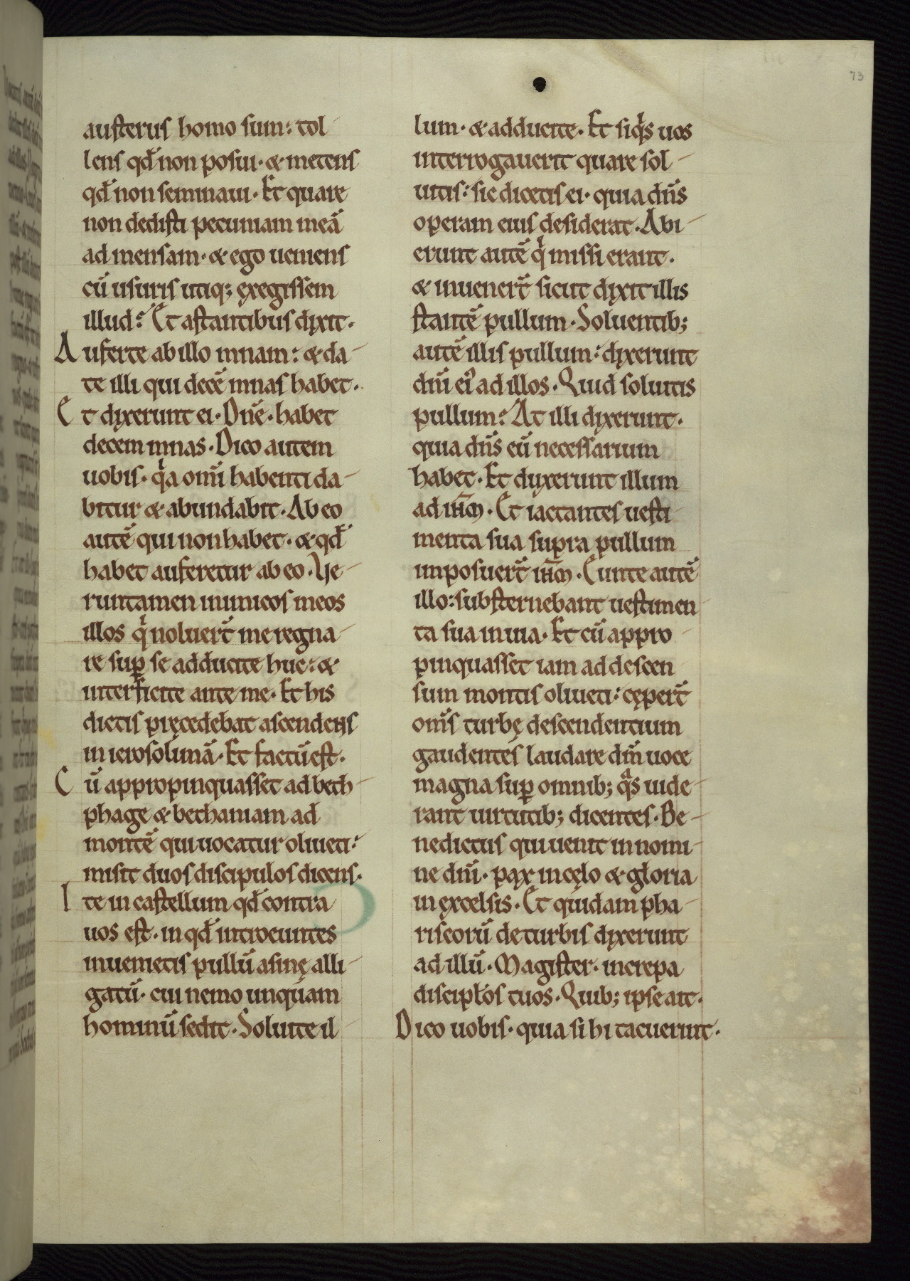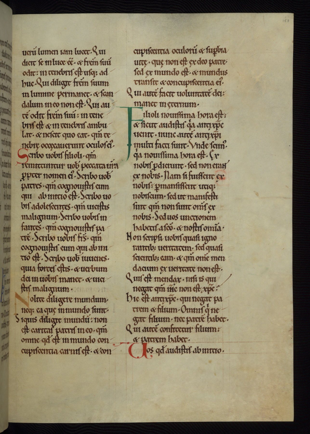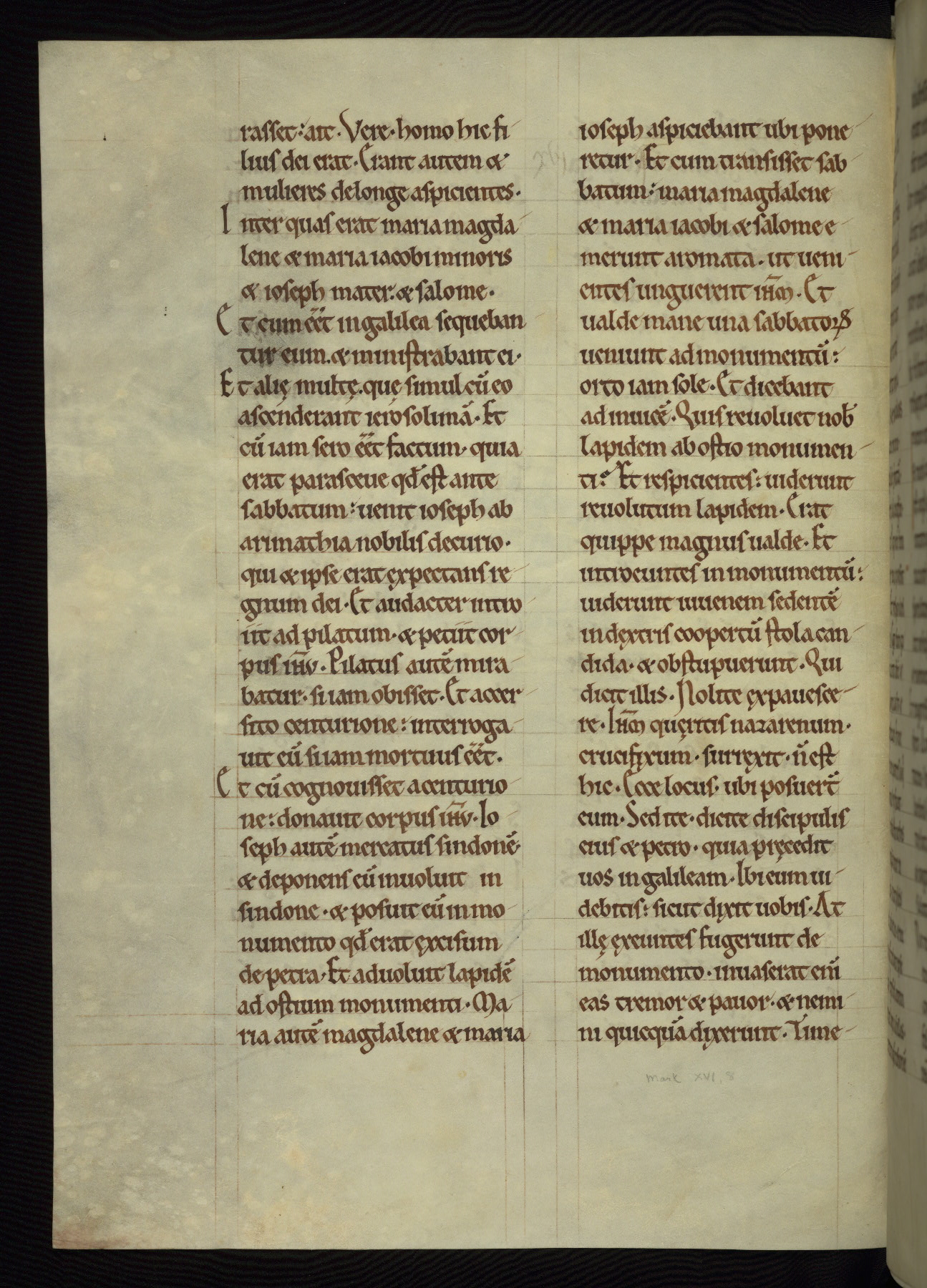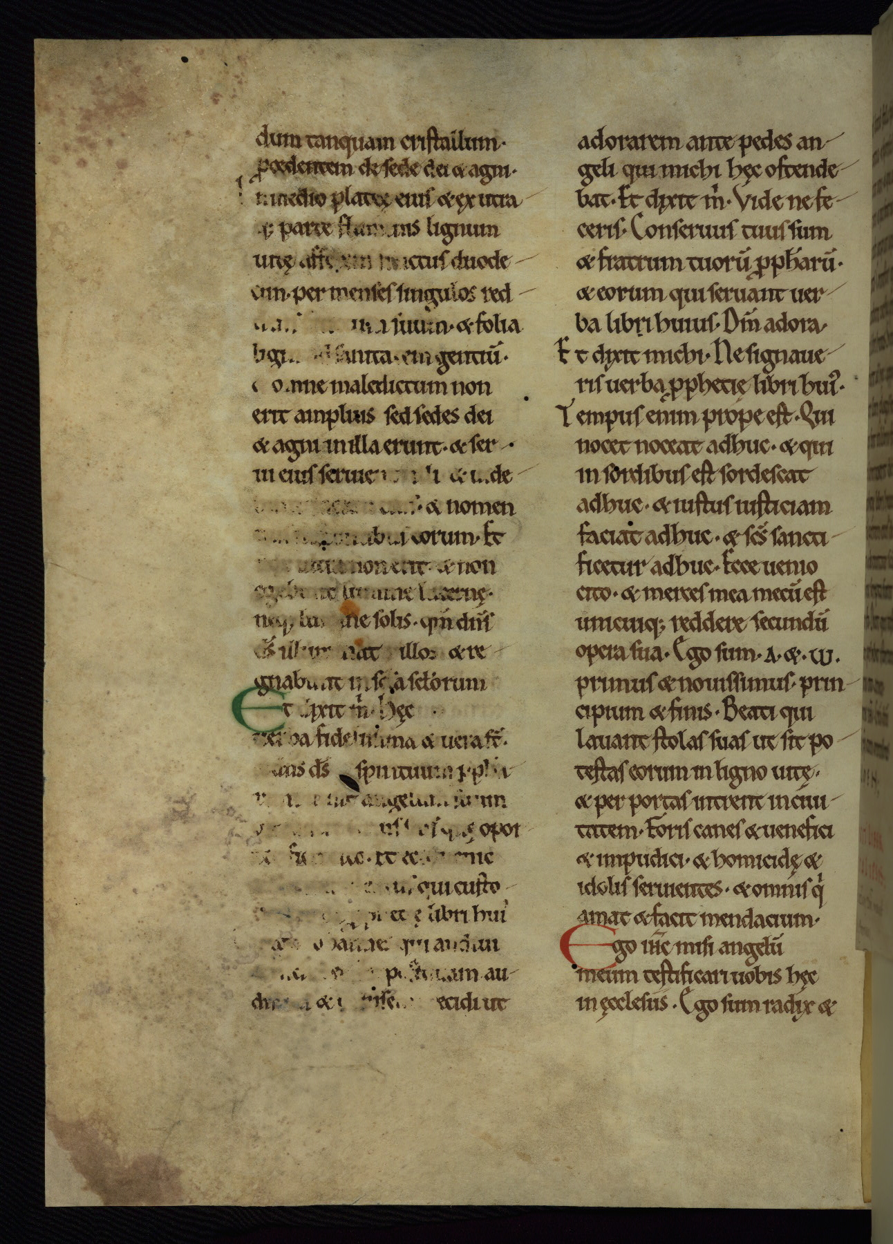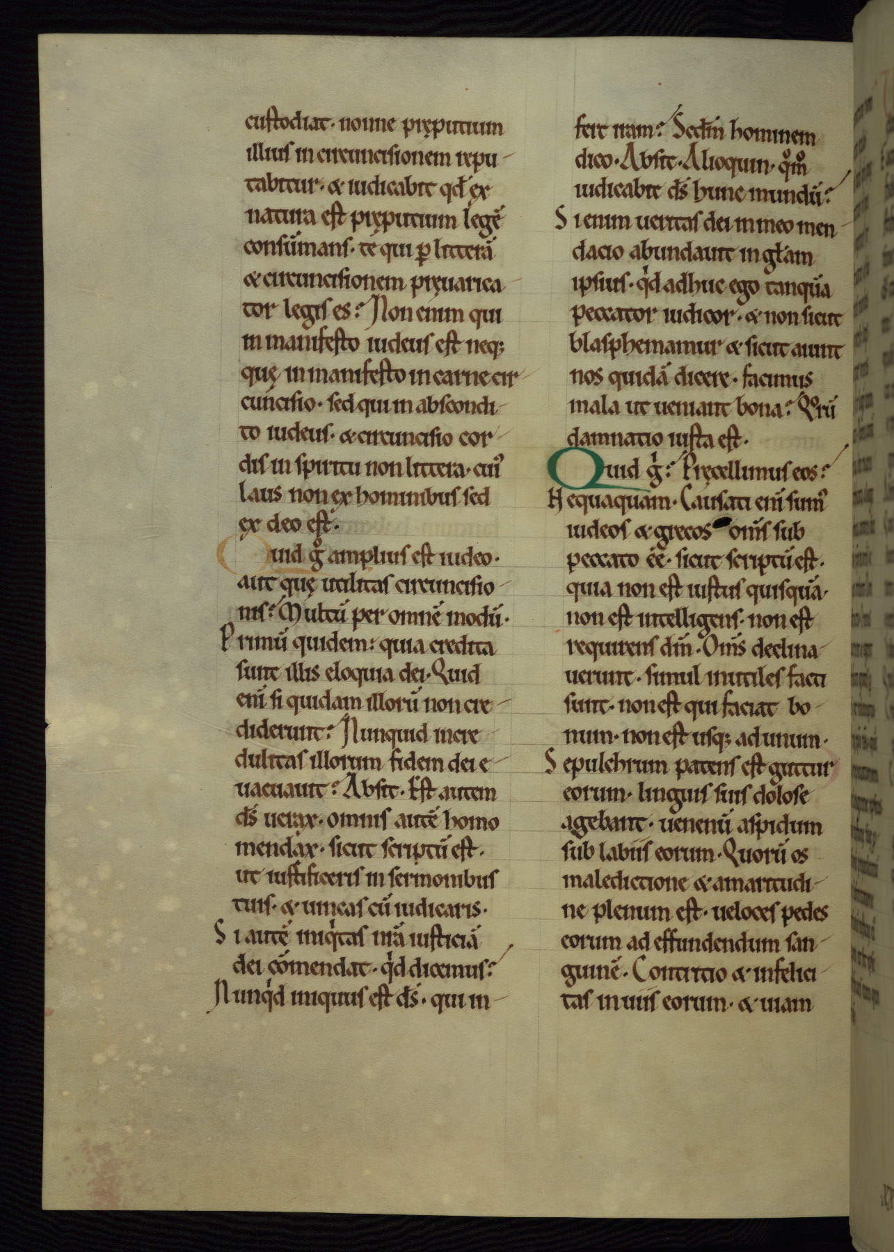 This large-format copy of the New Testament was almost certainly created at Rochester Cathedral Priory, England, in the first half of the twelfth century. It was part of a five-volume Bible, only one other volume of which, London, British Library Ms. Royal I.C.VII, has survived. The decorated initials in these manuscripts compare closely with those in other books securely attributed to Rochester. Textually these books are closely related to the Gundulph Bible (San Marino, Huntington Library Ms. HM 62), known to have been produced at Rochester in the second half of the eleventh century. Although neither the Walters' nor the British Library's volume includes an inscription associating this Bible with Rochester, the two medieval catalogs of the Rochester Cathedral library, produced around 1130 and in 1202, contain references to manuscripts that correspond well with them. The book’s large size indicates it that was designed to be read aloud, either during services or at meals in the refectory. Large, fanciful initials filled with succulent foliage, fruit, dragons, animals, and human faces begin each section of the text. Executed in a vibrant palette of red, blue, green, ochre (in place of gold), and yellow, the intricate, dynamic designs capture the essence of Romanesque manuscript illumination. Royal I.C.VII also includes four historiated initials (for the books of Joshua, I Samuel, 2 Samuel, and 2 Kings). Although the Bible was made at Rochester, the pre-Gothic script of W.18 in particular is extremely close to that practiced at nearby Canterbury at the time.