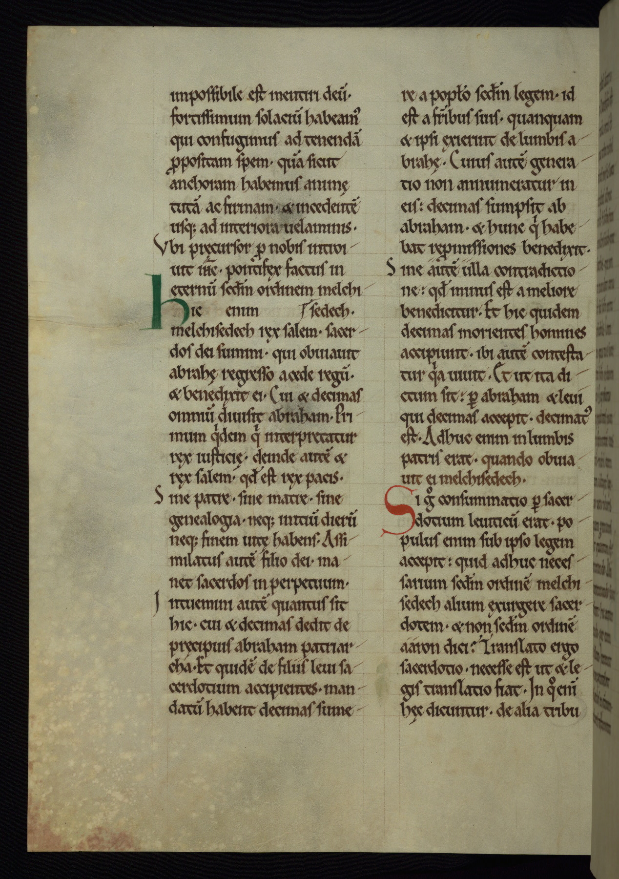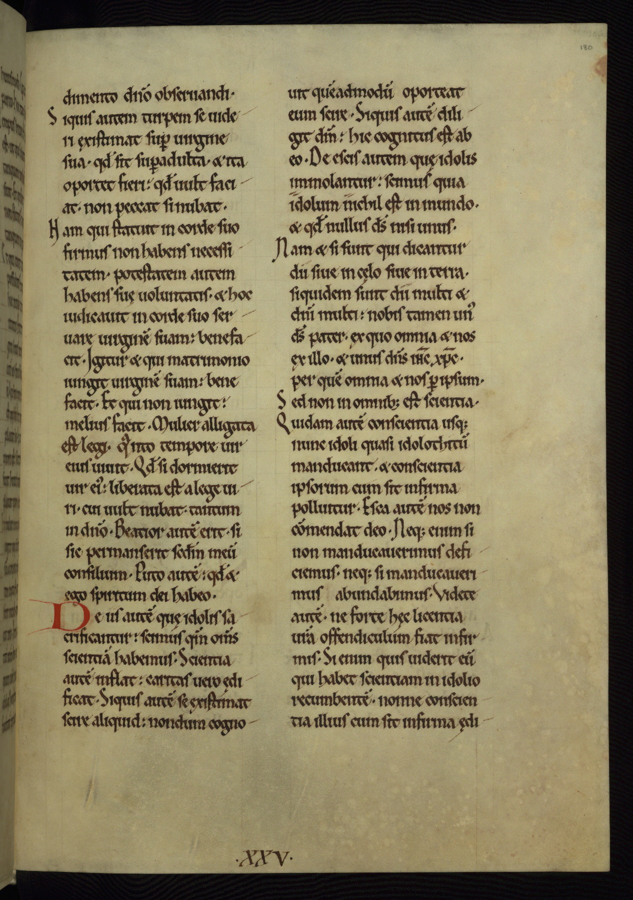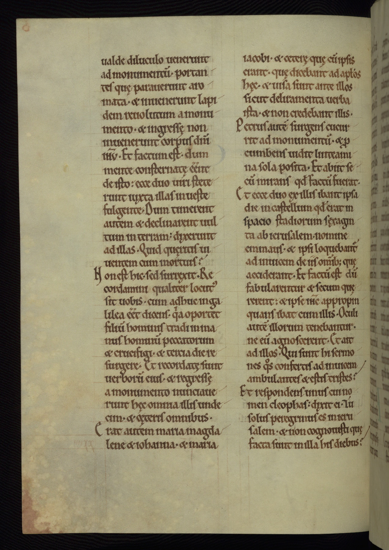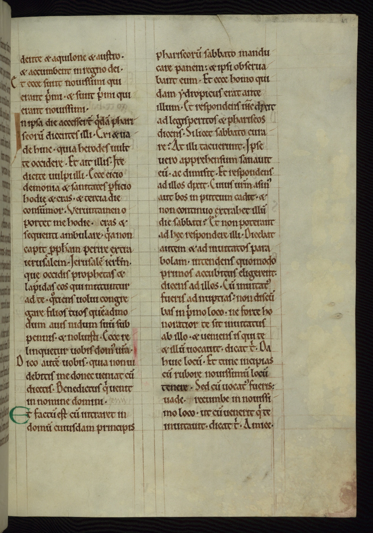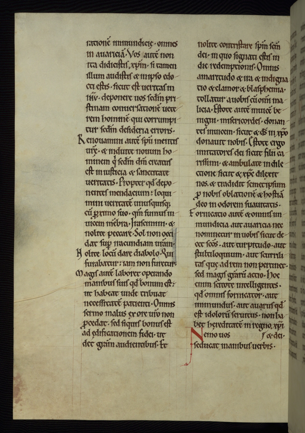 This large-format copy of the New Testament was almost certainly created at Rochester Cathedral Priory, England, in the first half of the twelfth century. It was part of a five-volume Bible, only one other volume of which, London, British Library Ms. Royal I.C.VII, has survived. The decorated initials in these manuscripts compare closely with those in other books securely attributed to Rochester. Textually these books are closely related to the Gundulph Bible (San Marino, Huntington Library Ms. HM 62), known to have been produced at Rochester in the second half of the eleventh century. Although neither the Walters' nor the British Library's volume includes an inscription associating this Bible with Rochester, the two medieval catalogs of the Rochester Cathedral library, produced around 1130 and in 1202, contain references to manuscripts that correspond well with them. The book’s large size indicates it that was designed to be read aloud, either during services or at meals in the refectory. Large, fanciful initials filled with succulent foliage, fruit, dragons, animals, and human faces begin each section of the text. Executed in a vibrant palette of red, blue, green, ochre (in place of gold), and yellow, the intricate, dynamic designs capture the essence of Romanesque manuscript illumination. Royal I.C.VII also includes four historiated initials (for the books of Joshua, I Samuel, 2 Samuel, and 2 Kings). Although the Bible was made at Rochester, the pre-Gothic script of W.18 in particular is extremely close to that practiced at nearby Canterbury at the time.